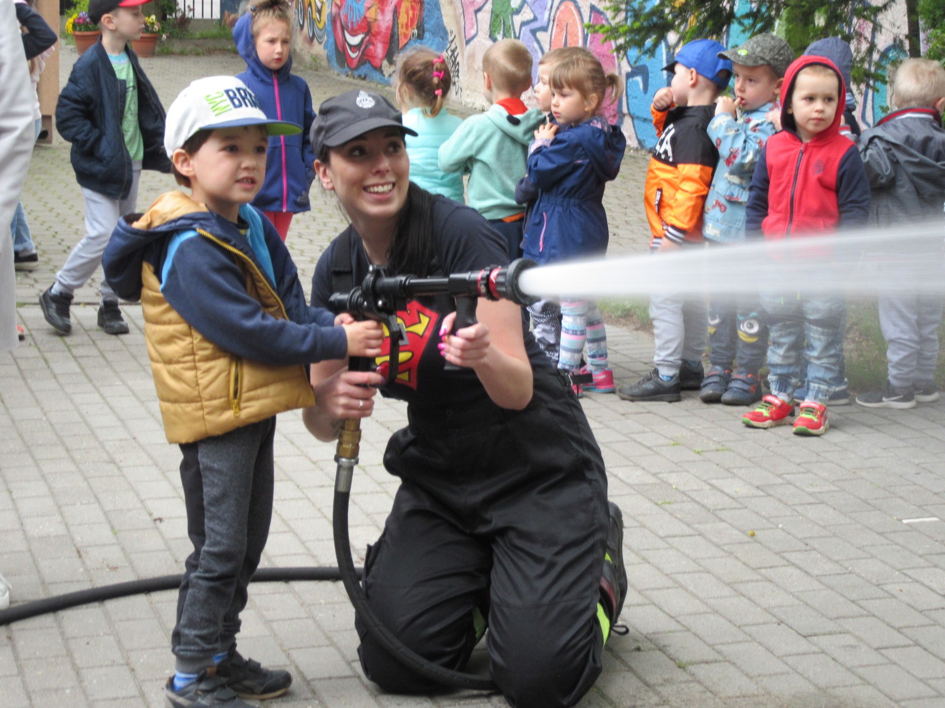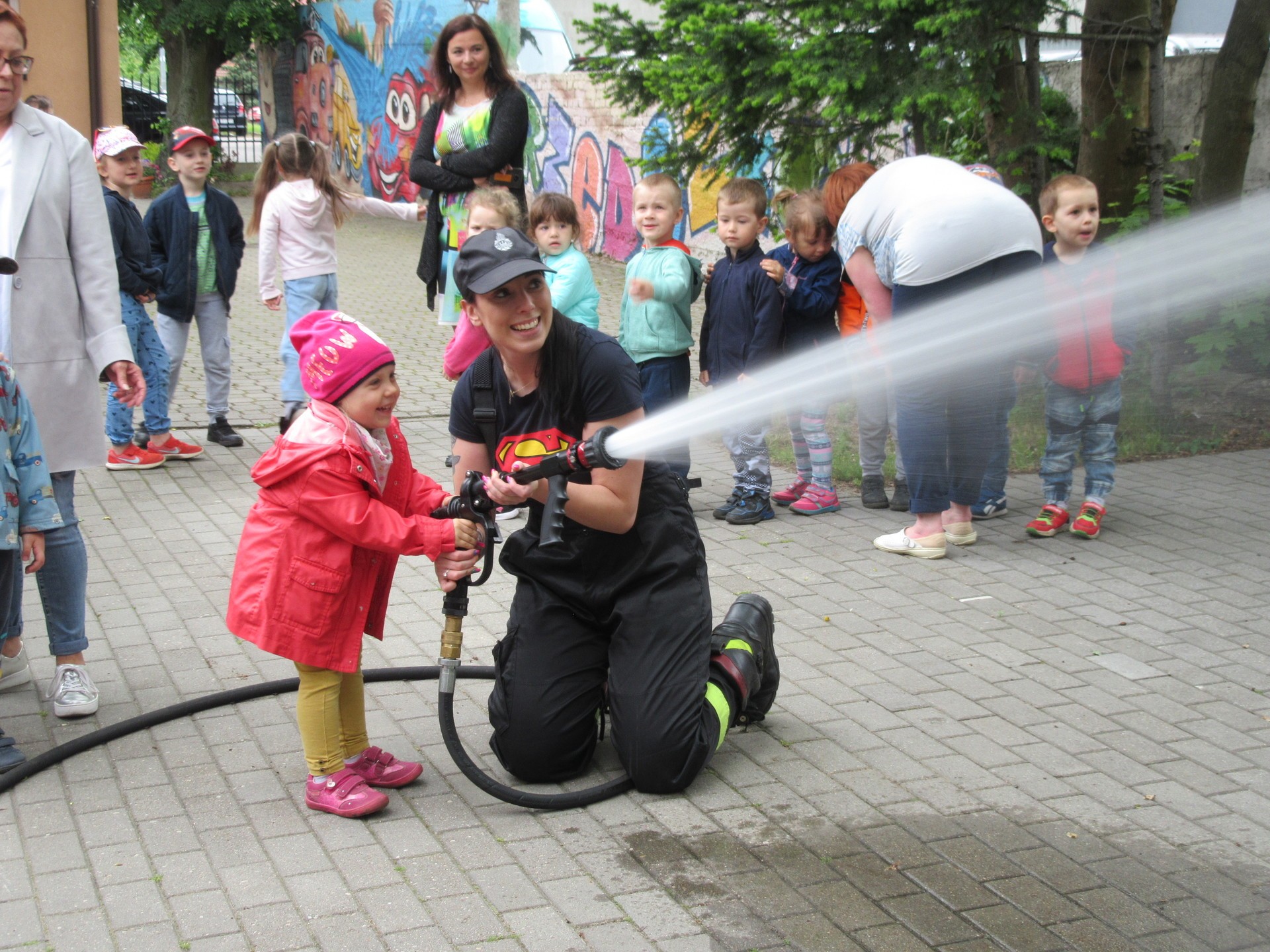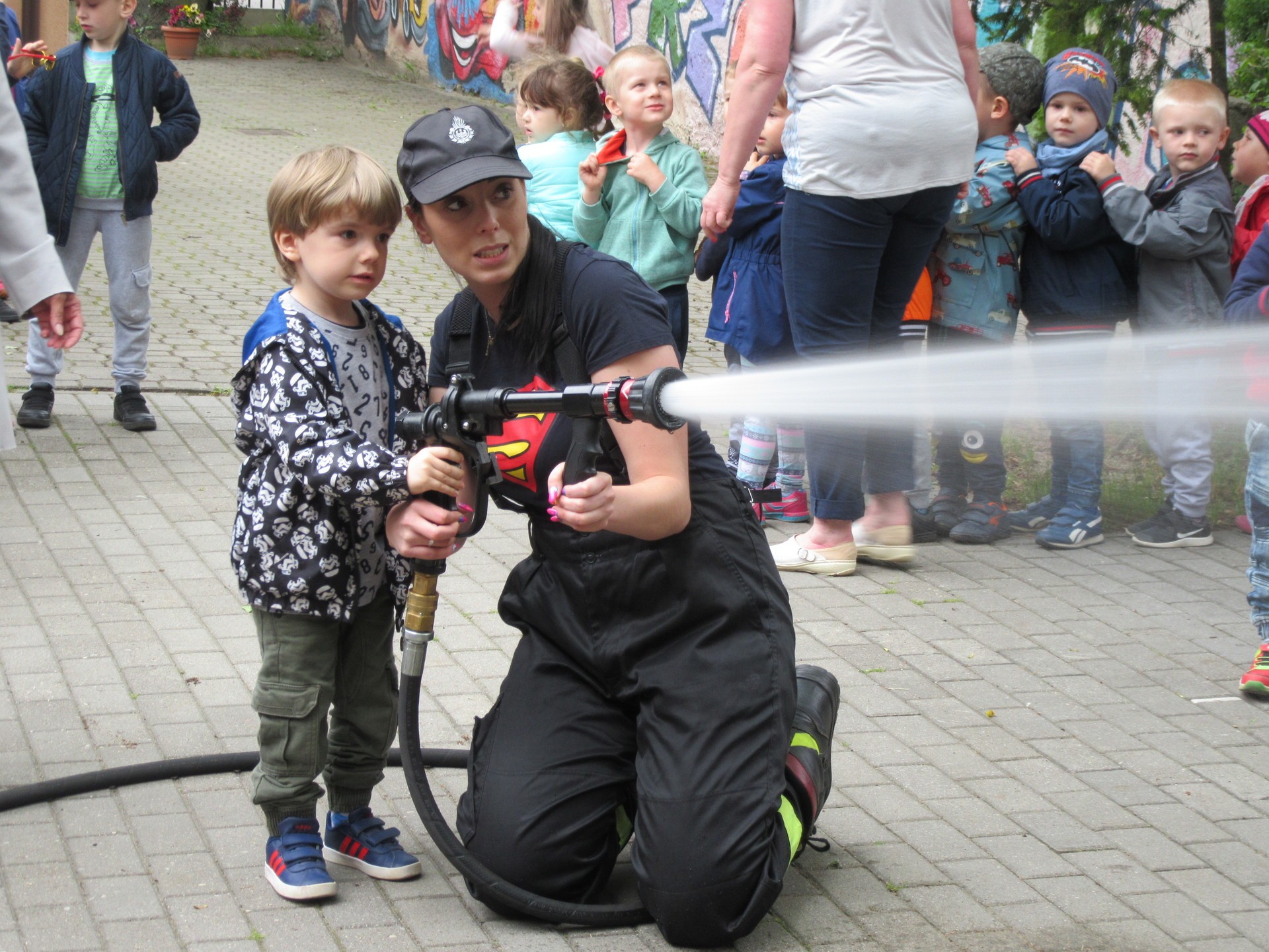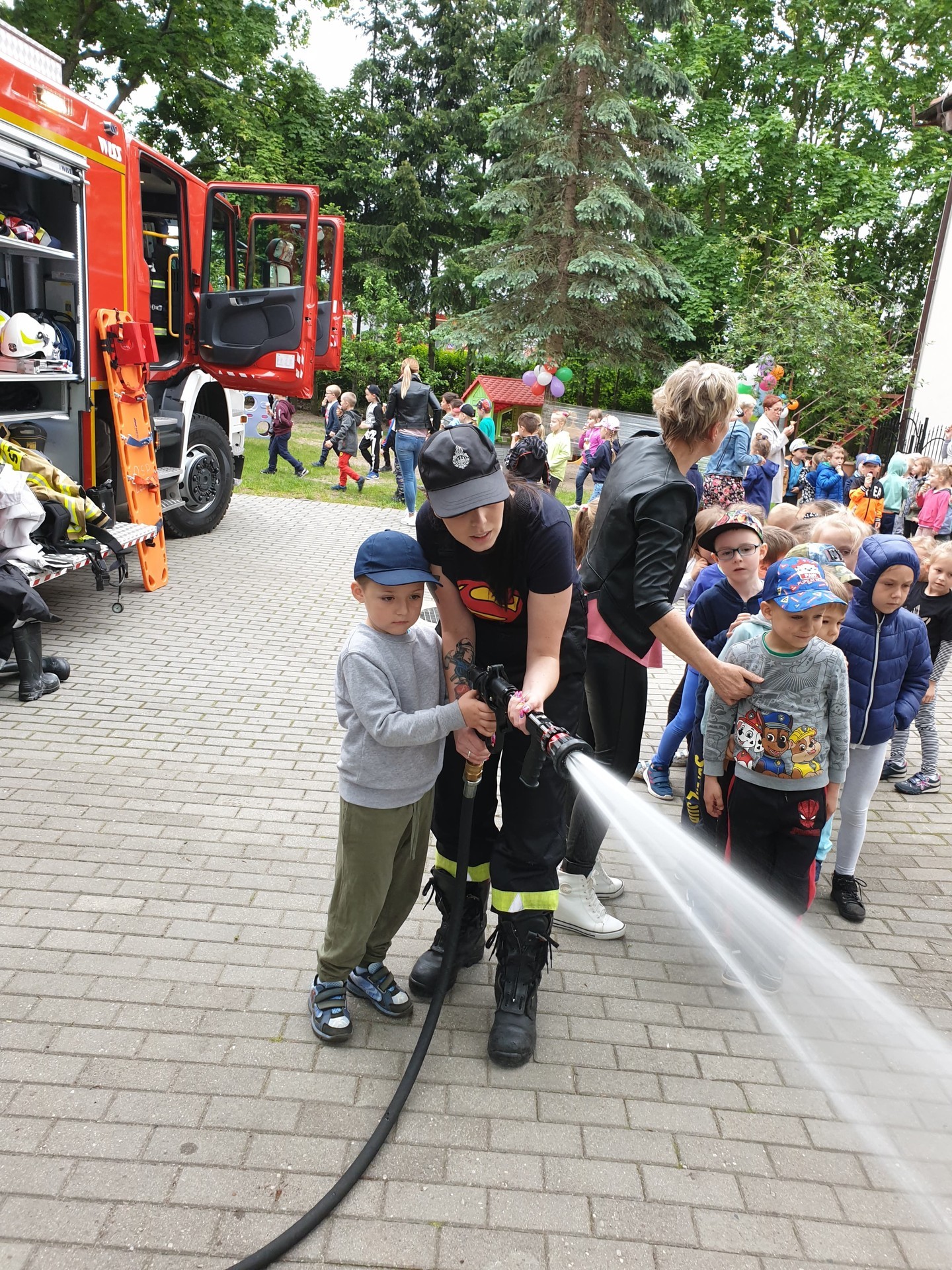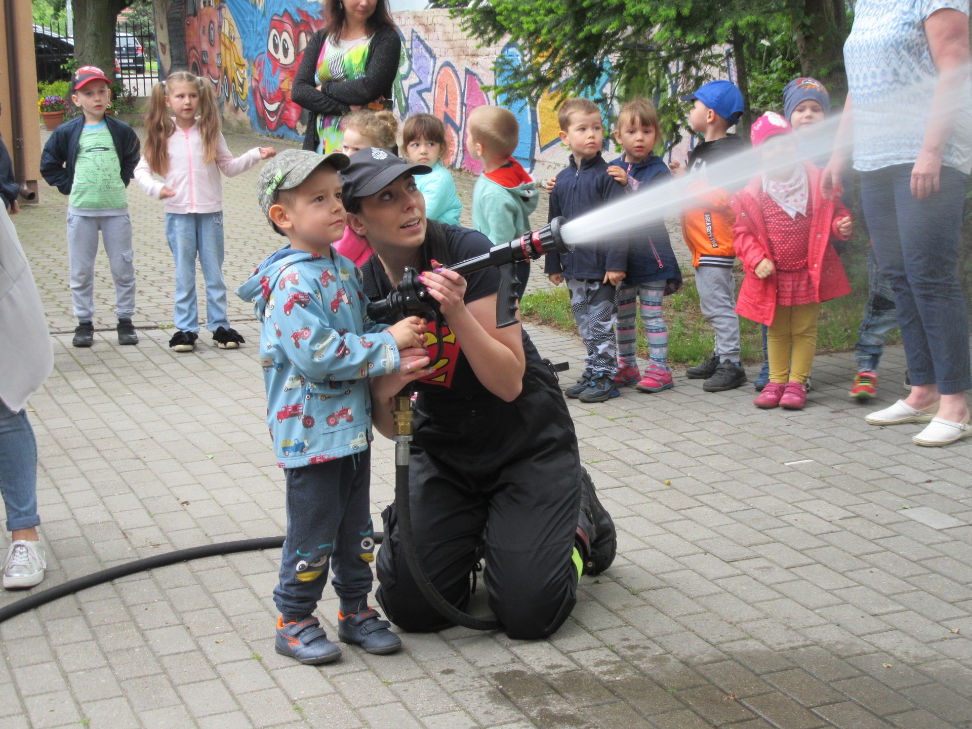 Dzień obfitował w liczne atrakcje. Na początek wóz strażacki , dzieci mogły obejrzeć go od środka a także zobaczyć jak działa wąż strażacki. Nasza Pani Dyrektor zamieniła się na chwilę w strażaka prezentując się w pełnym stroju strażackim. Tego dnia gościliśmy w naszej placówce animatora zabaw, który prowadził z dziećmi zabawy taneczne, tworzył wspaniałe bańki mydlane oraz różności z balonów. Dzieci malowały farbami na strechu oraz brały udział w zawodach sportowych. Nie zabrakło tego dnia słodkości, nasi milusińscy dostali lody oraz mogły częstować się pysznymi ciastami zrobionymi przez rodziców. Nie zabrakło też wesołych zabaw na świeżym powietrzu.