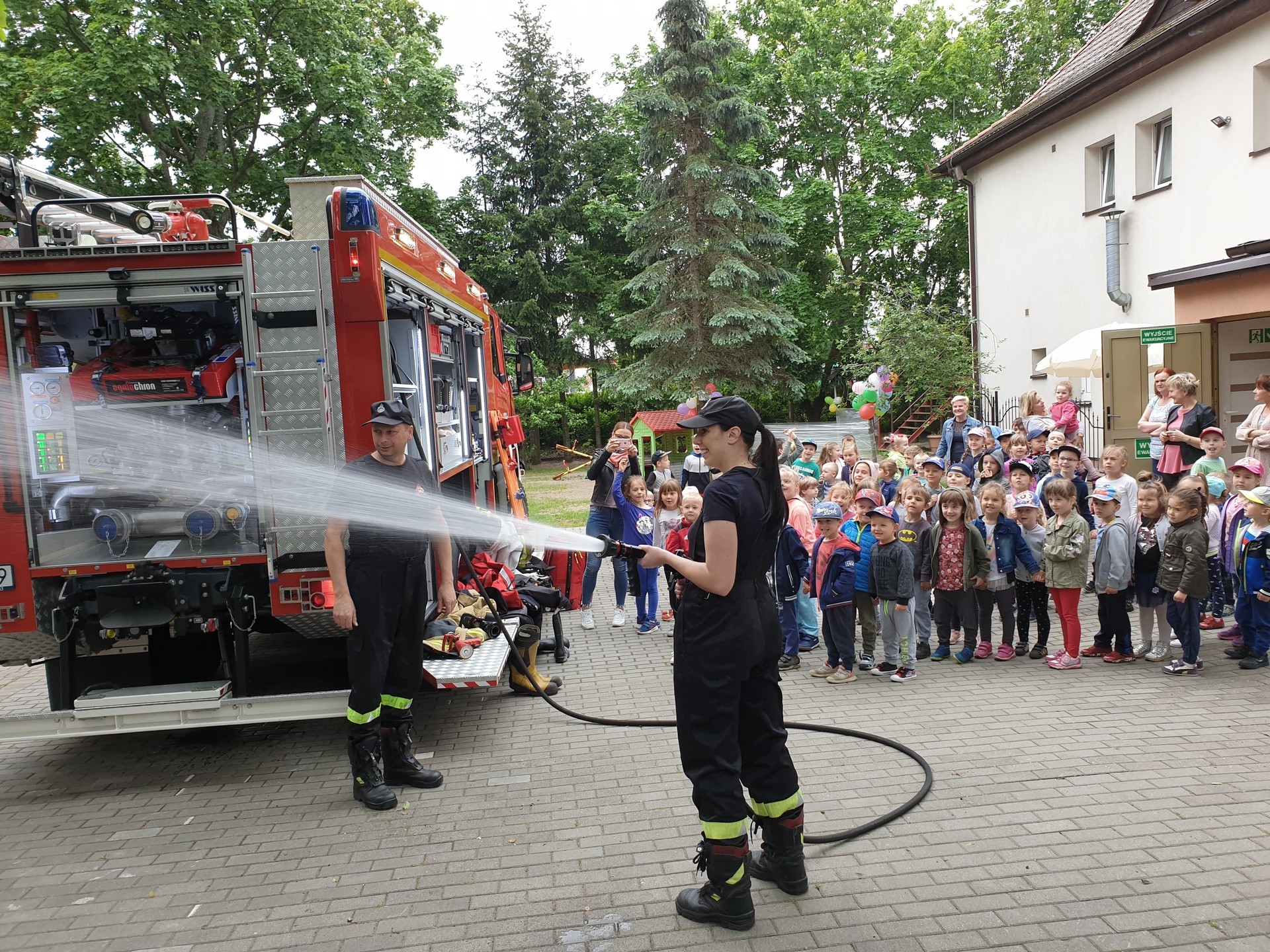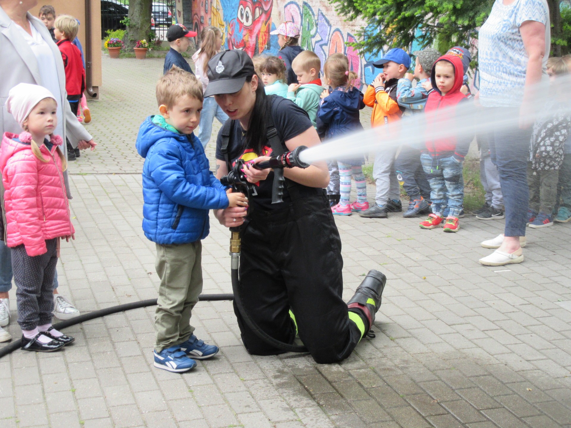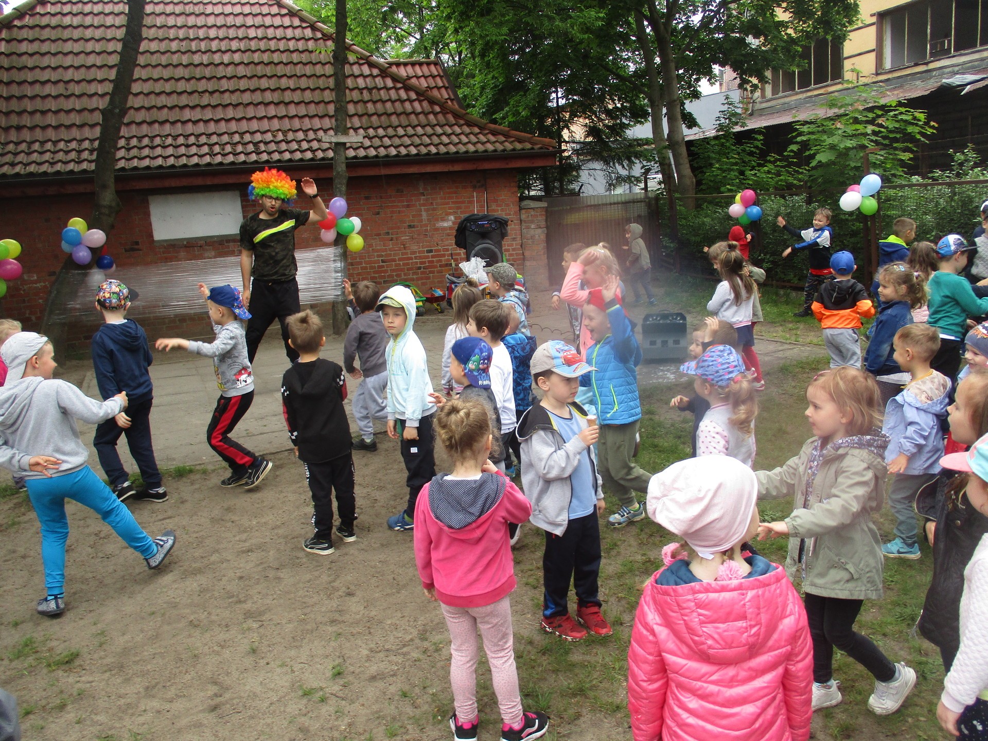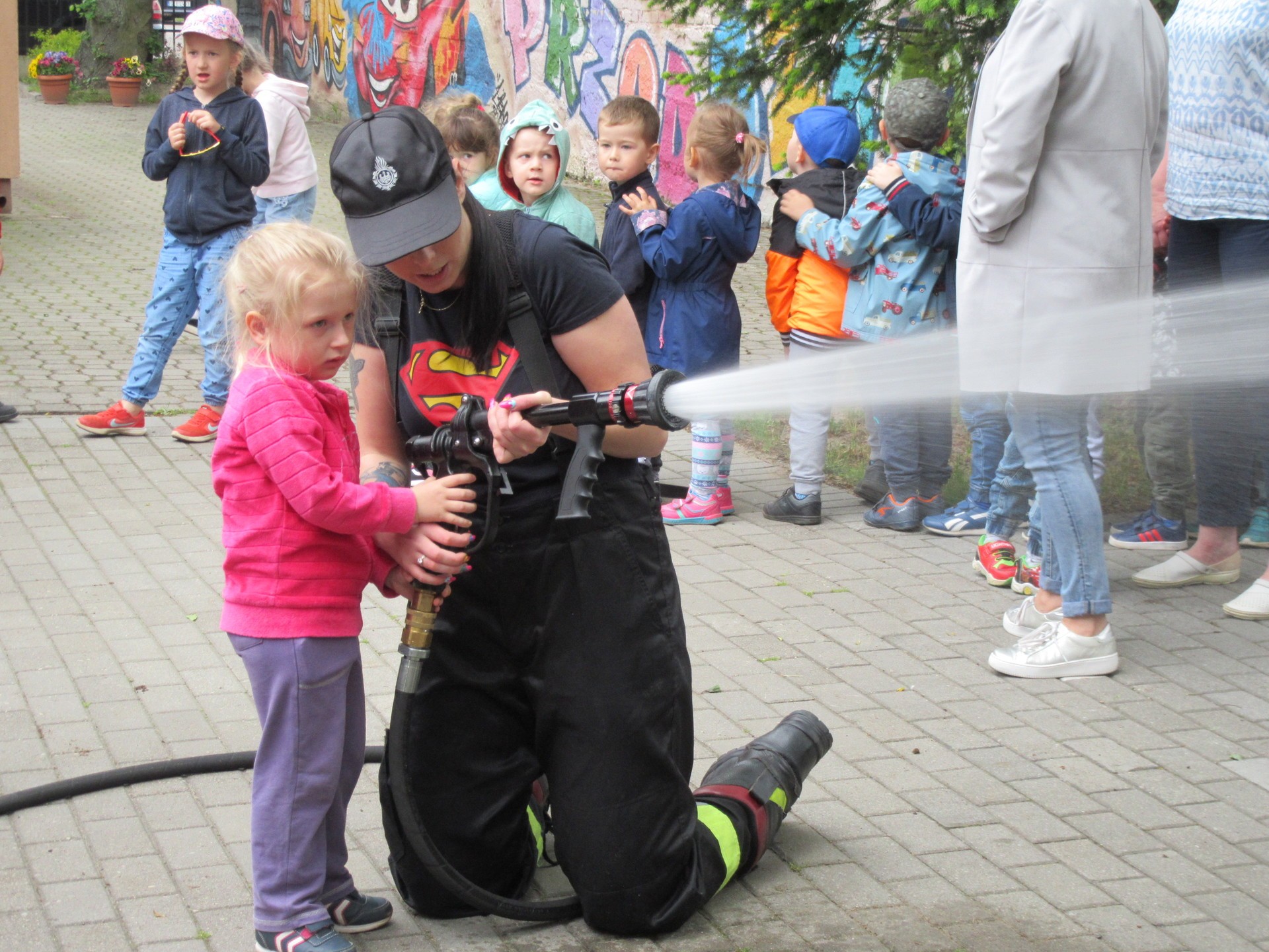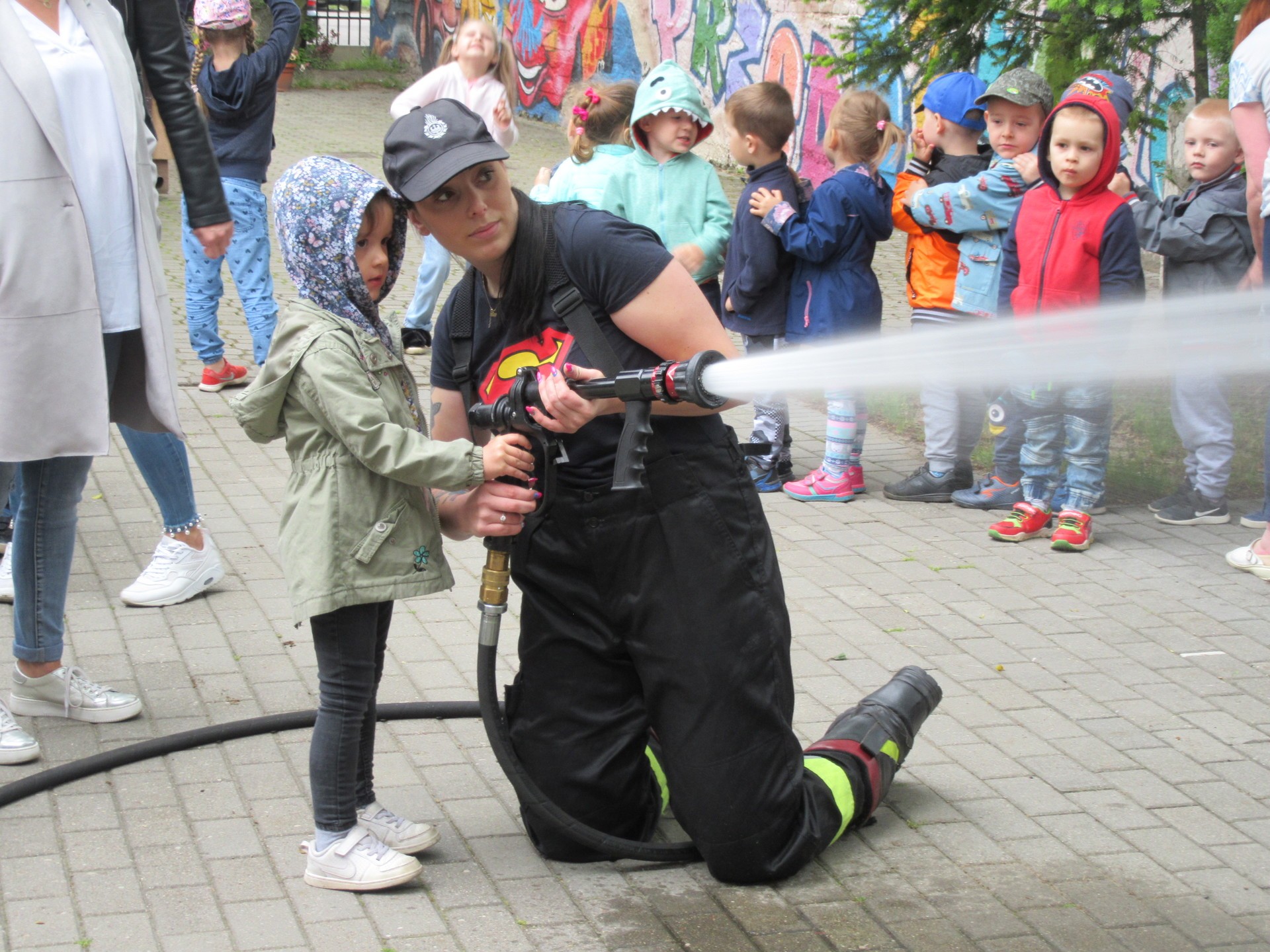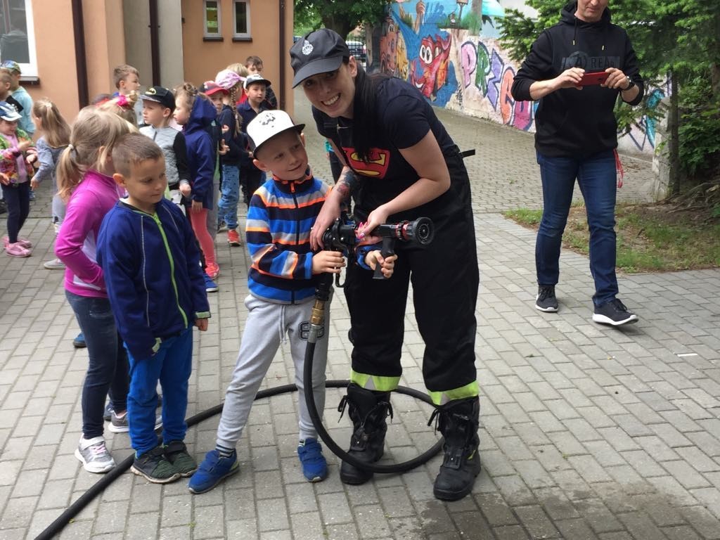 Dzień obfitował w liczne atrakcje. Na początek wóz strażacki , dzieci mogły obejrzeć go od środka a także zobaczyć jak działa wąż strażacki. Nasza Pani Dyrektor zamieniła się na chwilę w strażaka prezentując się w pełnym stroju strażackim. Tego dnia gościliśmy w naszej placówce animatora zabaw, który prowadził z dziećmi zabawy taneczne, tworzył wspaniałe bańki mydlane oraz różności z balonów. Dzieci malowały farbami na strechu oraz brały udział w zawodach sportowych. Nie zabrakło tego dnia słodkości, nasi milusińscy dostali lody oraz mogły częstować się pysznymi ciastami zrobionymi przez rodziców. Nie zabrakło też wesołych zabaw na świeżym powietrzu.