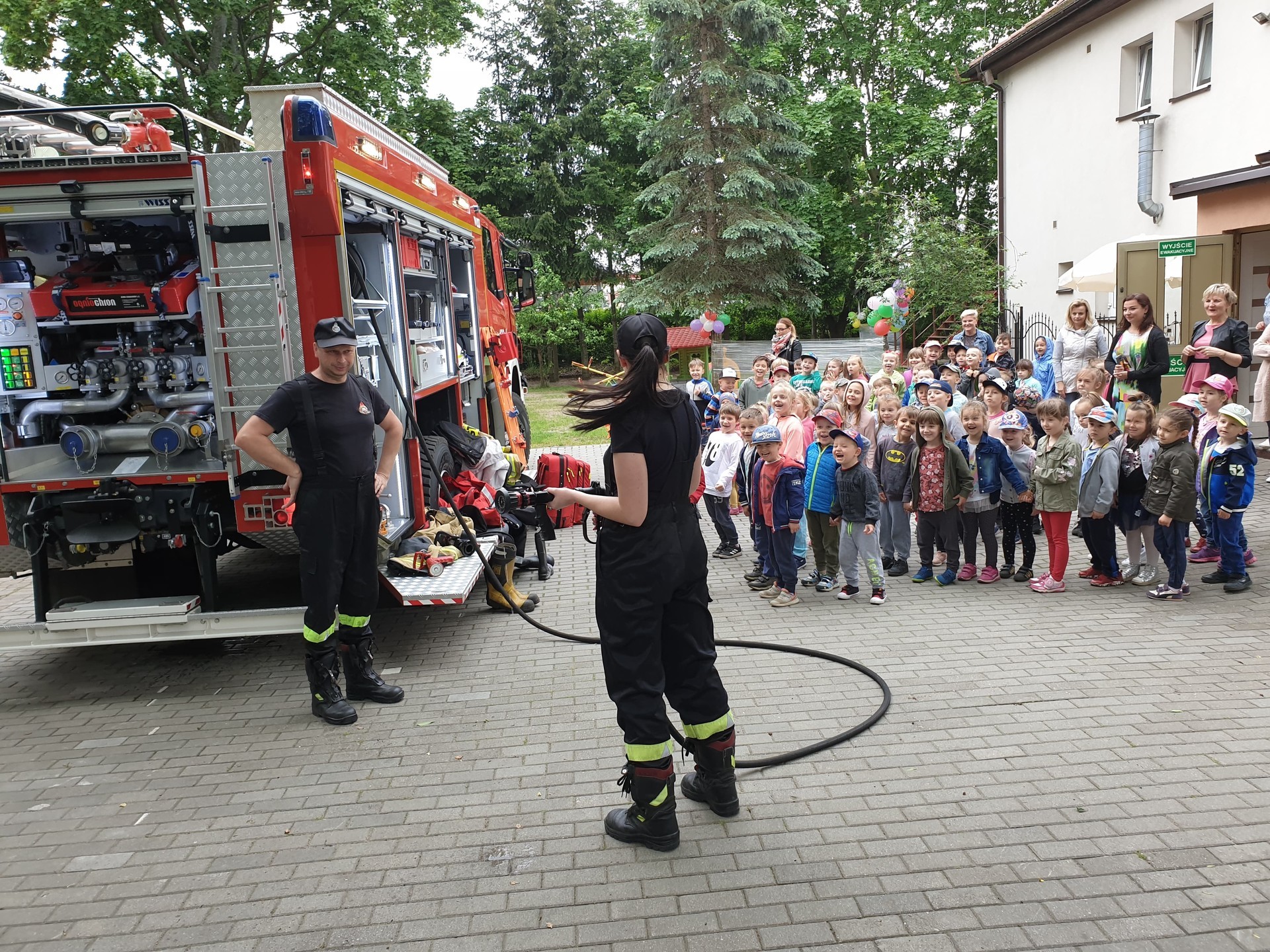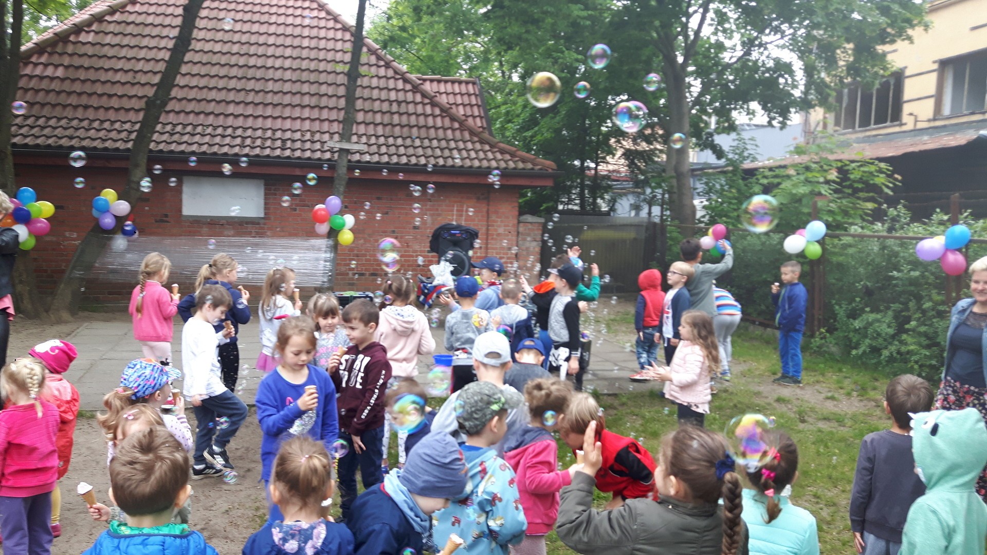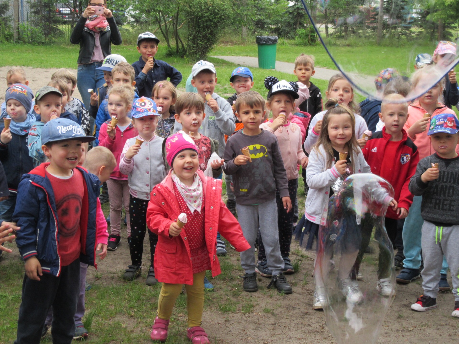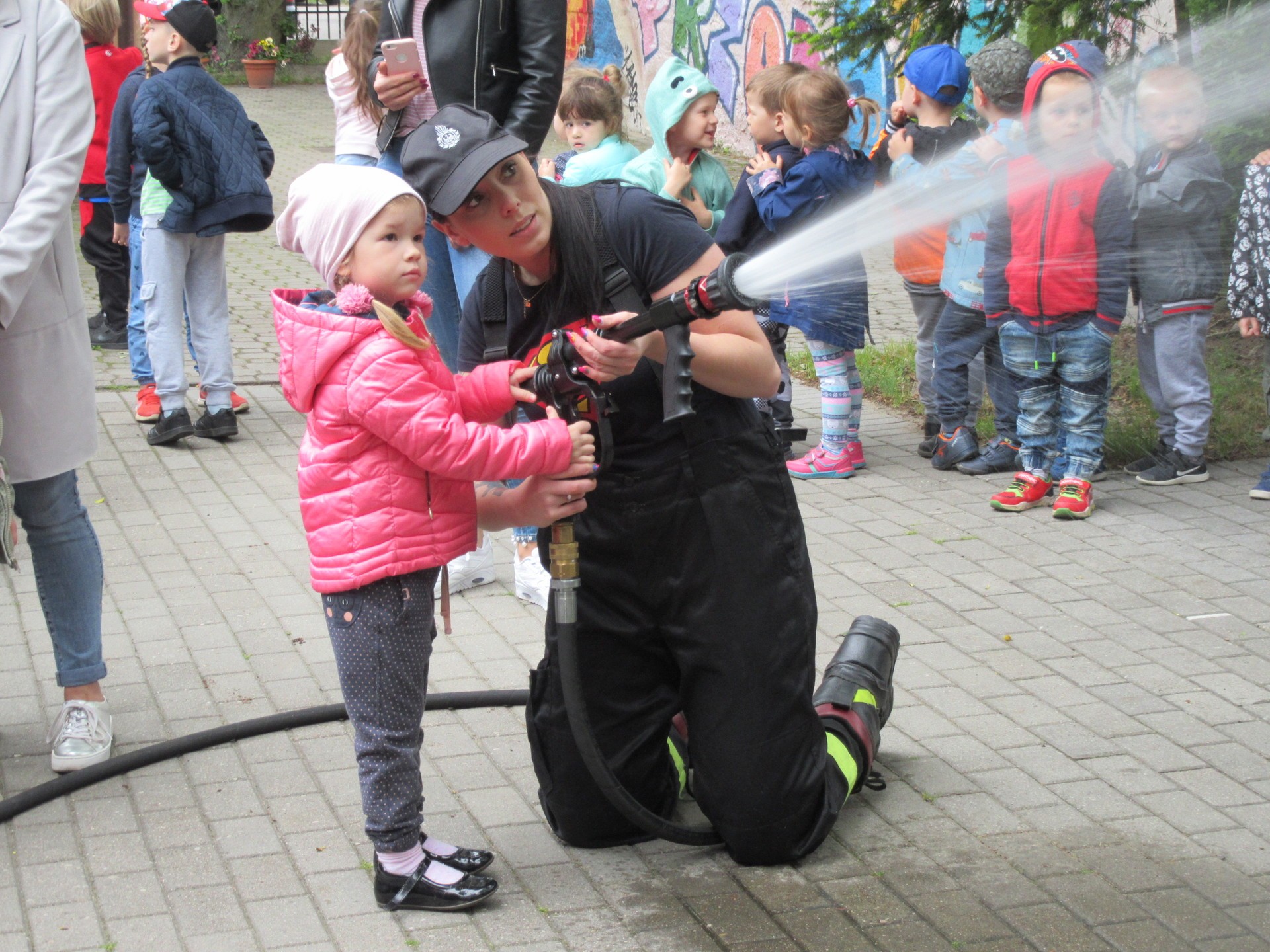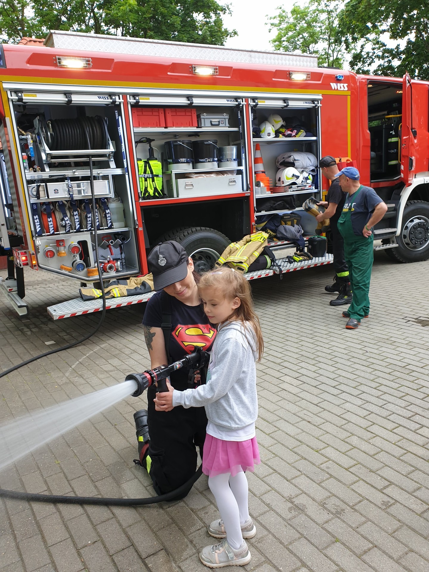 Dzień obfitował w liczne atrakcje. Na początek wóz strażacki , dzieci mogły obejrzeć go od środka a także zobaczyć jak działa wąż strażacki. Nasza Pani Dyrektor zamieniła się na chwilę w strażaka prezentując się w pełnym stroju strażackim. Tego dnia gościliśmy w naszej placówce animatora zabaw, który prowadził z dziećmi zabawy taneczne, tworzył wspaniałe bańki mydlane oraz różności z balonów. Dzieci malowały farbami na strechu oraz brały udział w zawodach sportowych. Nie zabrakło tego dnia słodkości, nasi milusińscy dostali lody oraz mogły częstować się pysznymi ciastami zrobionymi przez rodziców. Nie zabrakło też wesołych zabaw na świeżym powietrzu.