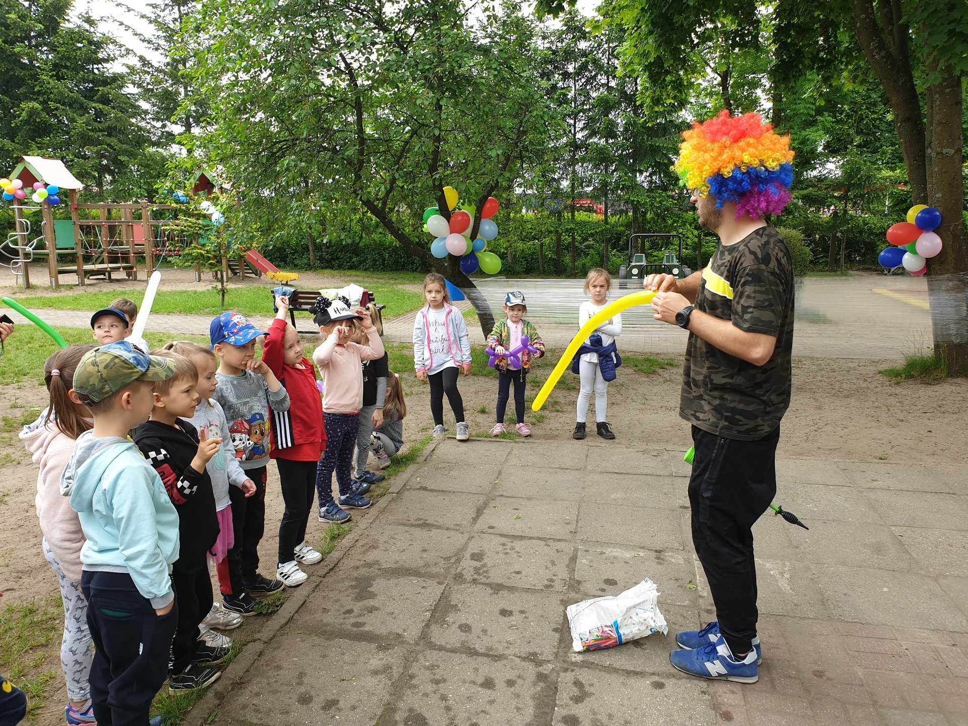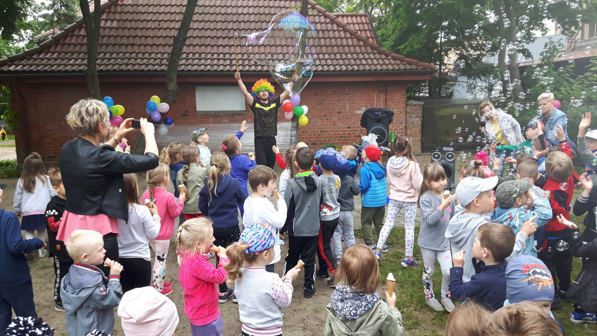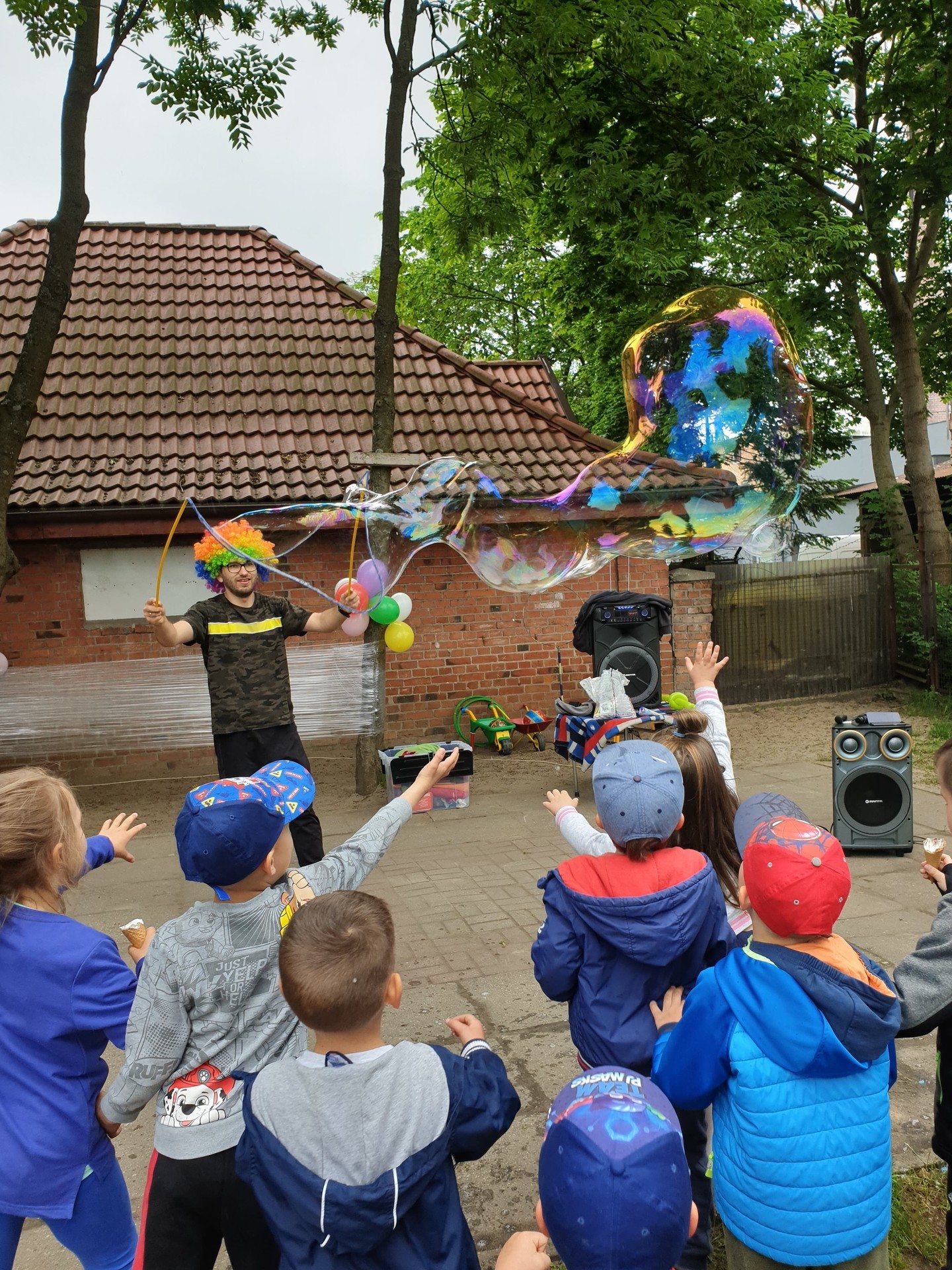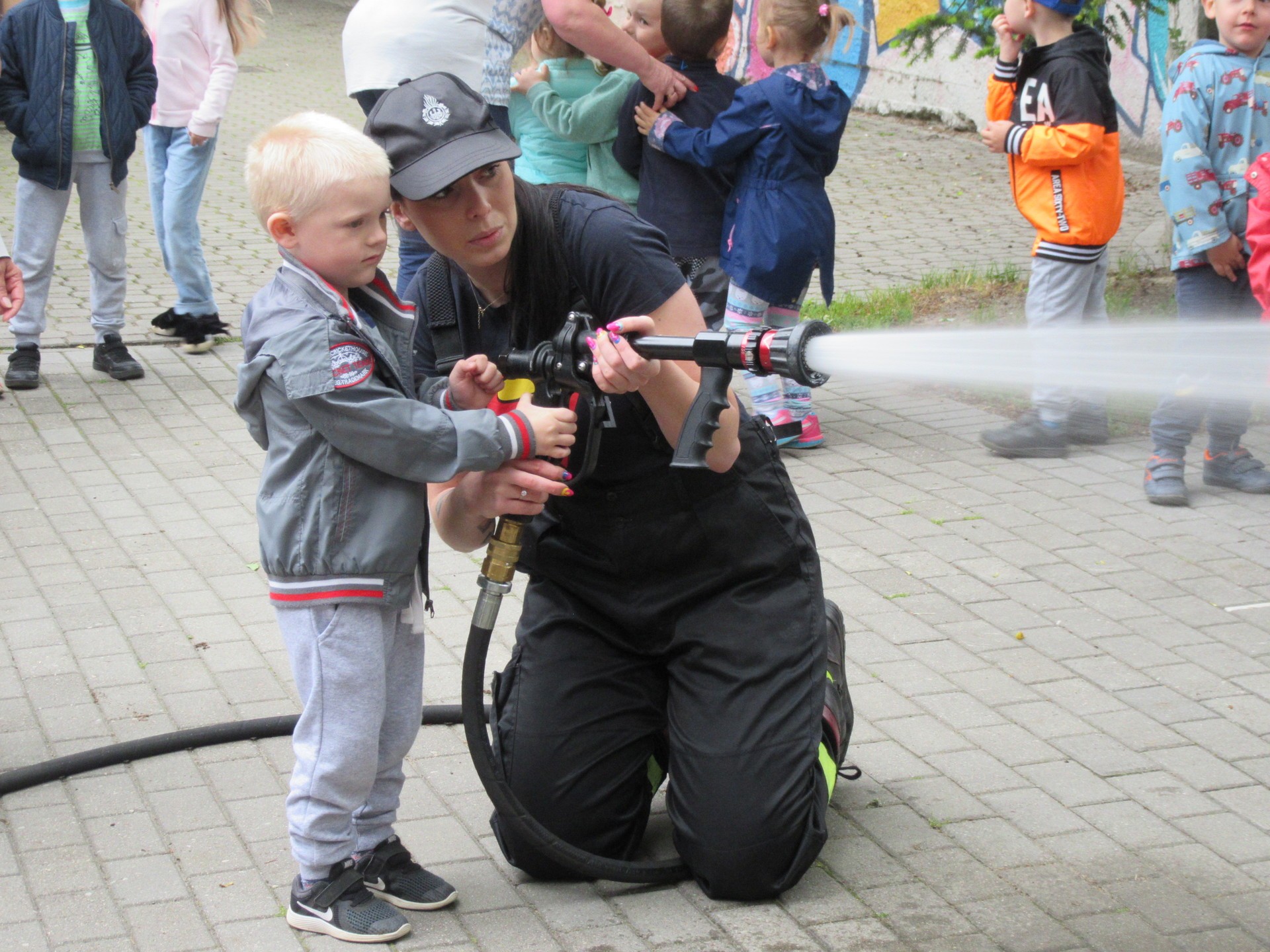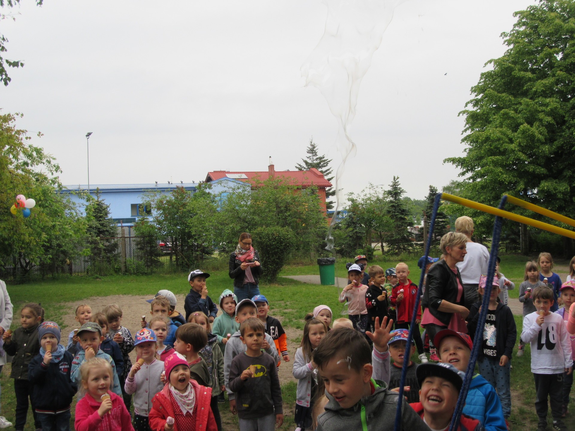 Dzień obfitował w liczne atrakcje. Na początek wóz strażacki , dzieci mogły obejrzeć go od środka a także zobaczyć jak działa wąż strażacki. Nasza Pani Dyrektor zamieniła się na chwilę w strażaka prezentując się w pełnym stroju strażackim. Tego dnia gościliśmy w naszej placówce animatora zabaw, który prowadził z dziećmi zabawy taneczne, tworzył wspaniałe bańki mydlane oraz różności z balonów. Dzieci malowały farbami na strechu oraz brały udział w zawodach sportowych. Nie zabrakło tego dnia słodkości, nasi milusińscy dostali lody oraz mogły częstować się pysznymi ciastami zrobionymi przez rodziców. Nie zabrakło też wesołych zabaw na świeżym powietrzu.