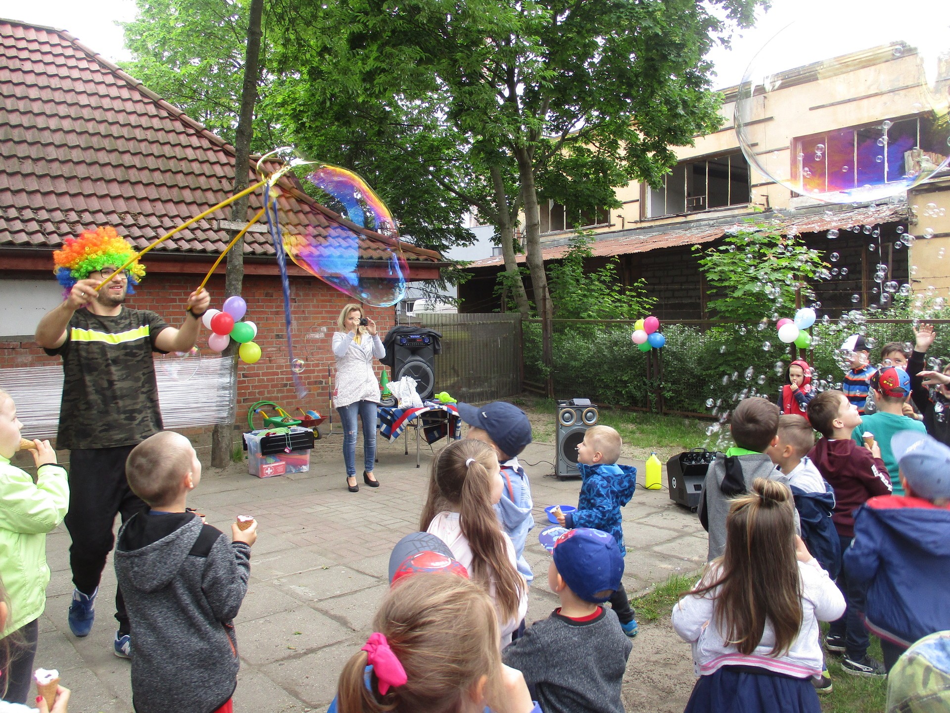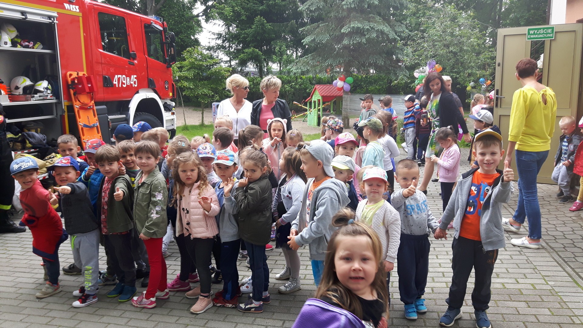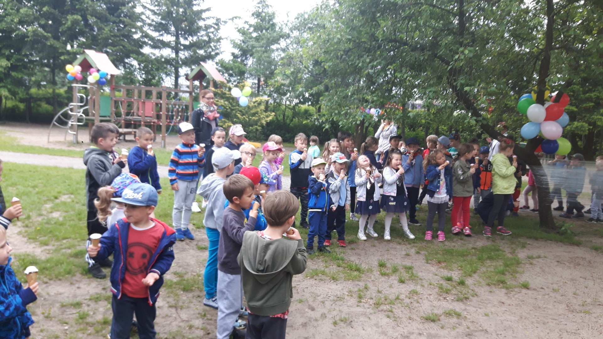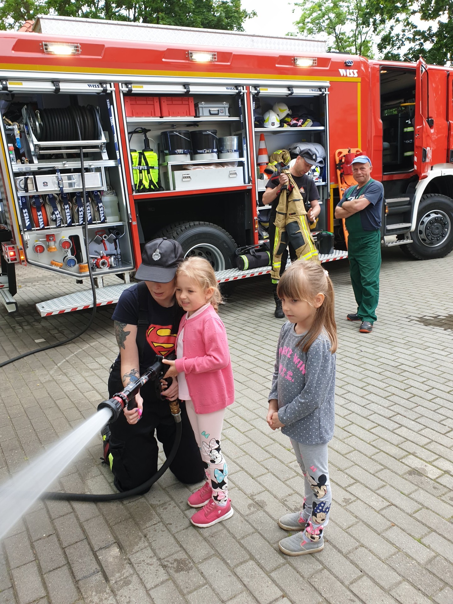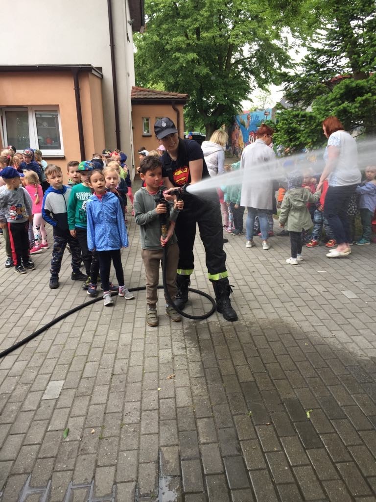Dzień obfitował w liczne atrakcje. Na początek wóz strażacki , dzieci mogły obejrzeć go od środka a także zobaczyć jak działa wąż strażacki. Nasza Pani Dyrektor zamieniła się na chwilę w strażaka prezentując się w pełnym stroju strażackim. Tego dnia gościliśmy w naszej placówce animatora zabaw, który prowadził z dziećmi zabawy taneczne, tworzył wspaniałe bańki mydlane oraz różności z balonów. Dzieci malowały farbami na strechu oraz brały udział w zawodach sportowych. Nie zabrakło tego dnia słodkości, nasi milusińscy dostali lody oraz mogły częstować się pysznymi ciastami zrobionymi przez rodziców. Nie zabrakło też wesołych zabaw na świeżym powietrzu.