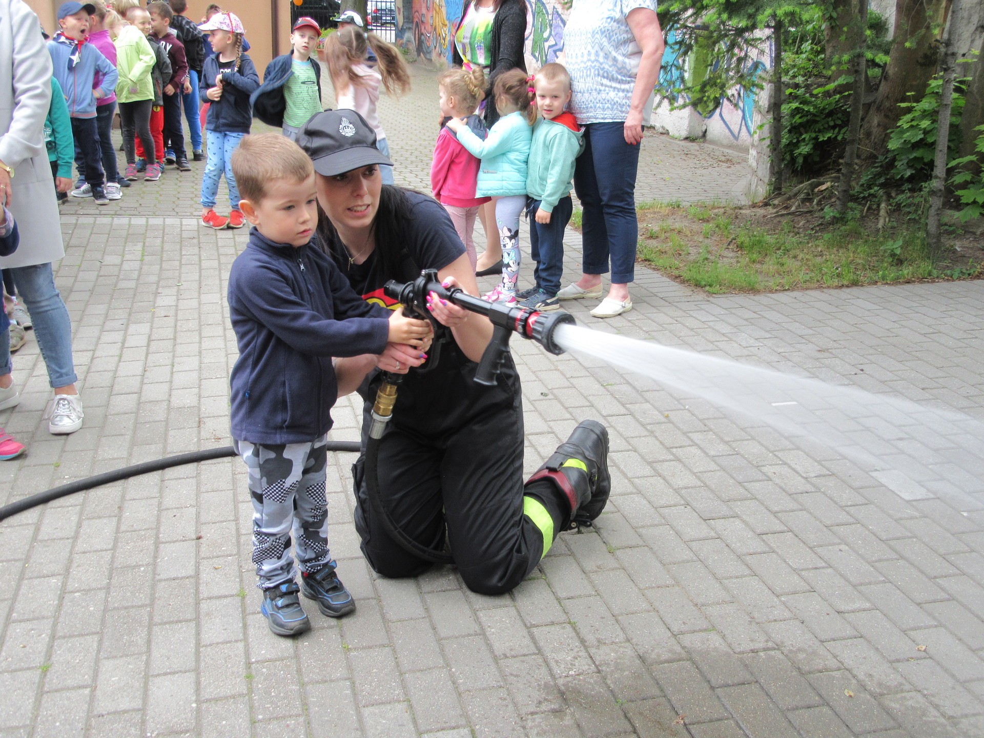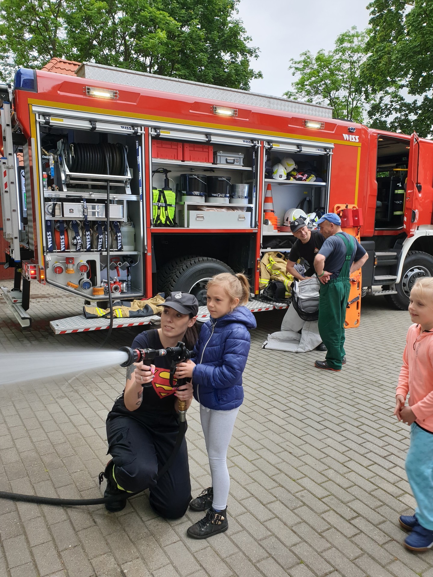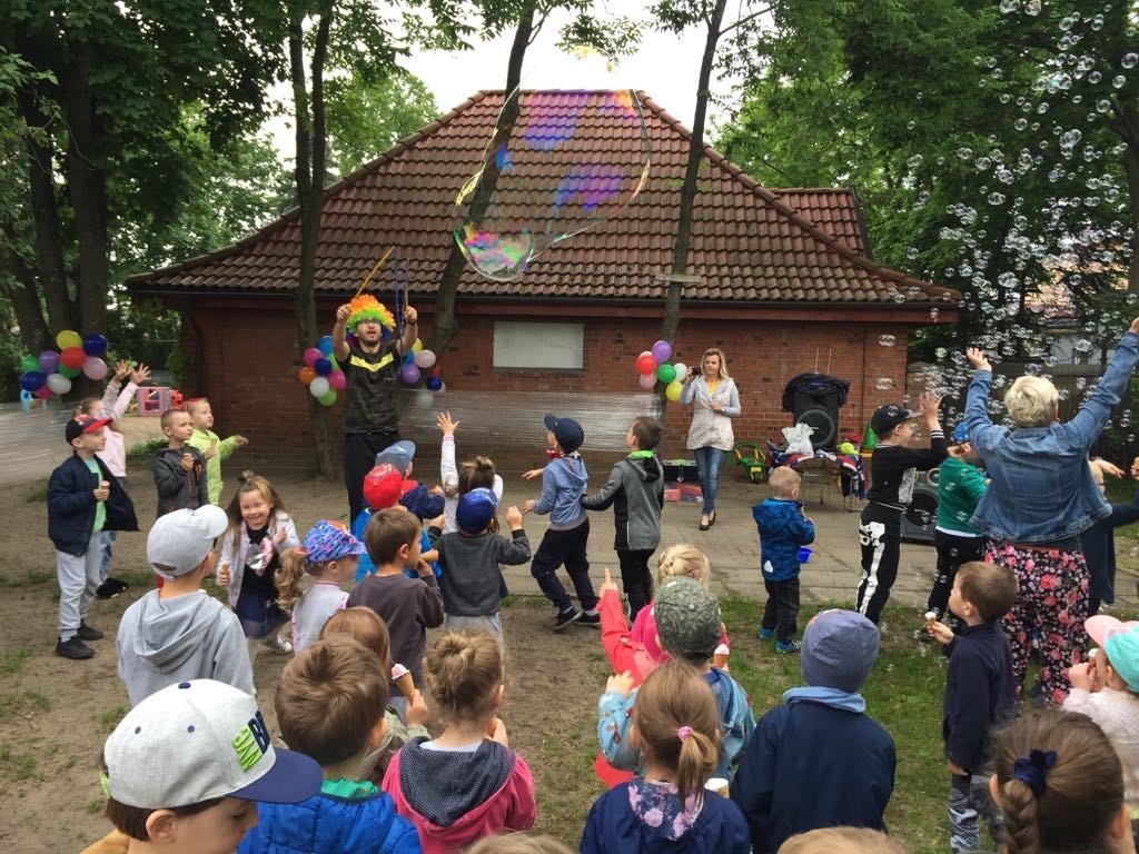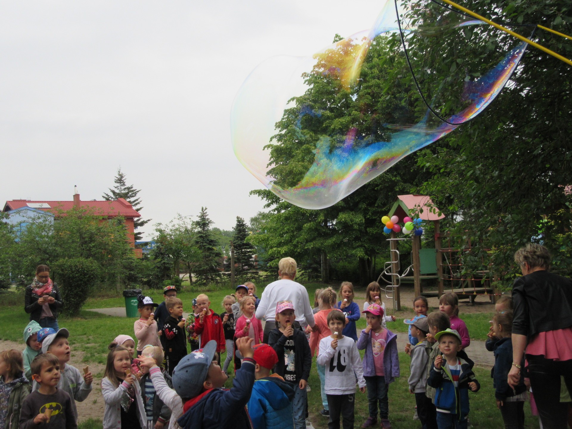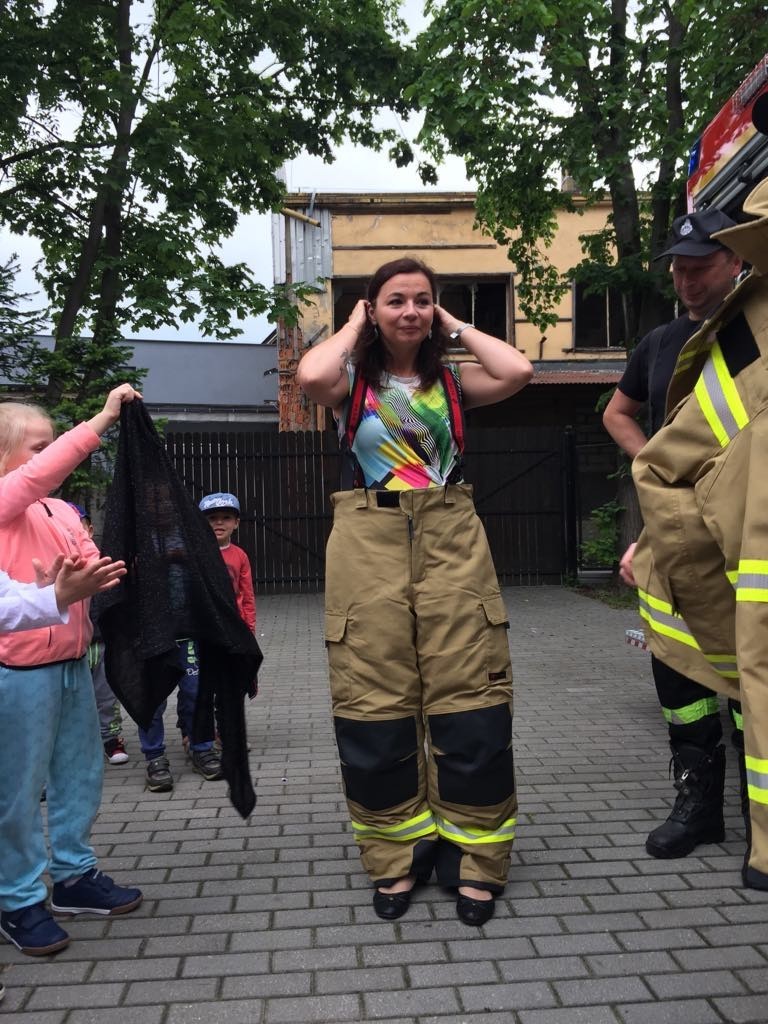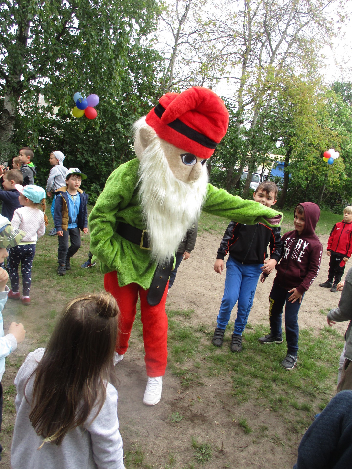 Dzień obfitował w liczne atrakcje. Na początek wóz strażacki , dzieci mogły obejrzeć go od środka a także zobaczyć jak działa wąż strażacki. Nasza Pani Dyrektor zamieniła się na chwilę w strażaka prezentując się w pełnym stroju strażackim. Tego dnia gościliśmy w naszej placówce animatora zabaw, który prowadził z dziećmi zabawy taneczne, tworzył wspaniałe bańki mydlane oraz różności z balonów. Dzieci malowały farbami na strechu oraz brały udział w zawodach sportowych. Nie zabrakło tego dnia słodkości, nasi milusińscy dostali lody oraz mogły częstować się pysznymi ciastami zrobionymi przez rodziców. Nie zabrakło też wesołych zabaw na świeżym powietrzu.