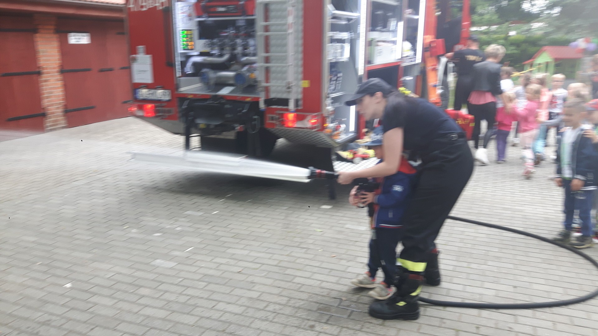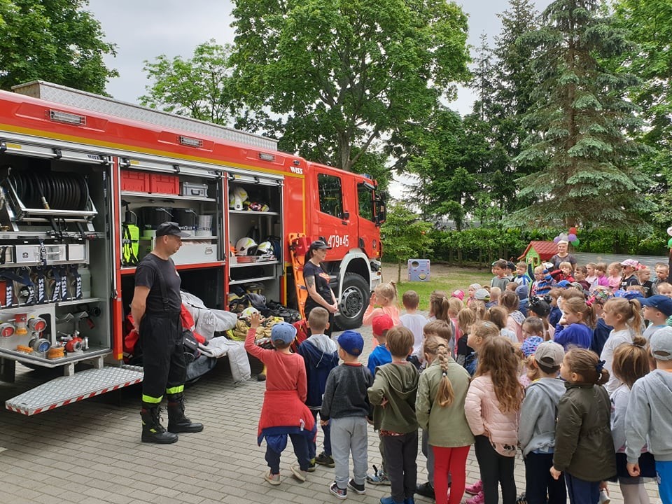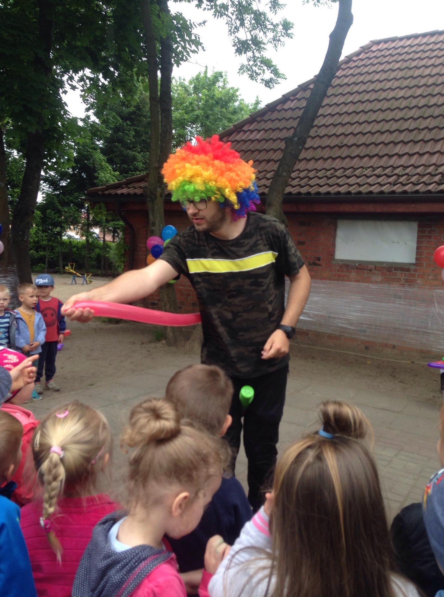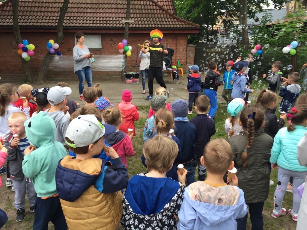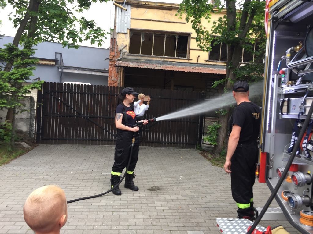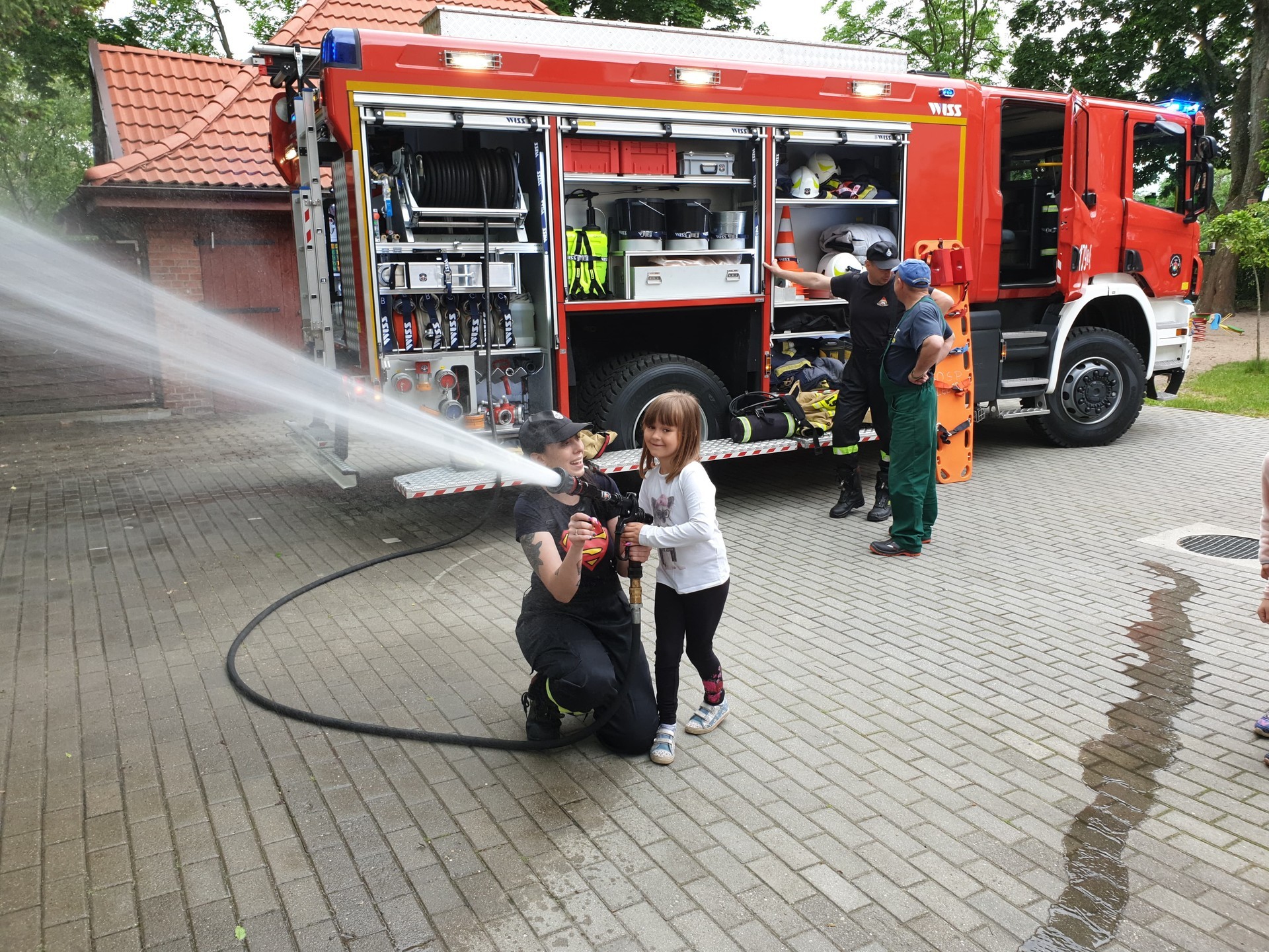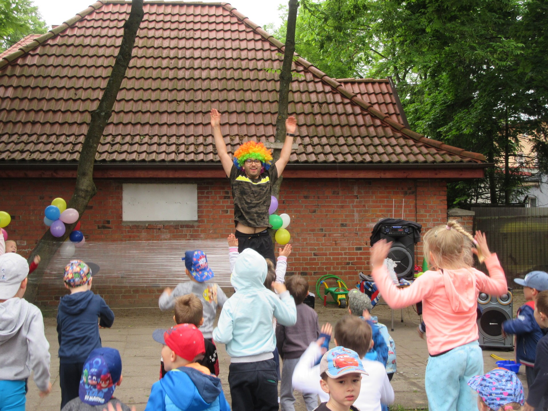 Dzień obfitował w liczne atrakcje. Na początek wóz strażacki , dzieci mogły obejrzeć go od środka a także zobaczyć jak działa wąż strażacki. Nasza Pani Dyrektor zamieniła się na chwilę w strażaka prezentując się w pełnym stroju strażackim. Tego dnia gościliśmy w naszej placówce animatora zabaw, który prowadził z dziećmi zabawy taneczne, tworzył wspaniałe bańki mydlane oraz różności z balonów. Dzieci malowały farbami na strechu oraz brały udział w zawodach sportowych. Nie zabrakło tego dnia słodkości, nasi milusińscy dostali lody oraz mogły częstować się pysznymi ciastami zrobionymi przez rodziców. Nie zabrakło też wesołych zabaw na świeżym powietrzu.