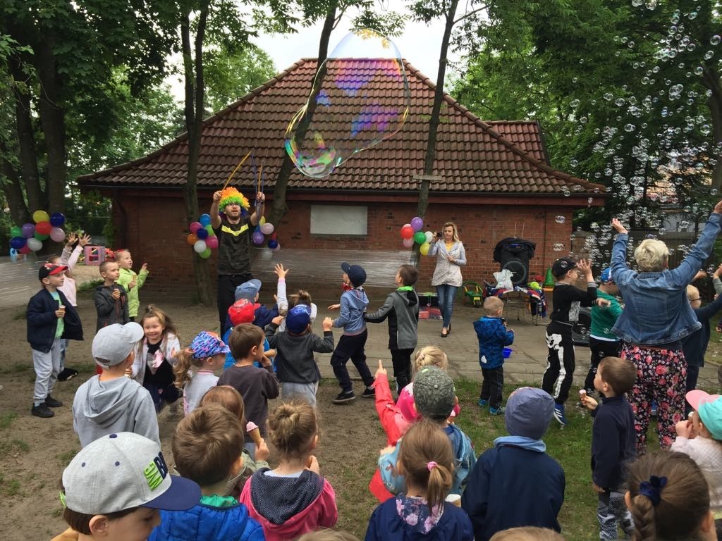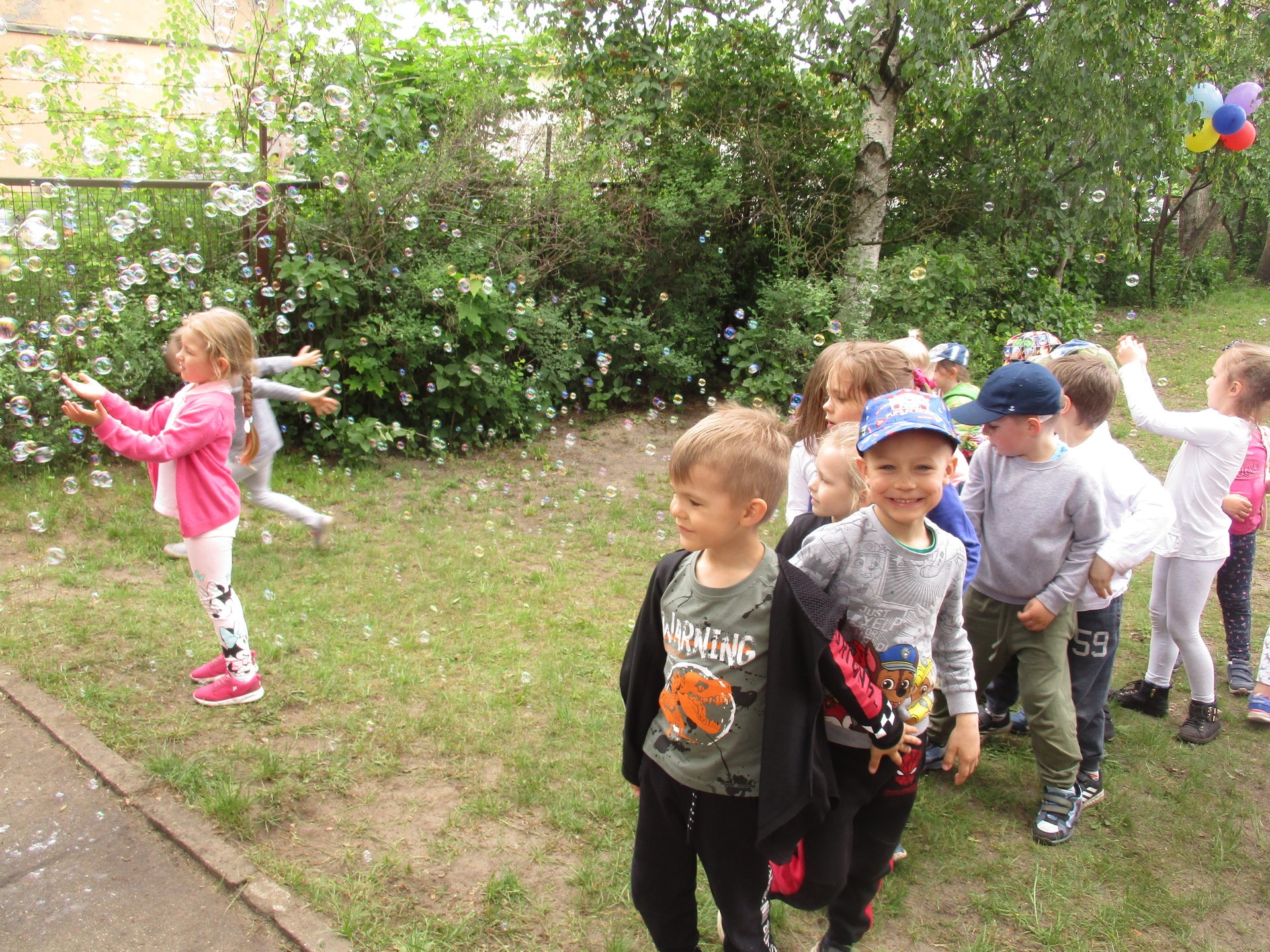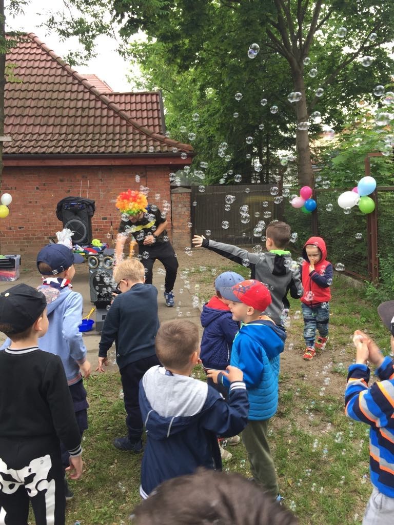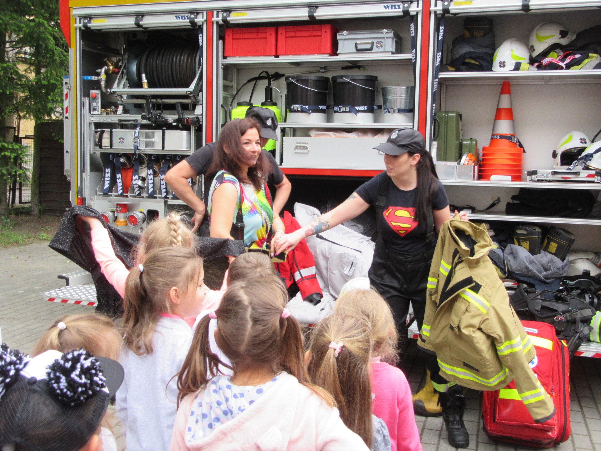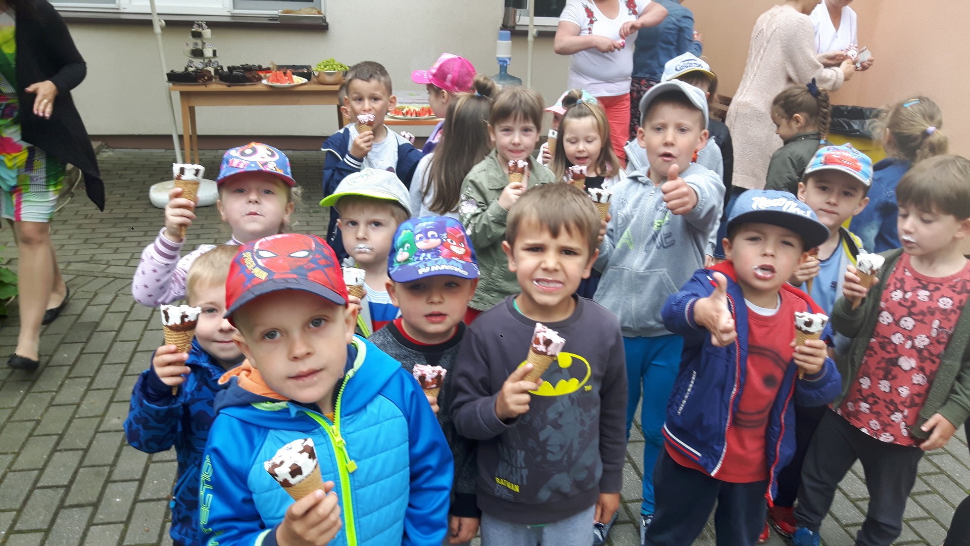 Dzień obfitował w liczne atrakcje. Na początek wóz strażacki , dzieci mogły obejrzeć go od środka a także zobaczyć jak działa wąż strażacki. Nasza Pani Dyrektor zamieniła się na chwilę w strażaka prezentując się w pełnym stroju strażackim. Tego dnia gościliśmy w naszej placówce animatora zabaw, który prowadził z dziećmi zabawy taneczne, tworzył wspaniałe bańki mydlane oraz różności z balonów. Dzieci malowały farbami na strechu oraz brały udział w zawodach sportowych. Nie zabrakło tego dnia słodkości, nasi milusińscy dostali lody oraz mogły częstować się pysznymi ciastami zrobionymi przez rodziców. Nie zabrakło też wesołych zabaw na świeżym powietrzu.
