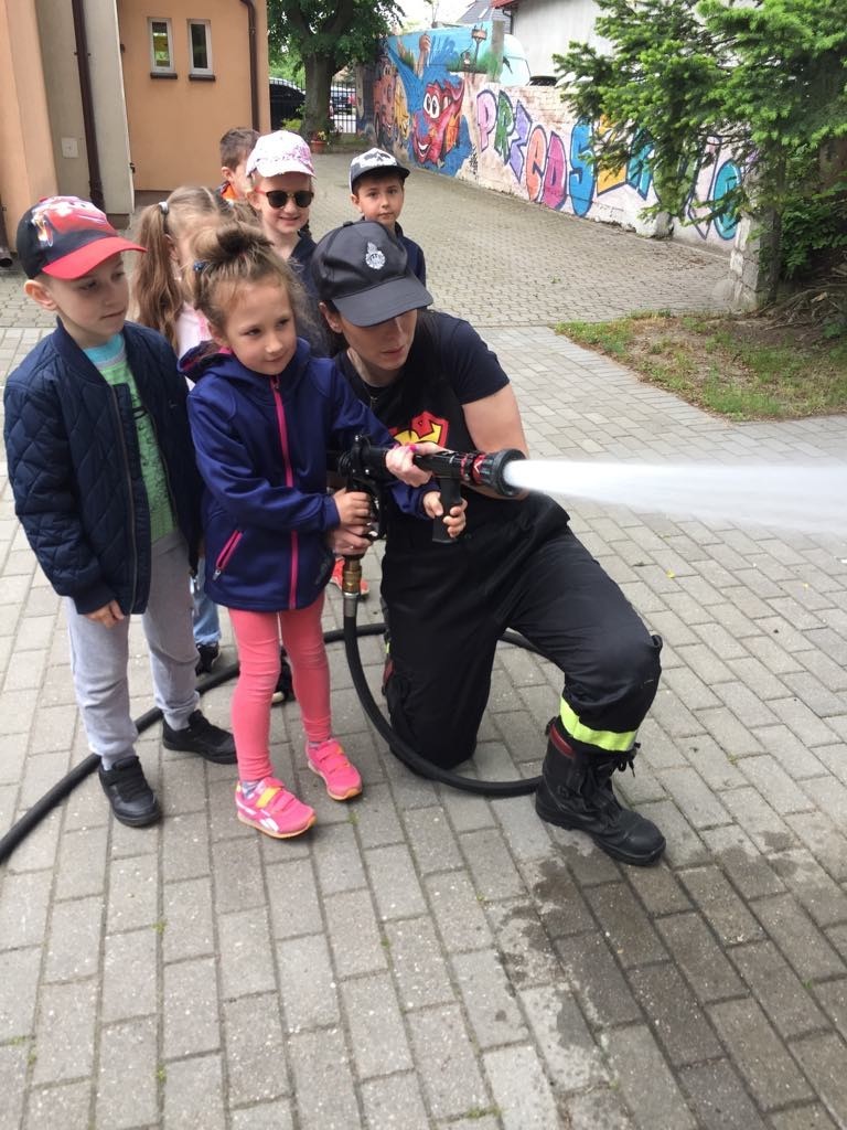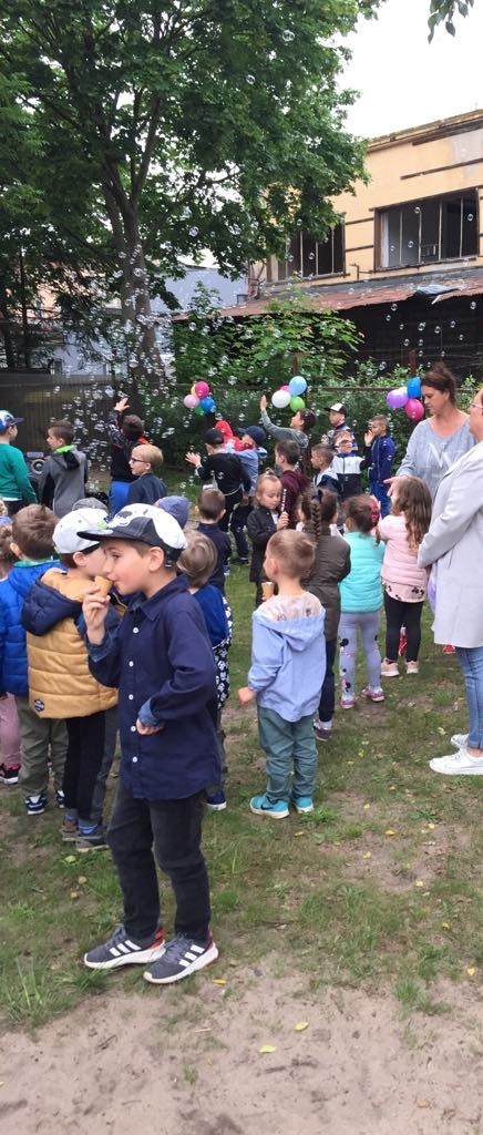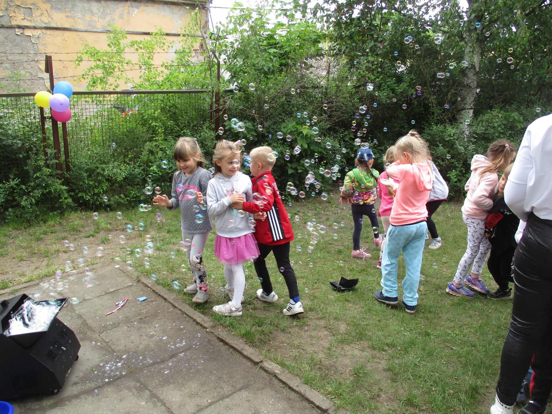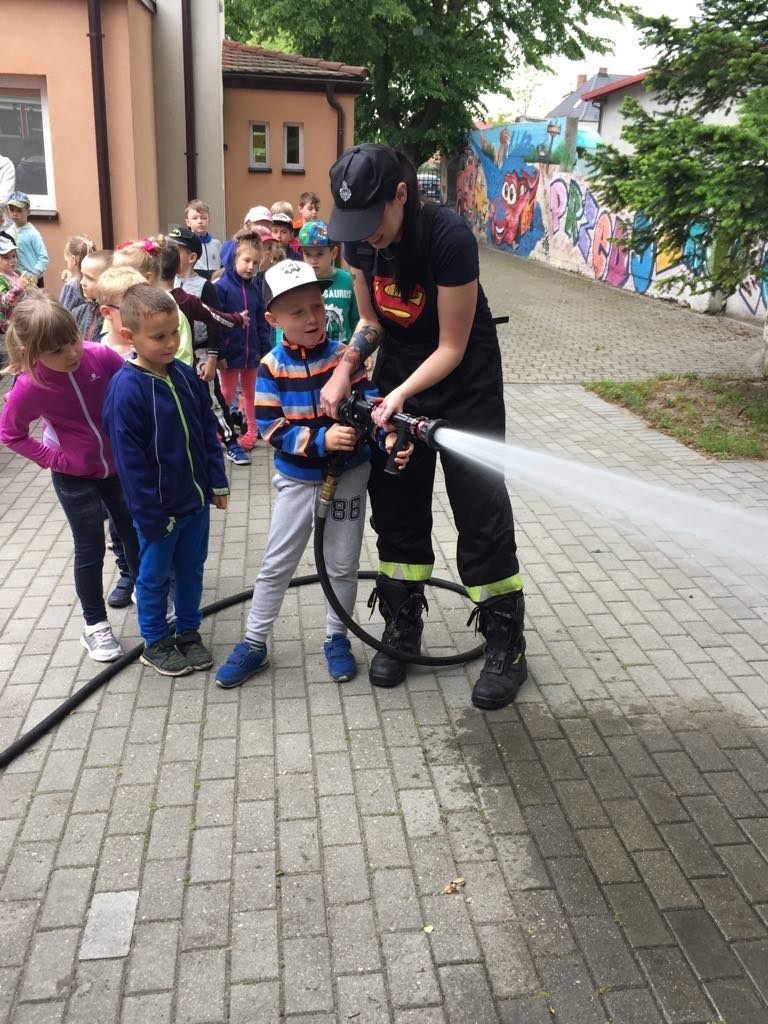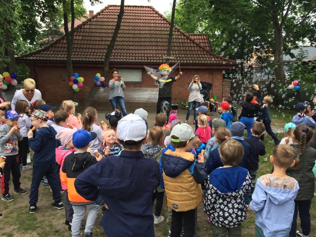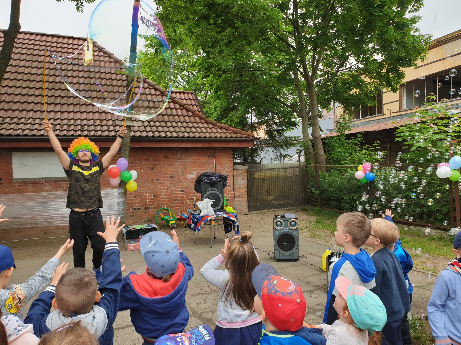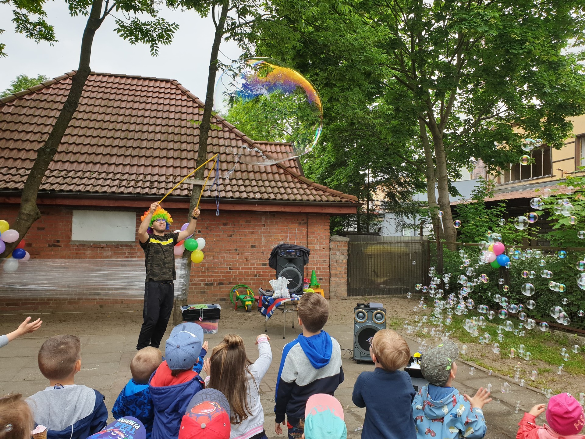 Dzień obfitował w liczne atrakcje. Na początek wóz strażacki , dzieci mogły obejrzeć go od środka a także zobaczyć jak działa wąż strażacki. Nasza Pani Dyrektor zamieniła się na chwilę w strażaka prezentując się w pełnym stroju strażackim. Tego dnia gościliśmy w naszej placówce animatora zabaw, który prowadził z dziećmi zabawy taneczne, tworzył wspaniałe bańki mydlane oraz różności z balonów. Dzieci malowały farbami na strechu oraz brały udział w zawodach sportowych. Nie zabrakło tego dnia słodkości, nasi milusińscy dostali lody oraz mogły częstować się pysznymi ciastami zrobionymi przez rodziców. Nie zabrakło też wesołych zabaw na świeżym powietrzu.