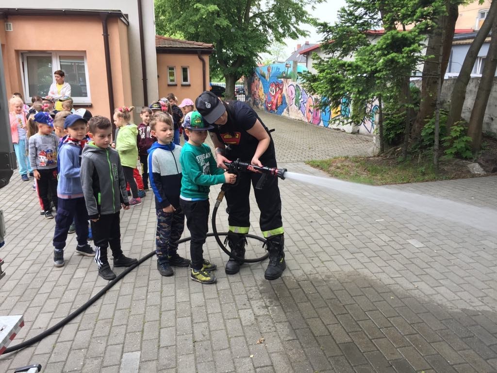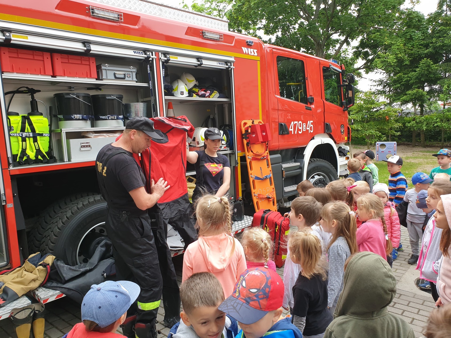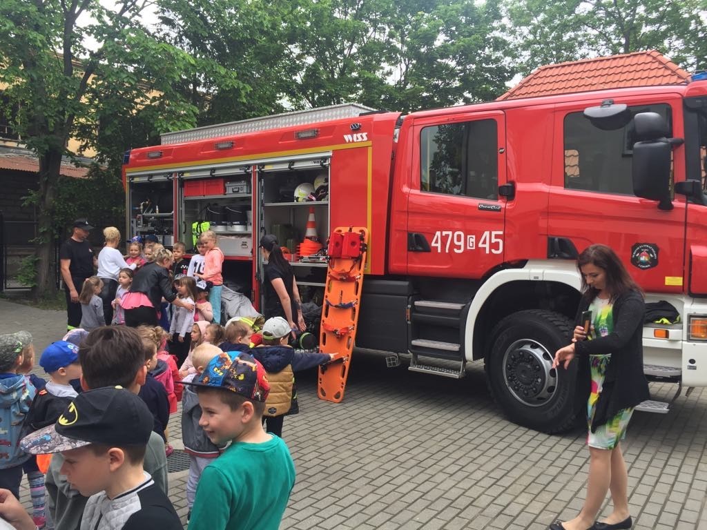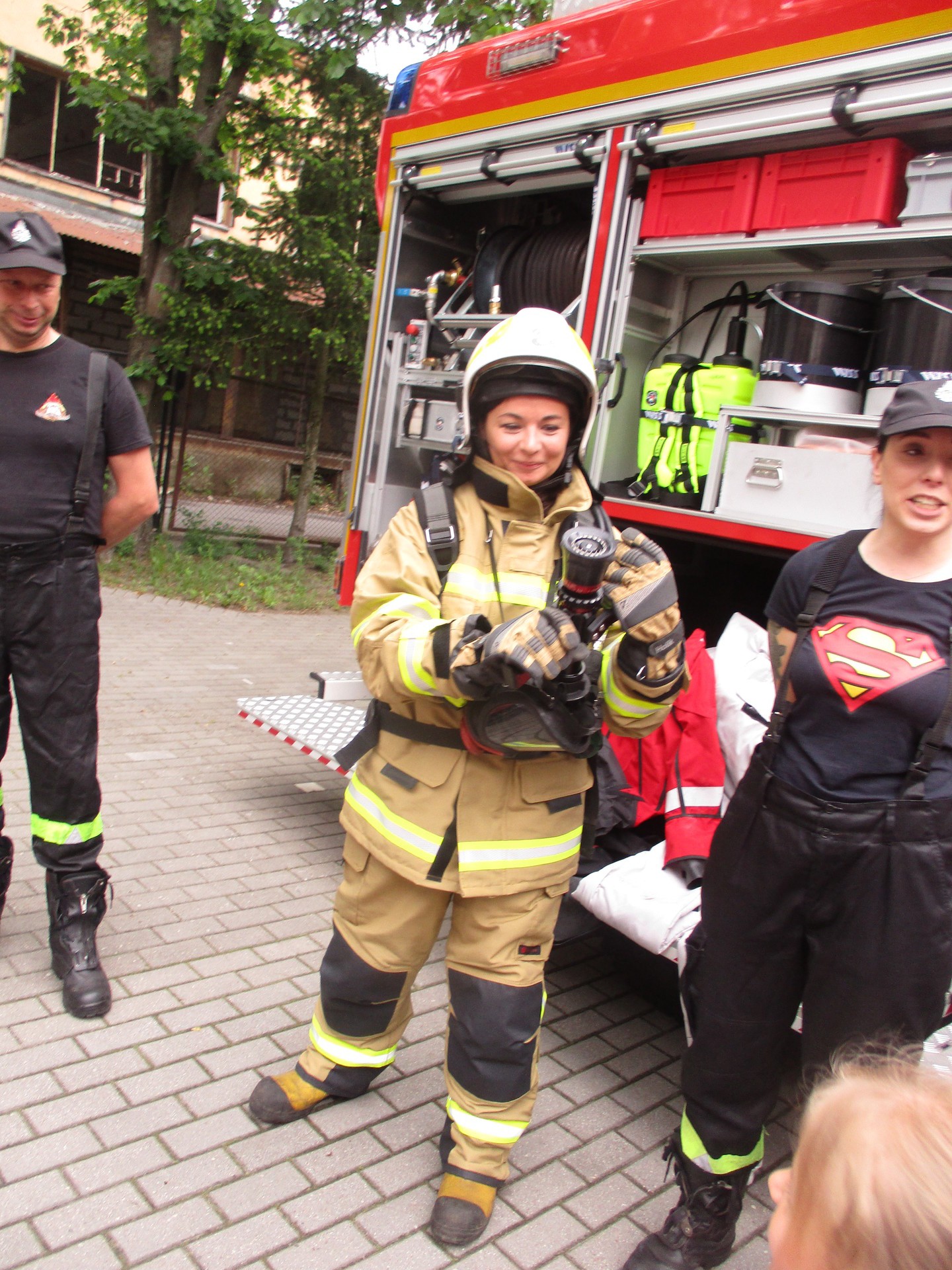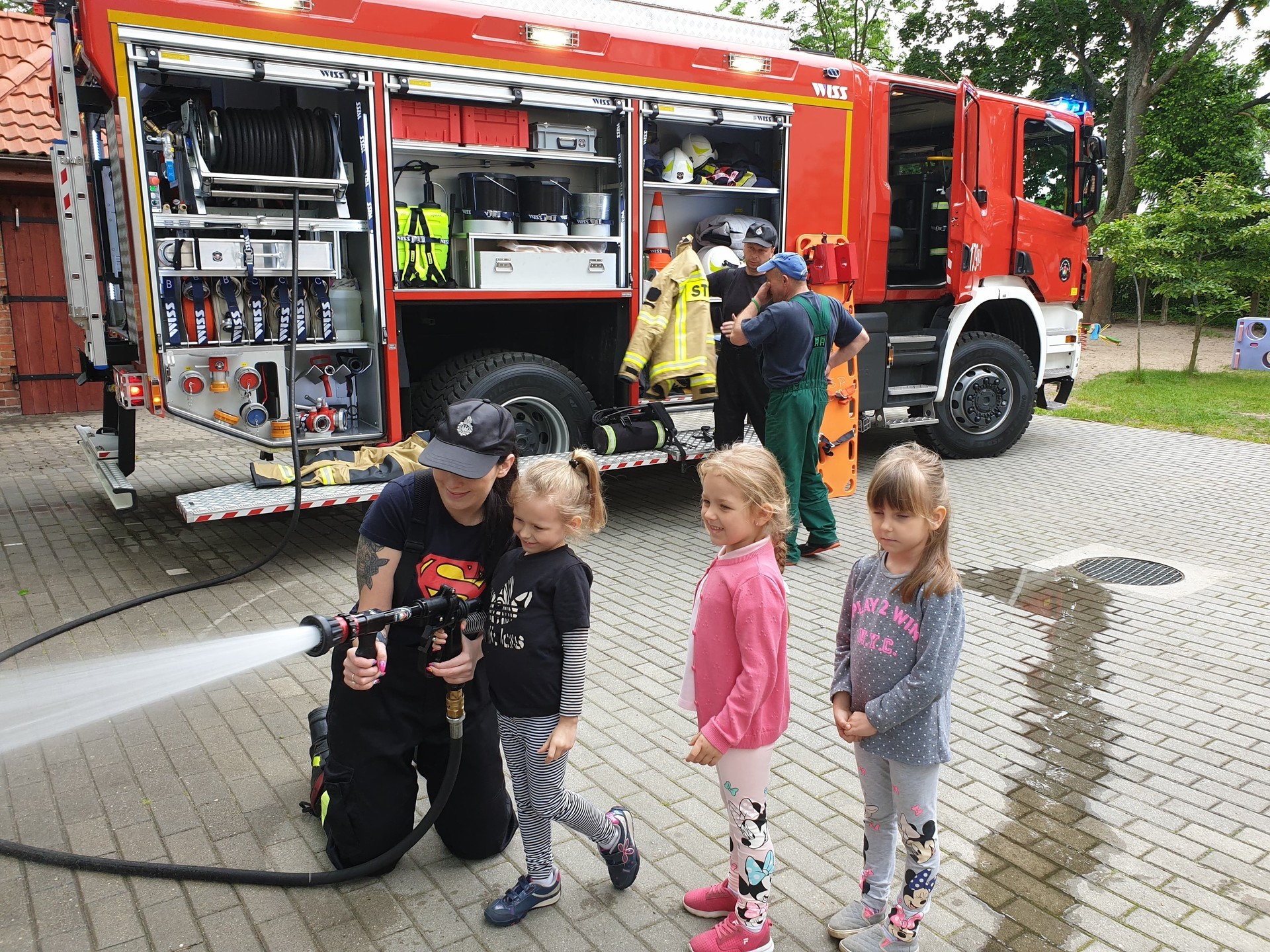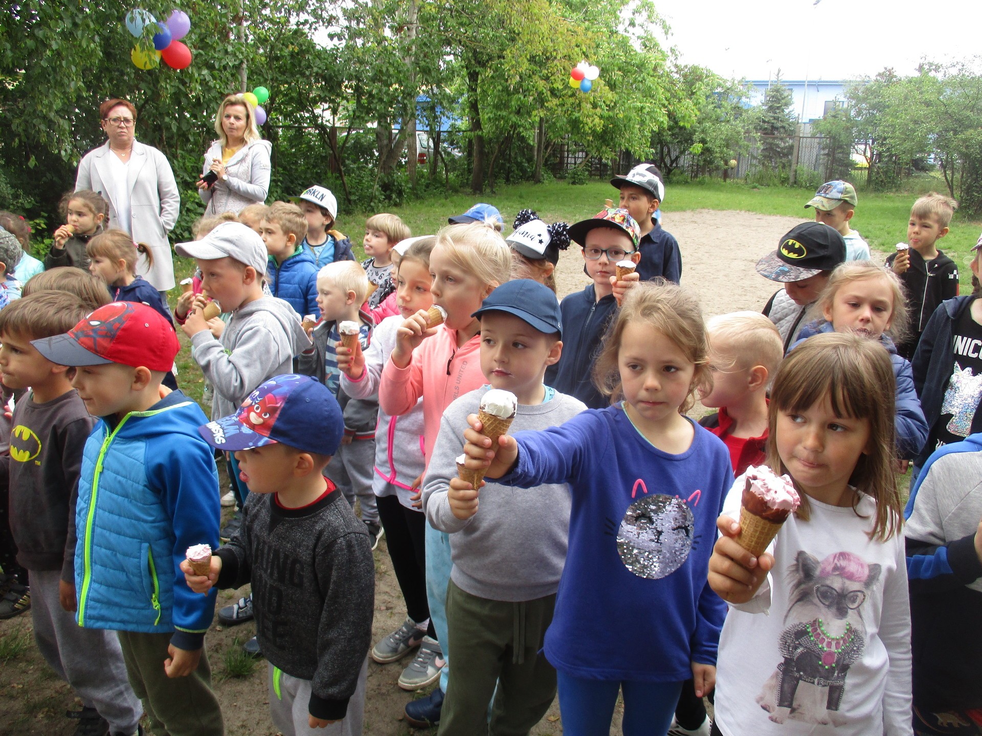 Dzień obfitował w liczne atrakcje. Na początek wóz strażacki , dzieci mogły obejrzeć go od środka a także zobaczyć jak działa wąż strażacki. Nasza Pani Dyrektor zamieniła się na chwilę w strażaka prezentując się w pełnym stroju strażackim. Tego dnia gościliśmy w naszej placówce animatora zabaw, który prowadził z dziećmi zabawy taneczne, tworzył wspaniałe bańki mydlane oraz różności z balonów. Dzieci malowały farbami na strechu oraz brały udział w zawodach sportowych. Nie zabrakło tego dnia słodkości, nasi milusińscy dostali lody oraz mogły częstować się pysznymi ciastami zrobionymi przez rodziców. Nie zabrakło też wesołych zabaw na świeżym powietrzu.