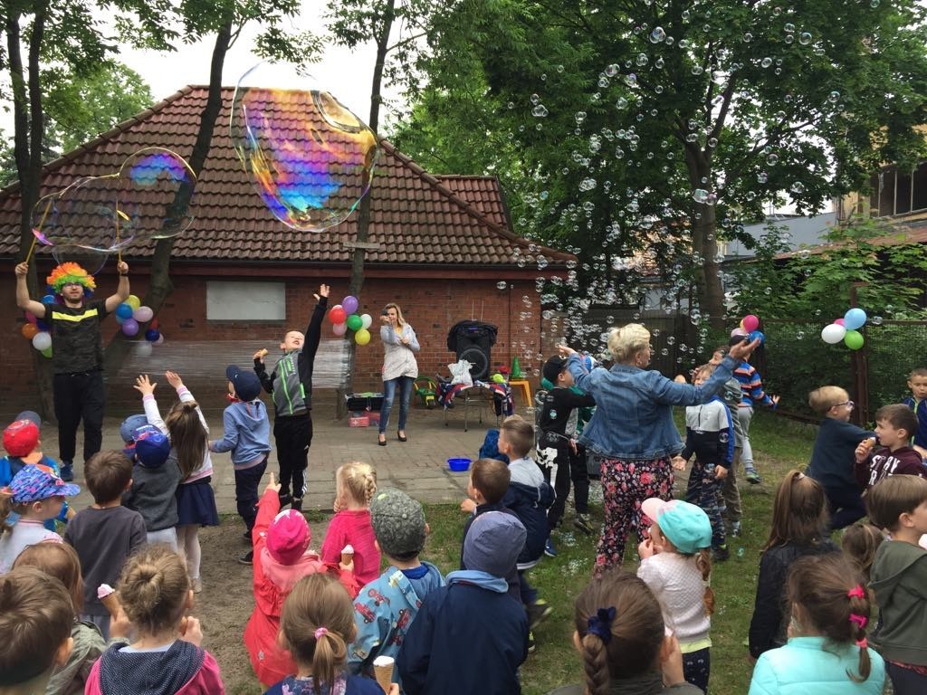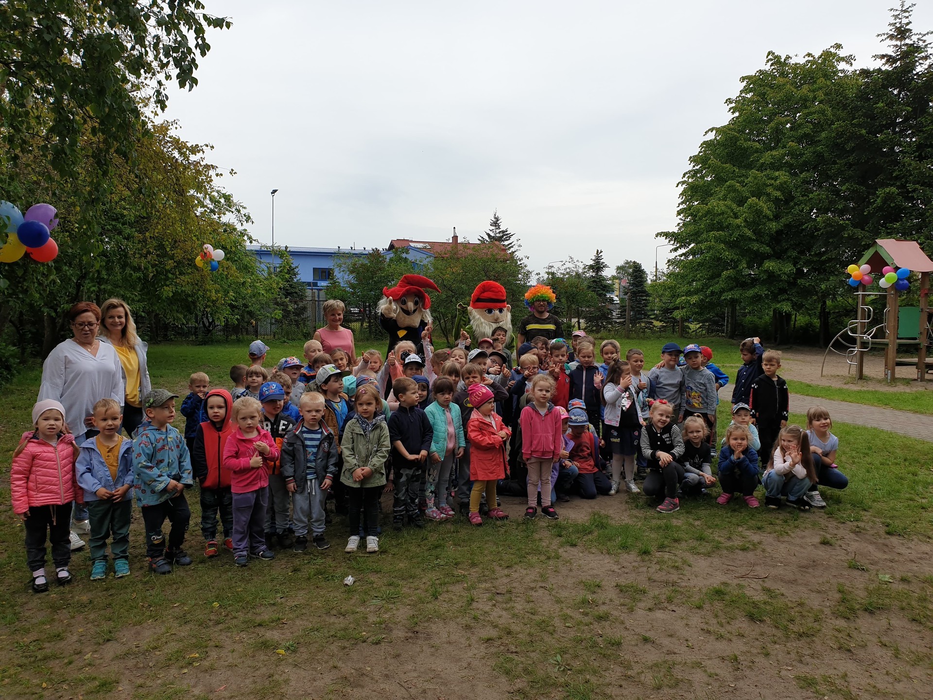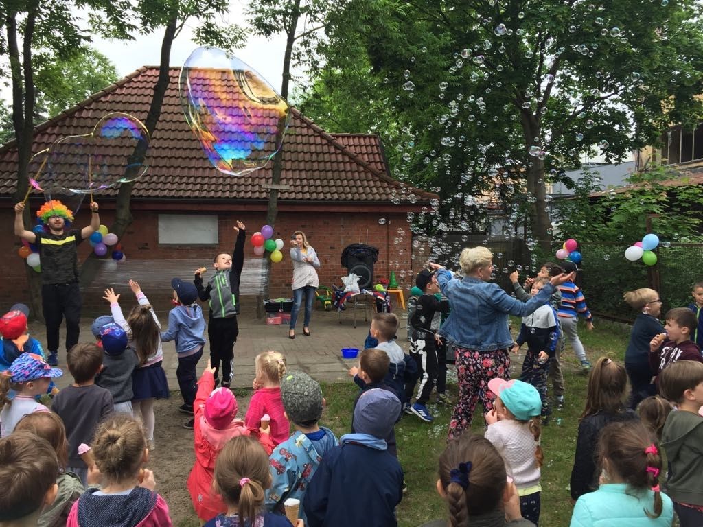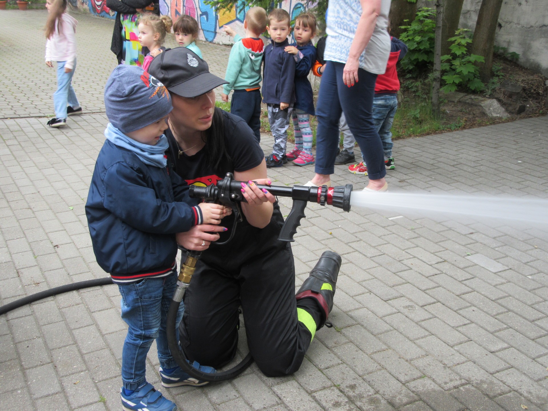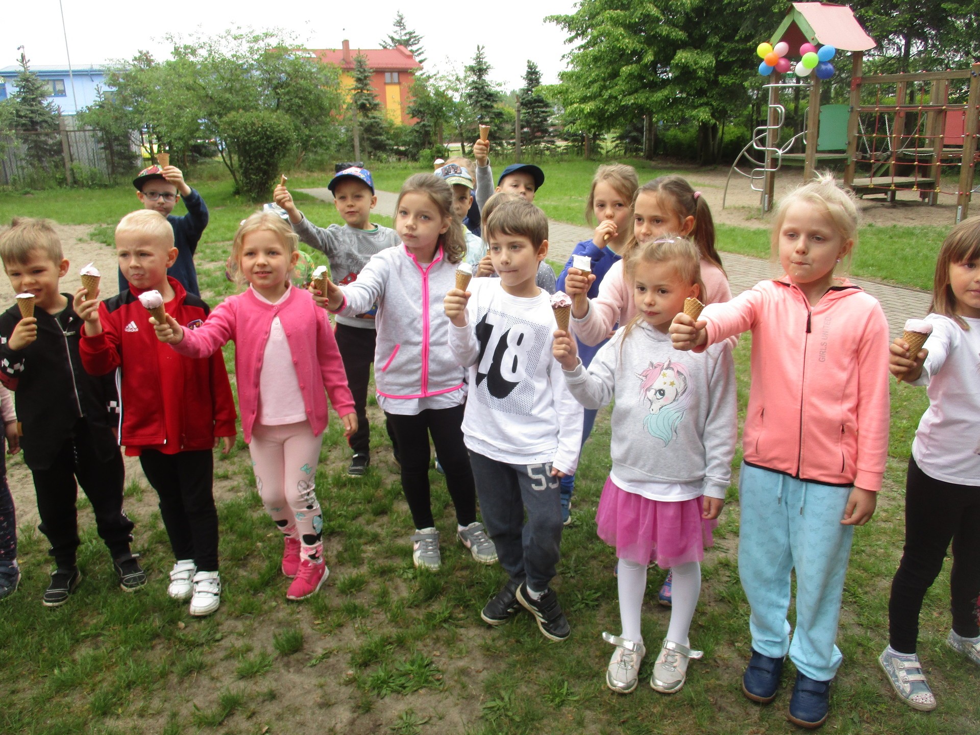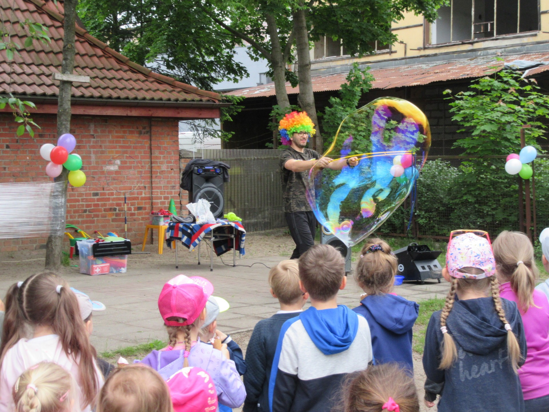 Dzień obfitował w liczne atrakcje. Na początek wóz strażacki , dzieci mogły obejrzeć go od środka a także zobaczyć jak działa wąż strażacki. Nasza Pani Dyrektor zamieniła się na chwilę w strażaka prezentując się w pełnym stroju strażackim. Tego dnia gościliśmy w naszej placówce animatora zabaw, który prowadził z dziećmi zabawy taneczne, tworzył wspaniałe bańki mydlane oraz różności z balonów. Dzieci malowały farbami na strechu oraz brały udział w zawodach sportowych. Nie zabrakło tego dnia słodkości, nasi milusińscy dostali lody oraz mogły częstować się pysznymi ciastami zrobionymi przez rodziców. Nie zabrakło też wesołych zabaw na świeżym powietrzu.