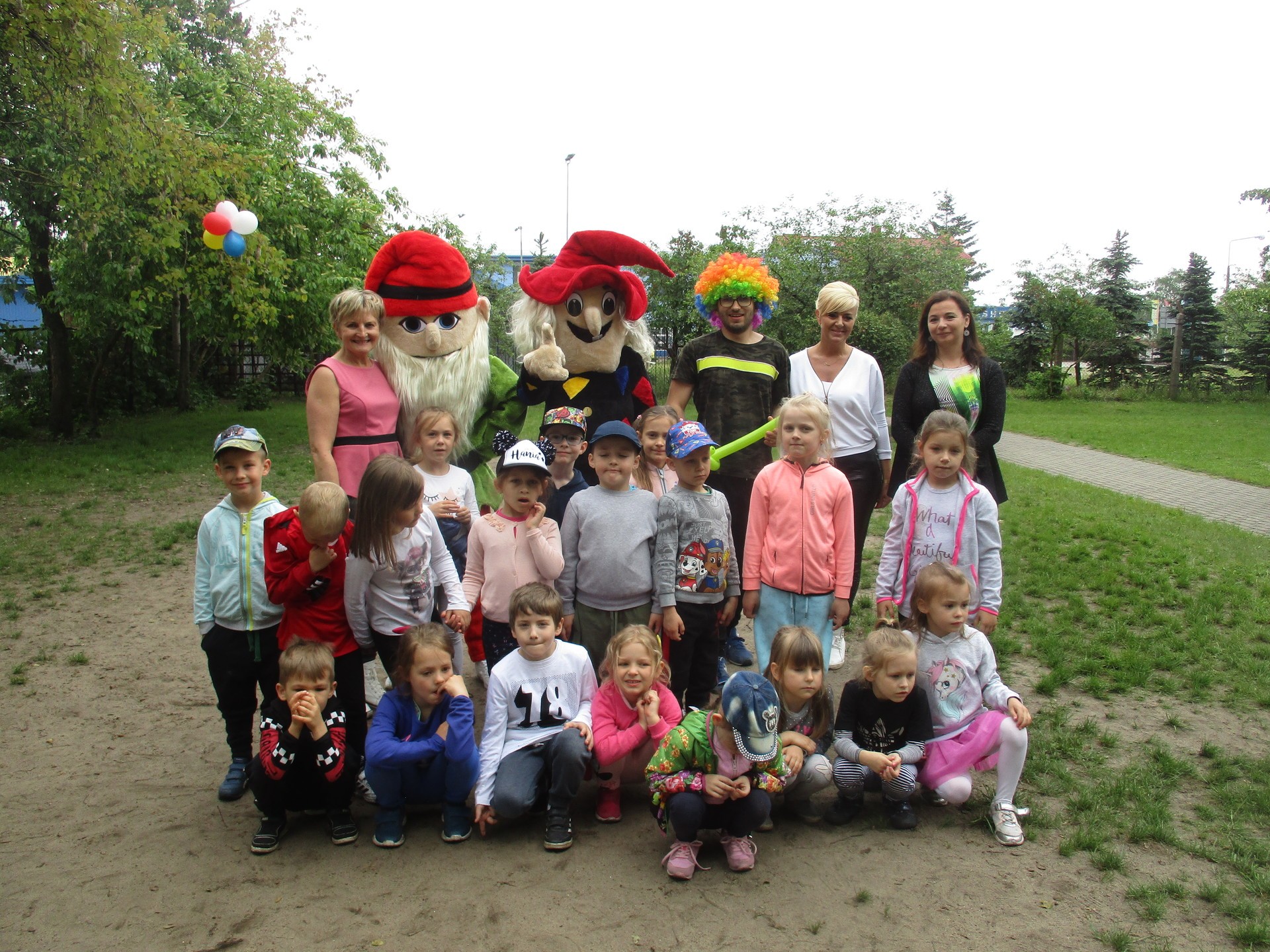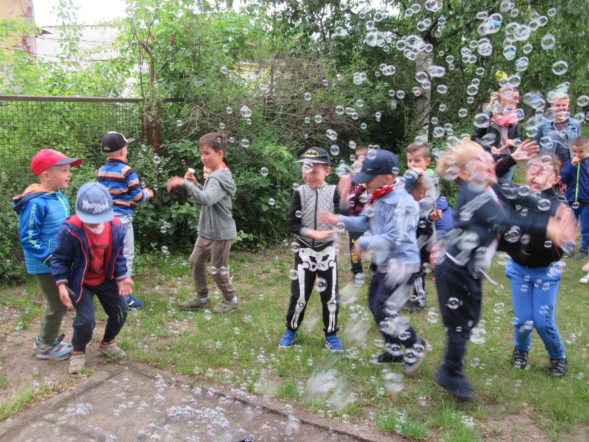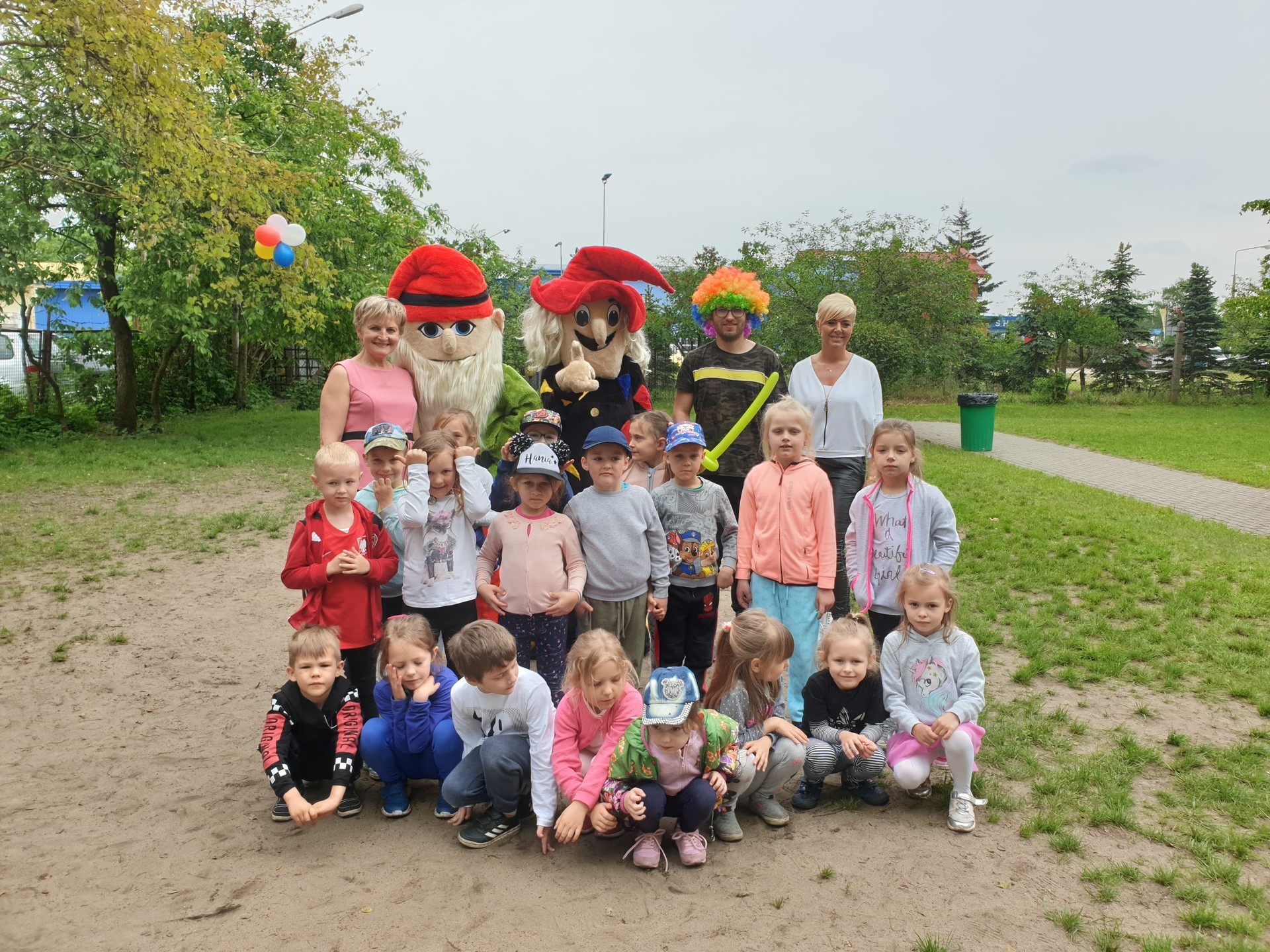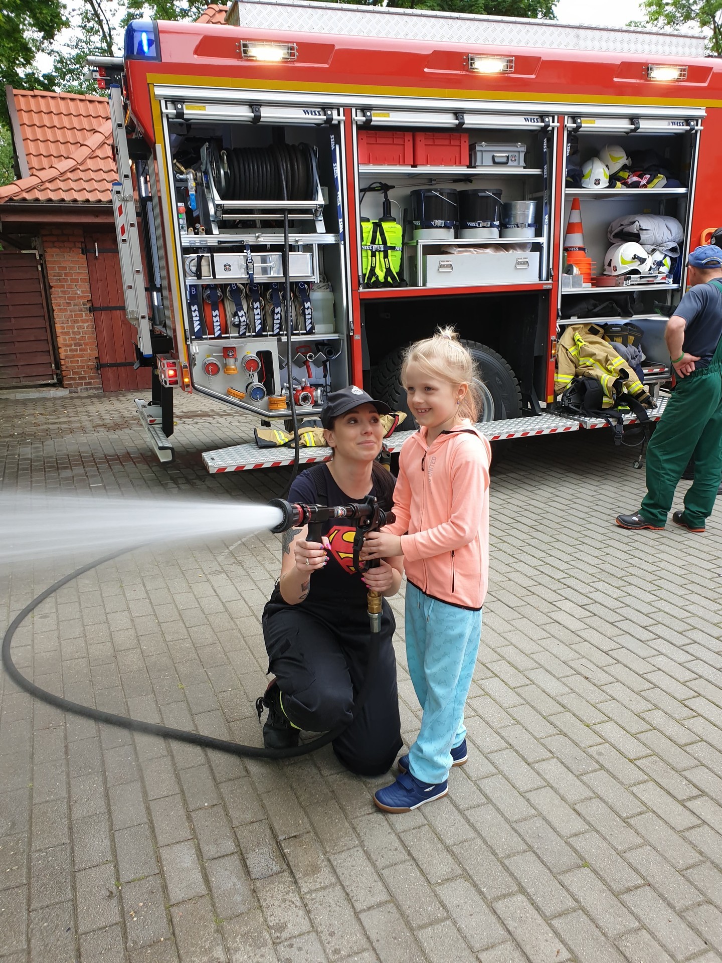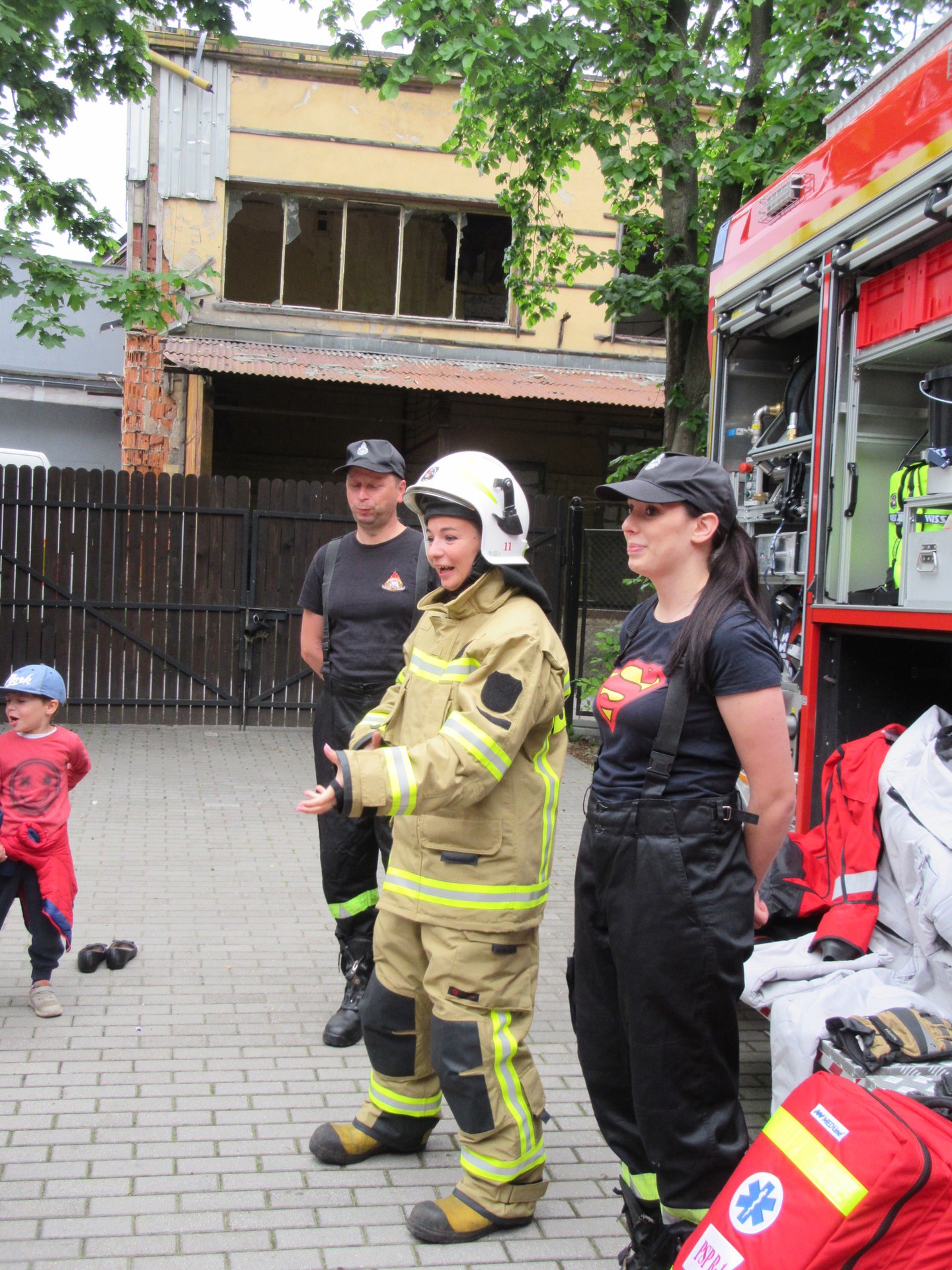 Dzień obfitował w liczne atrakcje. Na początek wóz strażacki , dzieci mogły obejrzeć go od środka a także zobaczyć jak działa wąż strażacki. Nasza Pani Dyrektor zamieniła się na chwilę w strażaka prezentując się w pełnym stroju strażackim. Tego dnia gościliśmy w naszej placówce animatora zabaw, który prowadził z dziećmi zabawy taneczne, tworzył wspaniałe bańki mydlane oraz różności z balonów. Dzieci malowały farbami na strechu oraz brały udział w zawodach sportowych. Nie zabrakło tego dnia słodkości, nasi milusińscy dostali lody oraz mogły częstować się pysznymi ciastami zrobionymi przez rodziców. Nie zabrakło też wesołych zabaw na świeżym powietrzu.