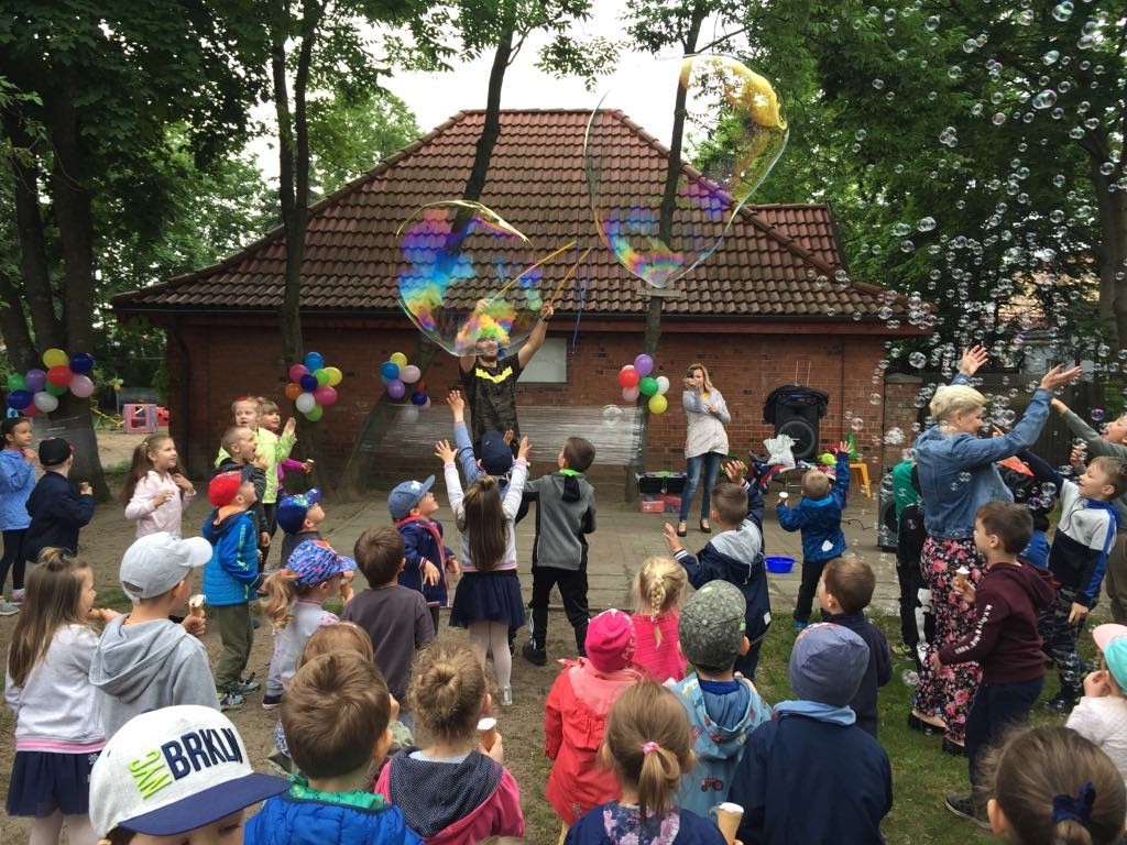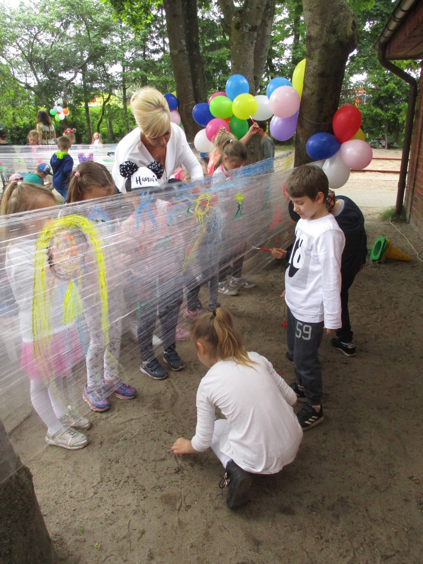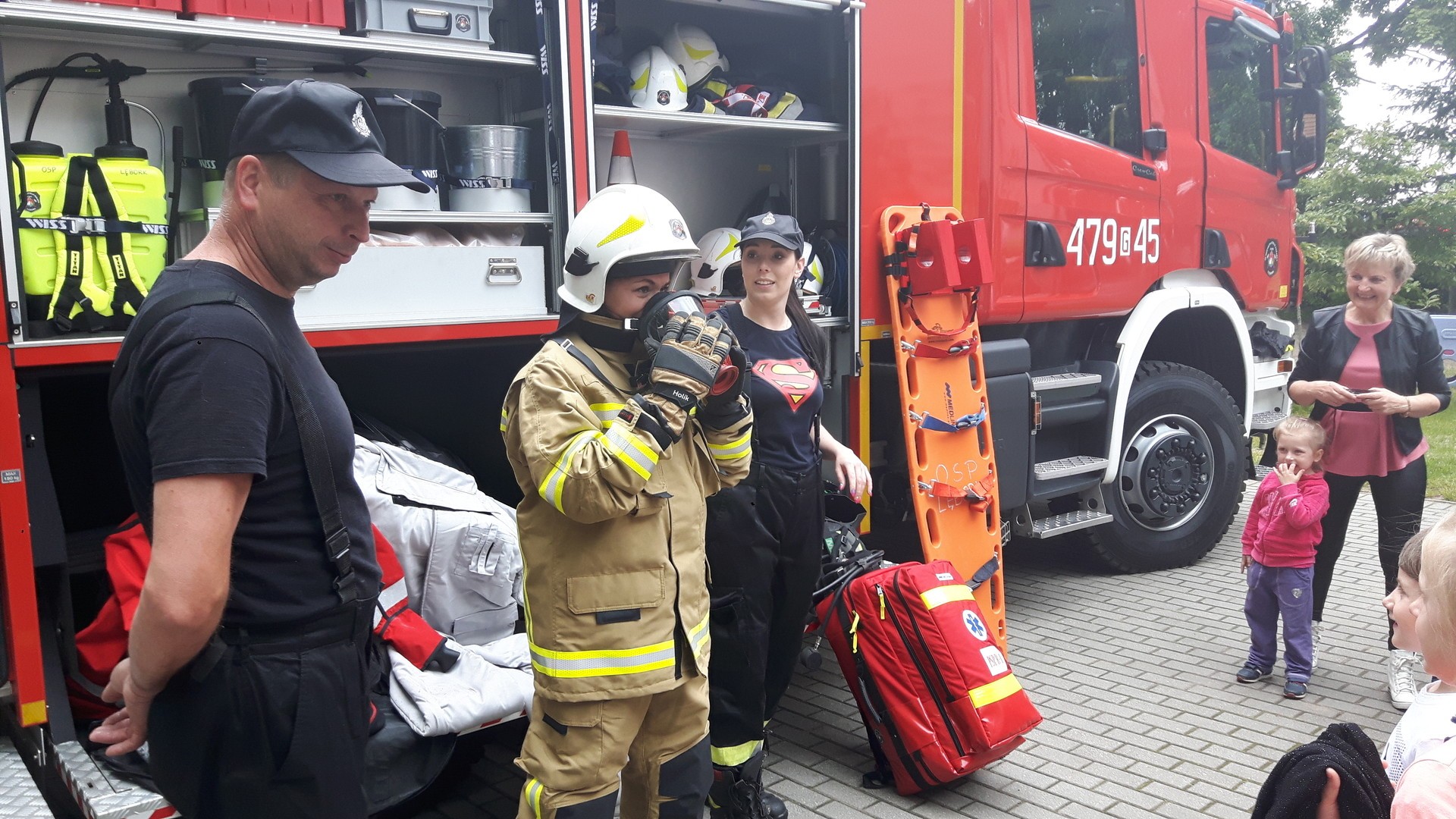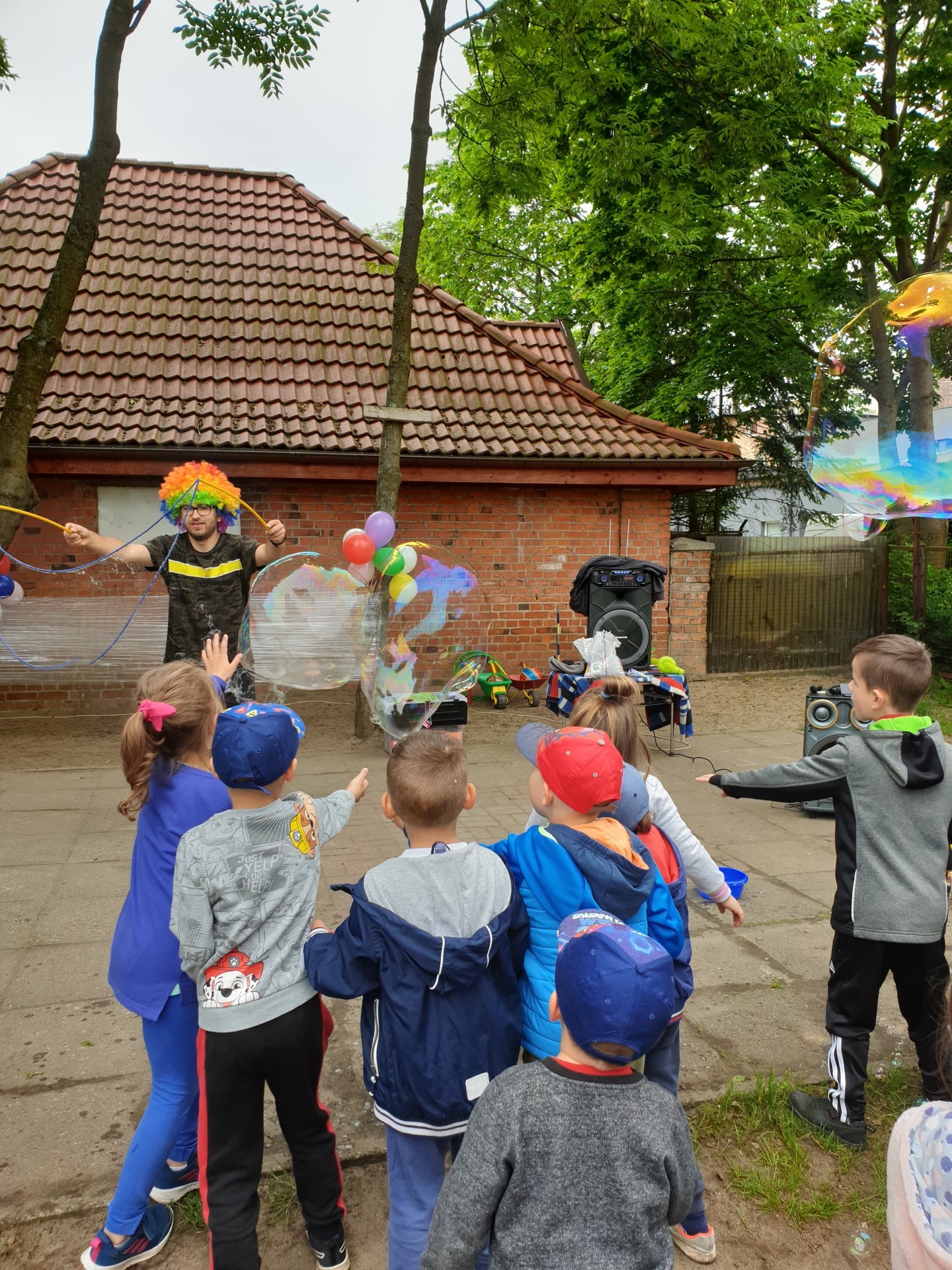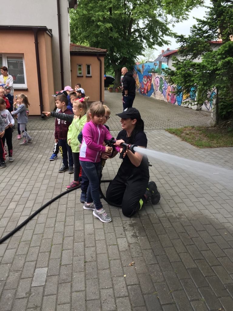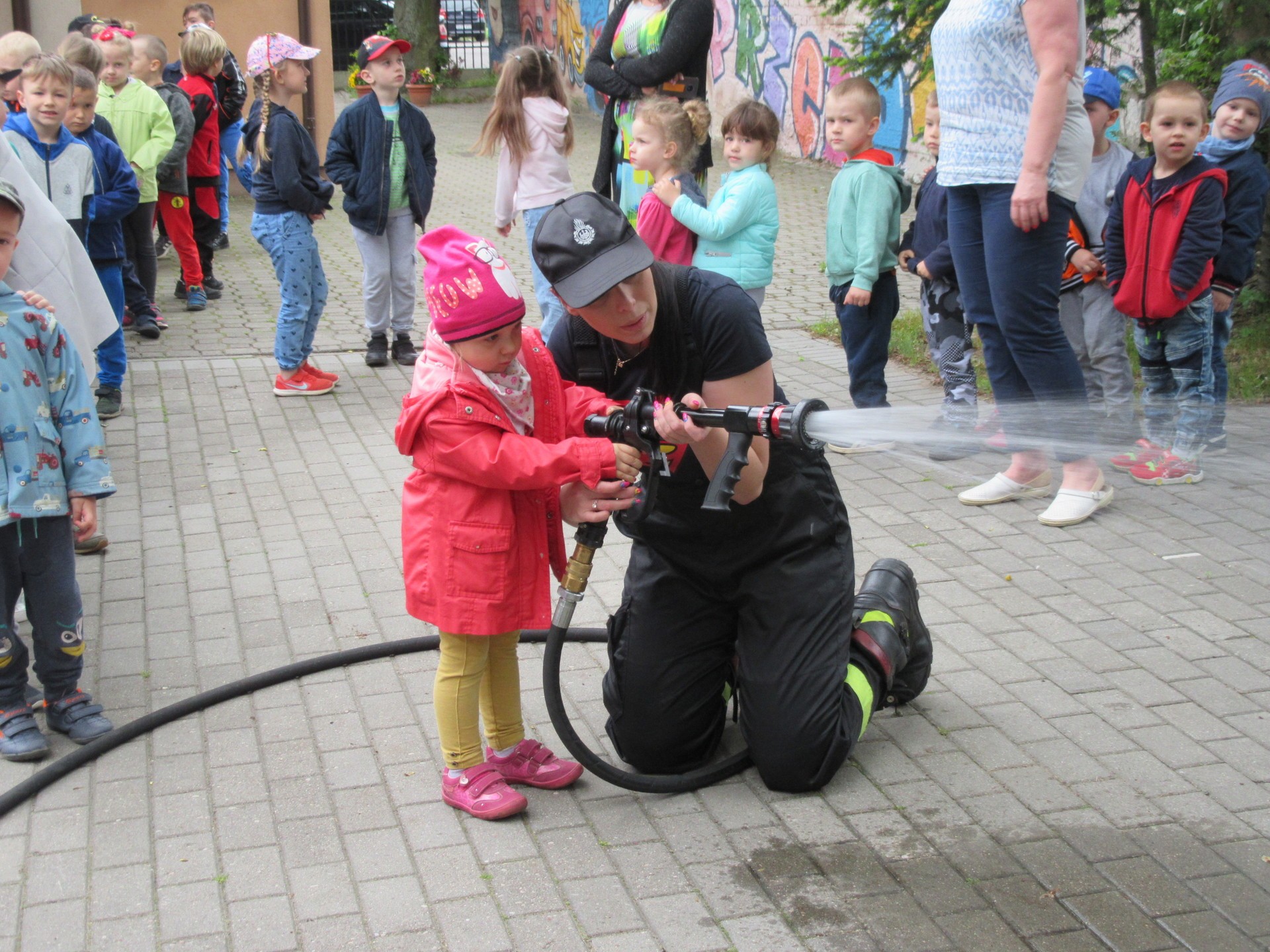 Dzień obfitował w liczne atrakcje. Na początek wóz strażacki , dzieci mogły obejrzeć go od środka a także zobaczyć jak działa wąż strażacki. Nasza Pani Dyrektor zamieniła się na chwilę w strażaka prezentując się w pełnym stroju strażackim. Tego dnia gościliśmy w naszej placówce animatora zabaw, który prowadził z dziećmi zabawy taneczne, tworzył wspaniałe bańki mydlane oraz różności z balonów. Dzieci malowały farbami na strechu oraz brały udział w zawodach sportowych. Nie zabrakło tego dnia słodkości, nasi milusińscy dostali lody oraz mogły częstować się pysznymi ciastami zrobionymi przez rodziców. Nie zabrakło też wesołych zabaw na świeżym powietrzu.