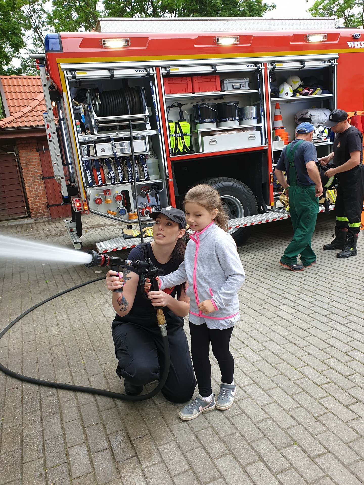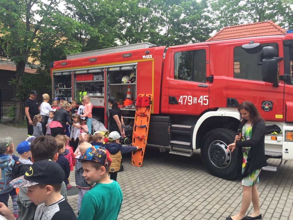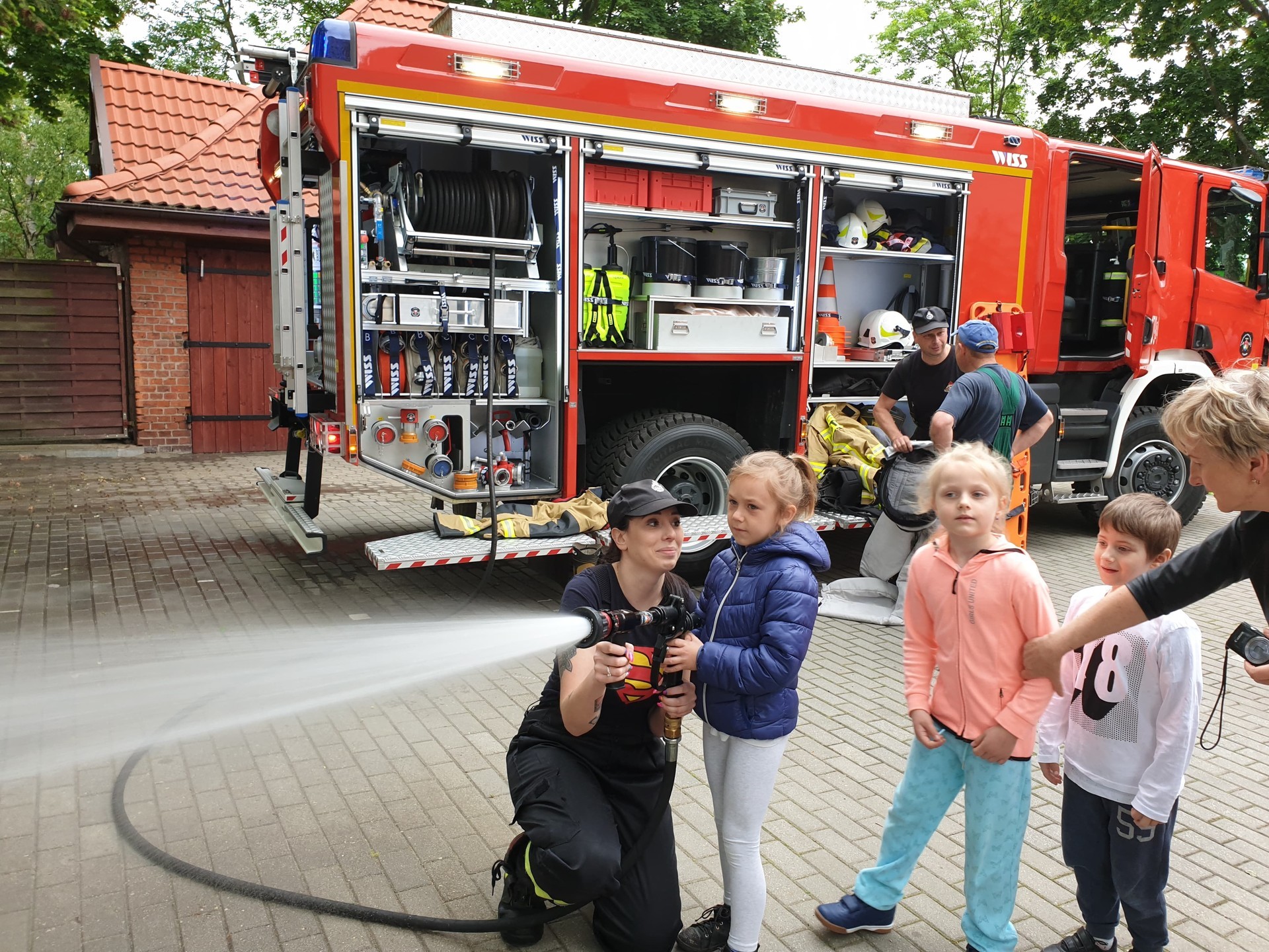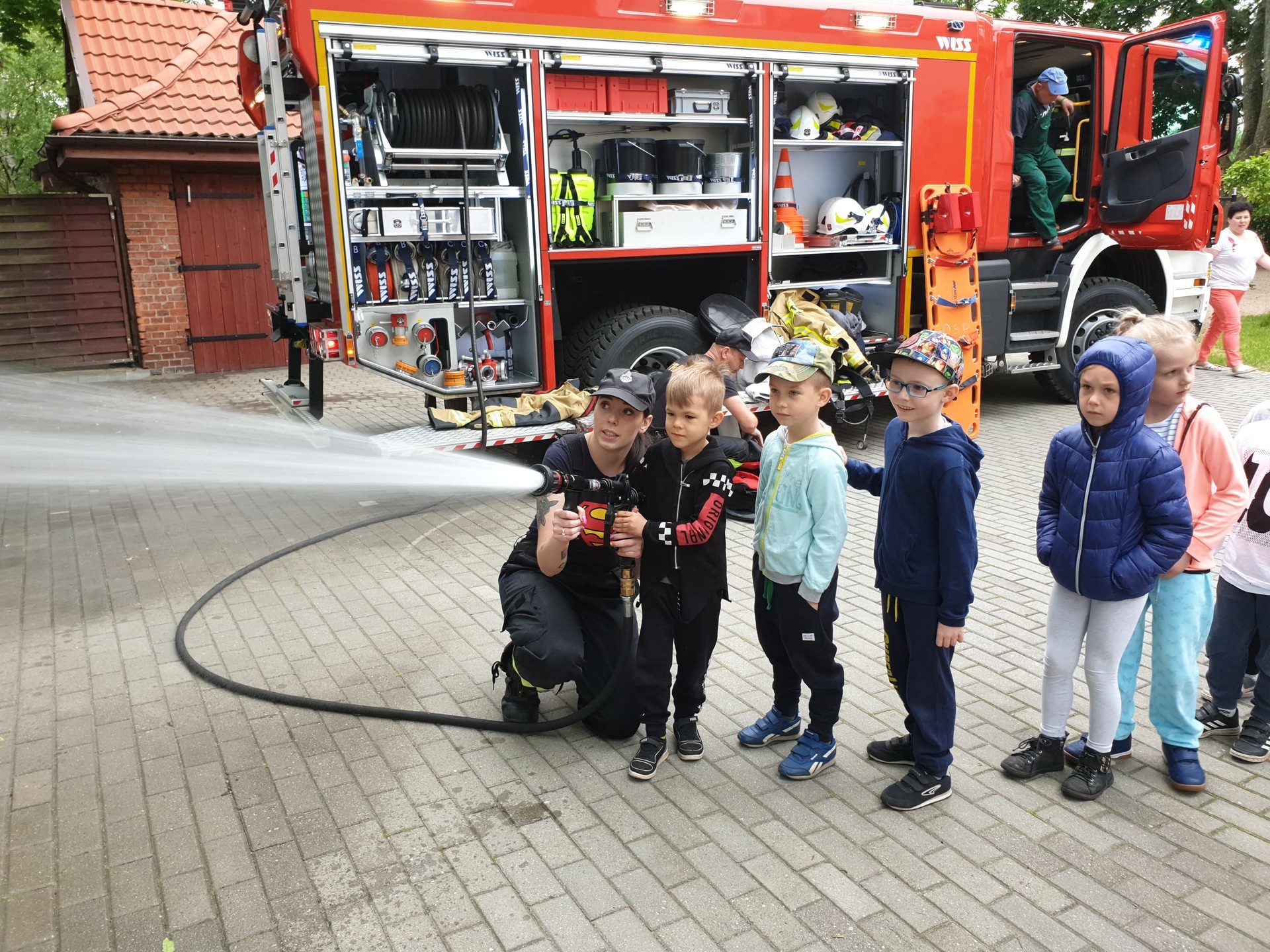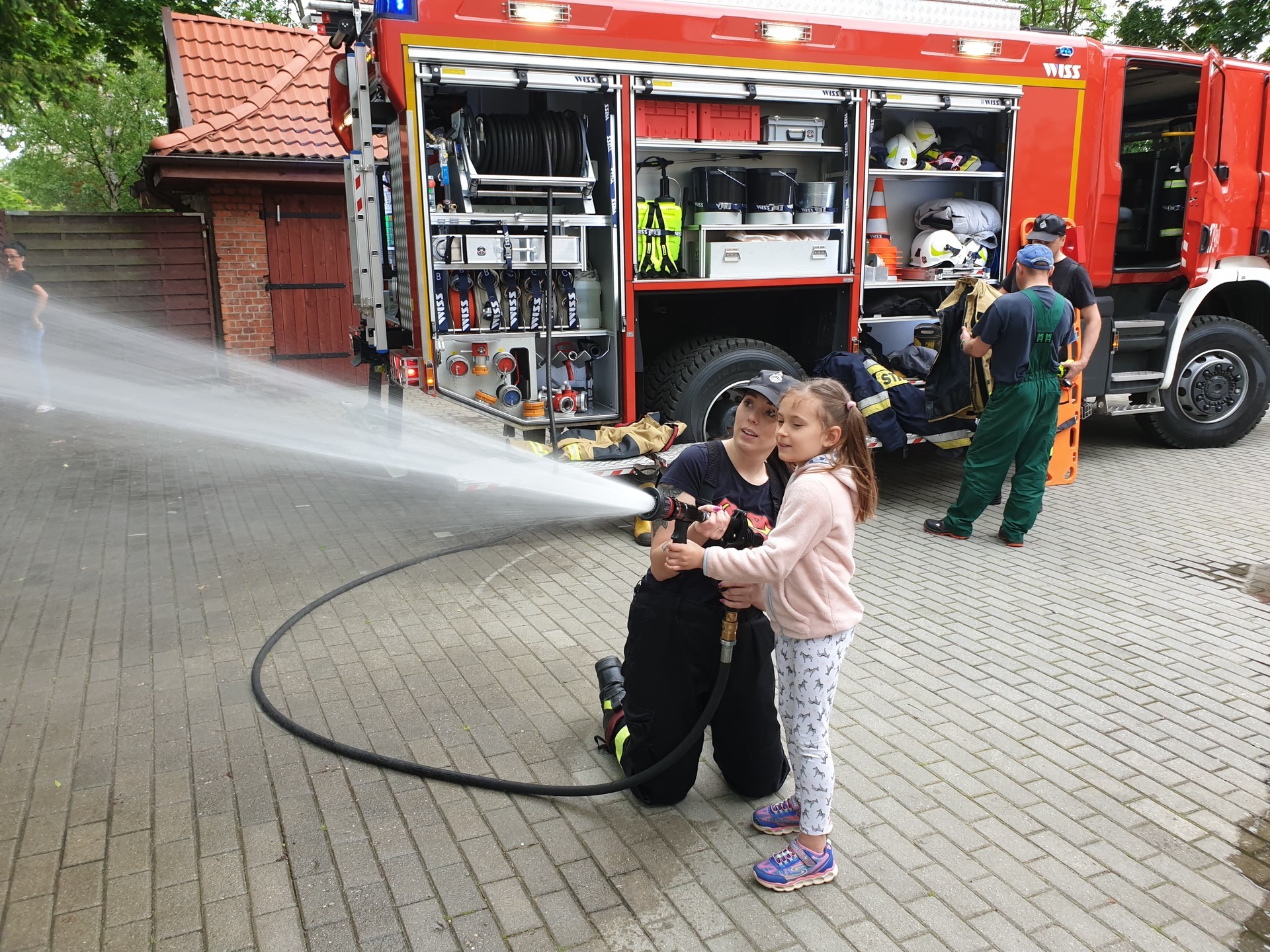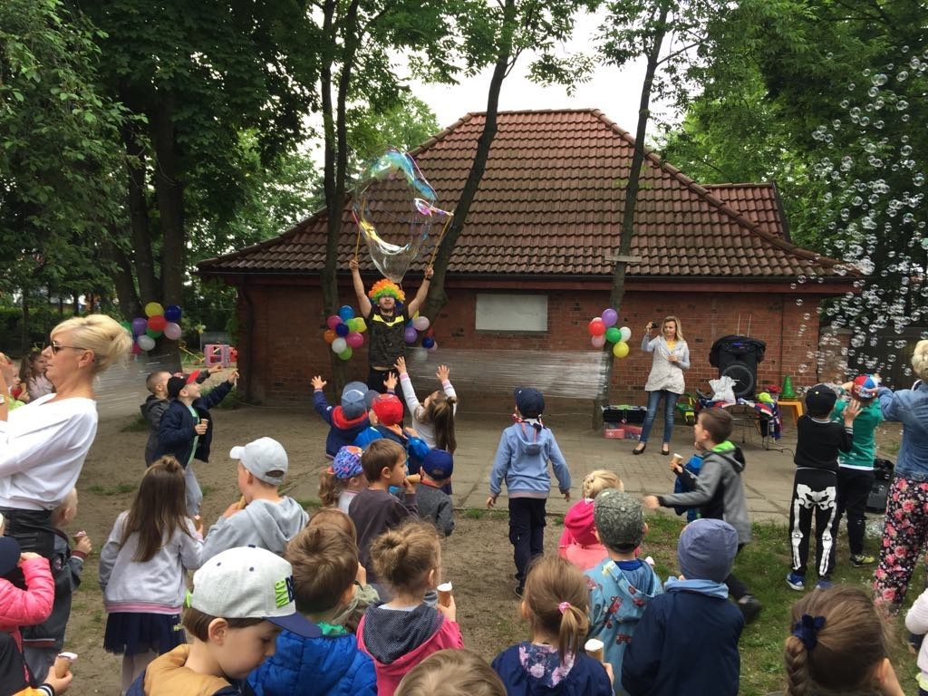 Dzień obfitował w liczne atrakcje. Na początek wóz strażacki , dzieci mogły obejrzeć go od środka a także zobaczyć jak działa wąż strażacki. Nasza Pani Dyrektor zamieniła się na chwilę w strażaka prezentując się w pełnym stroju strażackim. Tego dnia gościliśmy w naszej placówce animatora zabaw, który prowadził z dziećmi zabawy taneczne, tworzył wspaniałe bańki mydlane oraz różności z balonów. Dzieci malowały farbami na strechu oraz brały udział w zawodach sportowych. Nie zabrakło tego dnia słodkości, nasi milusińscy dostali lody oraz mogły częstować się pysznymi ciastami zrobionymi przez rodziców. Nie zabrakło też wesołych zabaw na świeżym powietrzu.