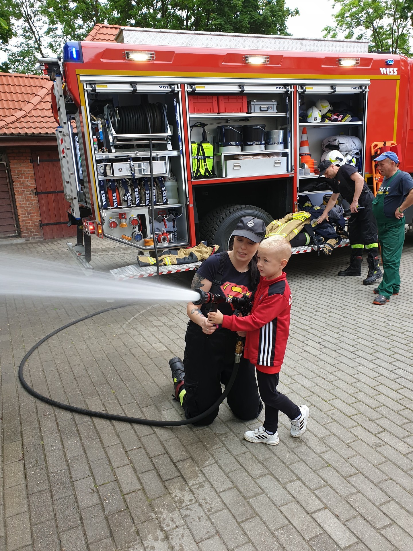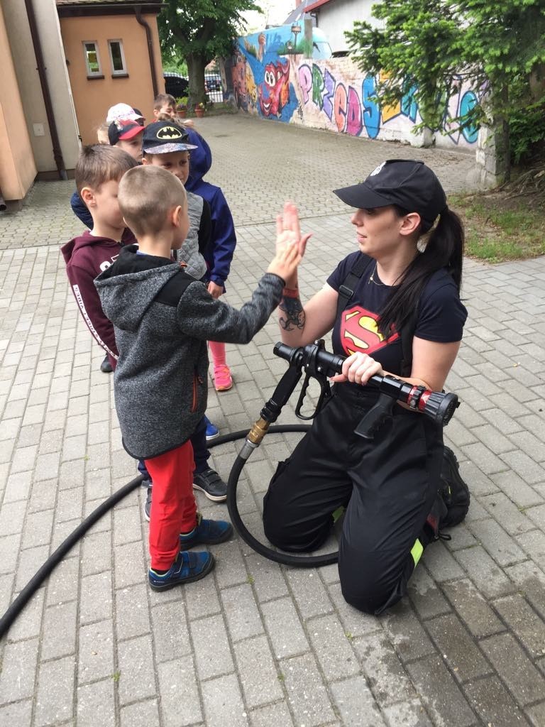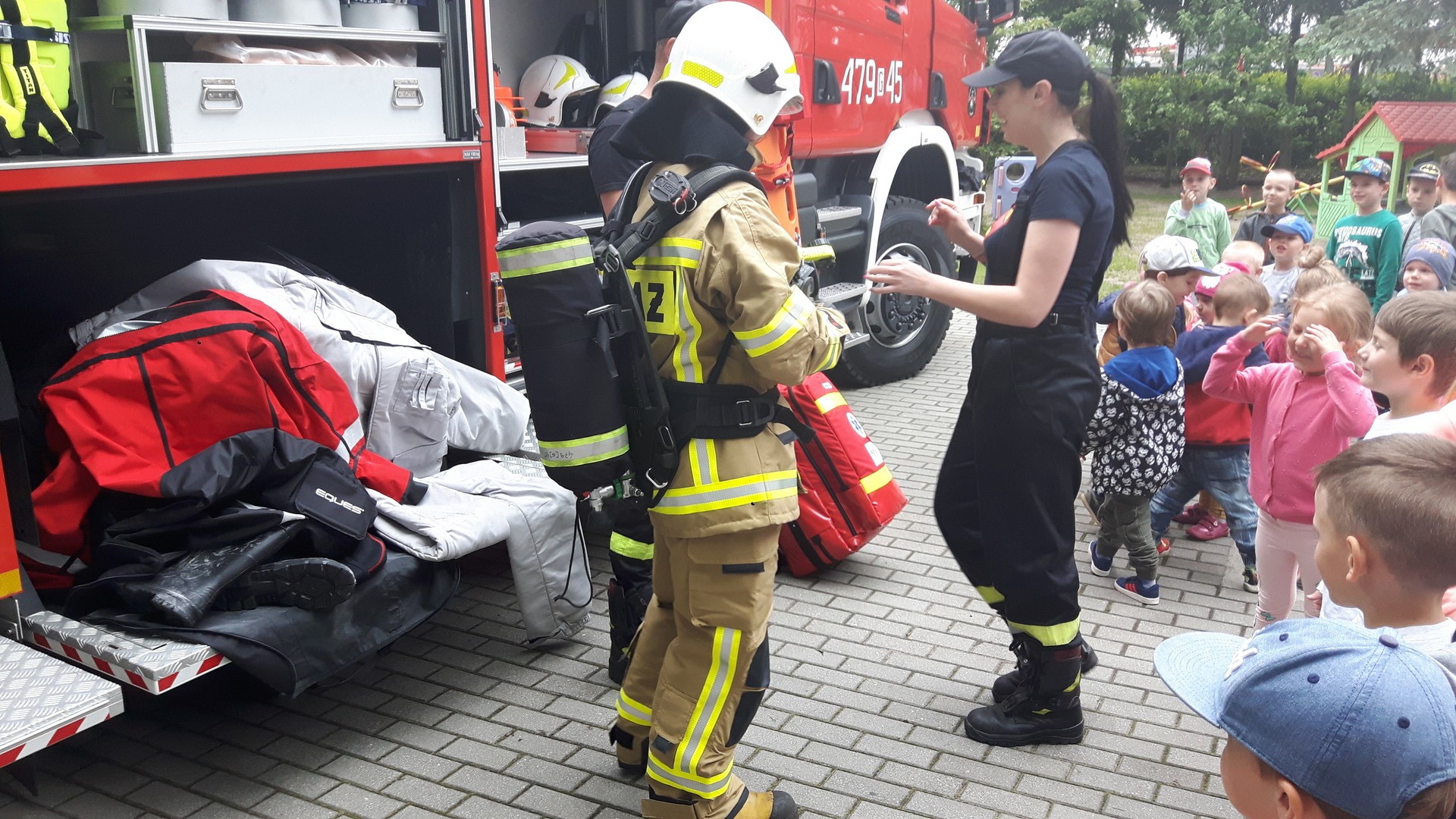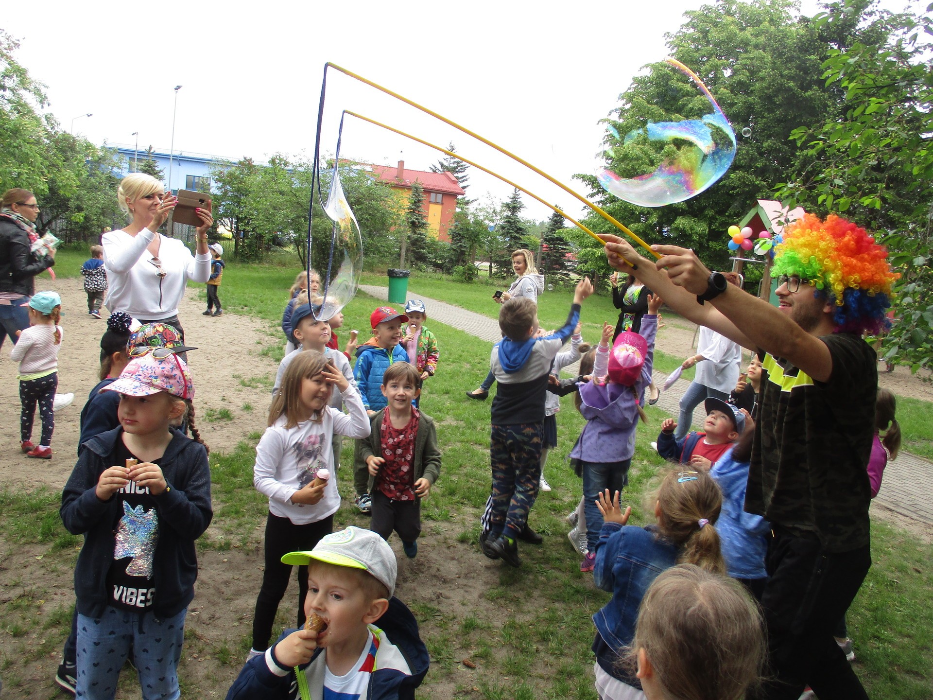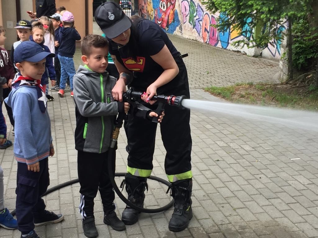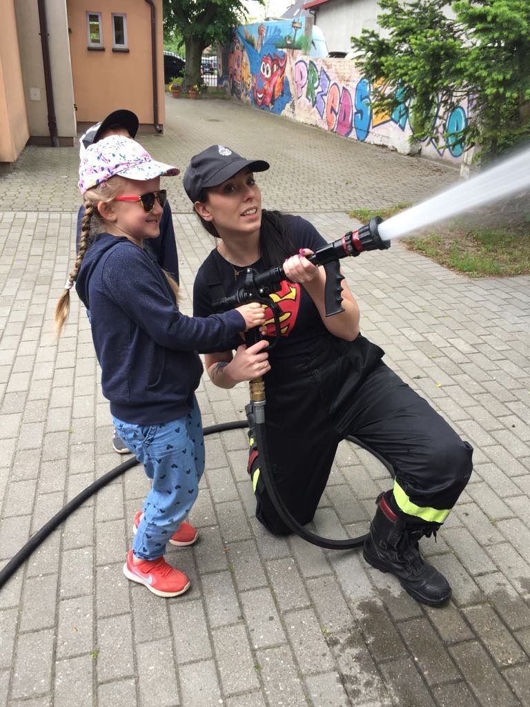 Dzień obfitował w liczne atrakcje. Na początek wóz strażacki , dzieci mogły obejrzeć go od środka a także zobaczyć jak działa wąż strażacki. Nasza Pani Dyrektor zamieniła się na chwilę w strażaka prezentując się w pełnym stroju strażackim. Tego dnia gościliśmy w naszej placówce animatora zabaw, który prowadził z dziećmi zabawy taneczne, tworzył wspaniałe bańki mydlane oraz różności z balonów. Dzieci malowały farbami na strechu oraz brały udział w zawodach sportowych. Nie zabrakło tego dnia słodkości, nasi milusińscy dostali lody oraz mogły częstować się pysznymi ciastami zrobionymi przez rodziców. Nie zabrakło też wesołych zabaw na świeżym powietrzu.
