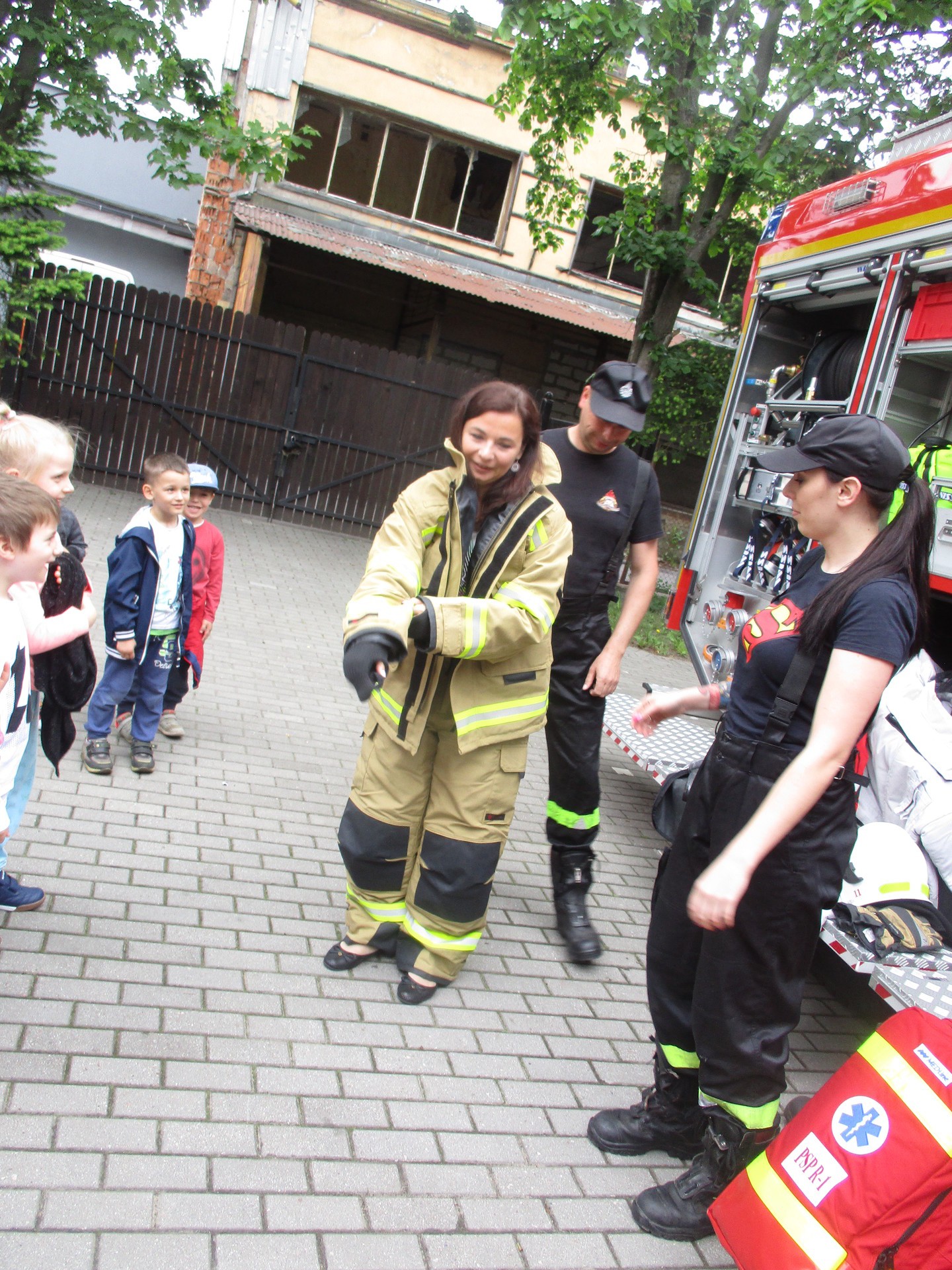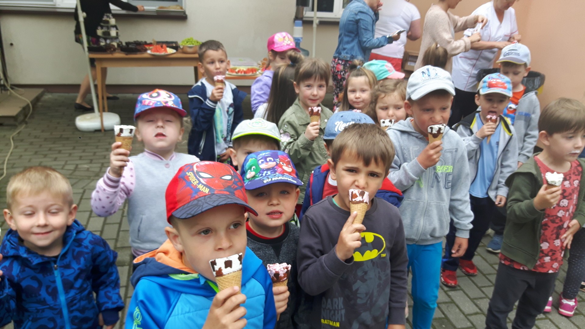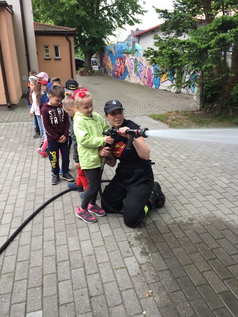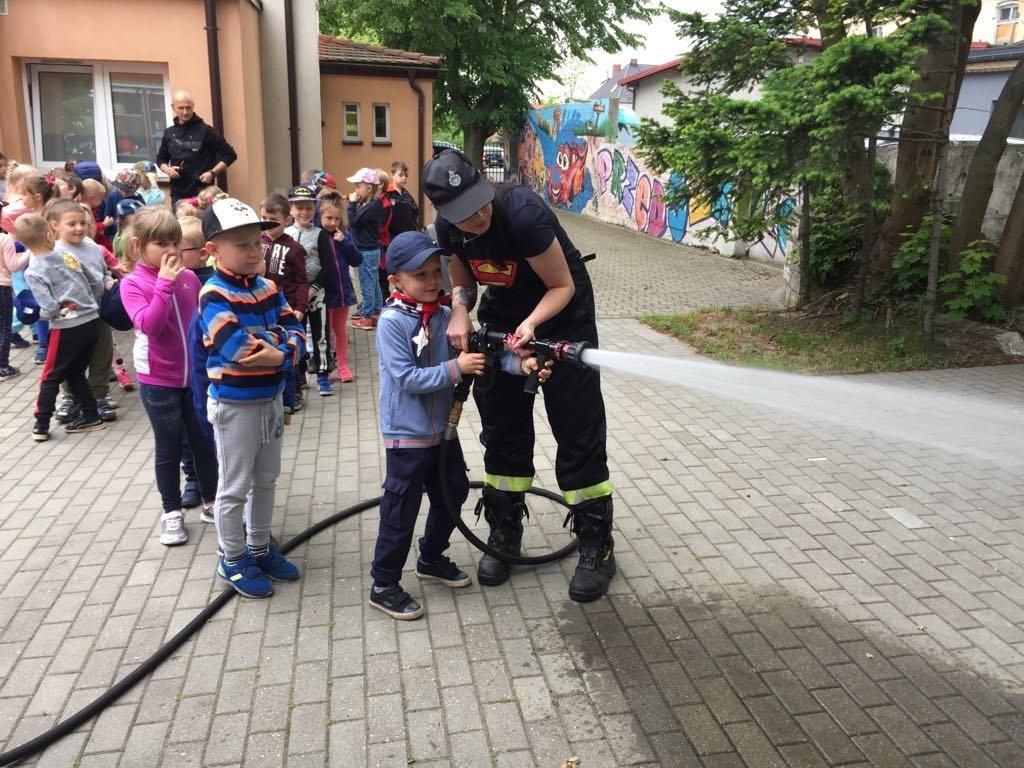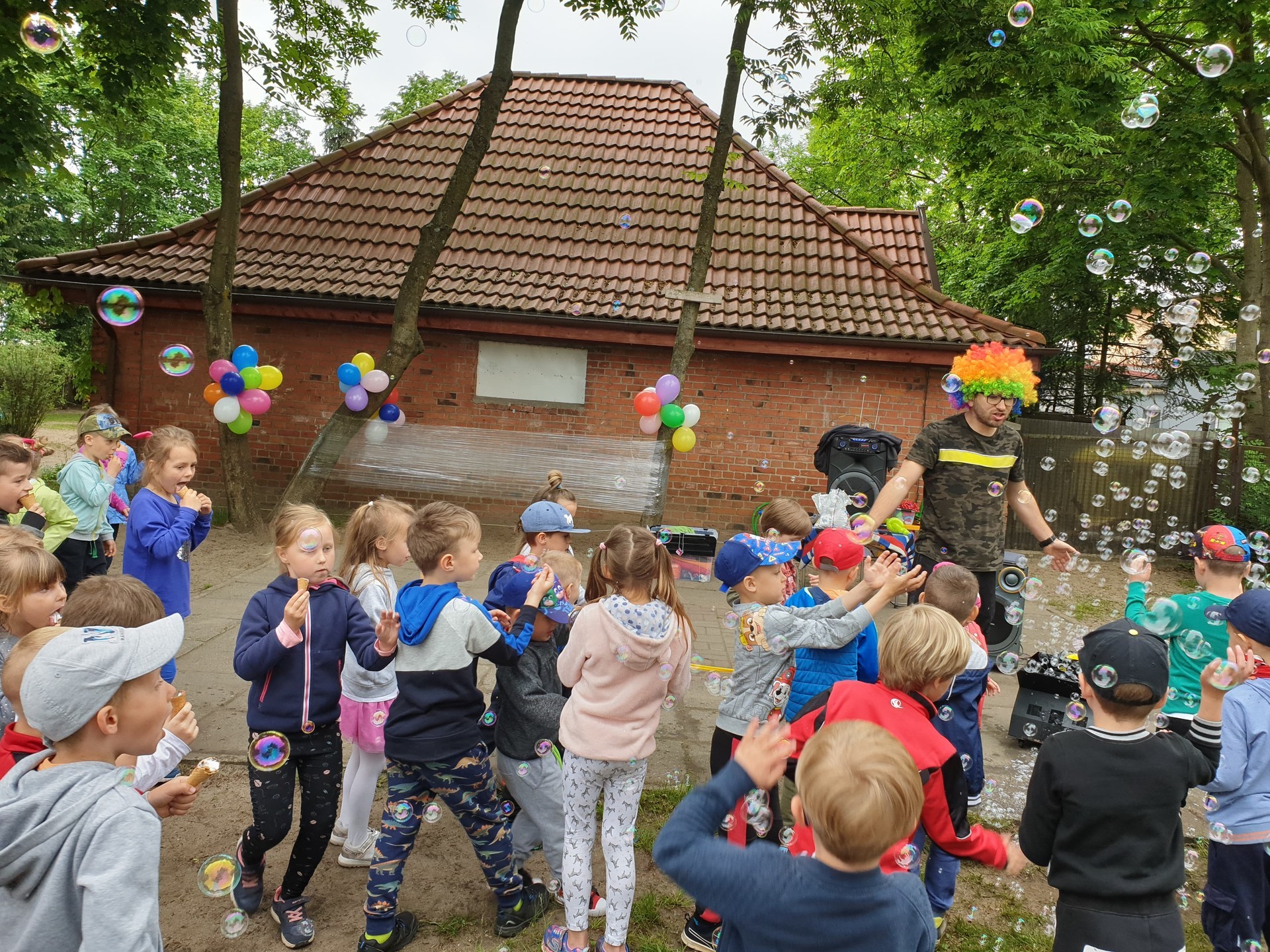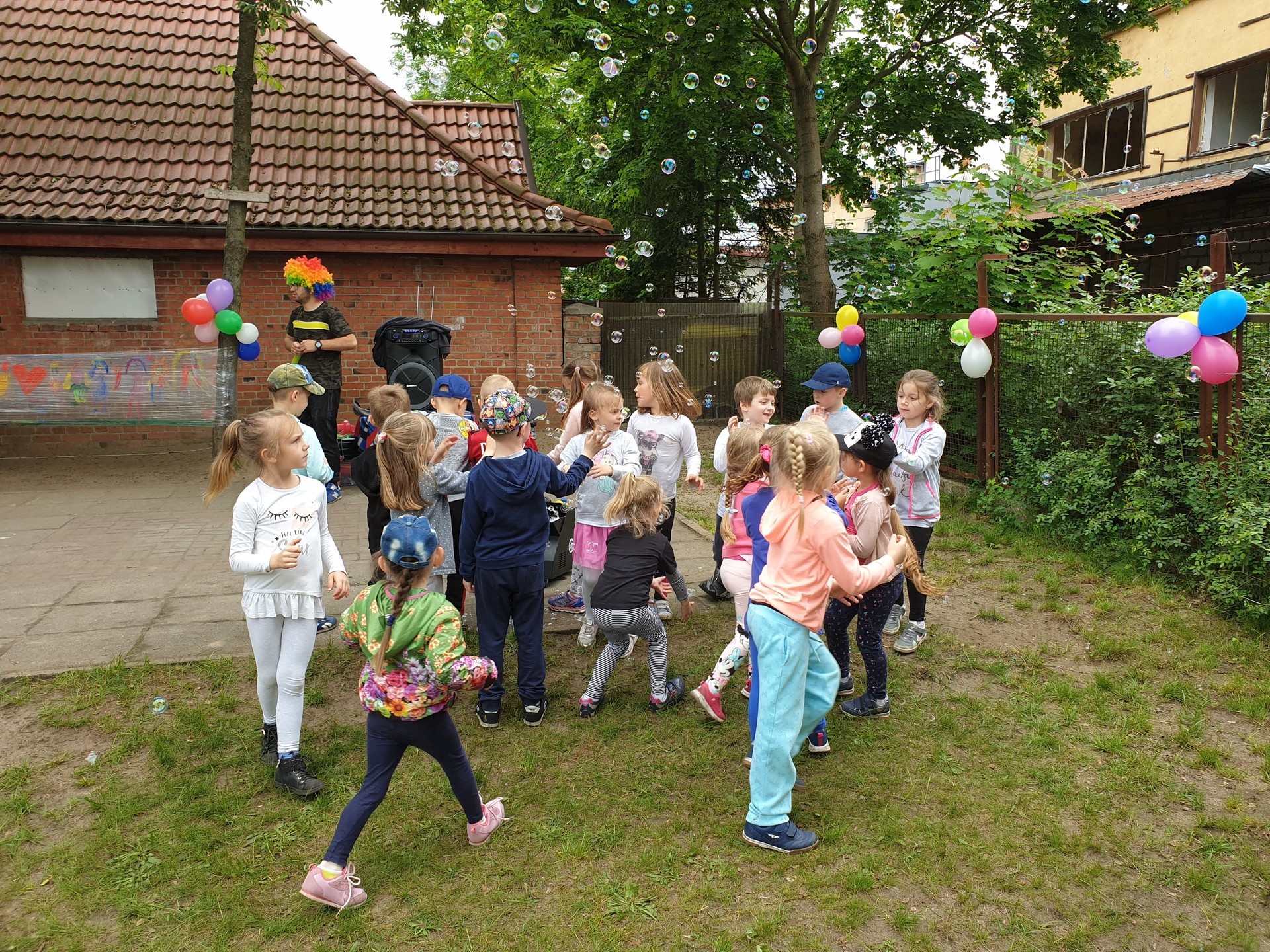 Dzień obfitował w liczne atrakcje. Na początek wóz strażacki , dzieci mogły obejrzeć go od środka a także zobaczyć jak działa wąż strażacki. Nasza Pani Dyrektor zamieniła się na chwilę w strażaka prezentując się w pełnym stroju strażackim. Tego dnia gościliśmy w naszej placówce animatora zabaw, który prowadził z dziećmi zabawy taneczne, tworzył wspaniałe bańki mydlane oraz różności z balonów. Dzieci malowały farbami na strechu oraz brały udział w zawodach sportowych. Nie zabrakło tego dnia słodkości, nasi milusińscy dostali lody oraz mogły częstować się pysznymi ciastami zrobionymi przez rodziców. Nie zabrakło też wesołych zabaw na świeżym powietrzu.