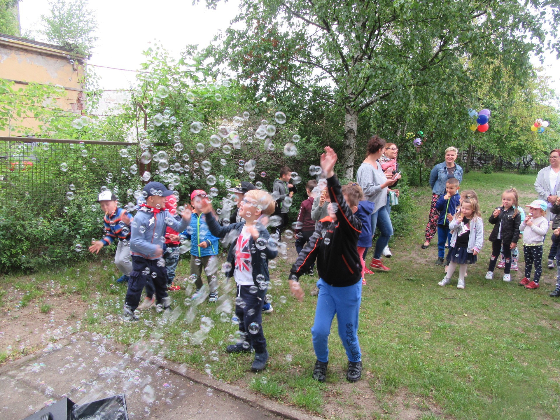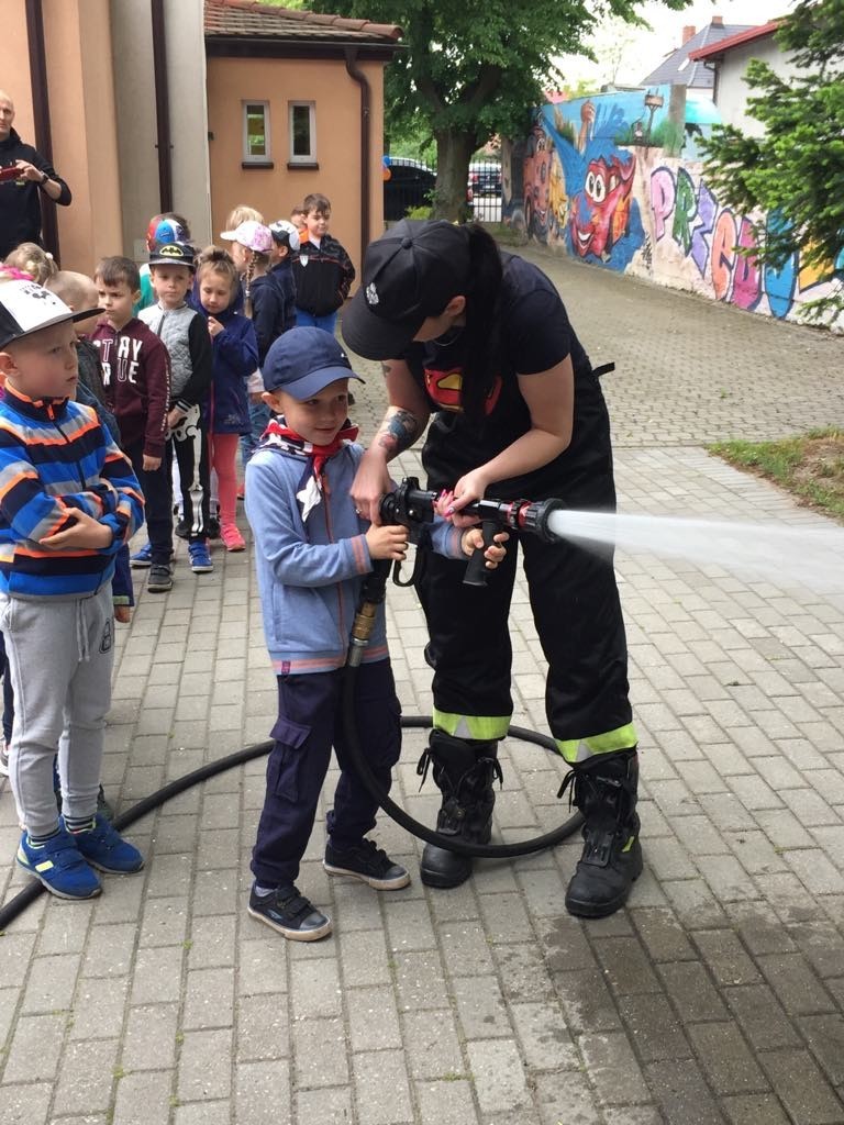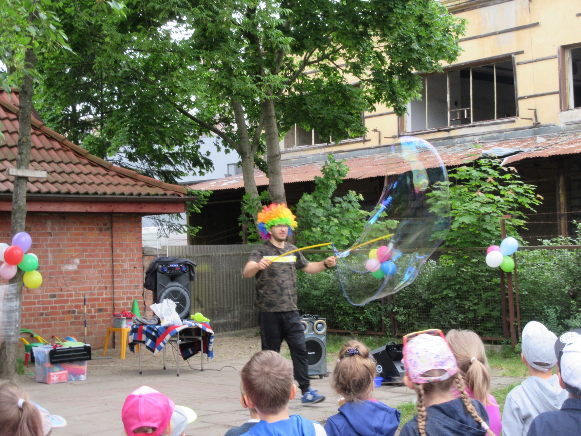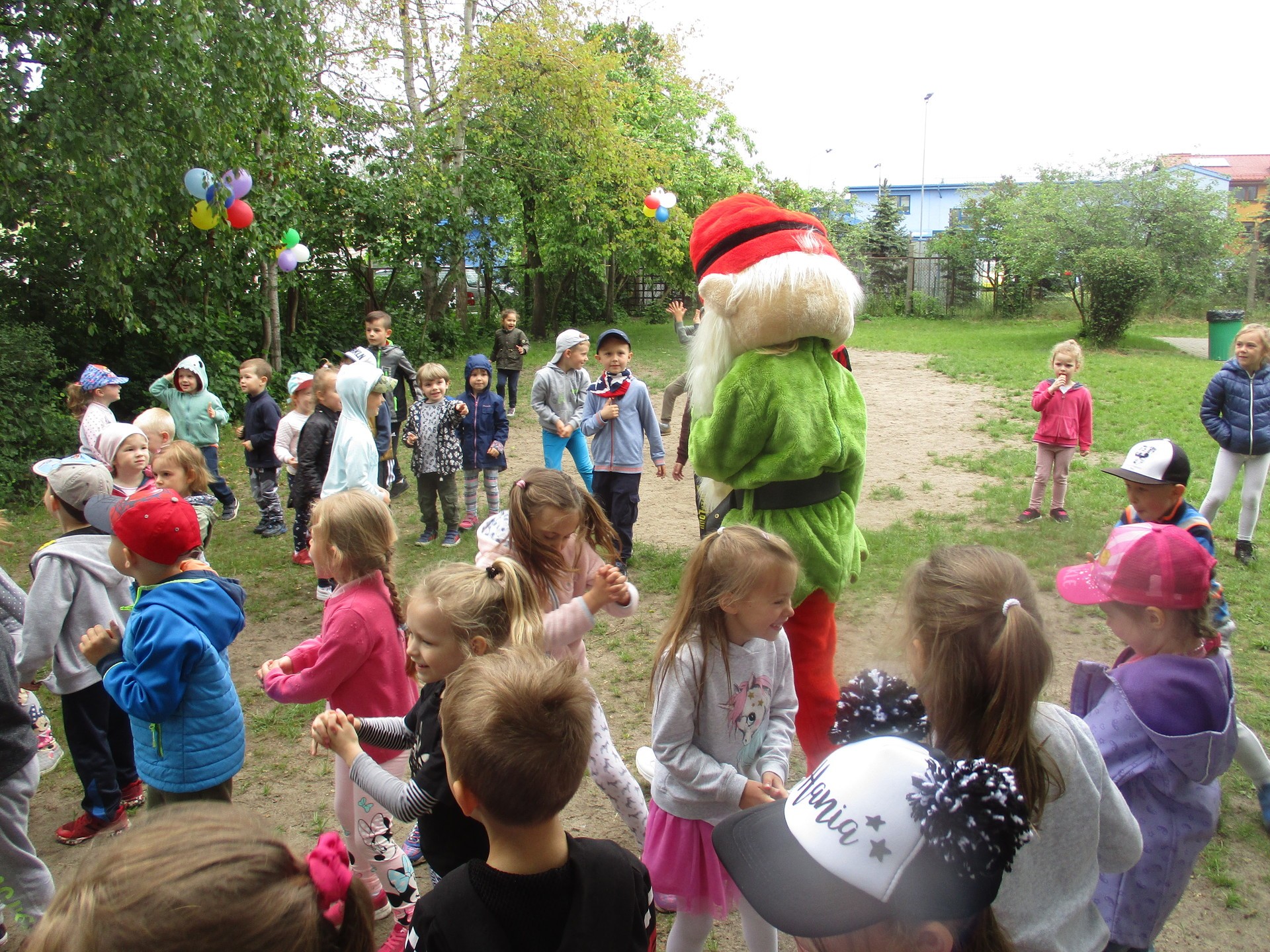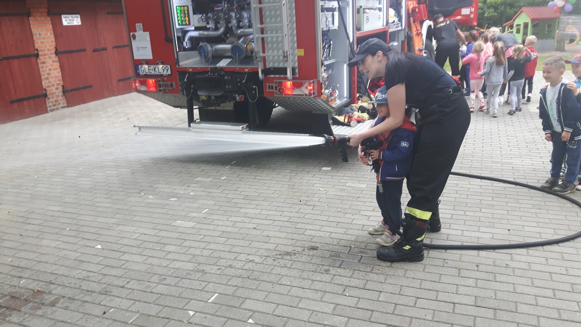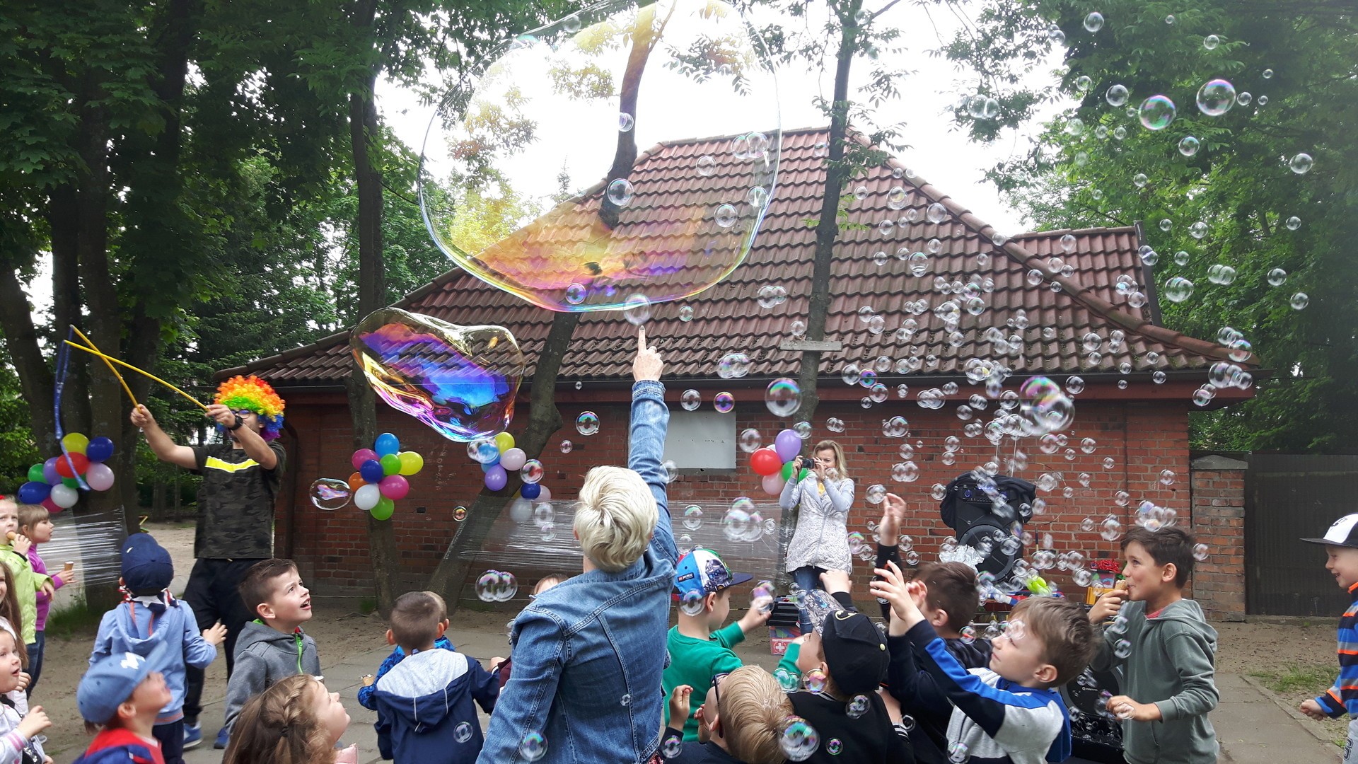 Dzień obfitował w liczne atrakcje. Na początek wóz strażacki , dzieci mogły obejrzeć go od środka a także zobaczyć jak działa wąż strażacki. Nasza Pani Dyrektor zamieniła się na chwilę w strażaka prezentując się w pełnym stroju strażackim. Tego dnia gościliśmy w naszej placówce animatora zabaw, który prowadził z dziećmi zabawy taneczne, tworzył wspaniałe bańki mydlane oraz różności z balonów. Dzieci malowały farbami na strechu oraz brały udział w zawodach sportowych. Nie zabrakło tego dnia słodkości, nasi milusińscy dostali lody oraz mogły częstować się pysznymi ciastami zrobionymi przez rodziców. Nie zabrakło też wesołych zabaw na świeżym powietrzu.
