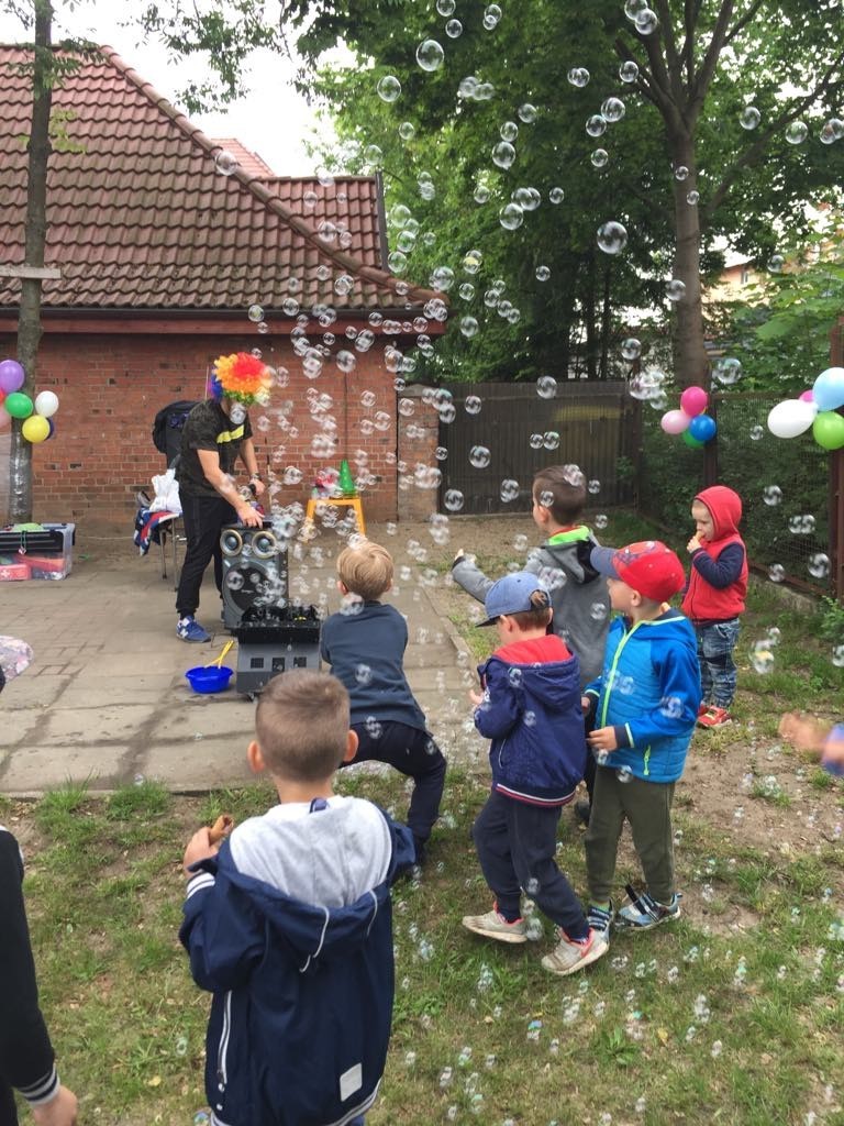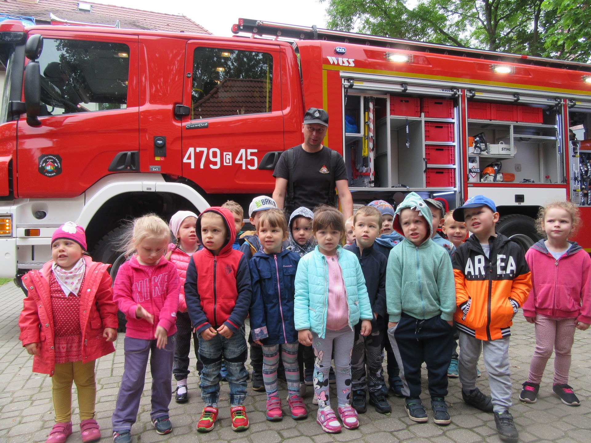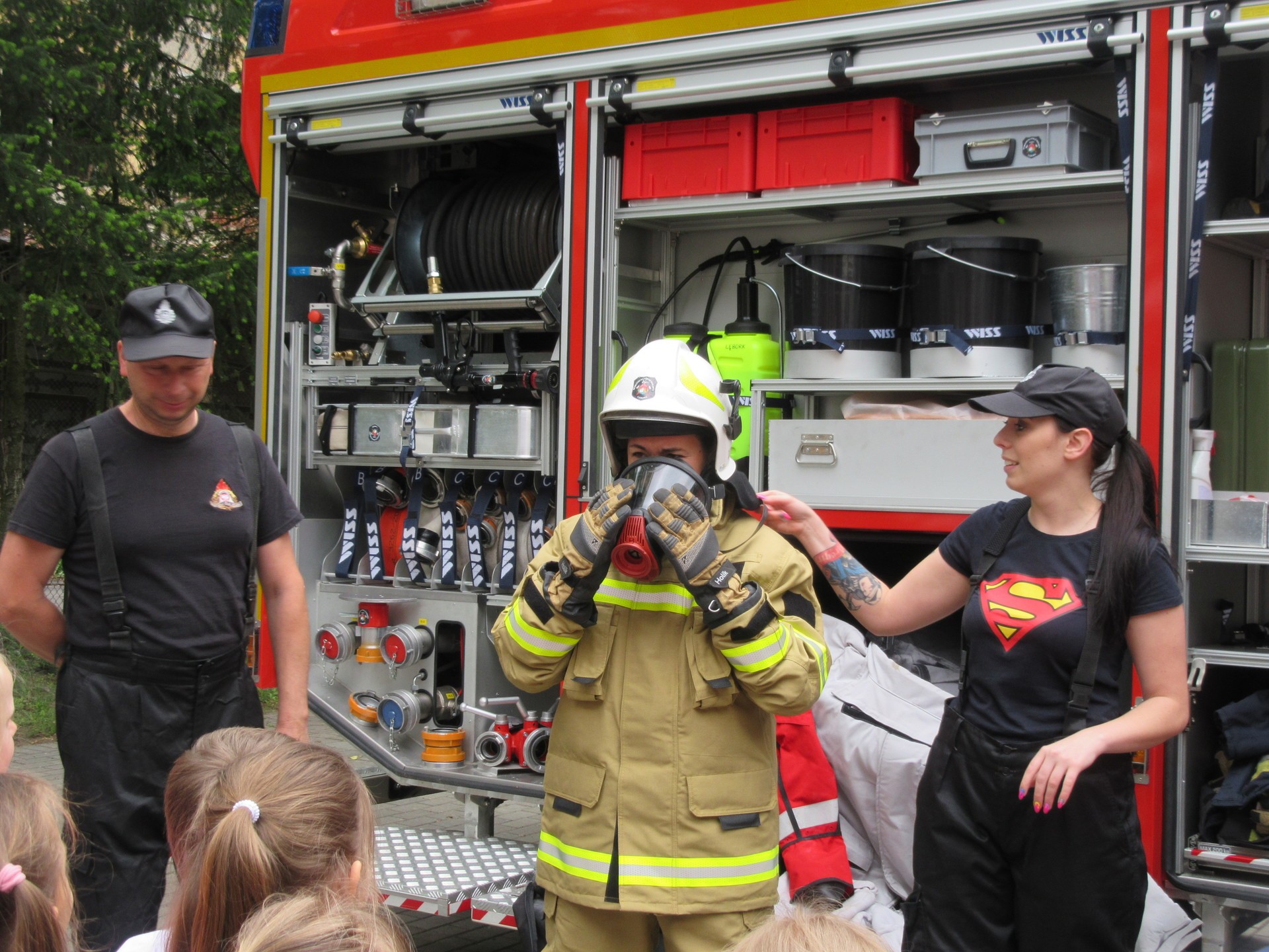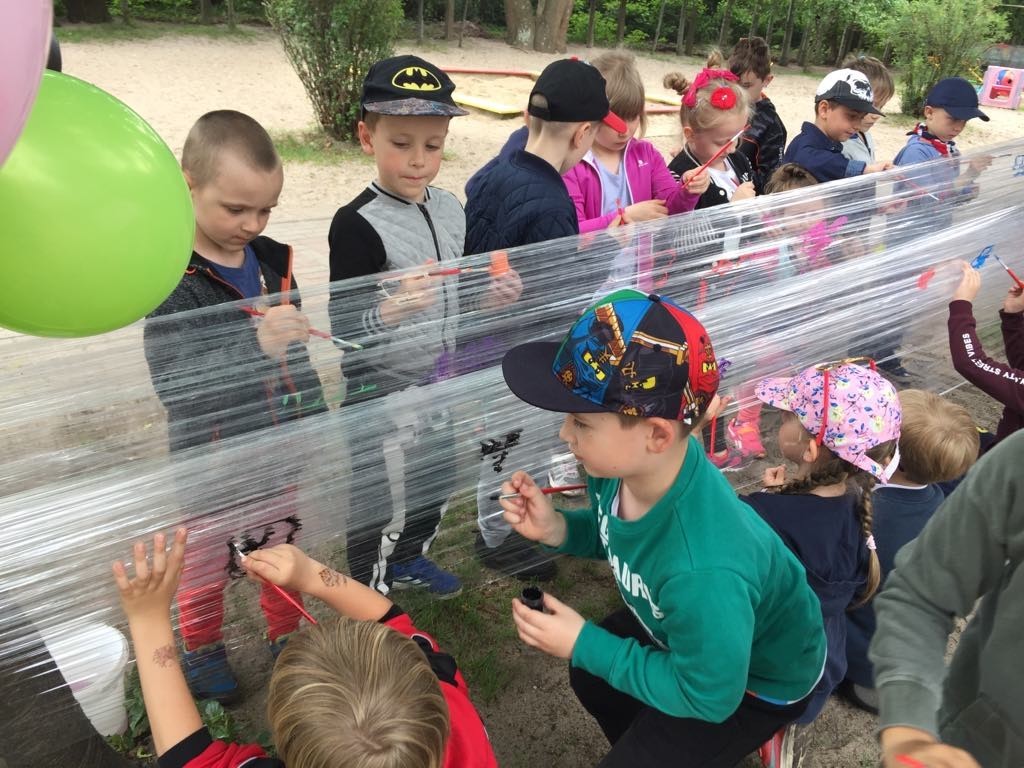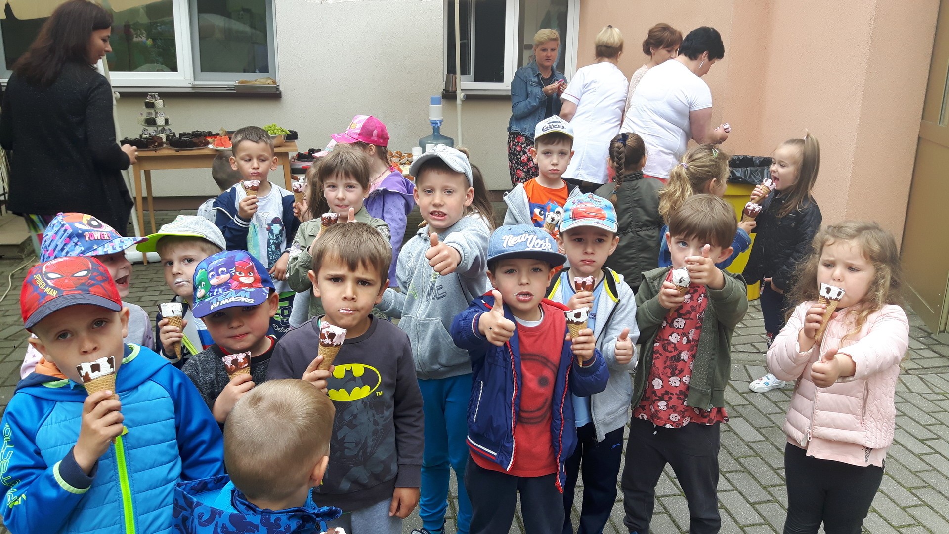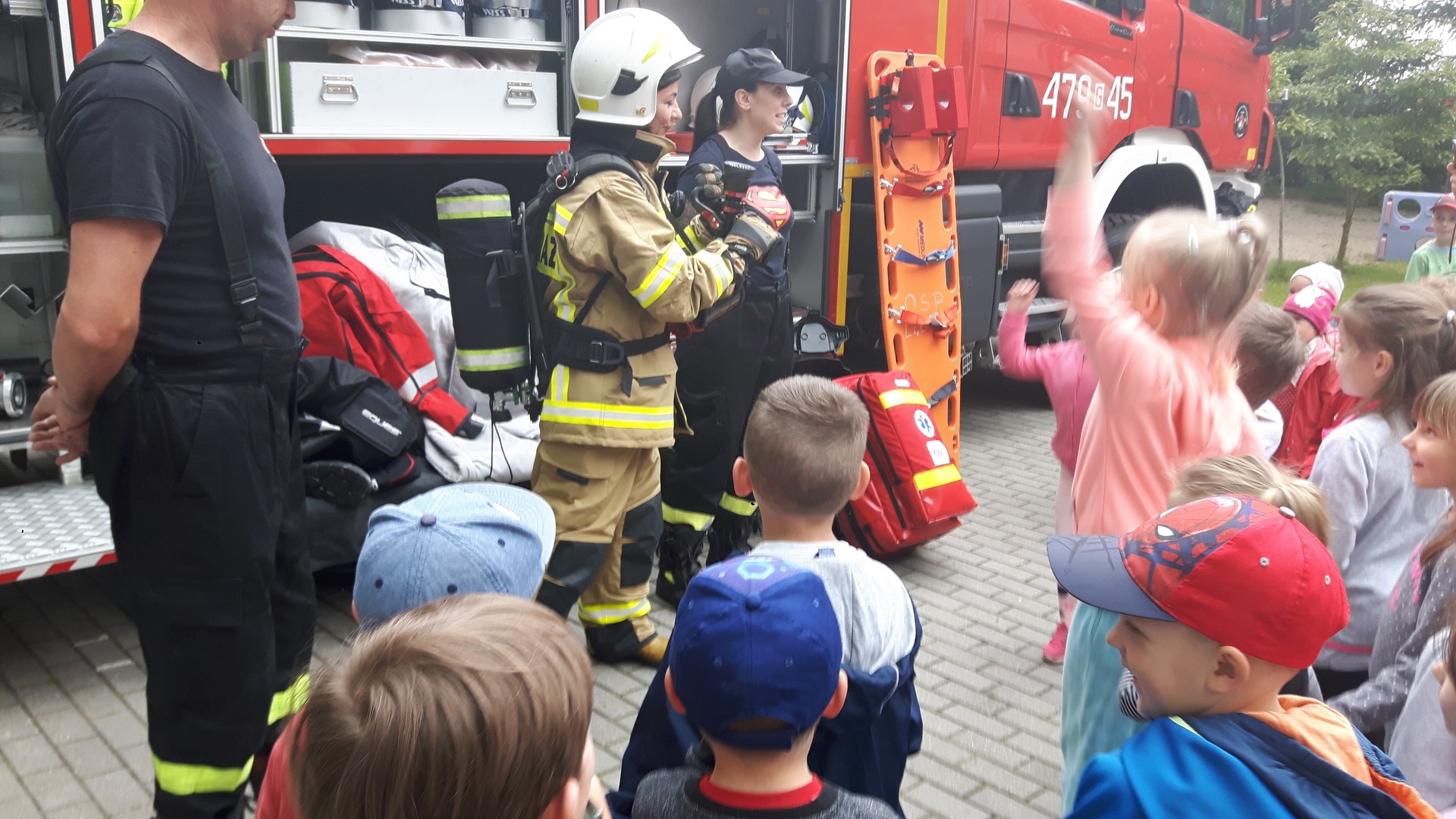 Dzień obfitował w liczne atrakcje. Na początek wóz strażacki , dzieci mogły obejrzeć go od środka a także zobaczyć jak działa wąż strażacki. Nasza Pani Dyrektor zamieniła się na chwilę w strażaka prezentując się w pełnym stroju strażackim. Tego dnia gościliśmy w naszej placówce animatora zabaw, który prowadził z dziećmi zabawy taneczne, tworzył wspaniałe bańki mydlane oraz różności z balonów. Dzieci malowały farbami na strechu oraz brały udział w zawodach sportowych. Nie zabrakło tego dnia słodkości, nasi milusińscy dostali lody oraz mogły częstować się pysznymi ciastami zrobionymi przez rodziców. Nie zabrakło też wesołych zabaw na świeżym powietrzu.