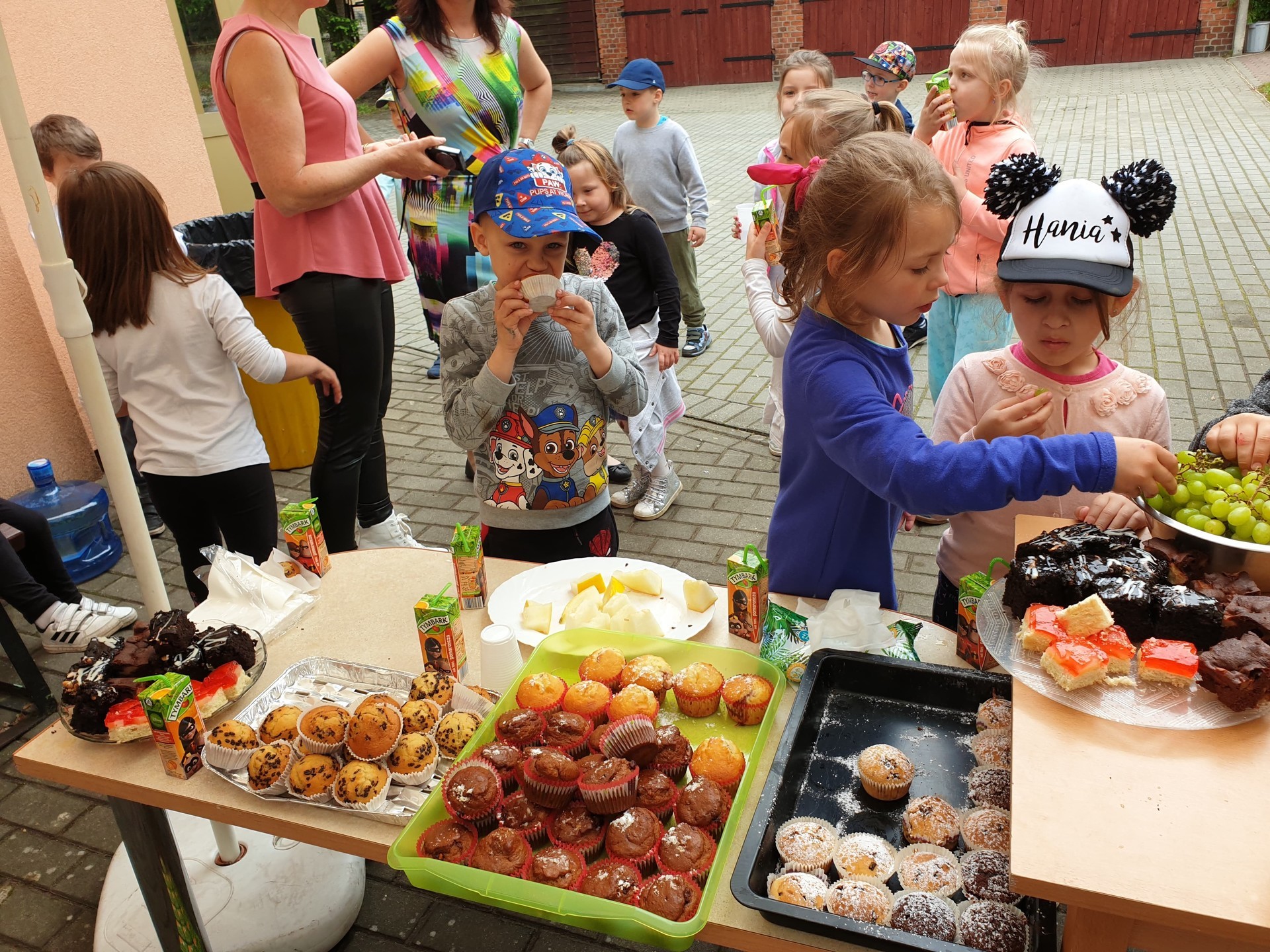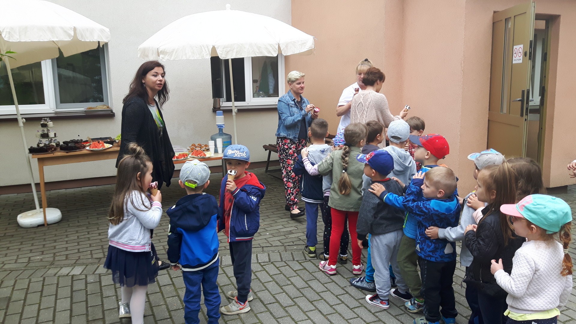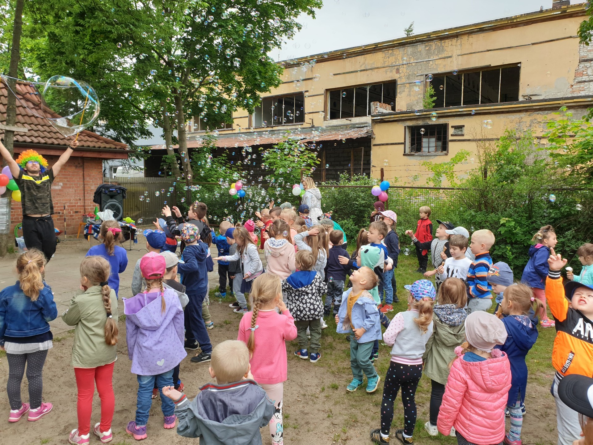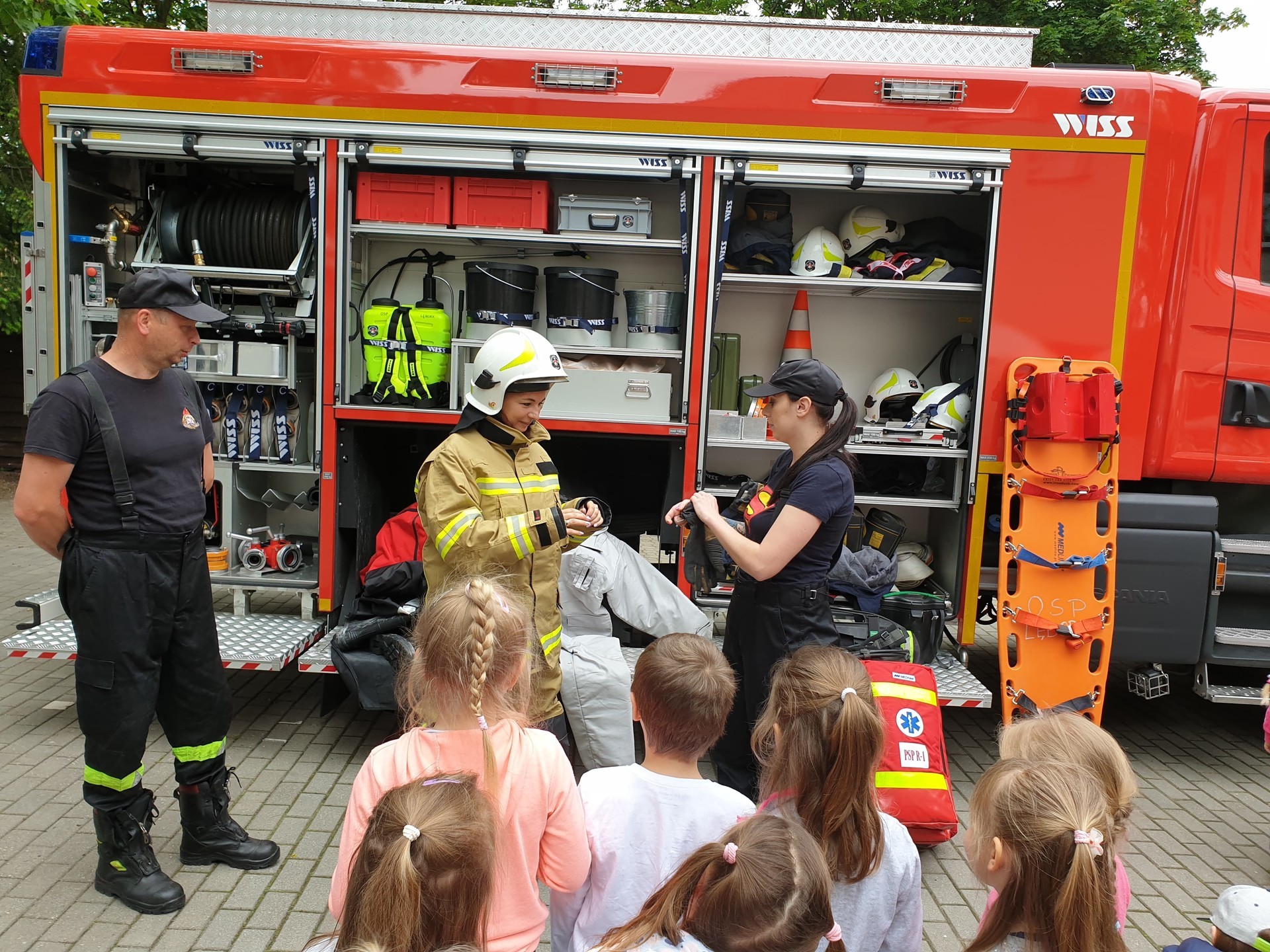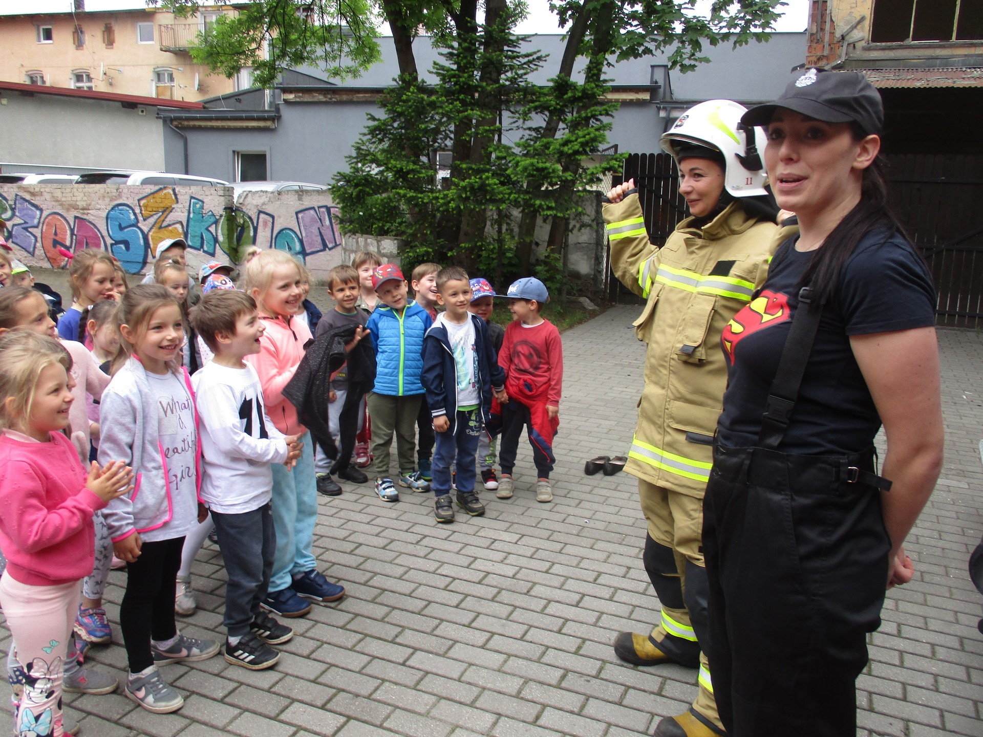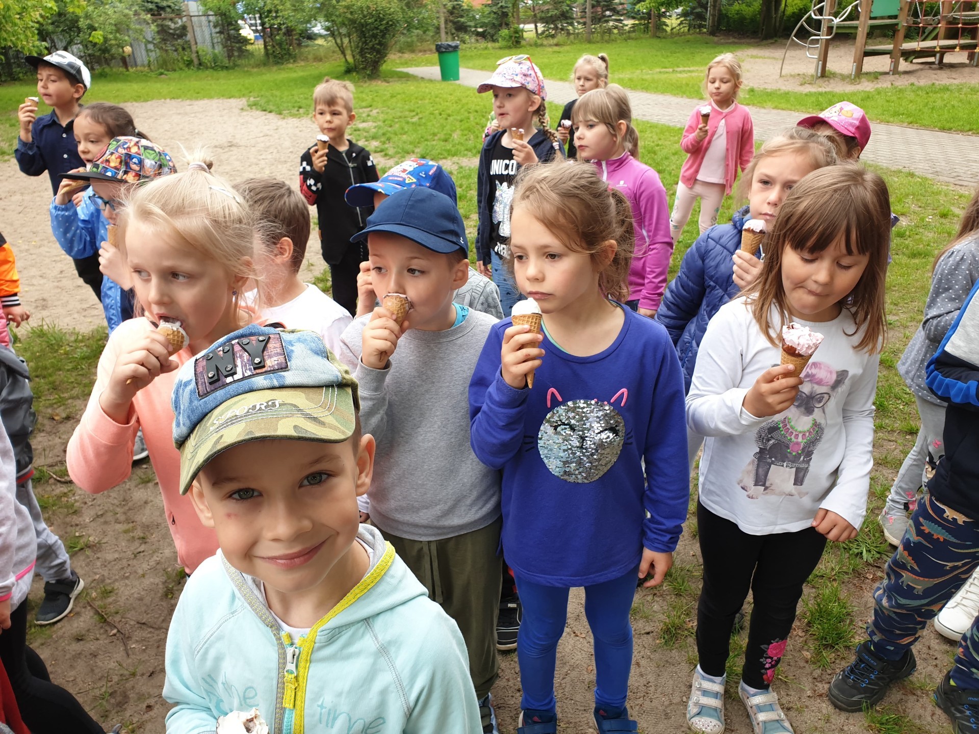 Dzień obfitował w liczne atrakcje. Na początek wóz strażacki , dzieci mogły obejrzeć go od środka a także zobaczyć jak działa wąż strażacki. Nasza Pani Dyrektor zamieniła się na chwilę w strażaka prezentując się w pełnym stroju strażackim. Tego dnia gościliśmy w naszej placówce animatora zabaw, który prowadził z dziećmi zabawy taneczne, tworzył wspaniałe bańki mydlane oraz różności z balonów. Dzieci malowały farbami na strechu oraz brały udział w zawodach sportowych. Nie zabrakło tego dnia słodkości, nasi milusińscy dostali lody oraz mogły częstować się pysznymi ciastami zrobionymi przez rodziców. Nie zabrakło też wesołych zabaw na świeżym powietrzu.