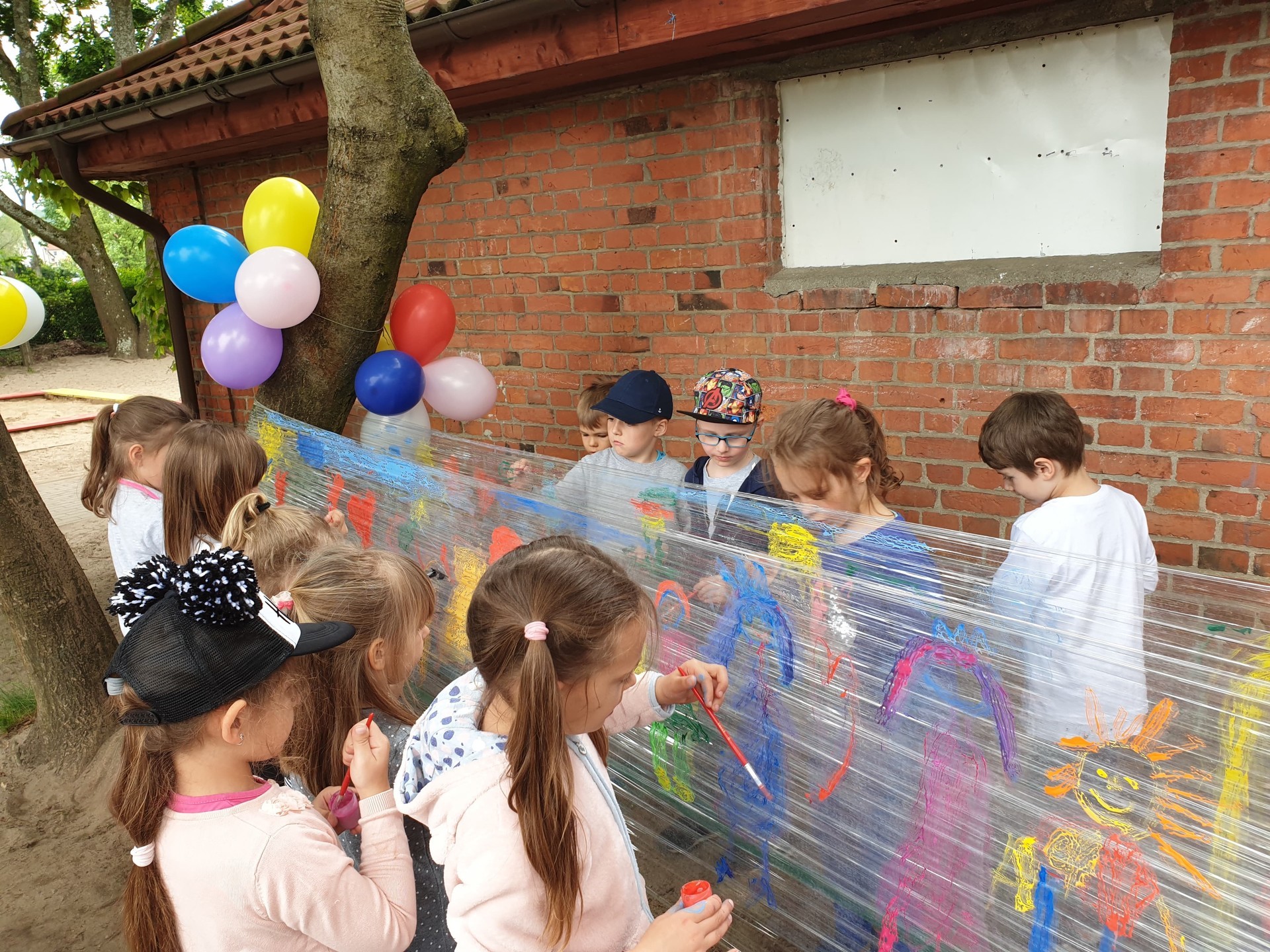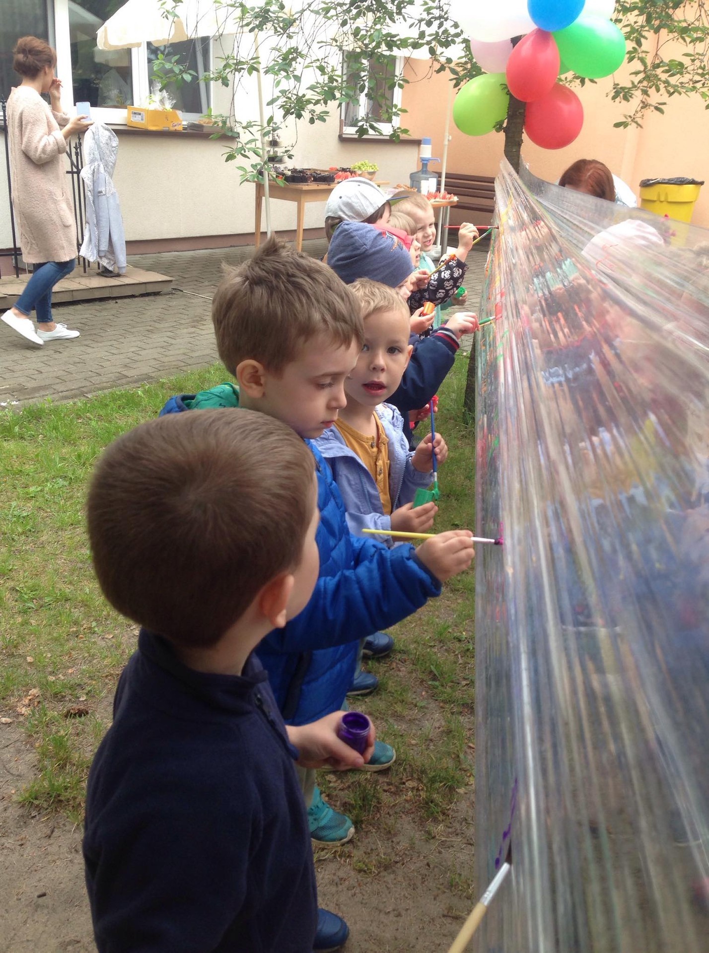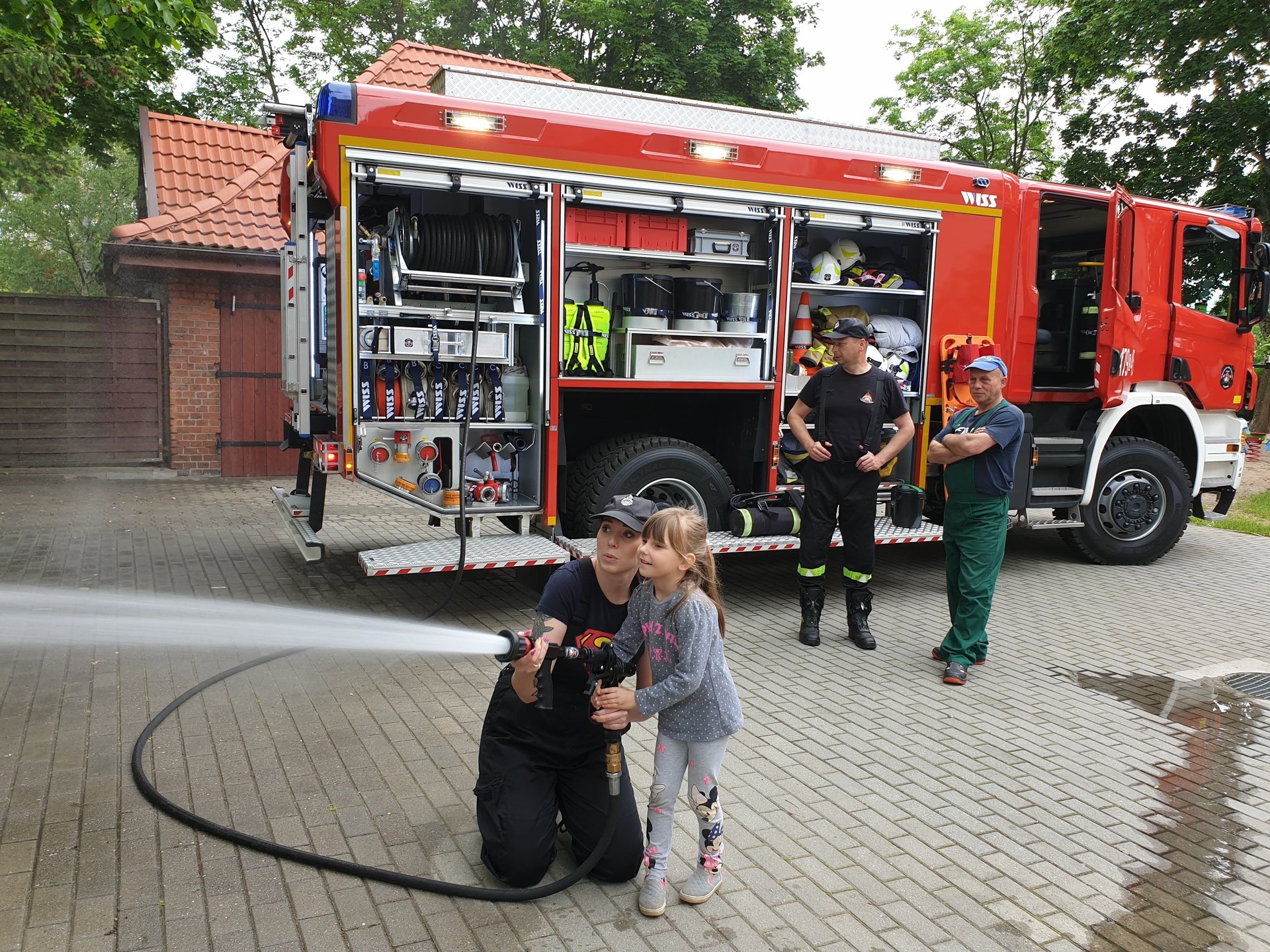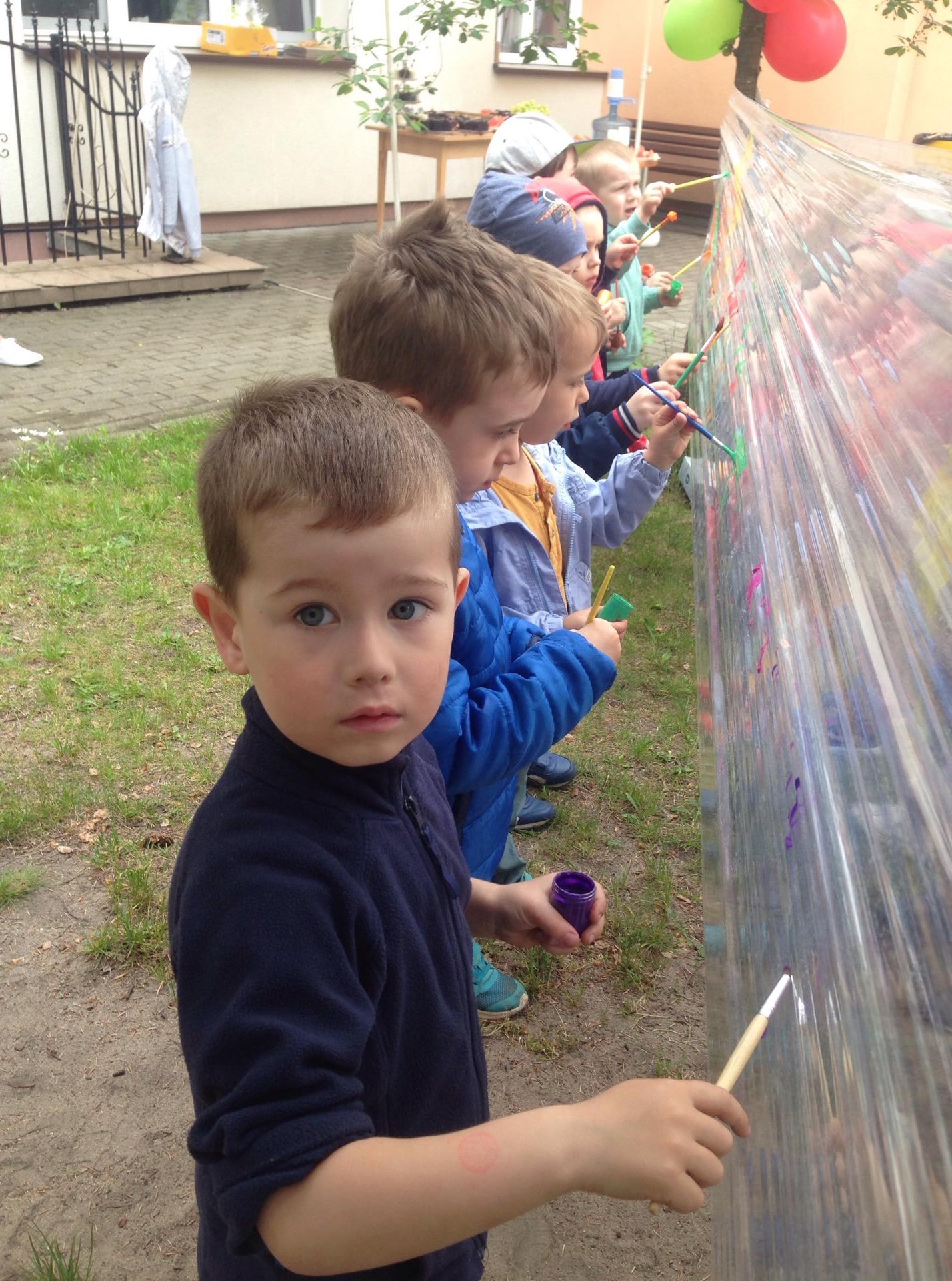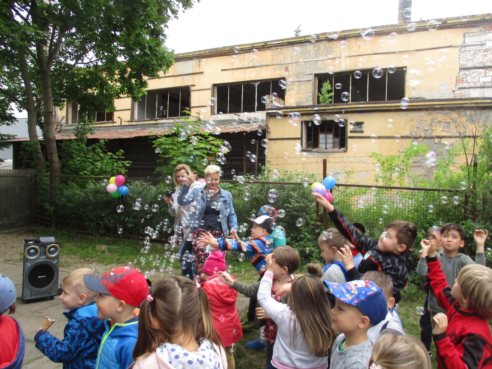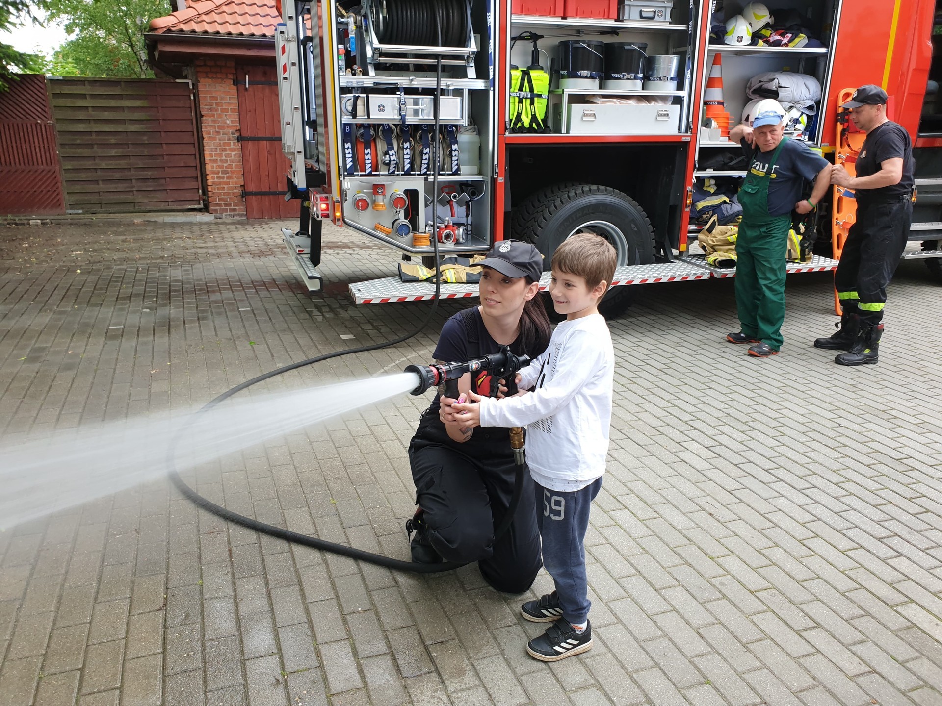 Dzień obfitował w liczne atrakcje. Na początek wóz strażacki , dzieci mogły obejrzeć go od środka a także zobaczyć jak działa wąż strażacki. Nasza Pani Dyrektor zamieniła się na chwilę w strażaka prezentując się w pełnym stroju strażackim. Tego dnia gościliśmy w naszej placówce animatora zabaw, który prowadził z dziećmi zabawy taneczne, tworzył wspaniałe bańki mydlane oraz różności z balonów. Dzieci malowały farbami na strechu oraz brały udział w zawodach sportowych. Nie zabrakło tego dnia słodkości, nasi milusińscy dostali lody oraz mogły częstować się pysznymi ciastami zrobionymi przez rodziców. Nie zabrakło też wesołych zabaw na świeżym powietrzu.