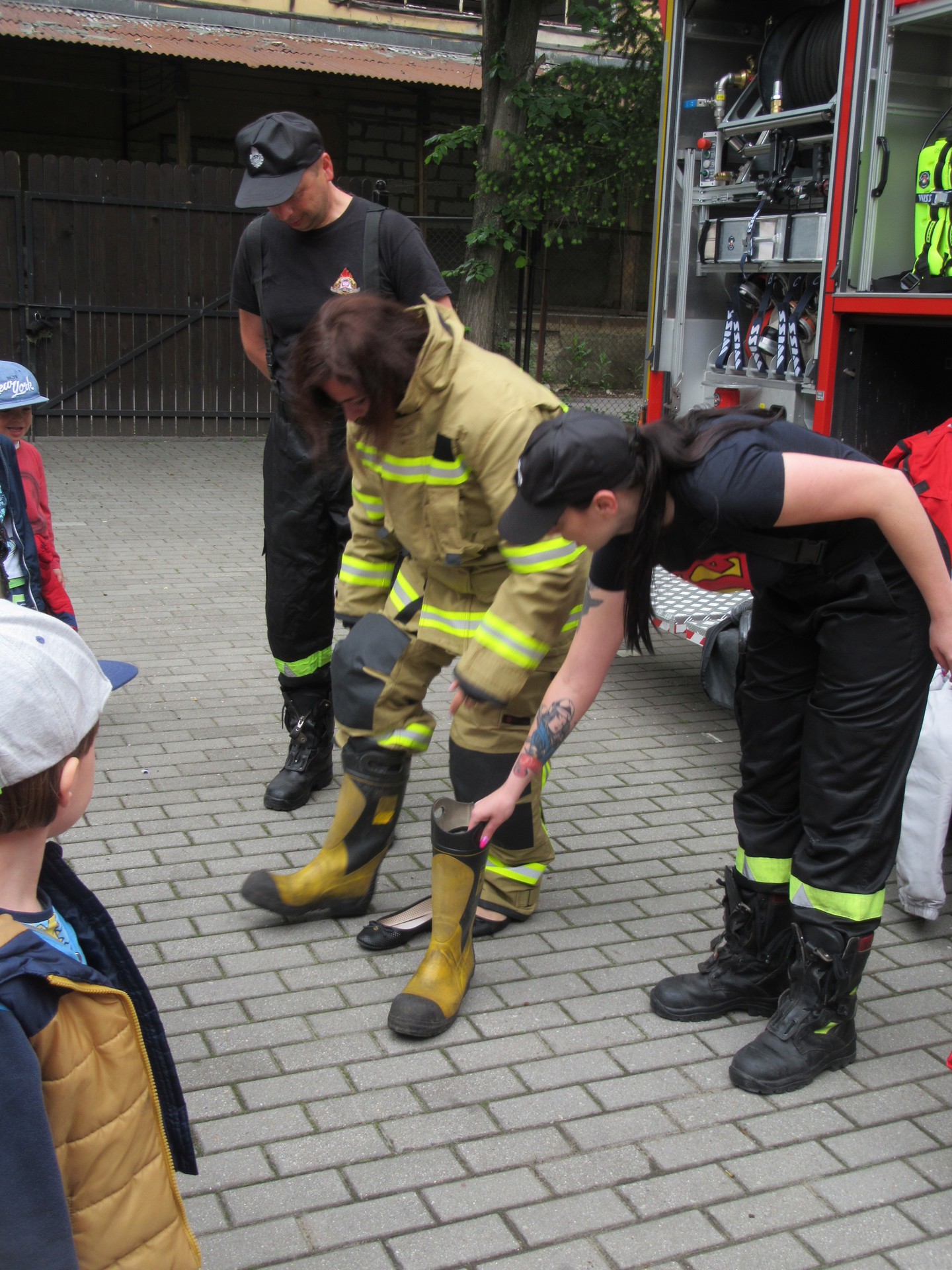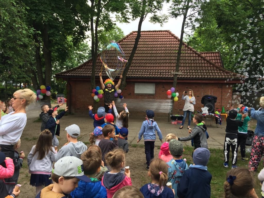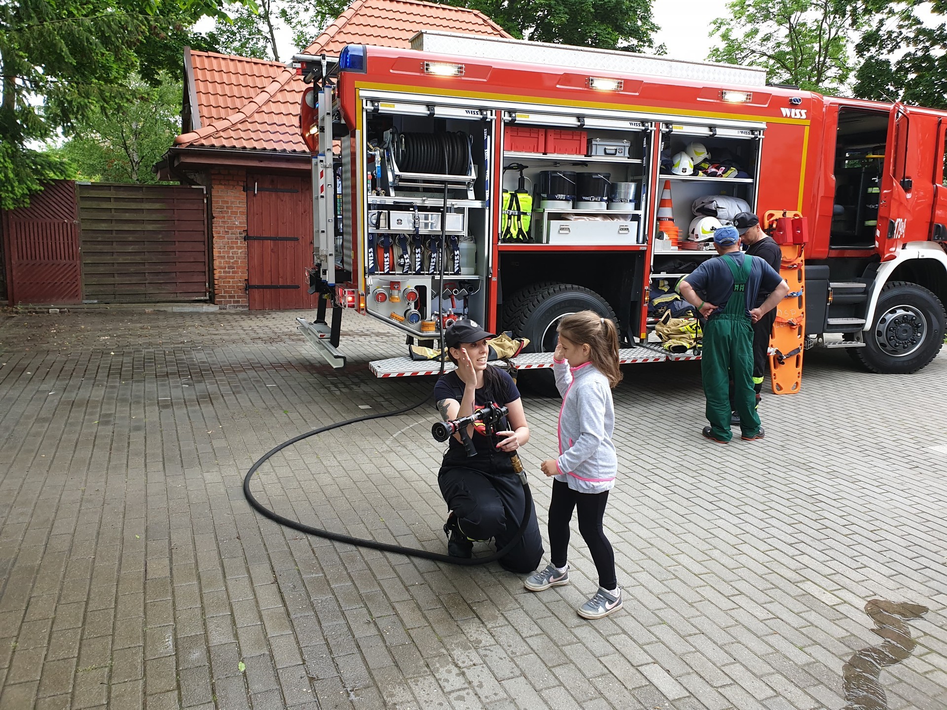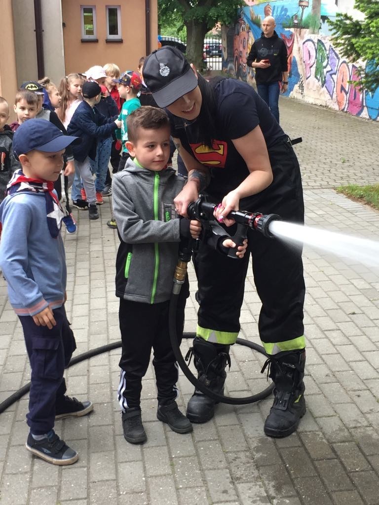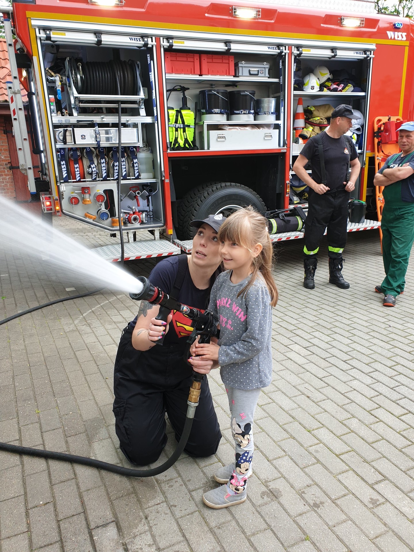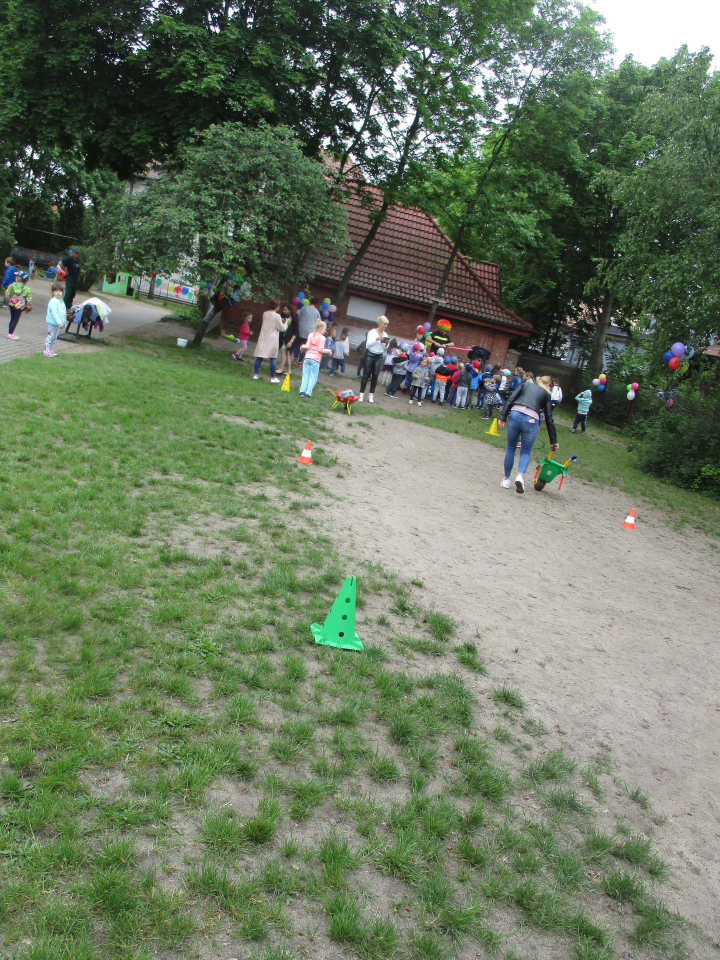 Dzień obfitował w liczne atrakcje. Na początek wóz strażacki , dzieci mogły obejrzeć go od środka a także zobaczyć jak działa wąż strażacki. Nasza Pani Dyrektor zamieniła się na chwilę w strażaka prezentując się w pełnym stroju strażackim. Tego dnia gościliśmy w naszej placówce animatora zabaw, który prowadził z dziećmi zabawy taneczne, tworzył wspaniałe bańki mydlane oraz różności z balonów. Dzieci malowały farbami na strechu oraz brały udział w zawodach sportowych. Nie zabrakło tego dnia słodkości, nasi milusińscy dostali lody oraz mogły częstować się pysznymi ciastami zrobionymi przez rodziców. Nie zabrakło też wesołych zabaw na świeżym powietrzu.