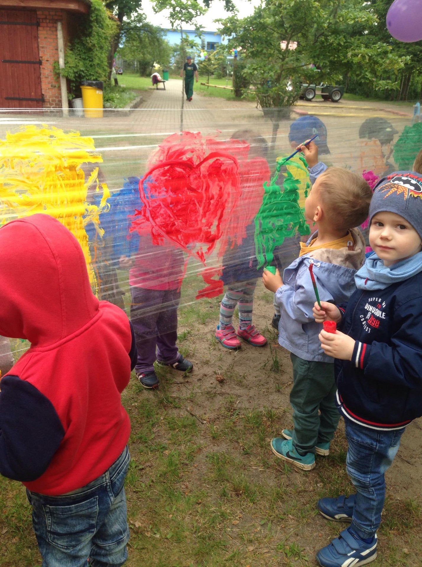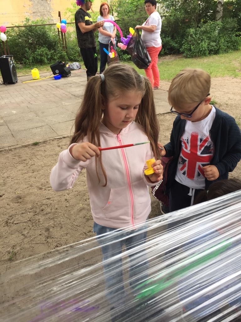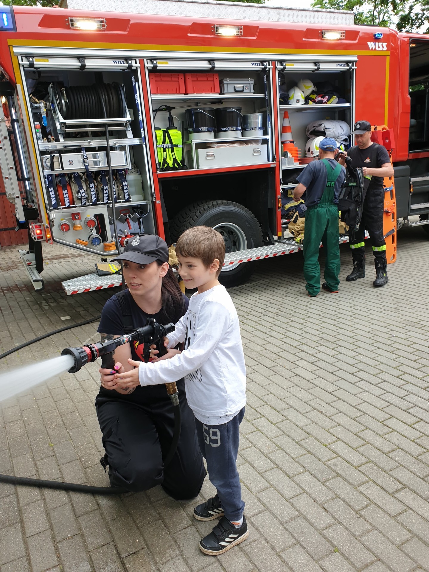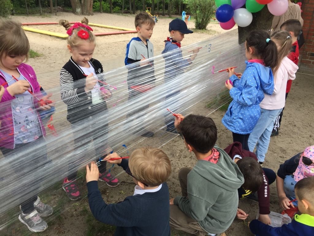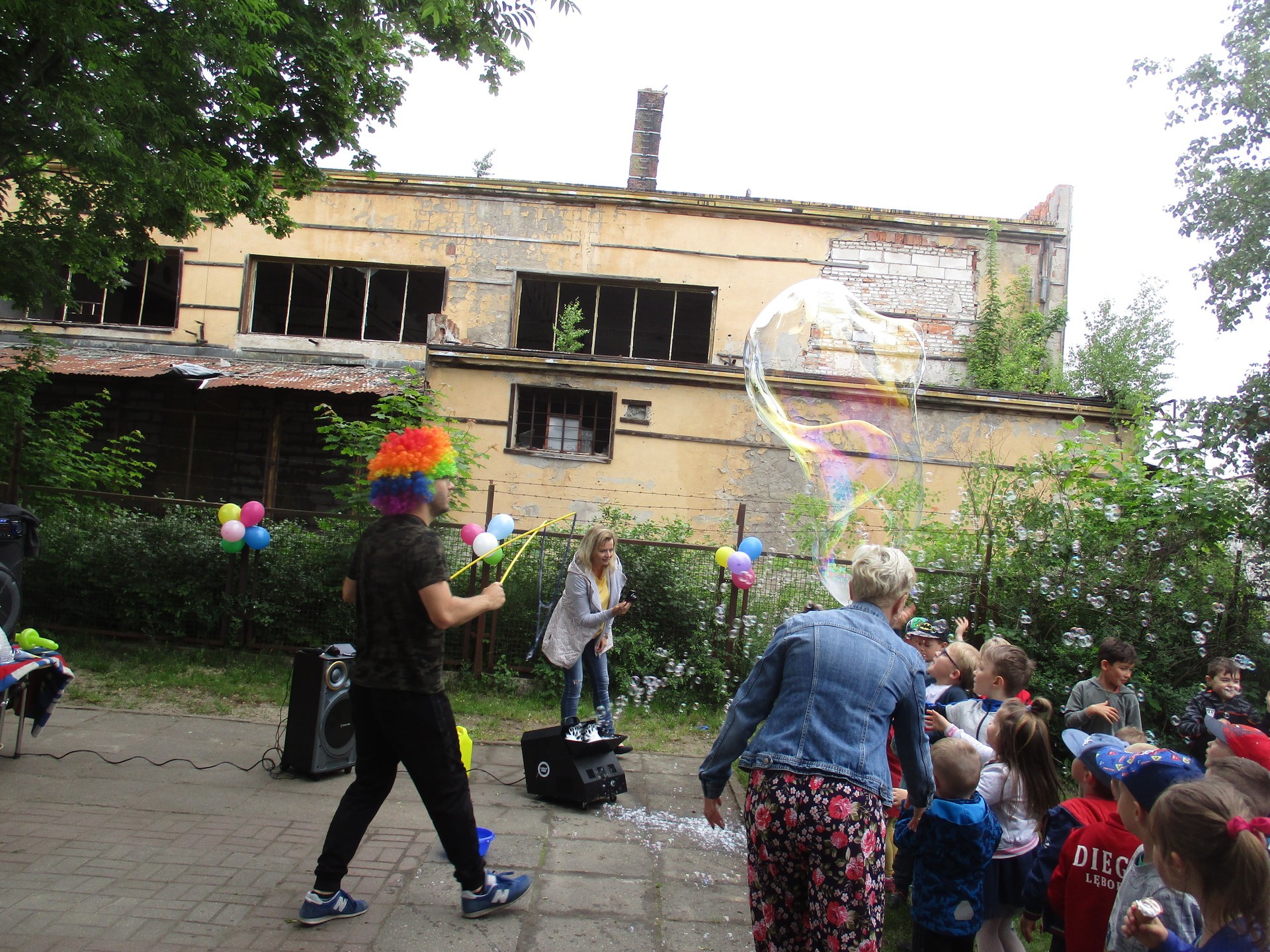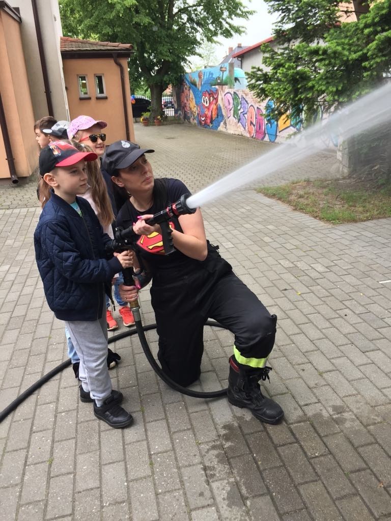 Dzień obfitował w liczne atrakcje. Na początek wóz strażacki , dzieci mogły obejrzeć go od środka a także zobaczyć jak działa wąż strażacki. Nasza Pani Dyrektor zamieniła się na chwilę w strażaka prezentując się w pełnym stroju strażackim. Tego dnia gościliśmy w naszej placówce animatora zabaw, który prowadził z dziećmi zabawy taneczne, tworzył wspaniałe bańki mydlane oraz różności z balonów. Dzieci malowały farbami na strechu oraz brały udział w zawodach sportowych. Nie zabrakło tego dnia słodkości, nasi milusińscy dostali lody oraz mogły częstować się pysznymi ciastami zrobionymi przez rodziców. Nie zabrakło też wesołych zabaw na świeżym powietrzu.