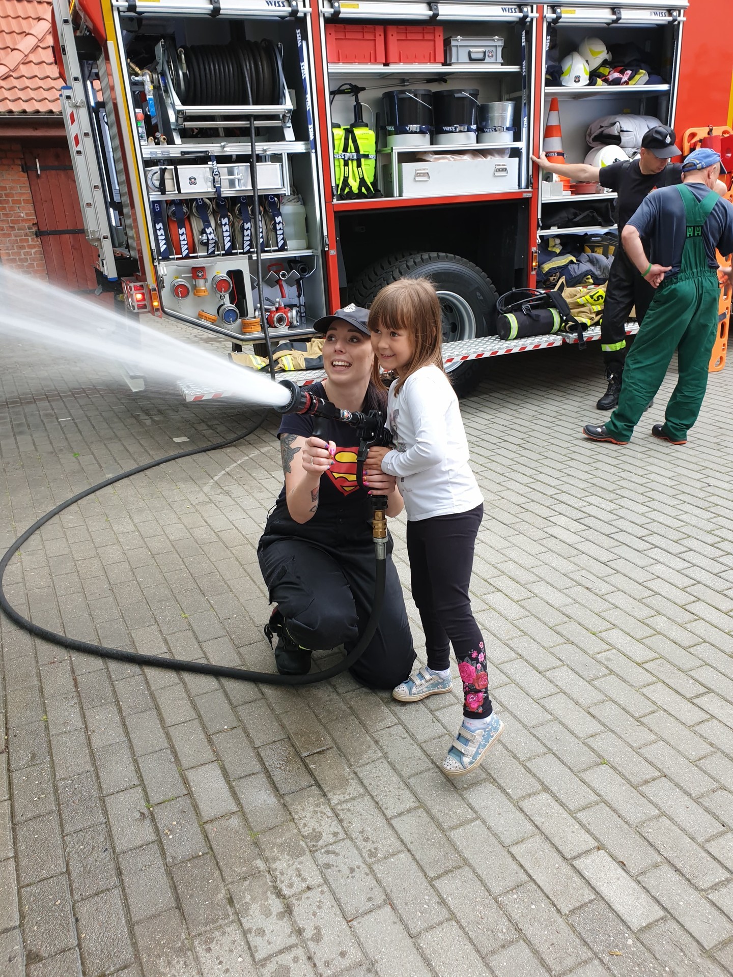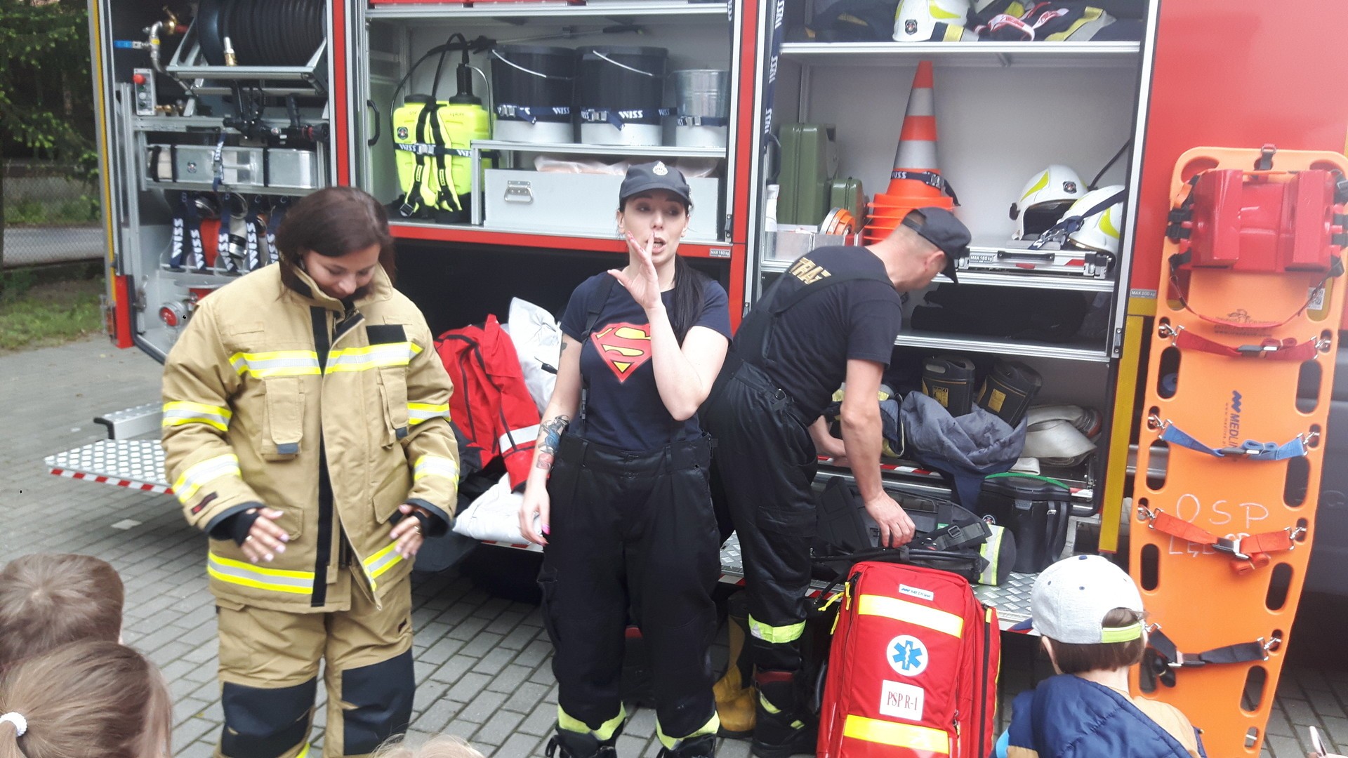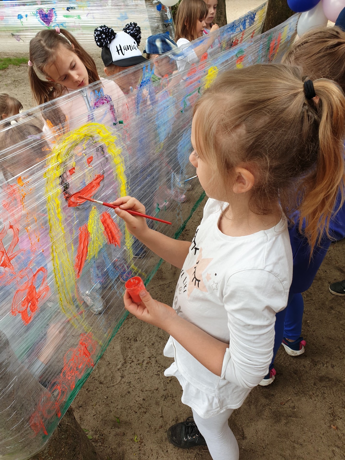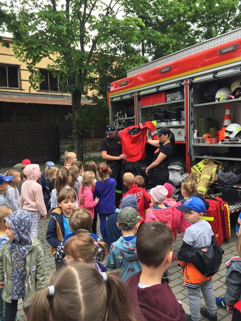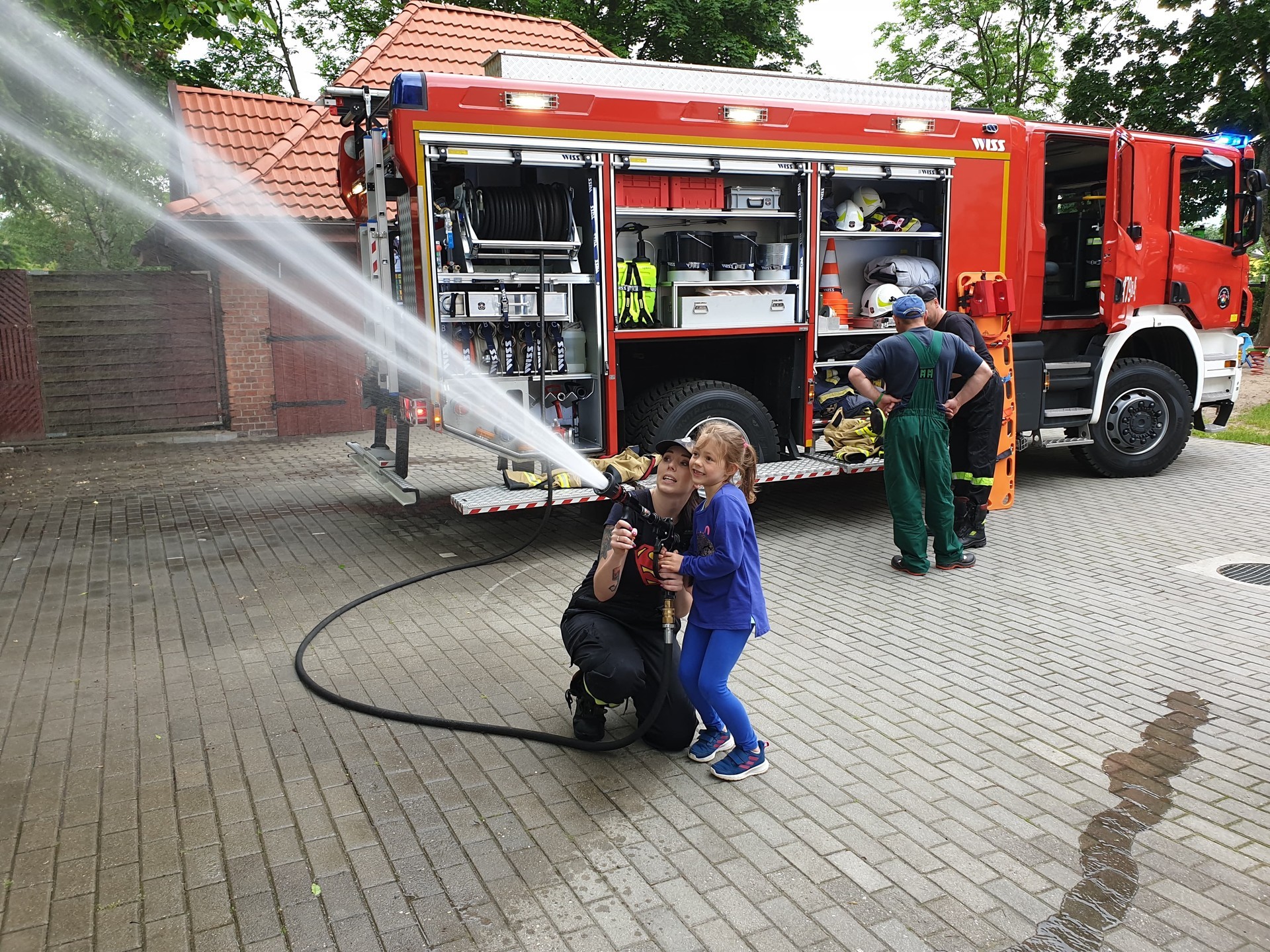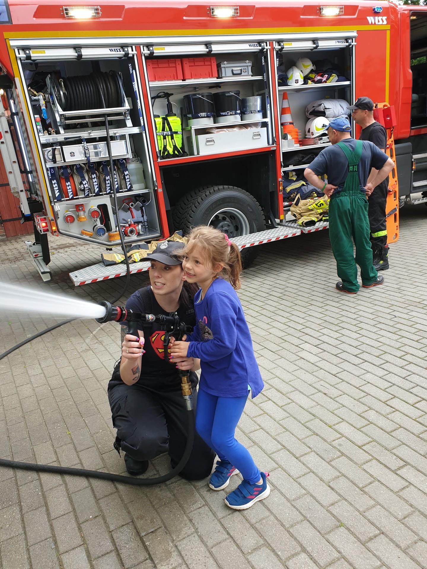Dzień obfitował w liczne atrakcje. Na początek wóz strażacki , dzieci mogły obejrzeć go od środka a także zobaczyć jak działa wąż strażacki. Nasza Pani Dyrektor zamieniła się na chwilę w strażaka prezentując się w pełnym stroju strażackim. Tego dnia gościliśmy w naszej placówce animatora zabaw, który prowadził z dziećmi zabawy taneczne, tworzył wspaniałe bańki mydlane oraz różności z balonów. Dzieci malowały farbami na strechu oraz brały udział w zawodach sportowych. Nie zabrakło tego dnia słodkości, nasi milusińscy dostali lody oraz mogły częstować się pysznymi ciastami zrobionymi przez rodziców. Nie zabrakło też wesołych zabaw na świeżym powietrzu.