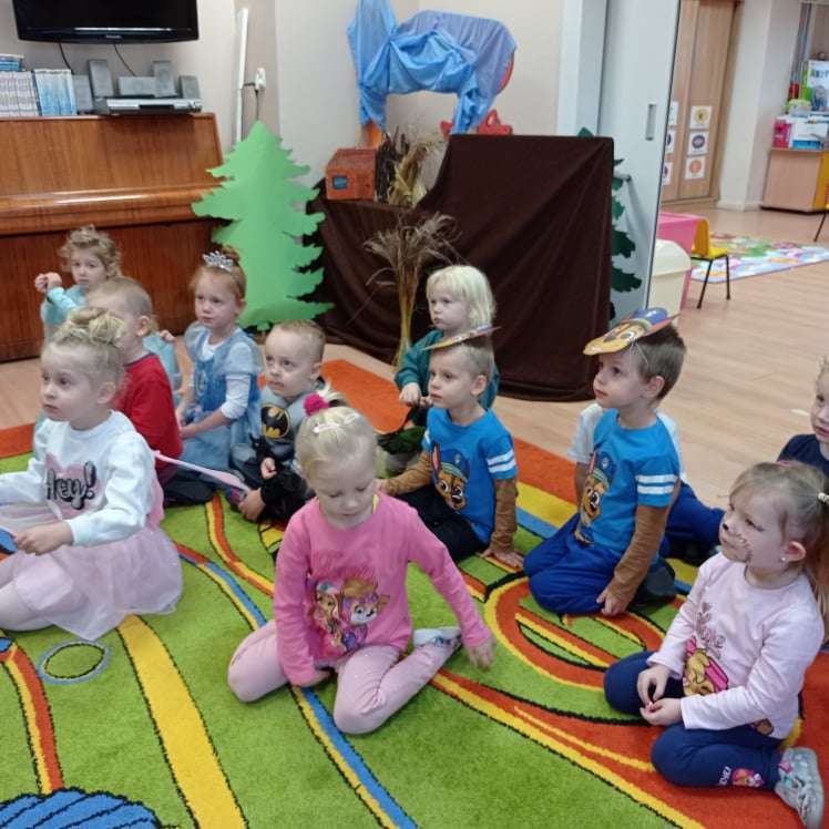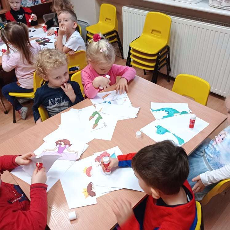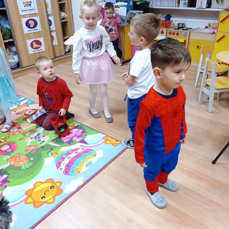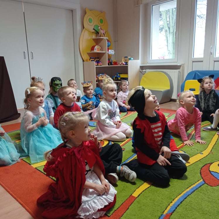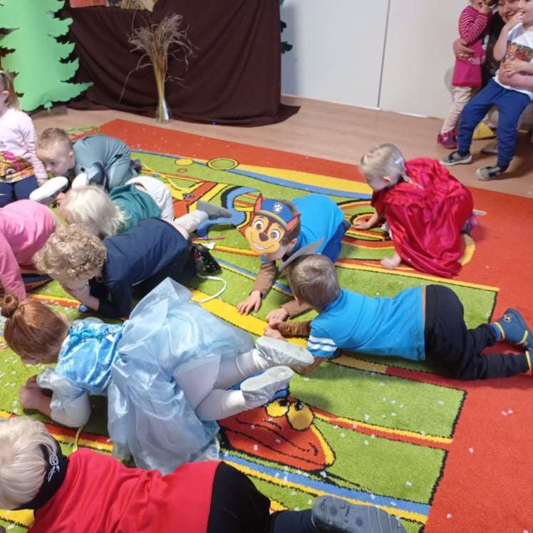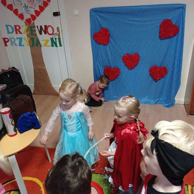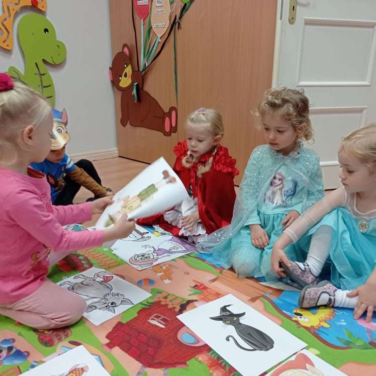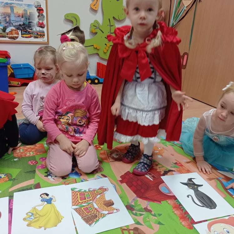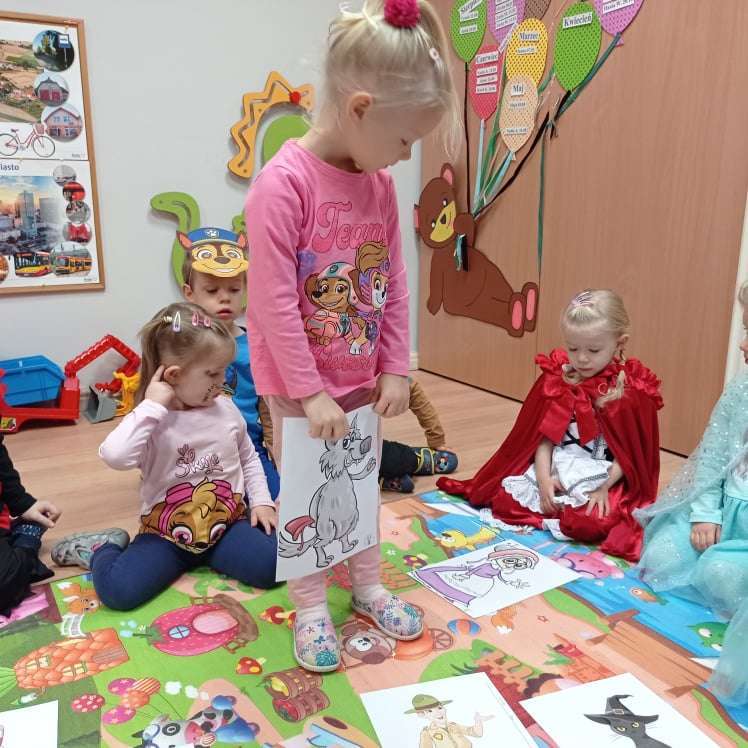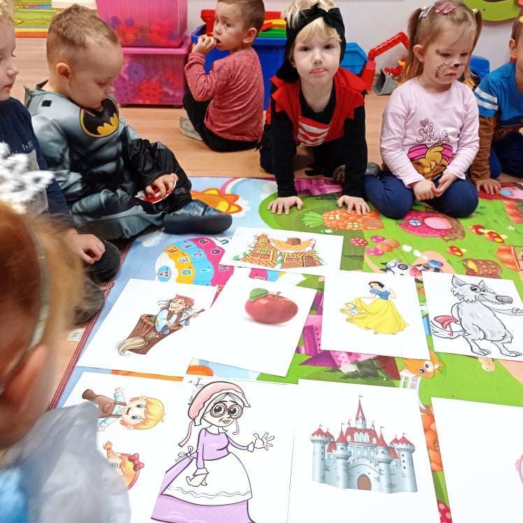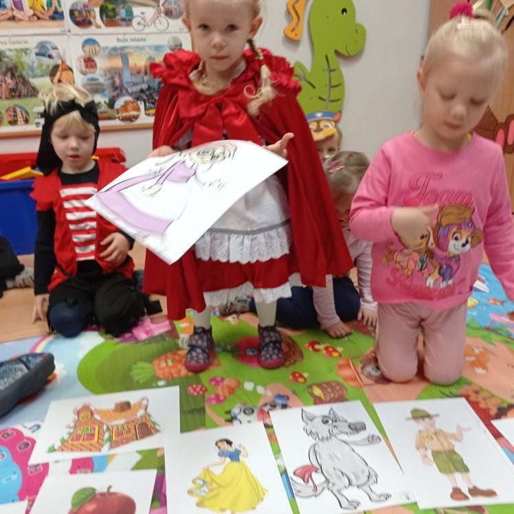 Tego dnia dzieci z grupy I spędziły czas na zabawach wymagających wykazania się znajomością treści bajek, tych znanych i mniej znanych. Dzieci rozwiązywały zagadki, rozpoznawały bajkę po rekwizycie, pomagały Kopciuszkowi oddzielić fasolę od kaszy, układały bajkowe puzzle i przyklejały na kartkę. Były muzyczne zgadywanki bajkowe, zabawy ruchowe oraz prezentacja dziecięcych bajkowych przebrań. Przedszkolaki dostały również zadanie do domu. Dzieci bardzo dobrze znają bajki i świetnie radziły sobie z zadaniami.