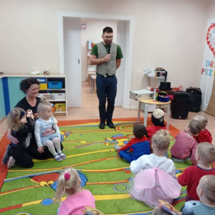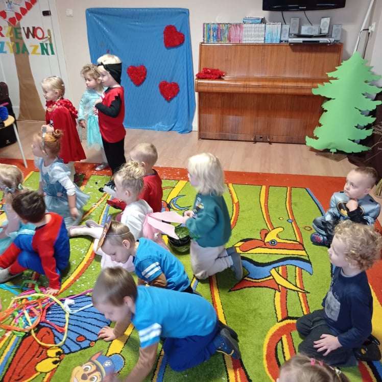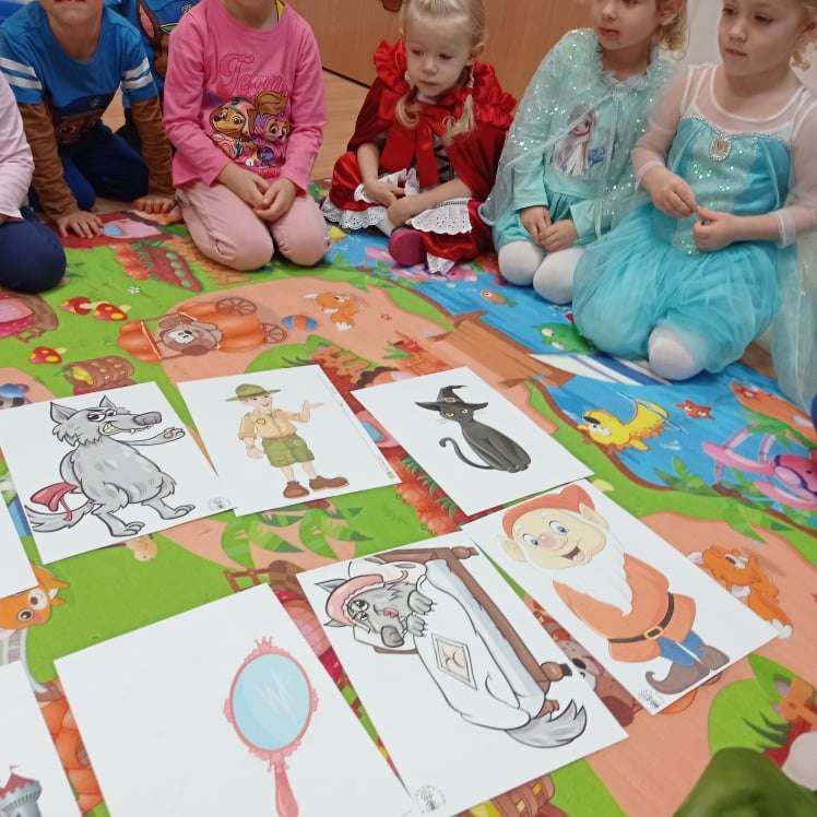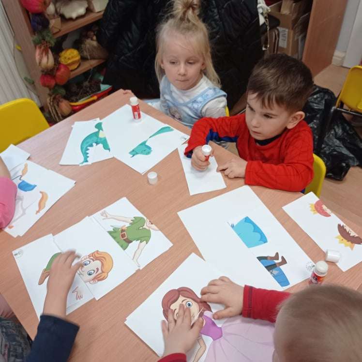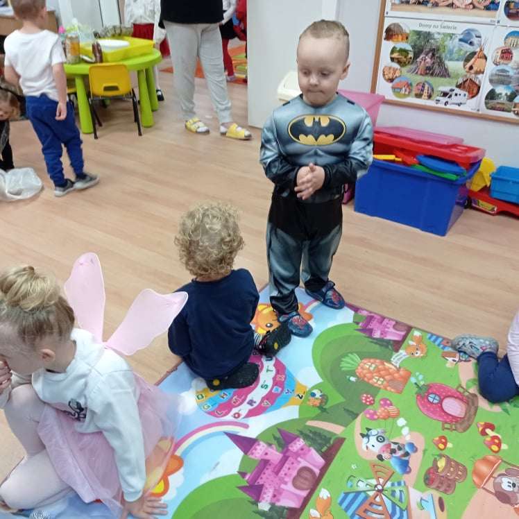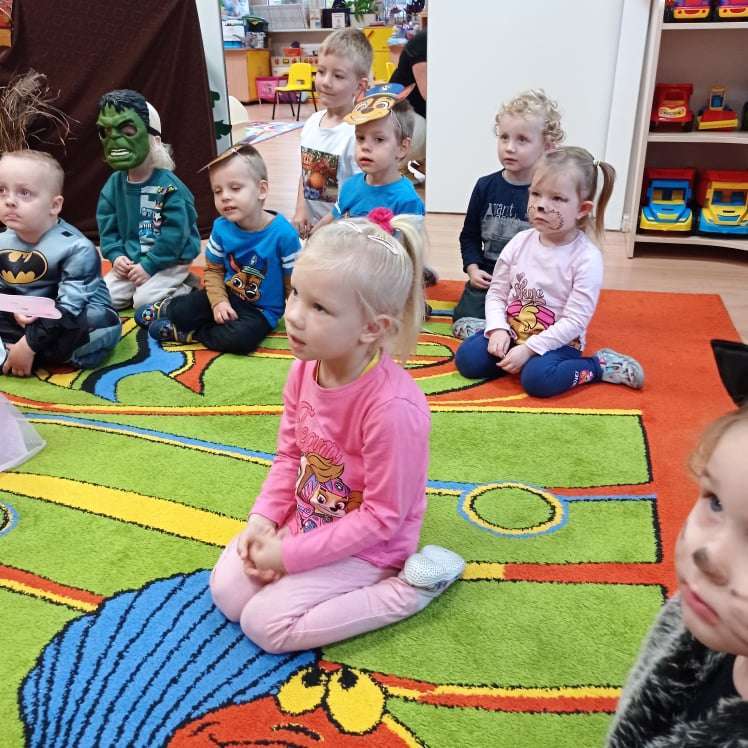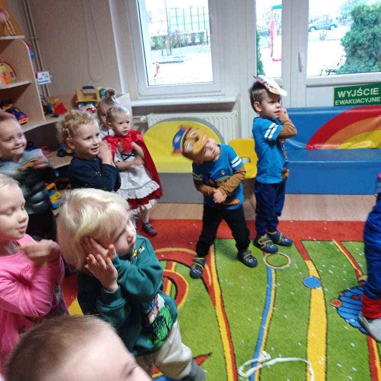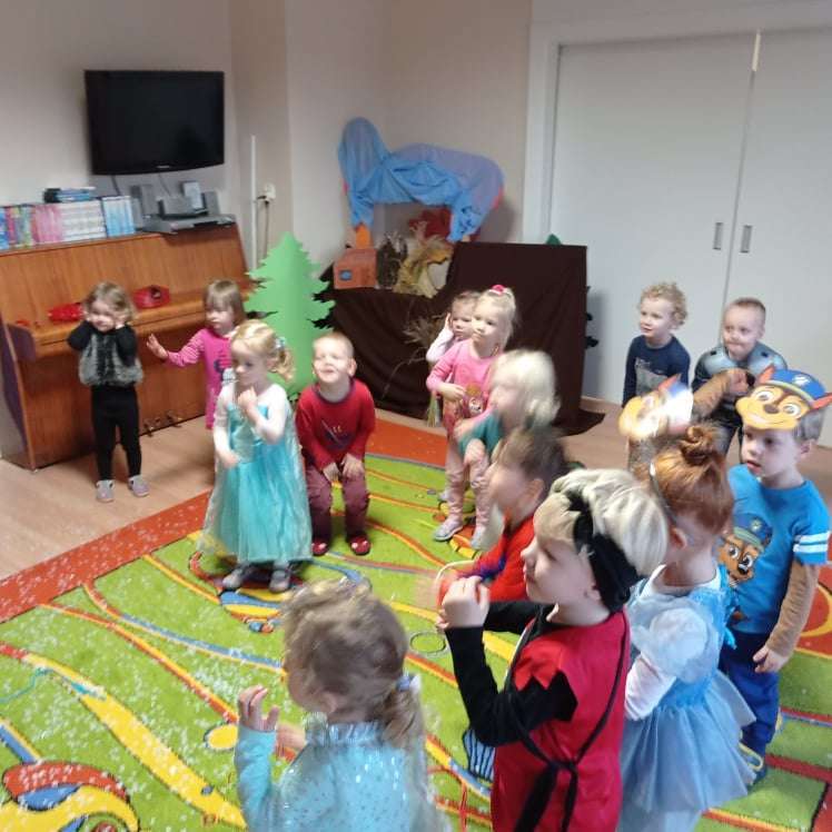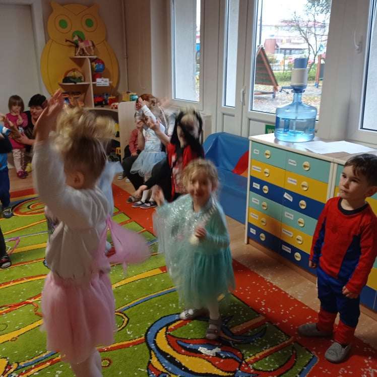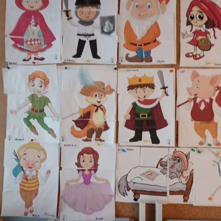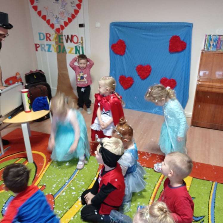 Tego dnia dzieci z grupy I spędziły czas na zabawach wymagających wykazania się znajomością treści bajek, tych znanych i mniej znanych. Dzieci rozwiązywały zagadki, rozpoznawały bajkę po rekwizycie, pomagały Kopciuszkowi oddzielić fasolę od kaszy, układały bajkowe puzzle i przyklejały na kartkę. Były muzyczne zgadywanki bajkowe, zabawy ruchowe oraz prezentacja dziecięcych bajkowych przebrań. Przedszkolaki dostały również zadanie do domu. Dzieci bardzo dobrze znają bajki i świetnie radziły sobie z zadaniami.