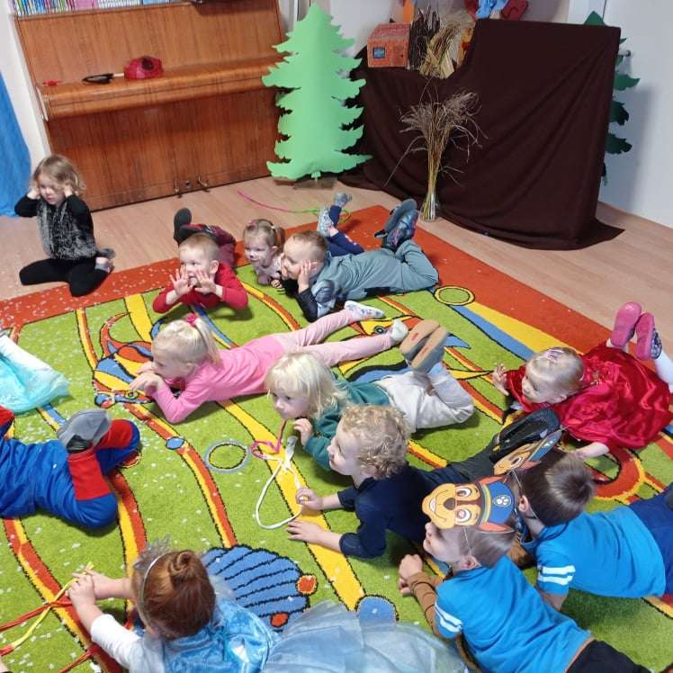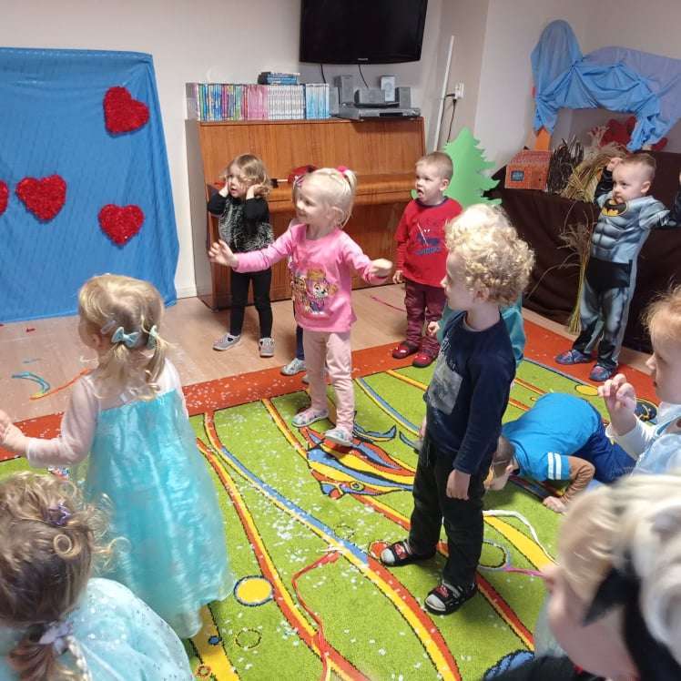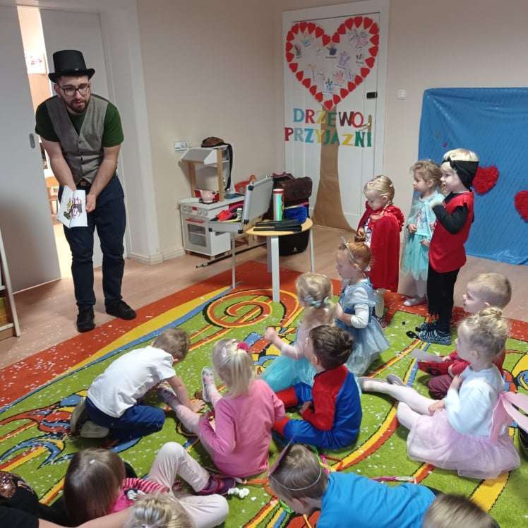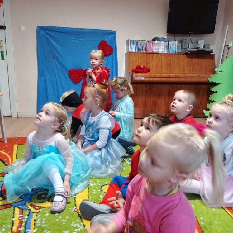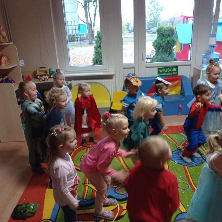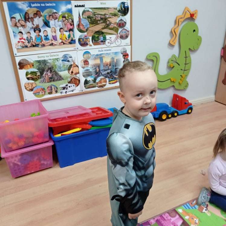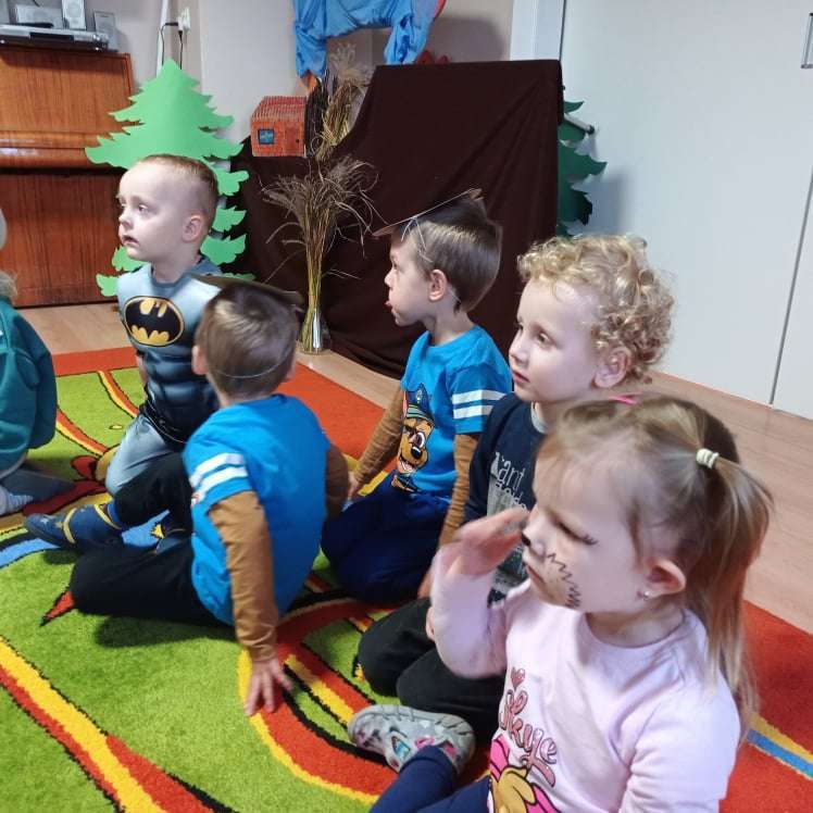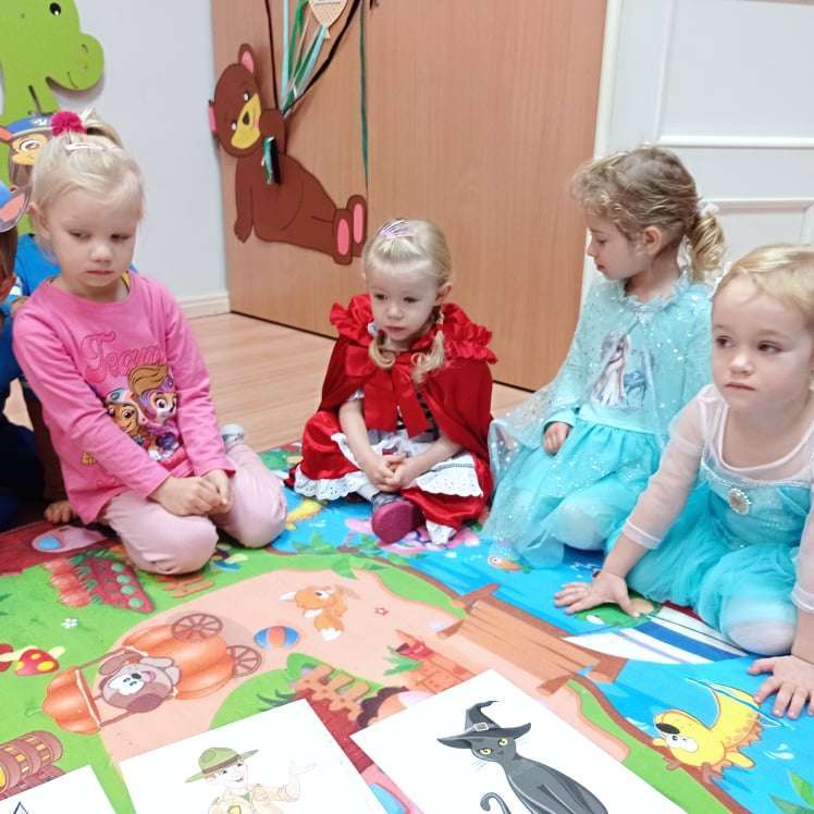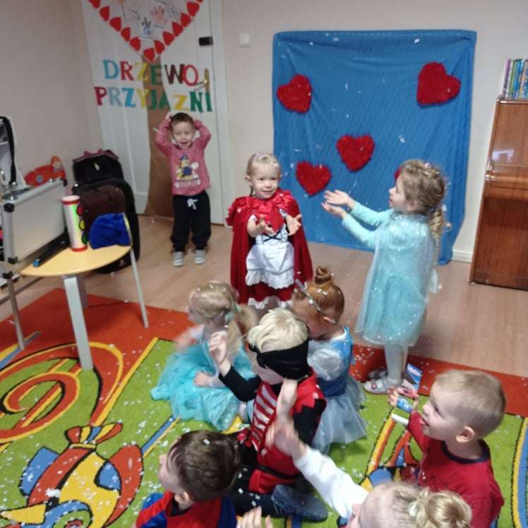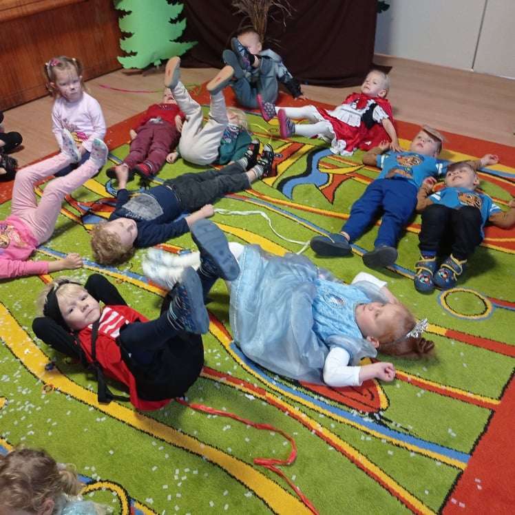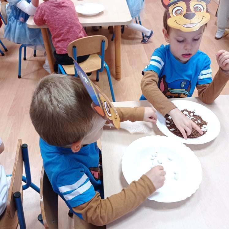 Tego dnia dzieci z grupy I spędziły czas na zabawach wymagających wykazania się znajomością treści bajek, tych znanych i mniej znanych. Dzieci rozwiązywały zagadki, rozpoznawały bajkę po rekwizycie, pomagały Kopciuszkowi oddzielić fasolę od kaszy, układały bajkowe puzzle i przyklejały na kartkę. Były muzyczne zgadywanki bajkowe, zabawy ruchowe oraz prezentacja dziecięcych bajkowych przebrań. Przedszkolaki dostały również zadanie do domu. Dzieci bardzo dobrze znają bajki i świetnie radziły sobie z zadaniami.