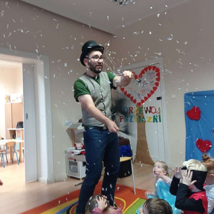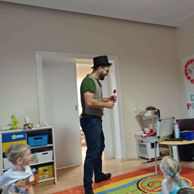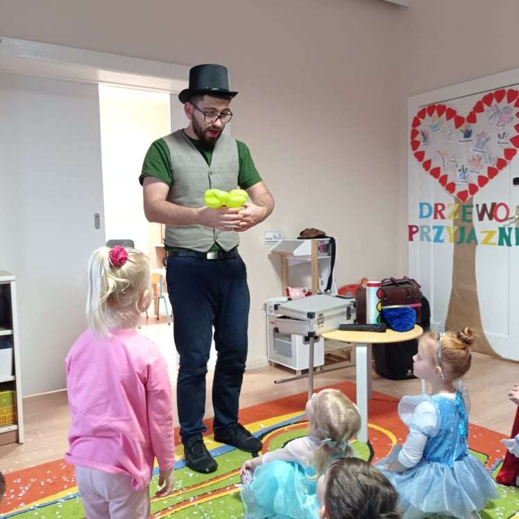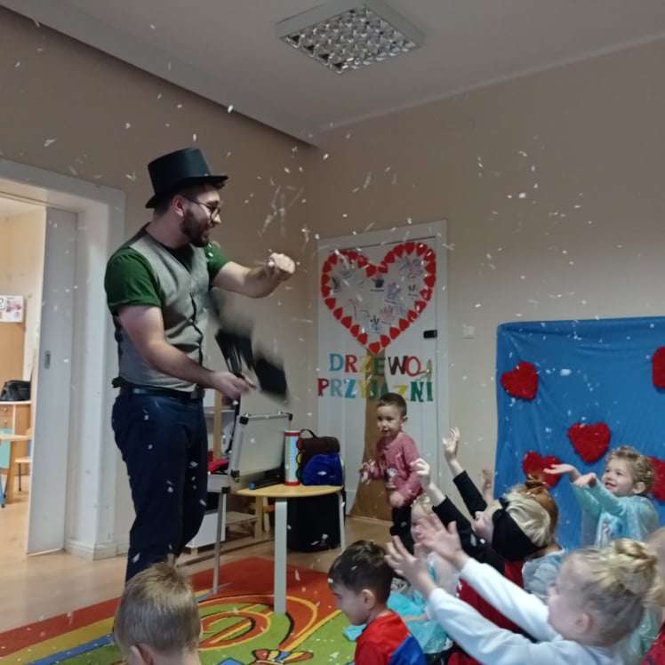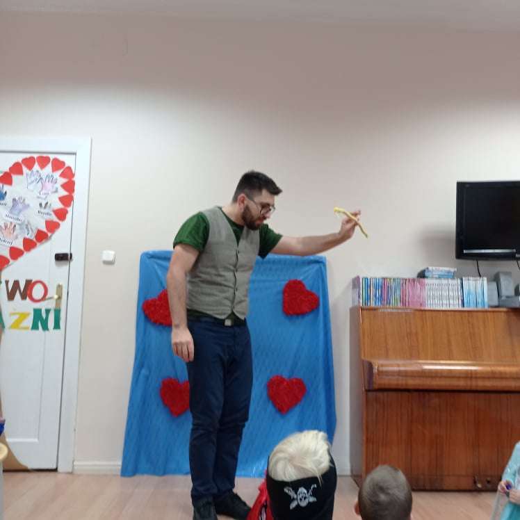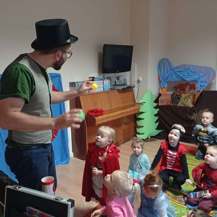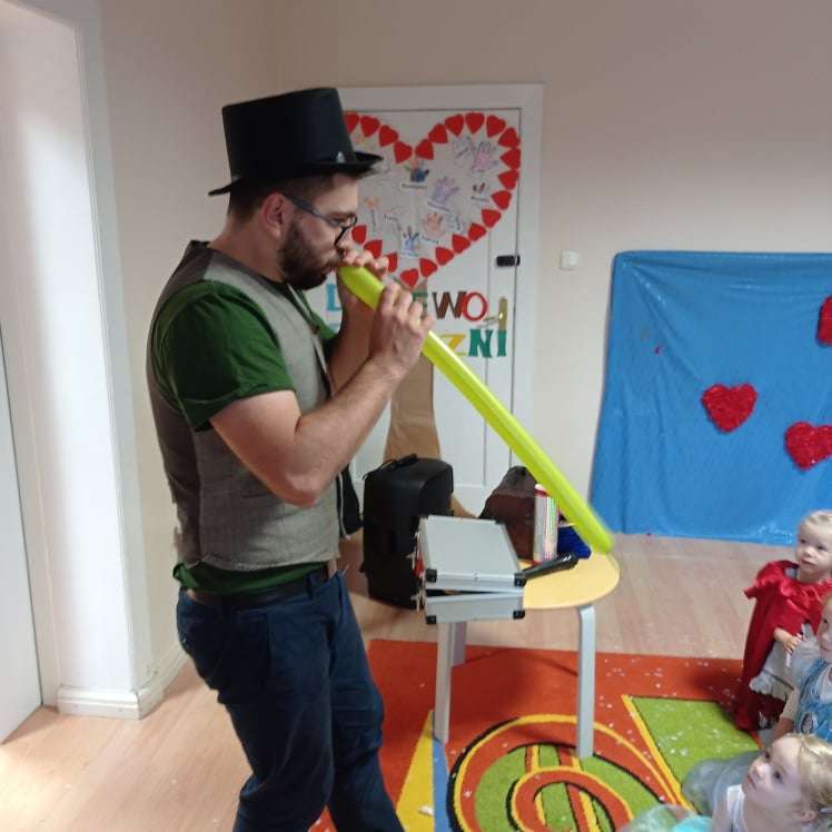 Wielką frajdę sprawił dzieciom animator Amigol, który wprowadził je w świat magii, sprawił, że dzieci śmiały się przez całą godzinę (panie również ). Mamy nadzieję, że rodzice powyciągają te czerwone chustki z nosków dzieci, które to magik (niby) im włożył. :-).