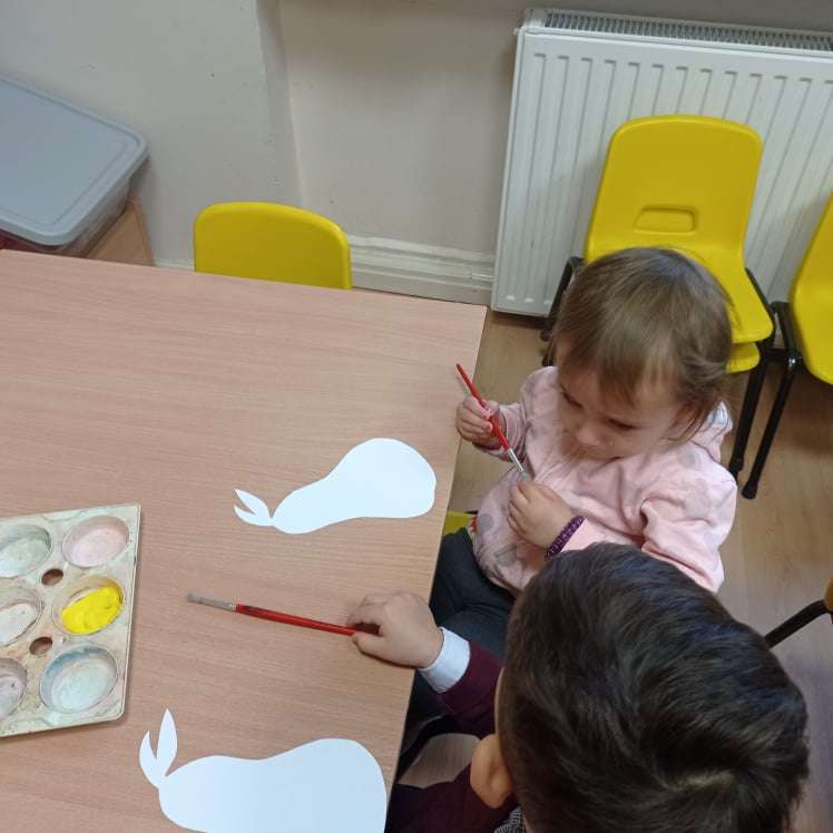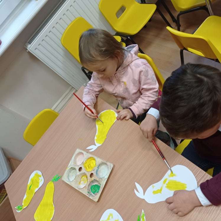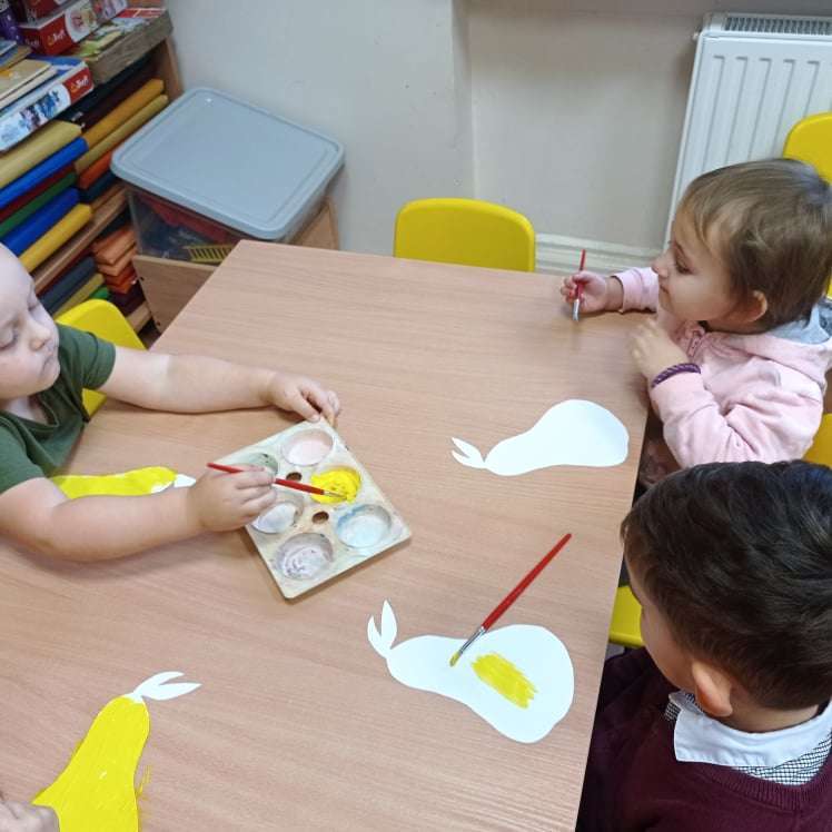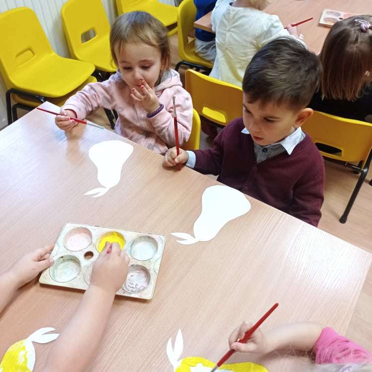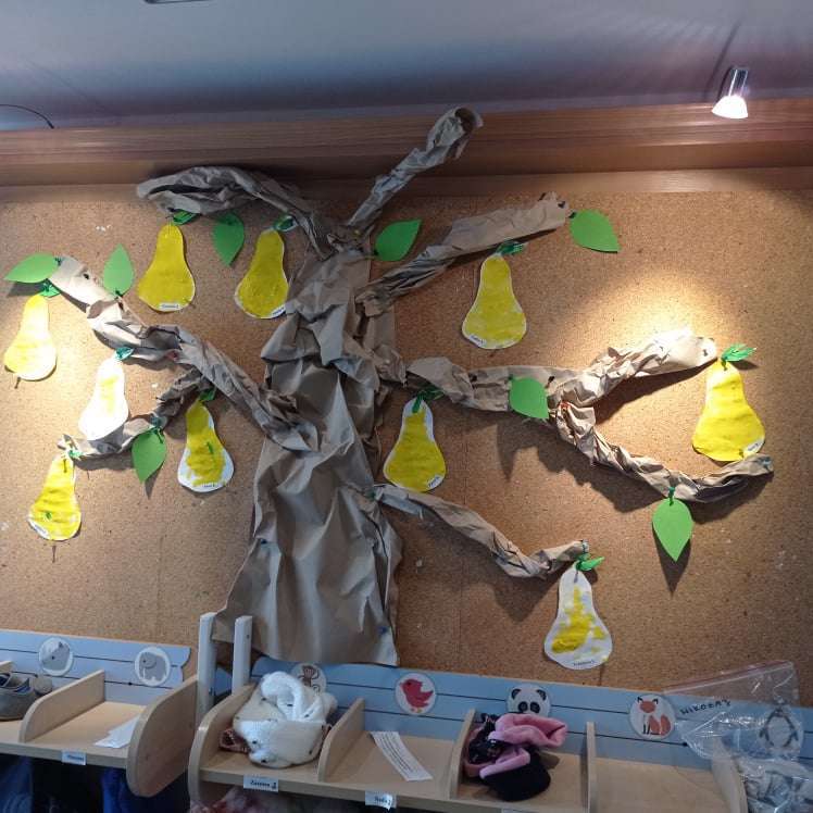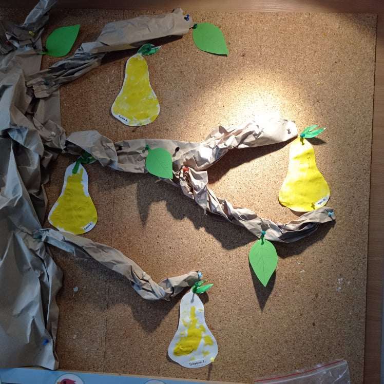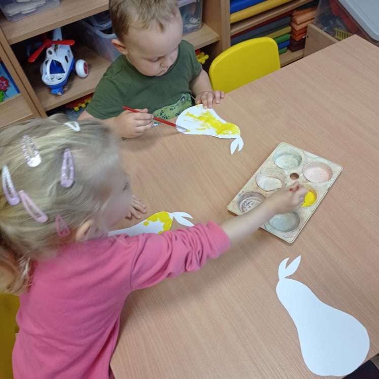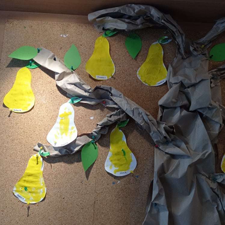 Wpadła gruszka do fartuszka, a za gruszką dwa jabłuszka. A śliweczka wpaść nie chciała, bo śliweczka niedojrzała.