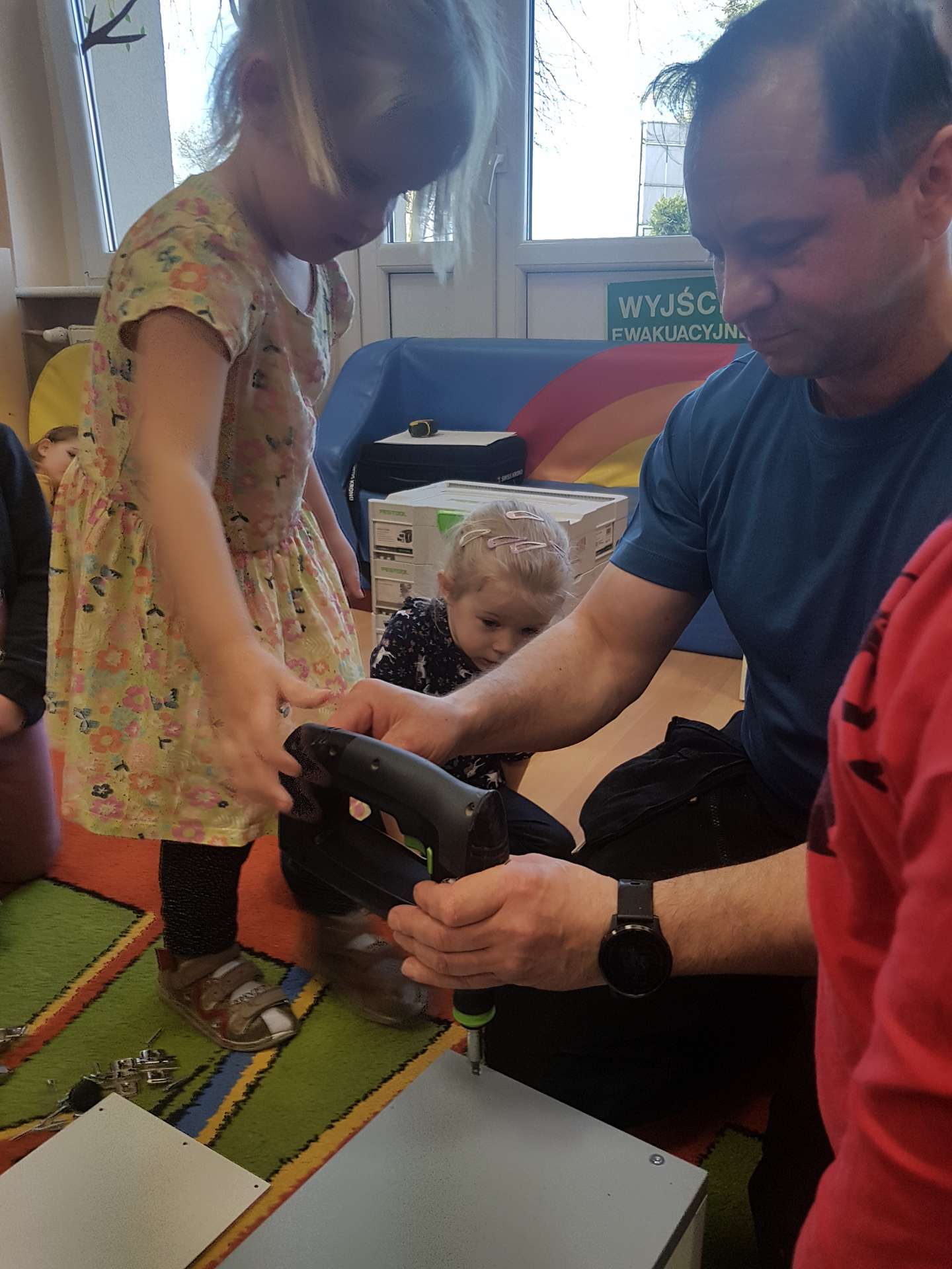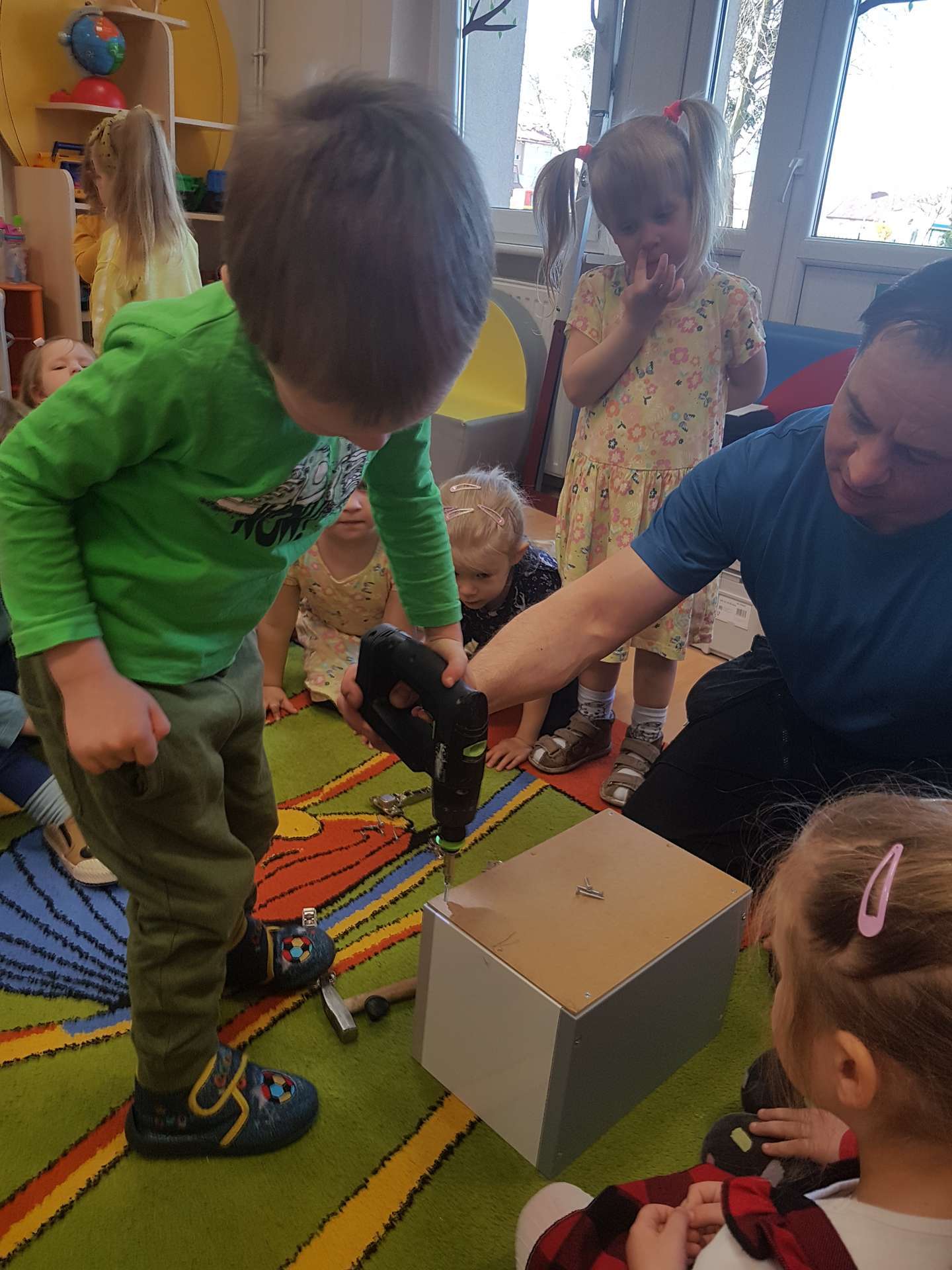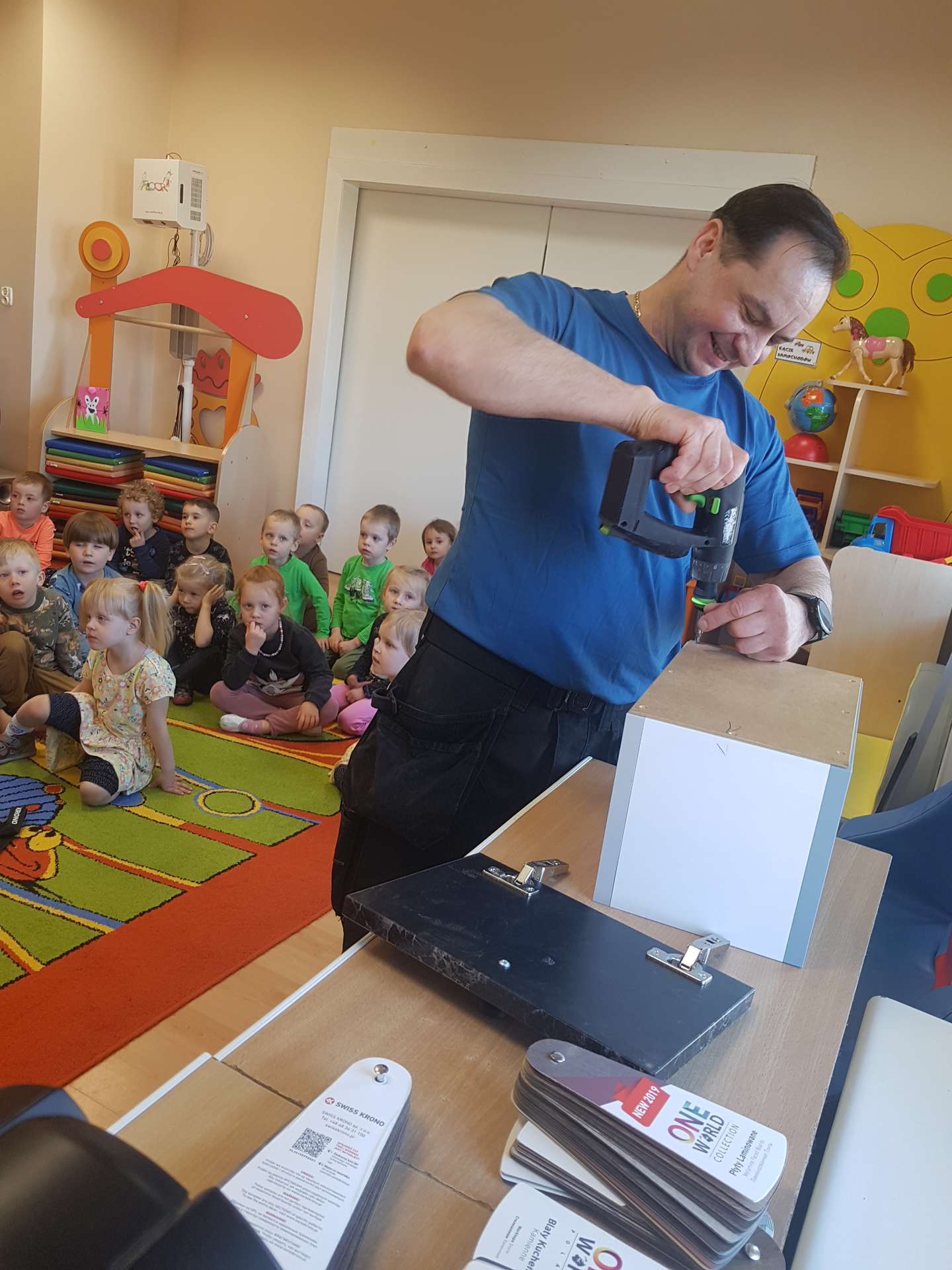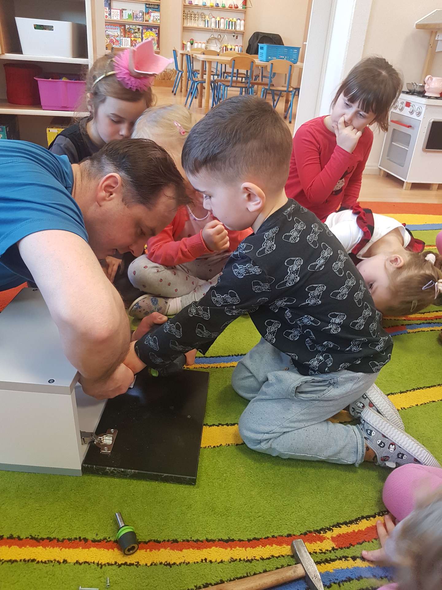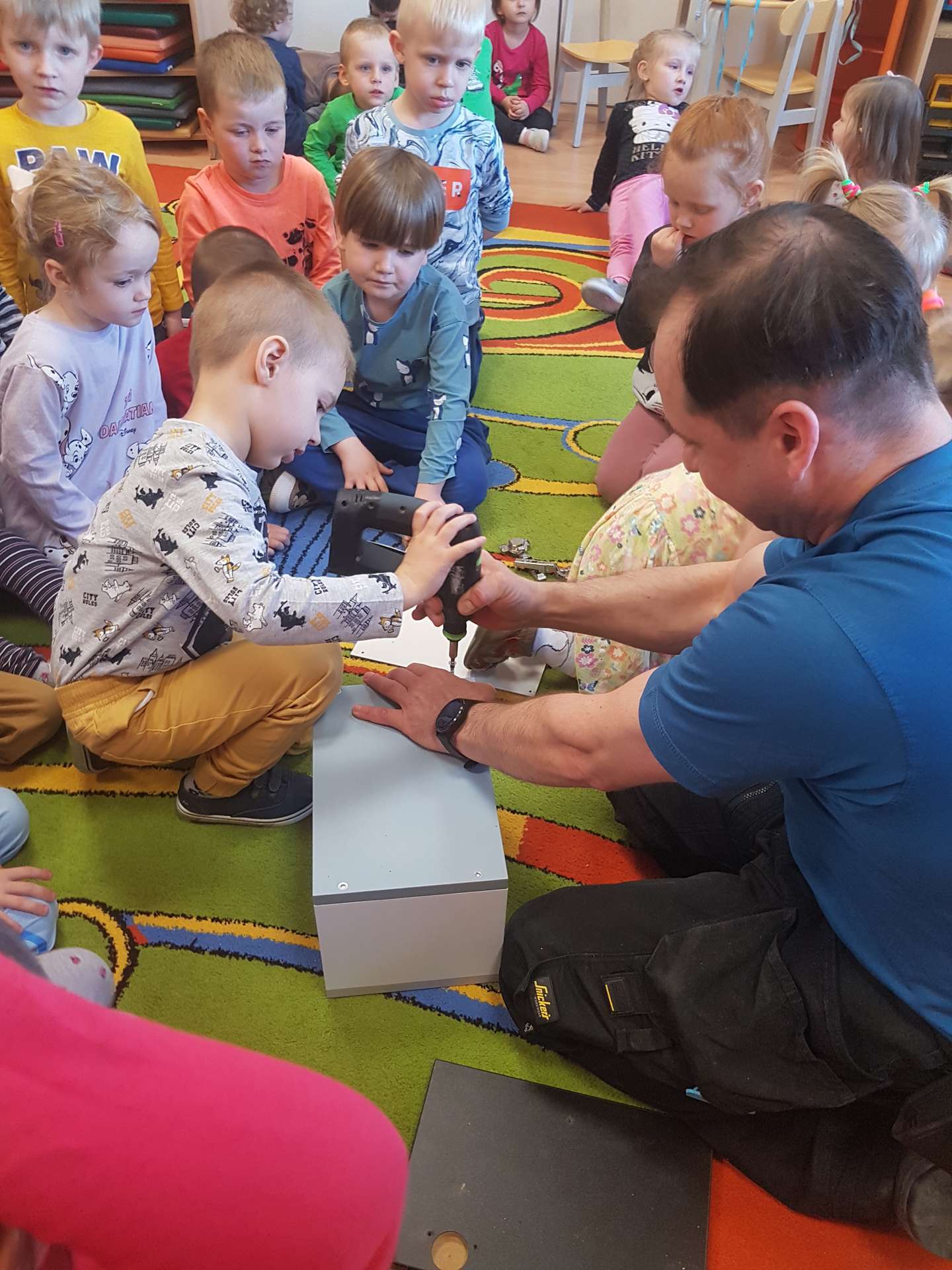 I kolejny gość w naszym przedszkolu w ramach cyklu zajęć "Poznajemy zawody". Tym razem dzieci najmłodsze poznały pracę stolarza. Pan Andrzej Lewandowski bardzo ciekawie opowiedział dzieciom, jak wygląda praca stolarza. Przedstawił narzędzia stolarskie, materiał, z jakiego wykonuje się meble, opowiedział o procesie powstawania różnych elementów stolarskich. Pokazał dzieciom także wzorniki kolorów płyt i drewna Zwrócił także uwagę na to, że stolarz musi być bardzo precyzyjny. Dużą frajdą dla dzieci było wspólne zbudowanie szafki na klocki. Przybijanie gwoździ i wkręcanie śrubek to nie tylko radość dla chłopców. Dziewczynki również chętnie wykonywały te czynności.