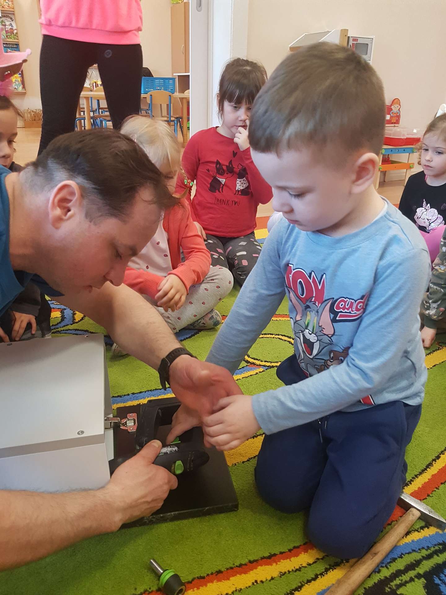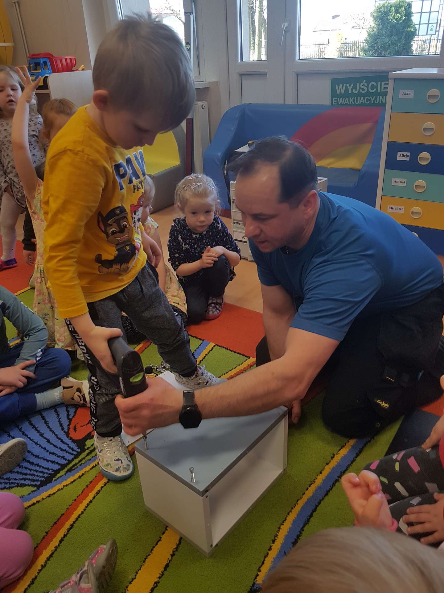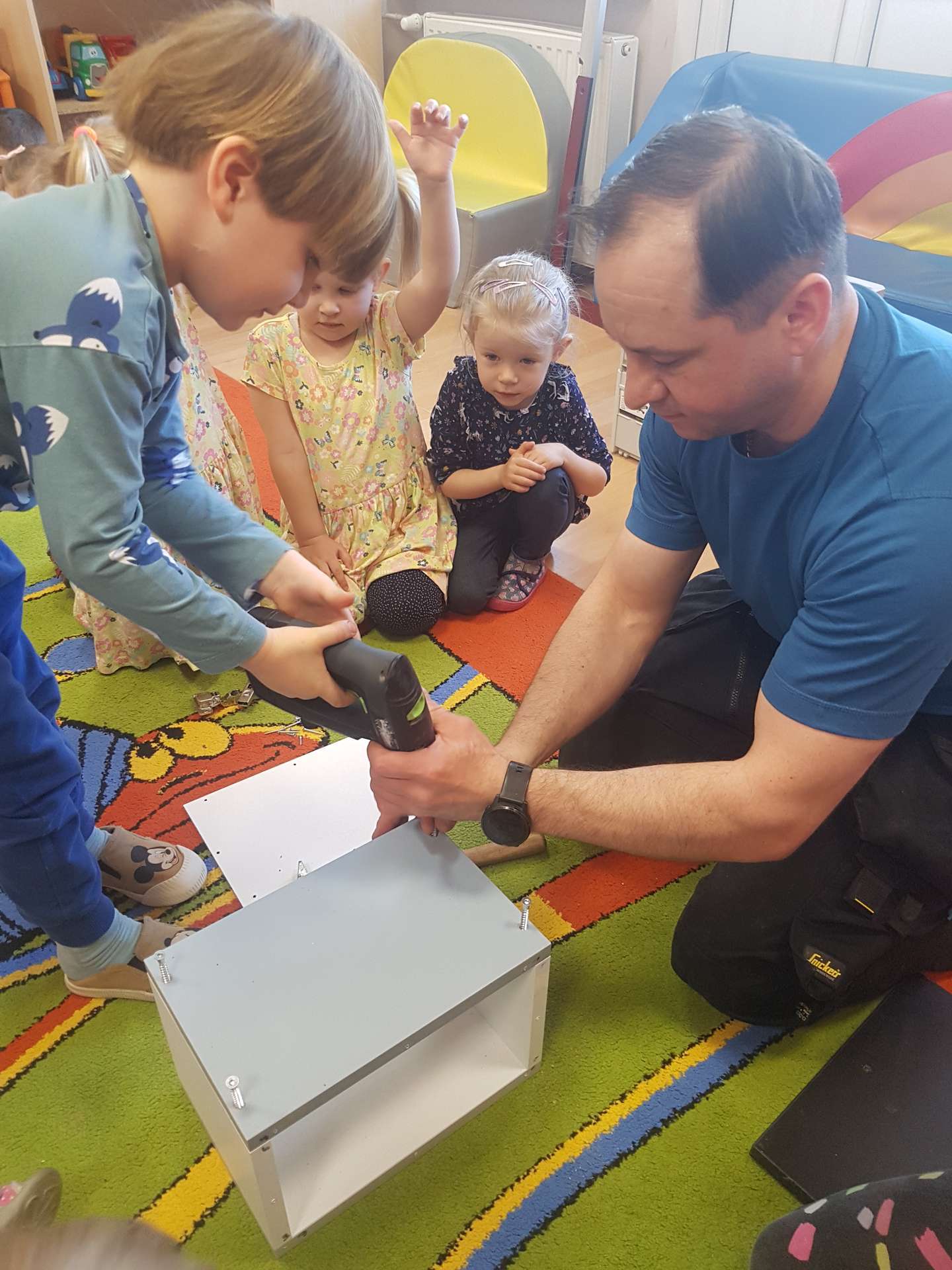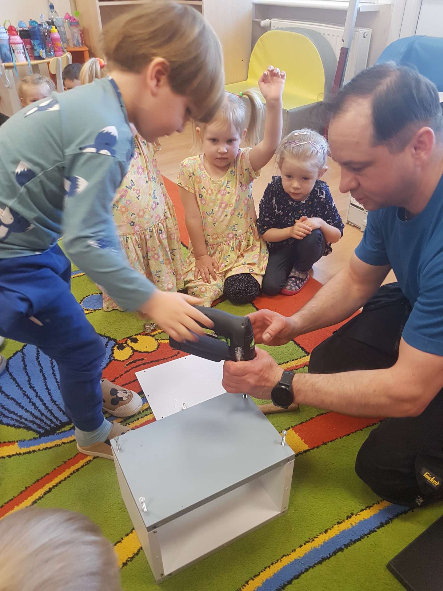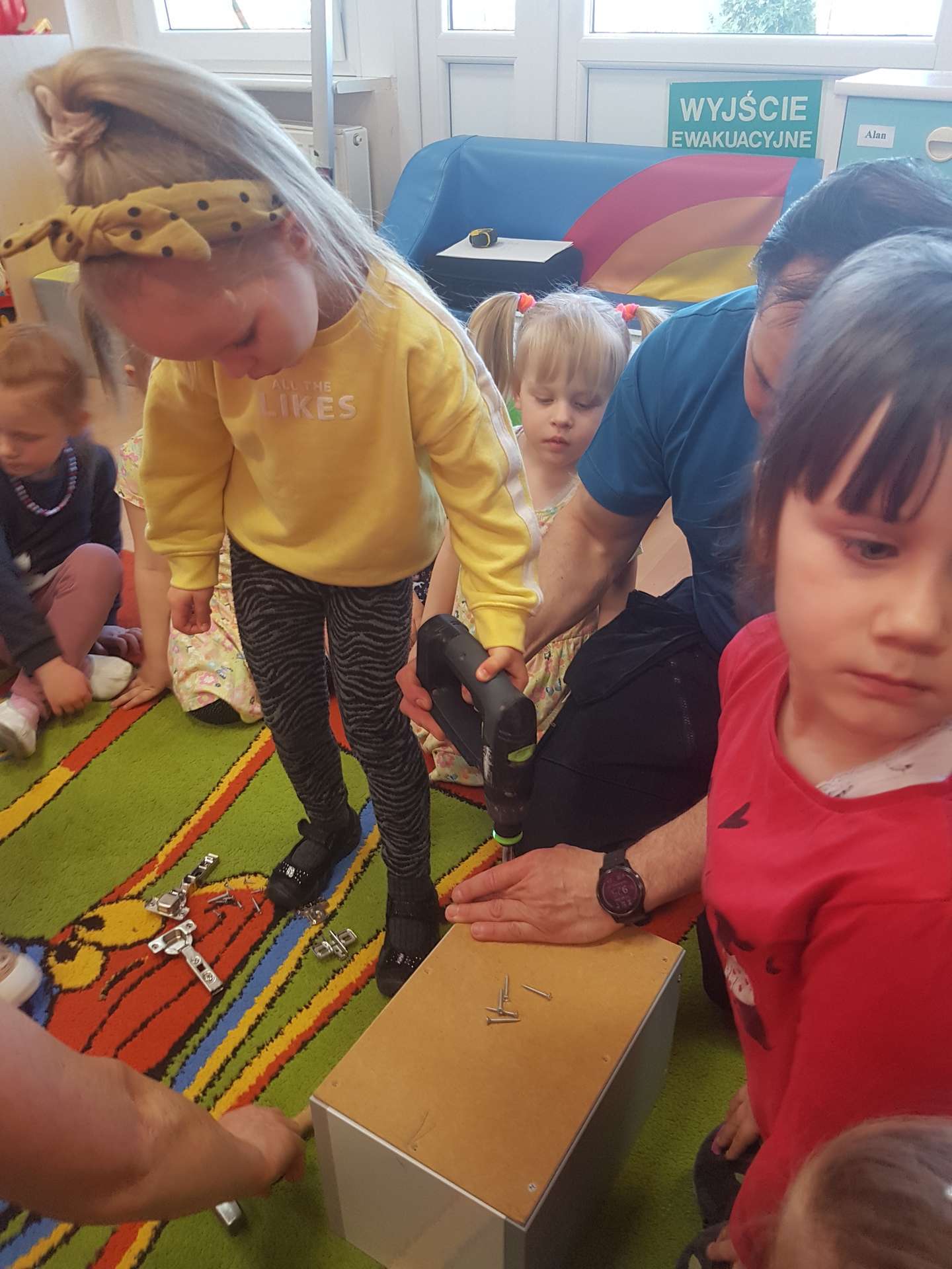 I kolejny gość w naszym przedszkolu w ramach cyklu zajęć "Poznajemy zawody". Tym razem dzieci najmłodsze poznały pracę stolarza. Pan Andrzej Lewandowski bardzo ciekawie opowiedział dzieciom, jak wygląda praca stolarza. Przedstawił narzędzia stolarskie, materiał, z jakiego wykonuje się meble, opowiedział o procesie powstawania różnych elementów stolarskich. Pokazał dzieciom także wzorniki kolorów płyt i drewna Zwrócił także uwagę na to, że stolarz musi być bardzo precyzyjny. Dużą frajdą dla dzieci było wspólne zbudowanie szafki na klocki. Przybijanie gwoździ i wkręcanie śrubek to nie tylko radość dla chłopców. Dziewczynki również chętnie wykonywały te czynności.
