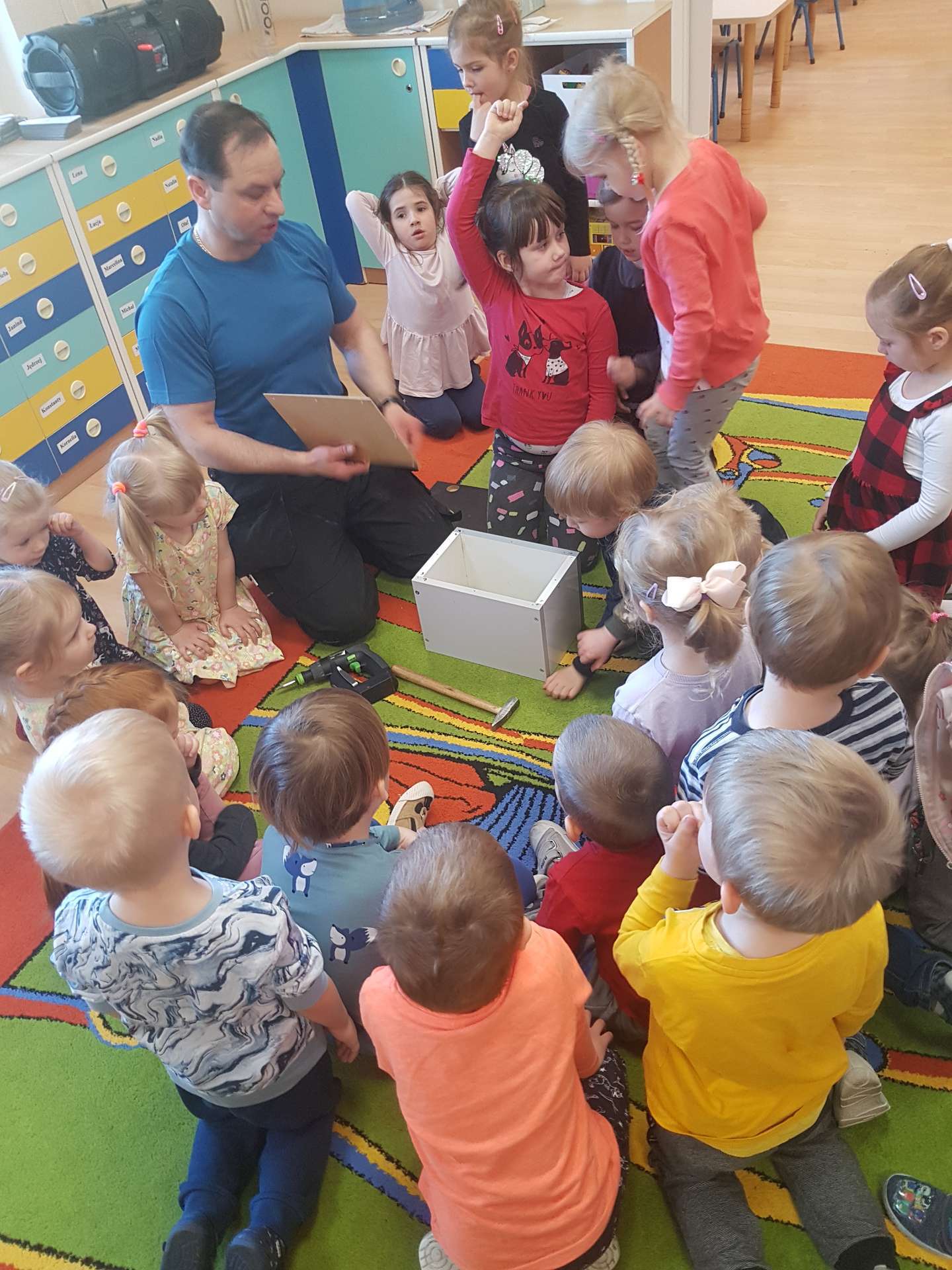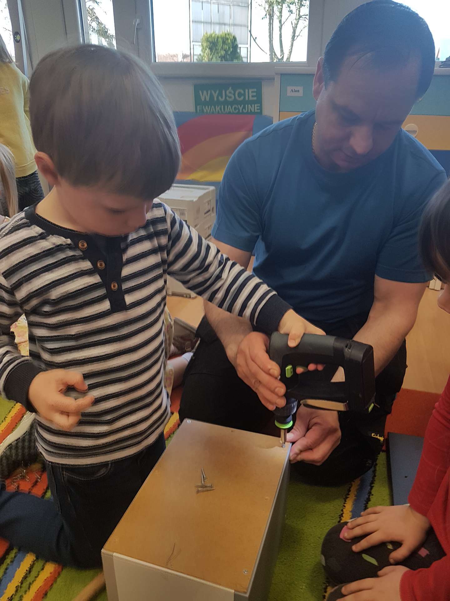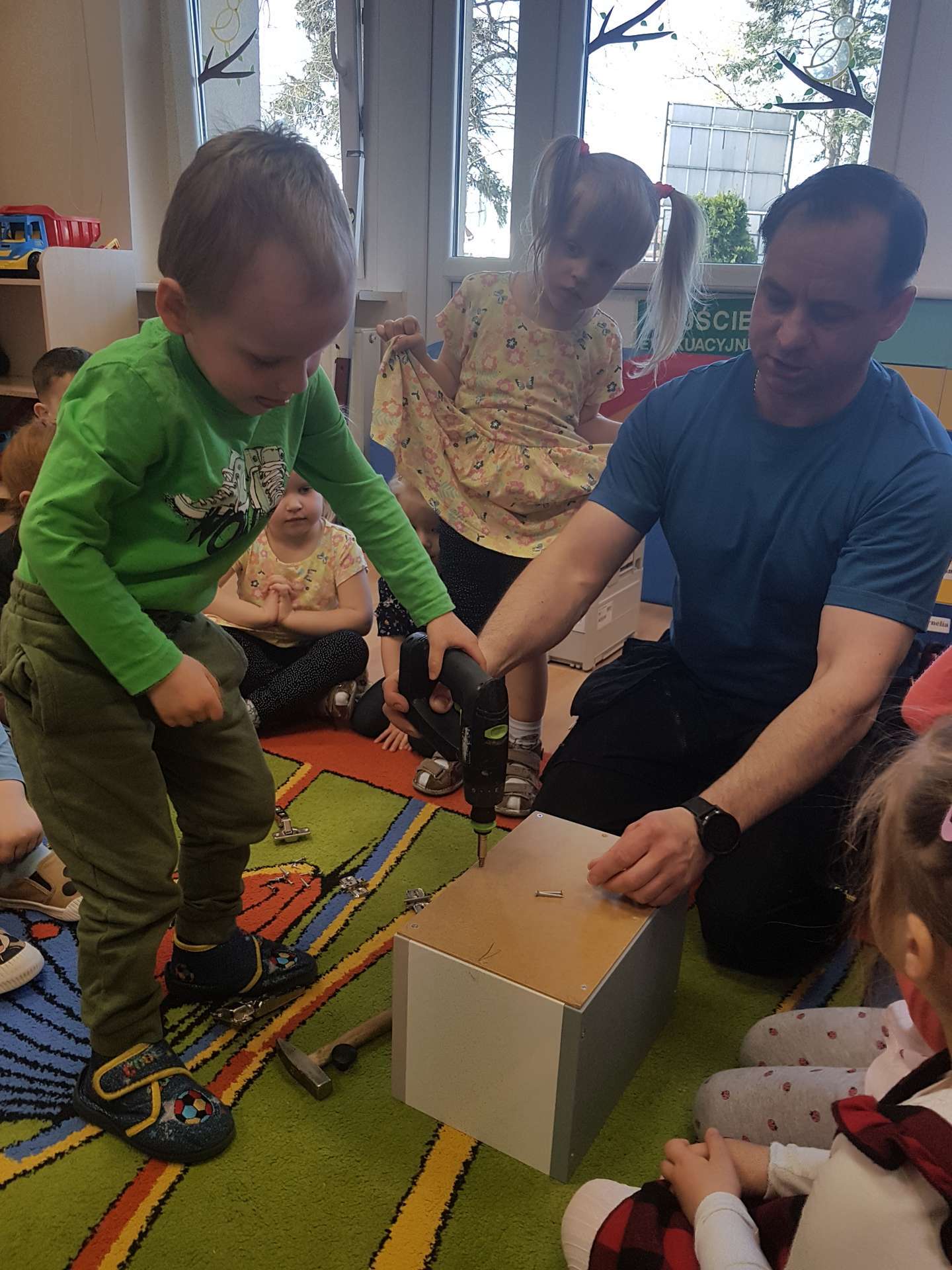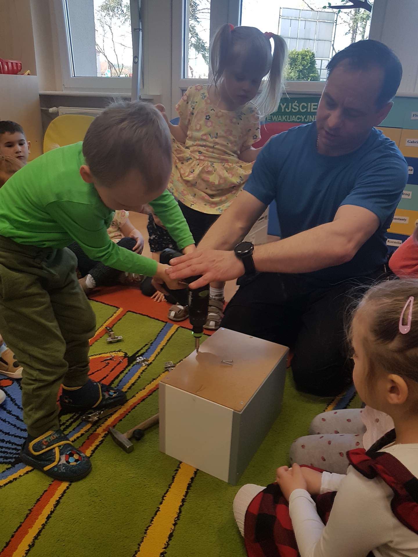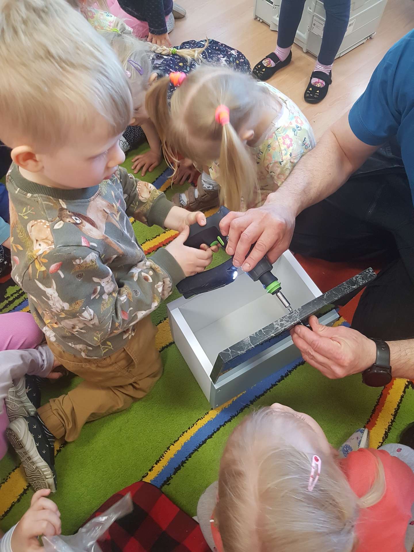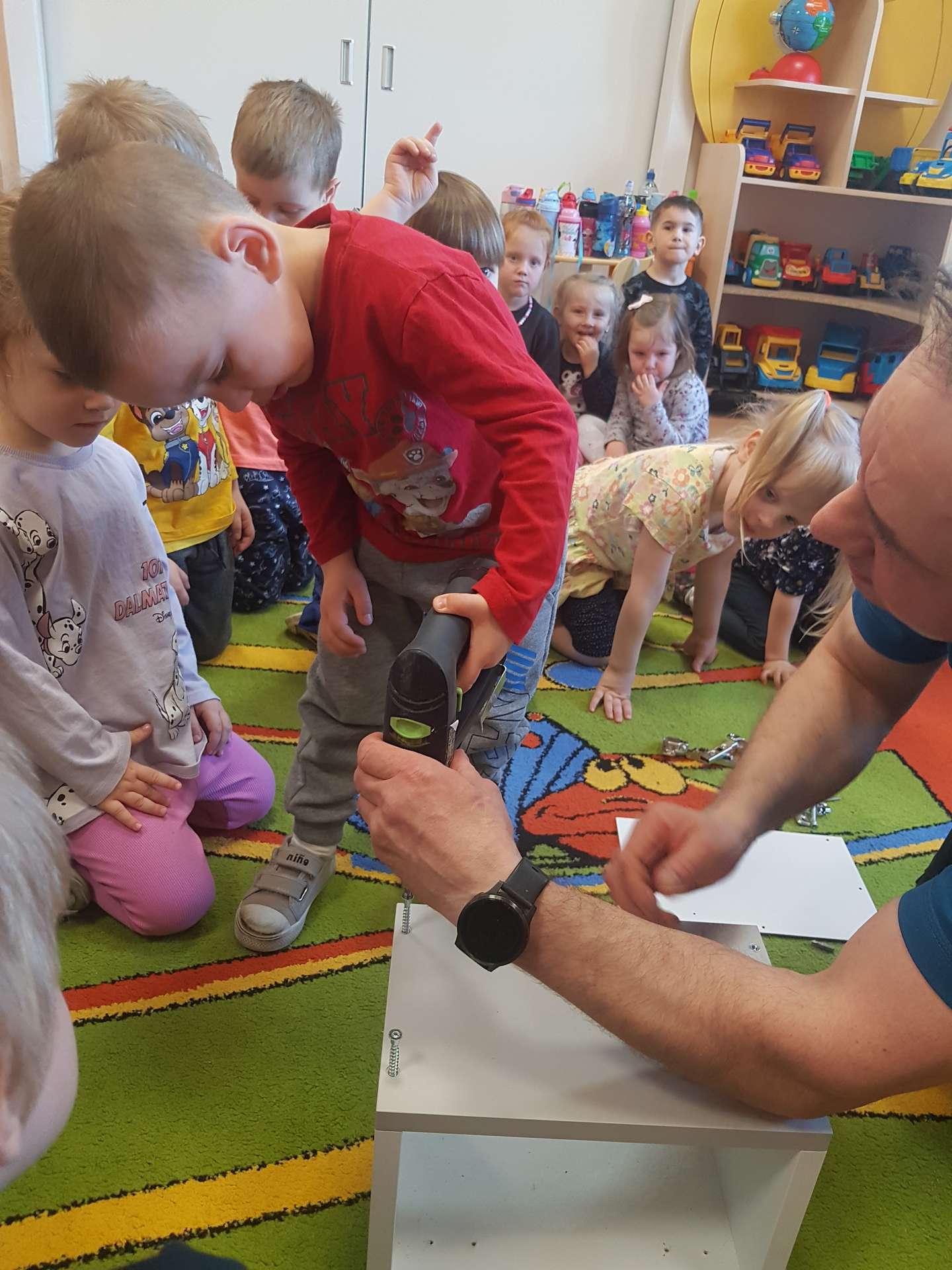 I kolejny gość w naszym przedszkolu w ramach cyklu zajęć "Poznajemy zawody". Tym razem dzieci najmłodsze poznały pracę stolarza. Pan Andrzej Lewandowski bardzo ciekawie opowiedział dzieciom, jak wygląda praca stolarza. Przedstawił narzędzia stolarskie, materiał, z jakiego wykonuje się meble, opowiedział o procesie powstawania różnych elementów stolarskich. Pokazał dzieciom także wzorniki kolorów płyt i drewna Zwrócił także uwagę na to, że stolarz musi być bardzo precyzyjny. Dużą frajdą dla dzieci było wspólne zbudowanie szafki na klocki. Przybijanie gwoździ i wkręcanie śrubek to nie tylko radość dla chłopców. Dziewczynki również chętnie wykonywały te czynności.