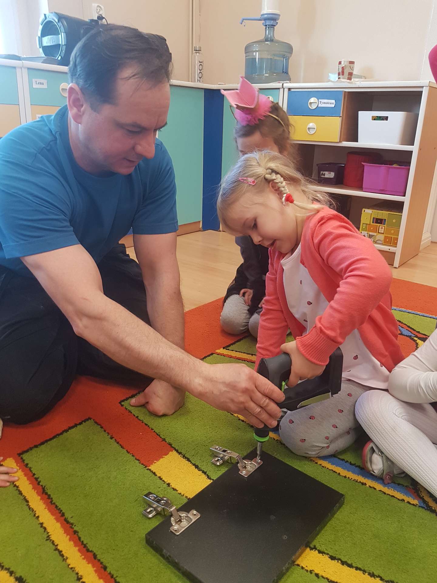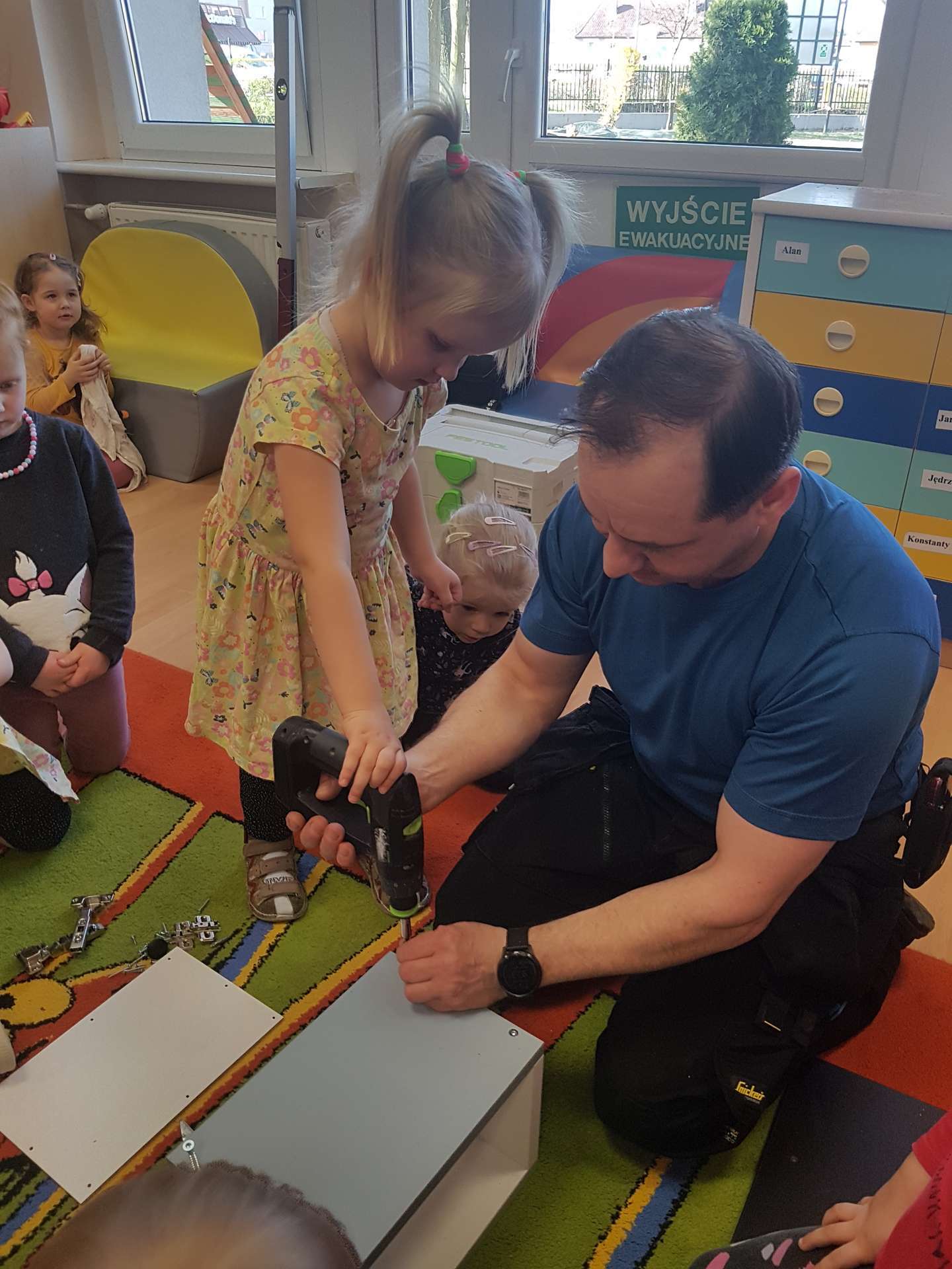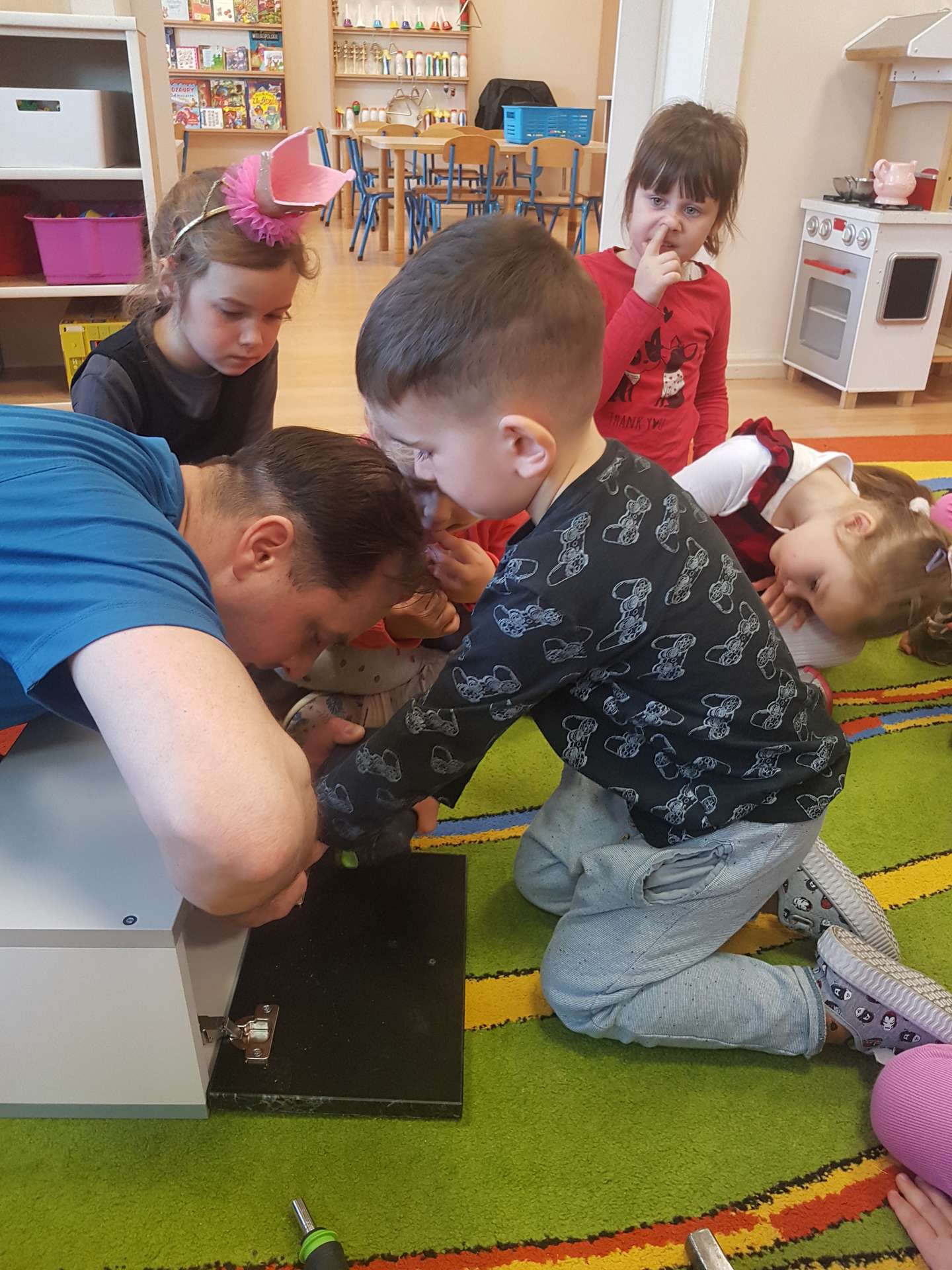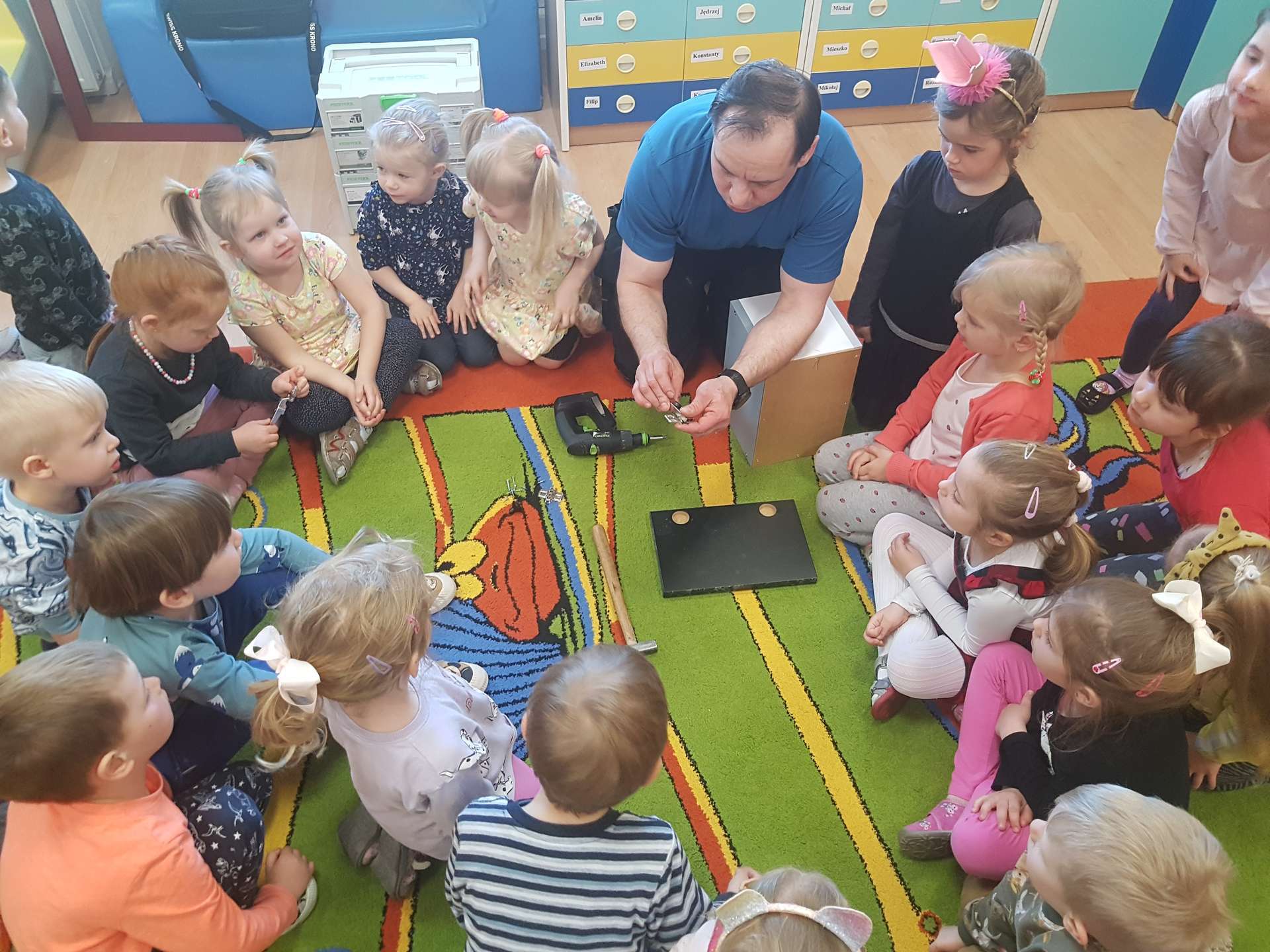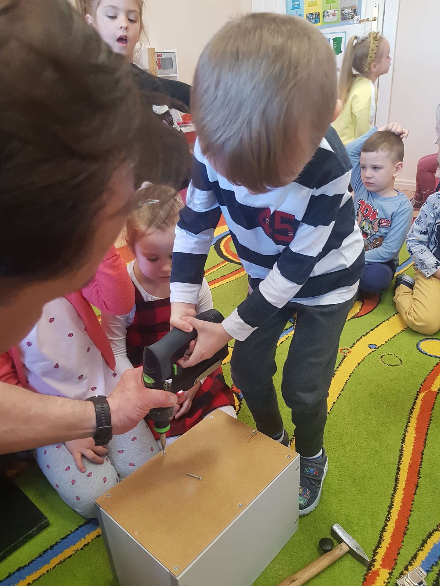I kolejny gość w naszym przedszkolu w ramach cyklu zajęć "Poznajemy zawody". Tym razem dzieci najmłodsze poznały pracę stolarza. Pan Andrzej Lewandowski bardzo ciekawie opowiedział dzieciom, jak wygląda praca stolarza. Przedstawił narzędzia stolarskie, materiał, z jakiego wykonuje się meble, opowiedział o procesie powstawania różnych elementów stolarskich. Pokazał dzieciom także wzorniki kolorów płyt i drewna Zwrócił także uwagę na to, że stolarz musi być bardzo precyzyjny. Dużą frajdą dla dzieci było wspólne zbudowanie szafki na klocki. Przybijanie gwoździ i wkręcanie śrubek to nie tylko radość dla chłopców. Dziewczynki również chętnie wykonywały te czynności.