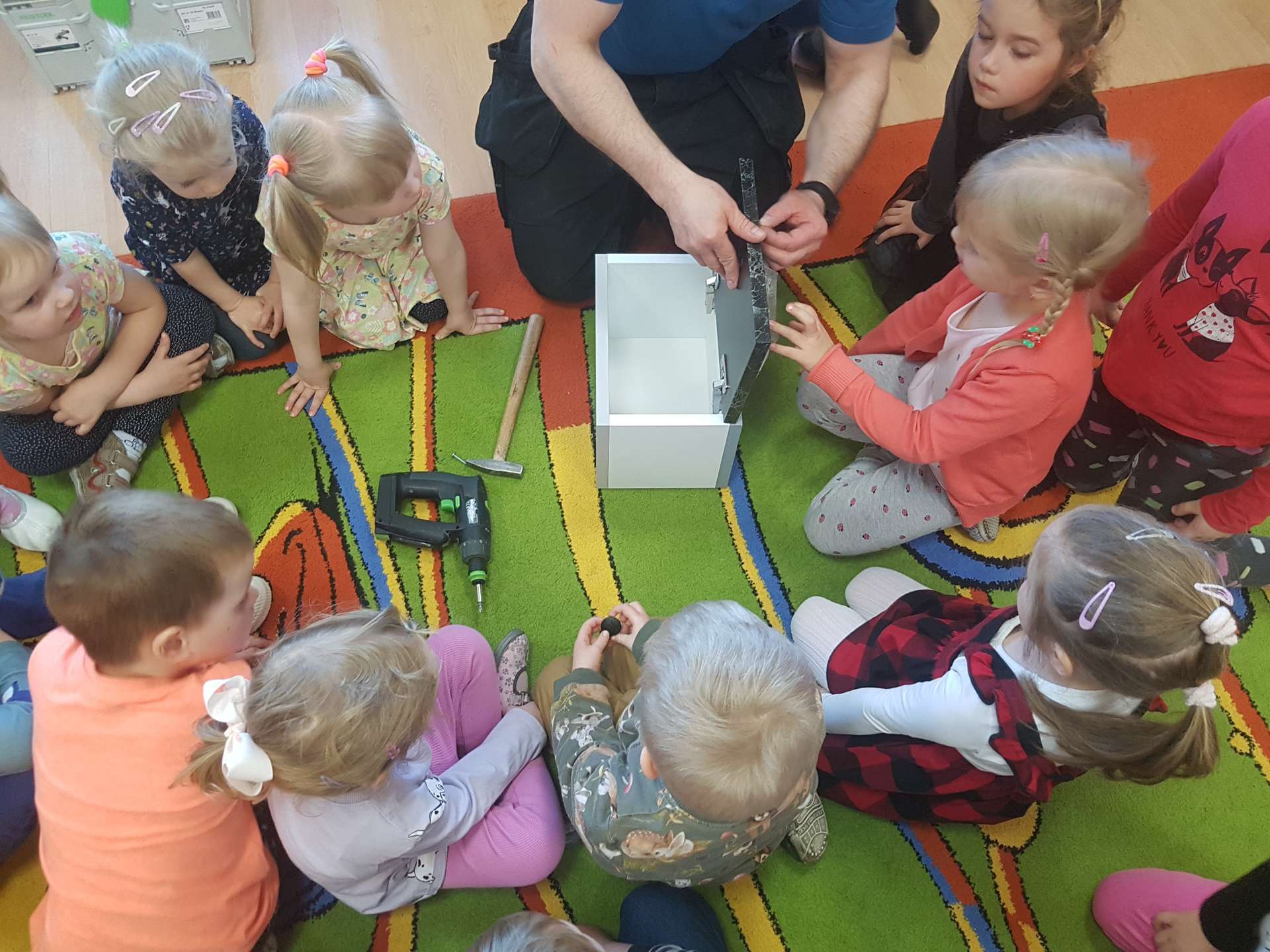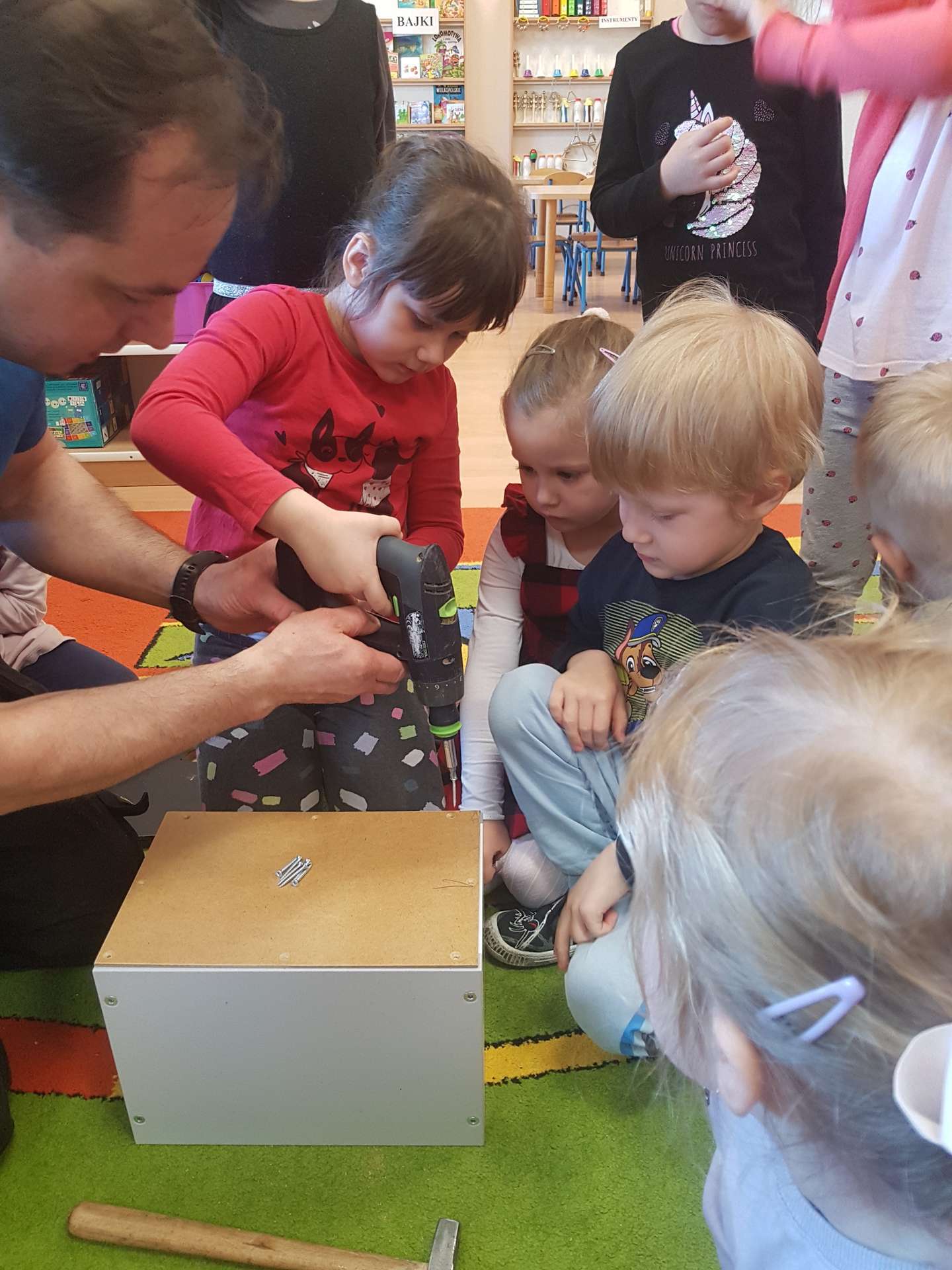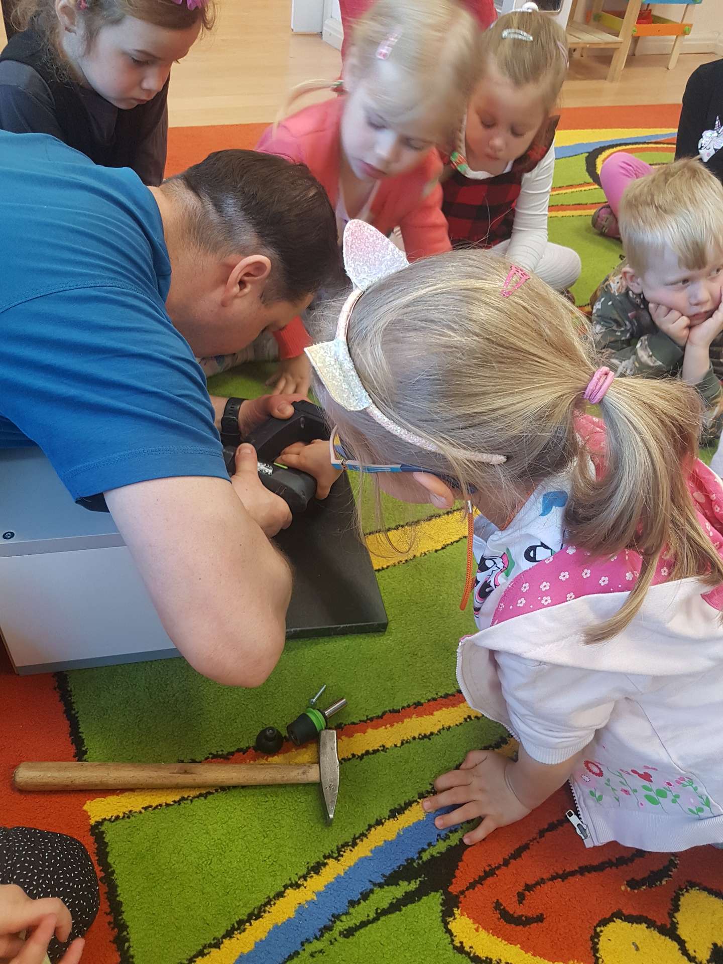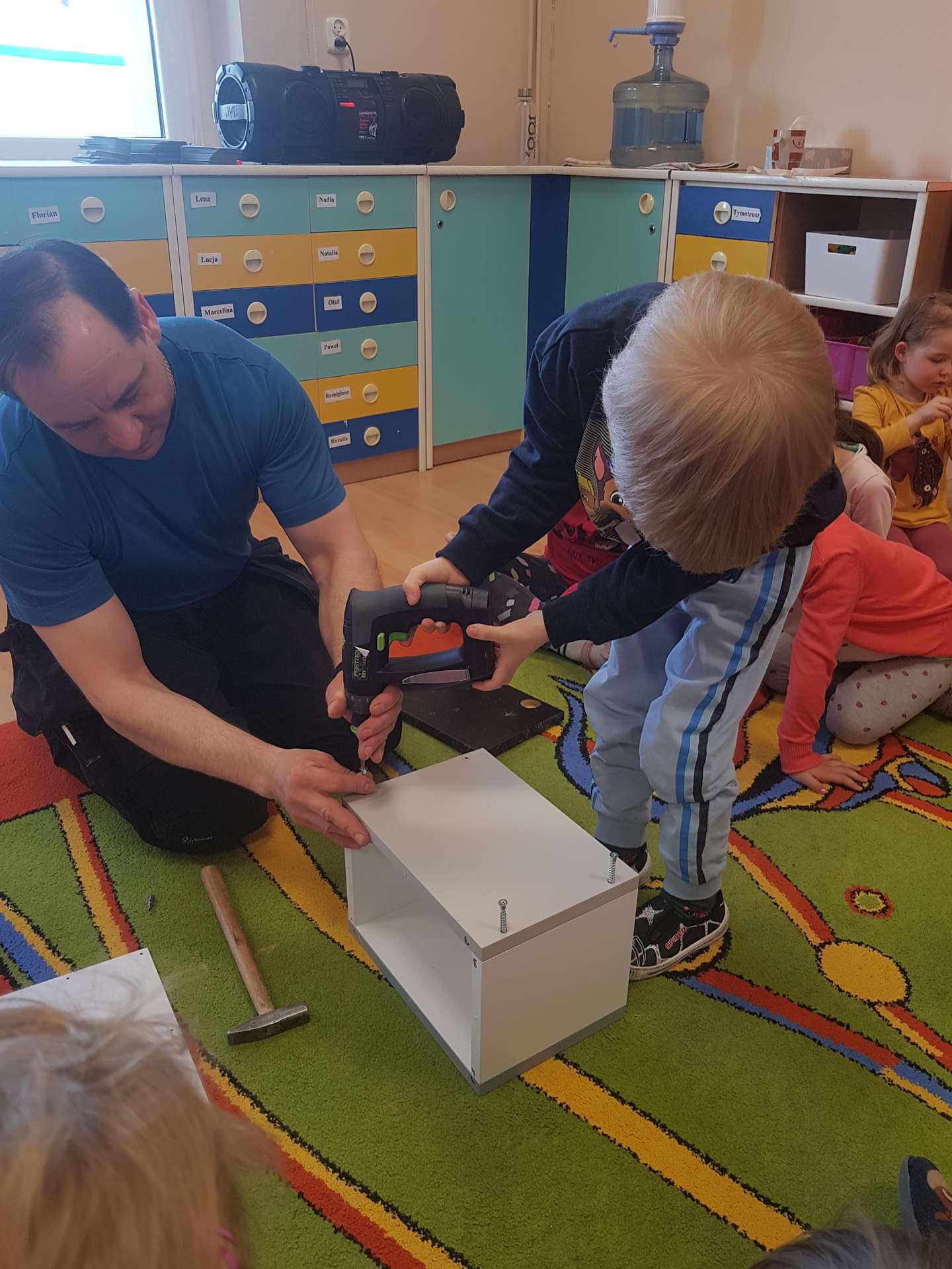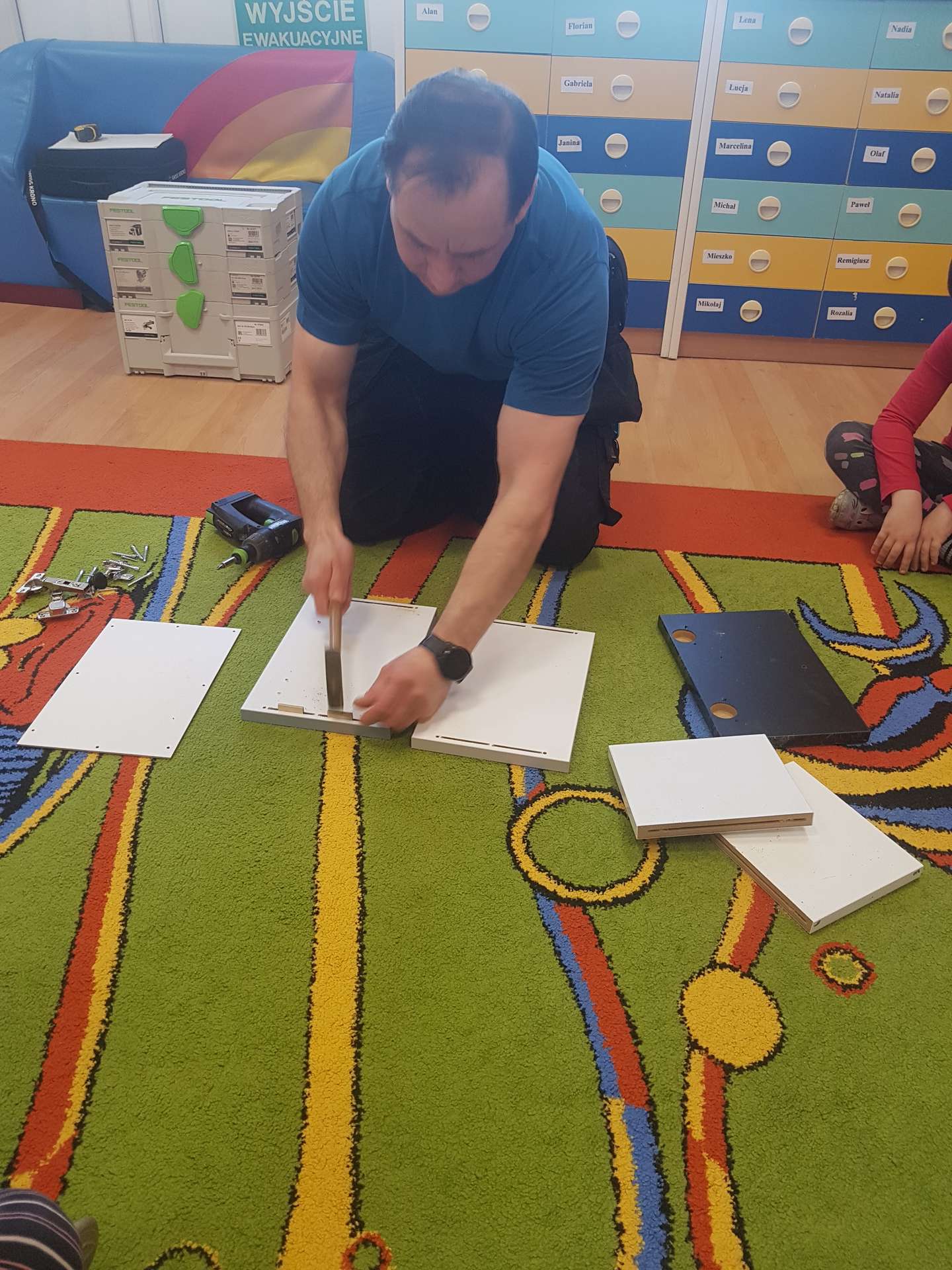 I kolejny gość w naszym przedszkolu w ramach cyklu zajęć "Poznajemy zawody". Tym razem dzieci najmłodsze poznały pracę stolarza. Pan Andrzej Lewandowski bardzo ciekawie opowiedział dzieciom, jak wygląda praca stolarza. Przedstawił narzędzia stolarskie, materiał, z jakiego wykonuje się meble, opowiedział o procesie powstawania różnych elementów stolarskich. Pokazał dzieciom także wzorniki kolorów płyt i drewna Zwrócił także uwagę na to, że stolarz musi być bardzo precyzyjny. Dużą frajdą dla dzieci było wspólne zbudowanie szafki na klocki. Przybijanie gwoździ i wkręcanie śrubek to nie tylko radość dla chłopców. Dziewczynki również chętnie wykonywały te czynności.