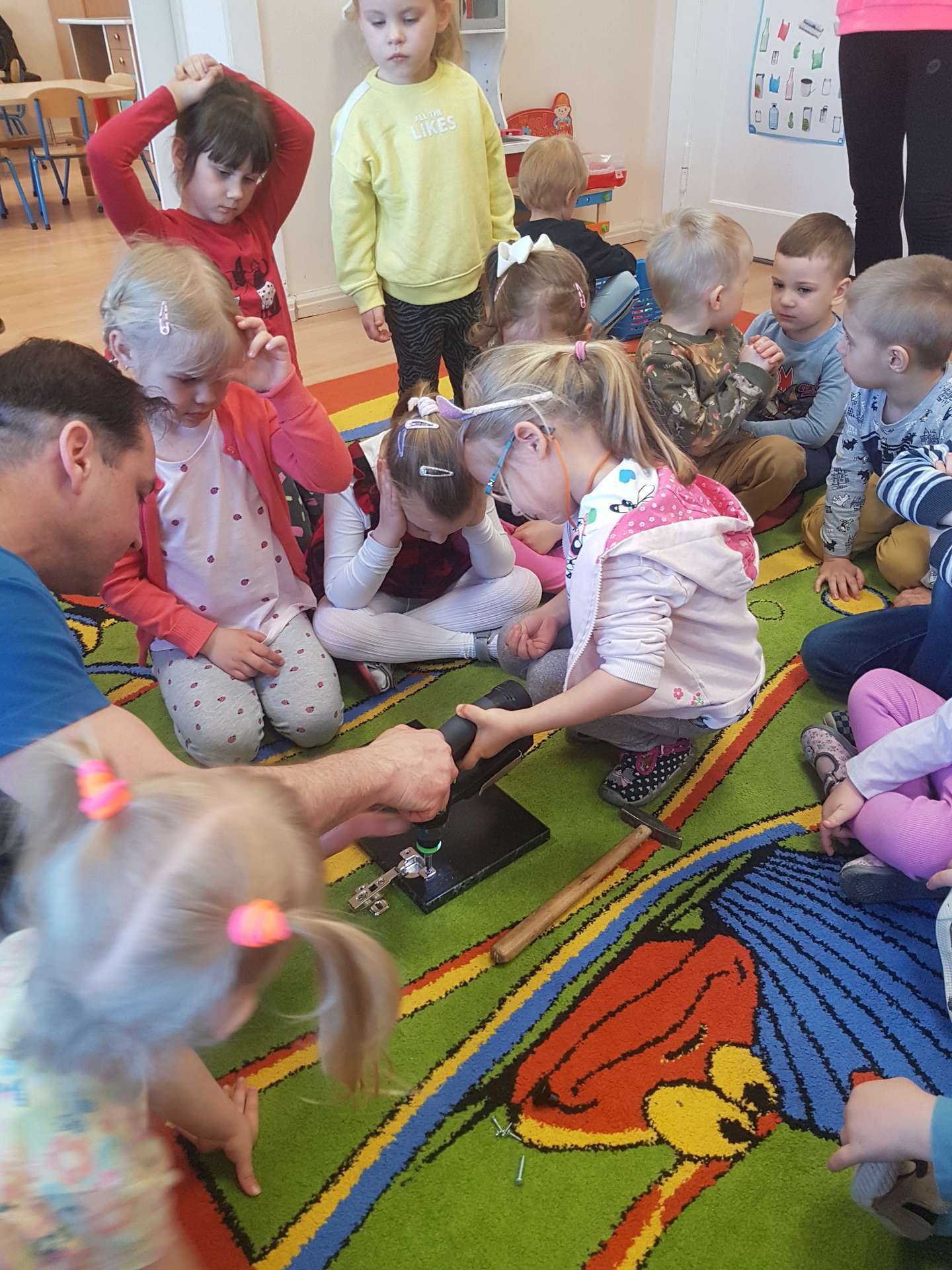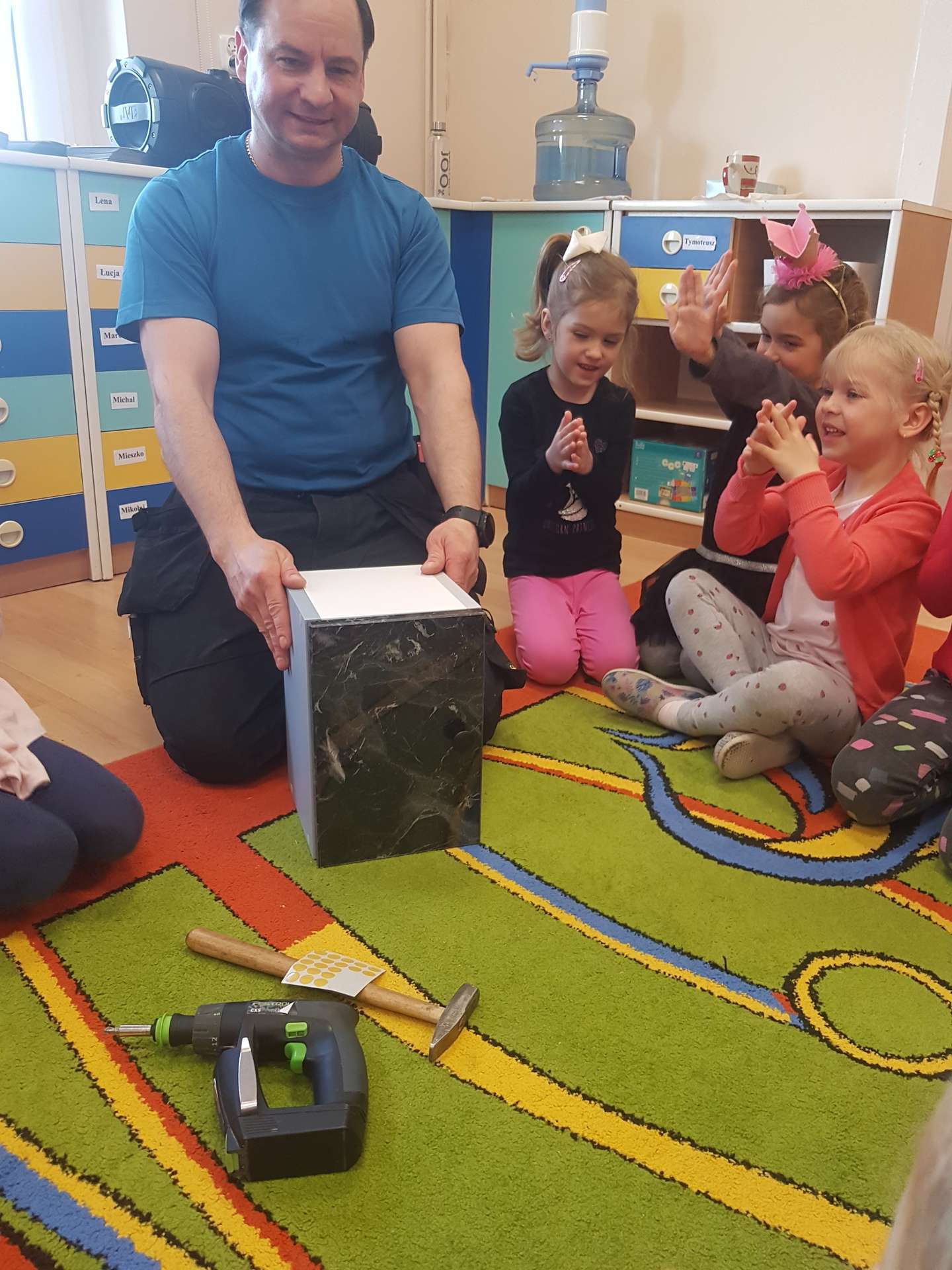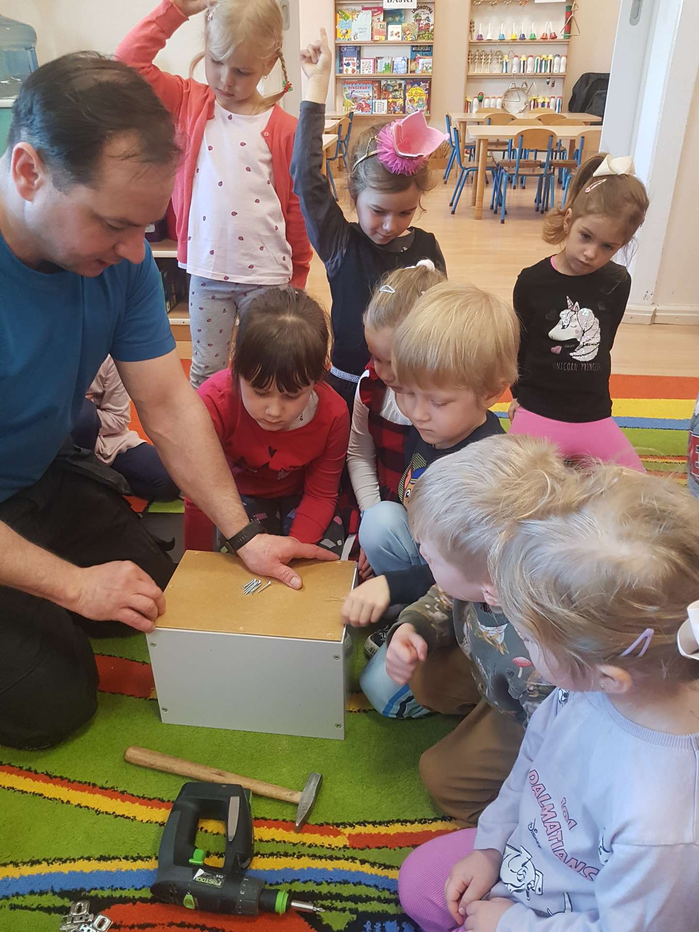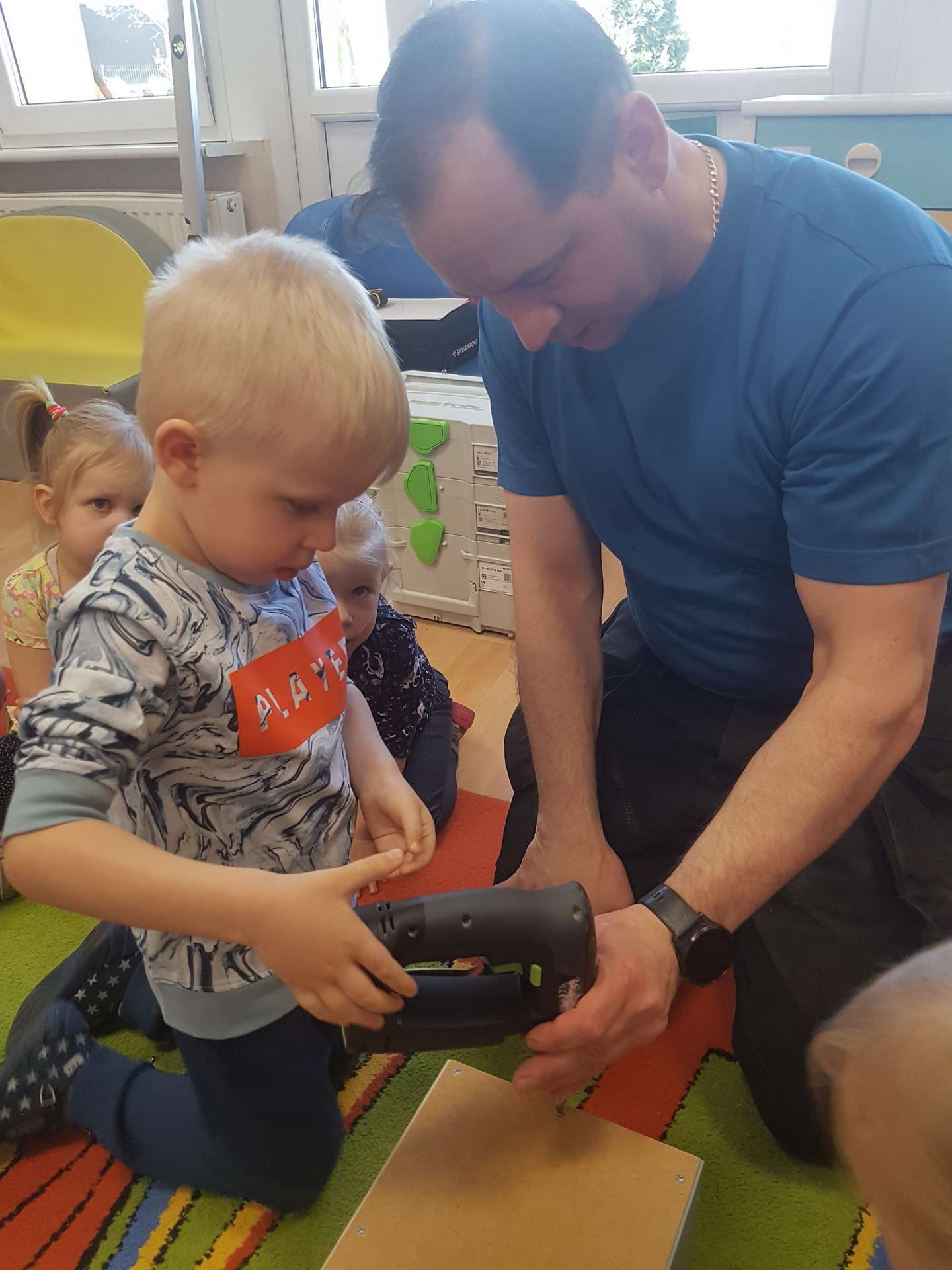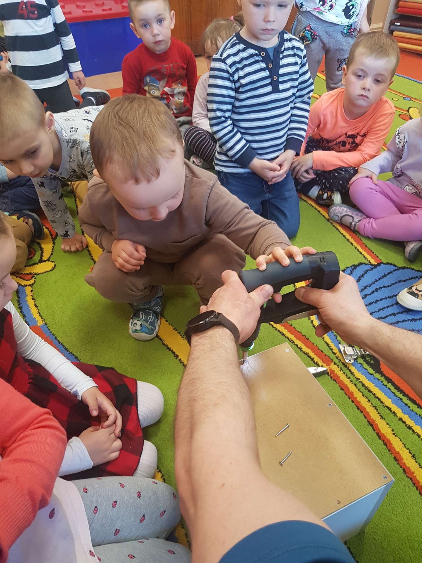 I kolejny gość w naszym przedszkolu w ramach cyklu zajęć "Poznajemy zawody". Tym razem dzieci najmłodsze poznały pracę stolarza. Pan Andrzej Lewandowski bardzo ciekawie opowiedział dzieciom, jak wygląda praca stolarza. Przedstawił narzędzia stolarskie, materiał, z jakiego wykonuje się meble, opowiedział o procesie powstawania różnych elementów stolarskich. Pokazał dzieciom także wzorniki kolorów płyt i drewna Zwrócił także uwagę na to, że stolarz musi być bardzo precyzyjny. Dużą frajdą dla dzieci było wspólne zbudowanie szafki na klocki. Przybijanie gwoździ i wkręcanie śrubek to nie tylko radość dla chłopców. Dziewczynki również chętnie wykonywały te czynności.