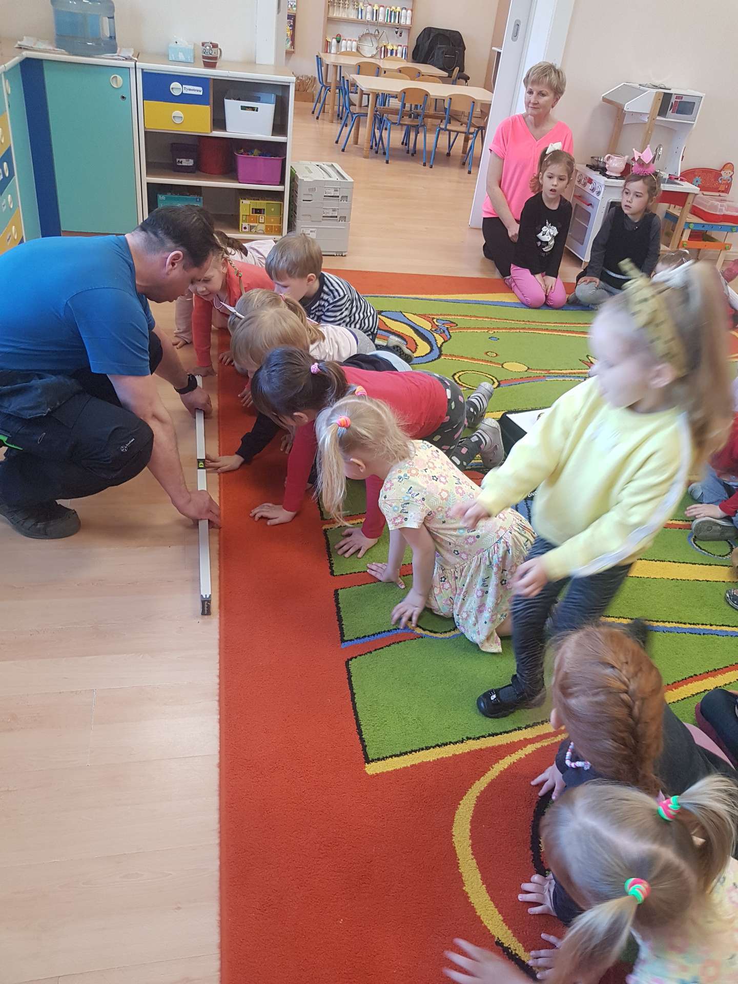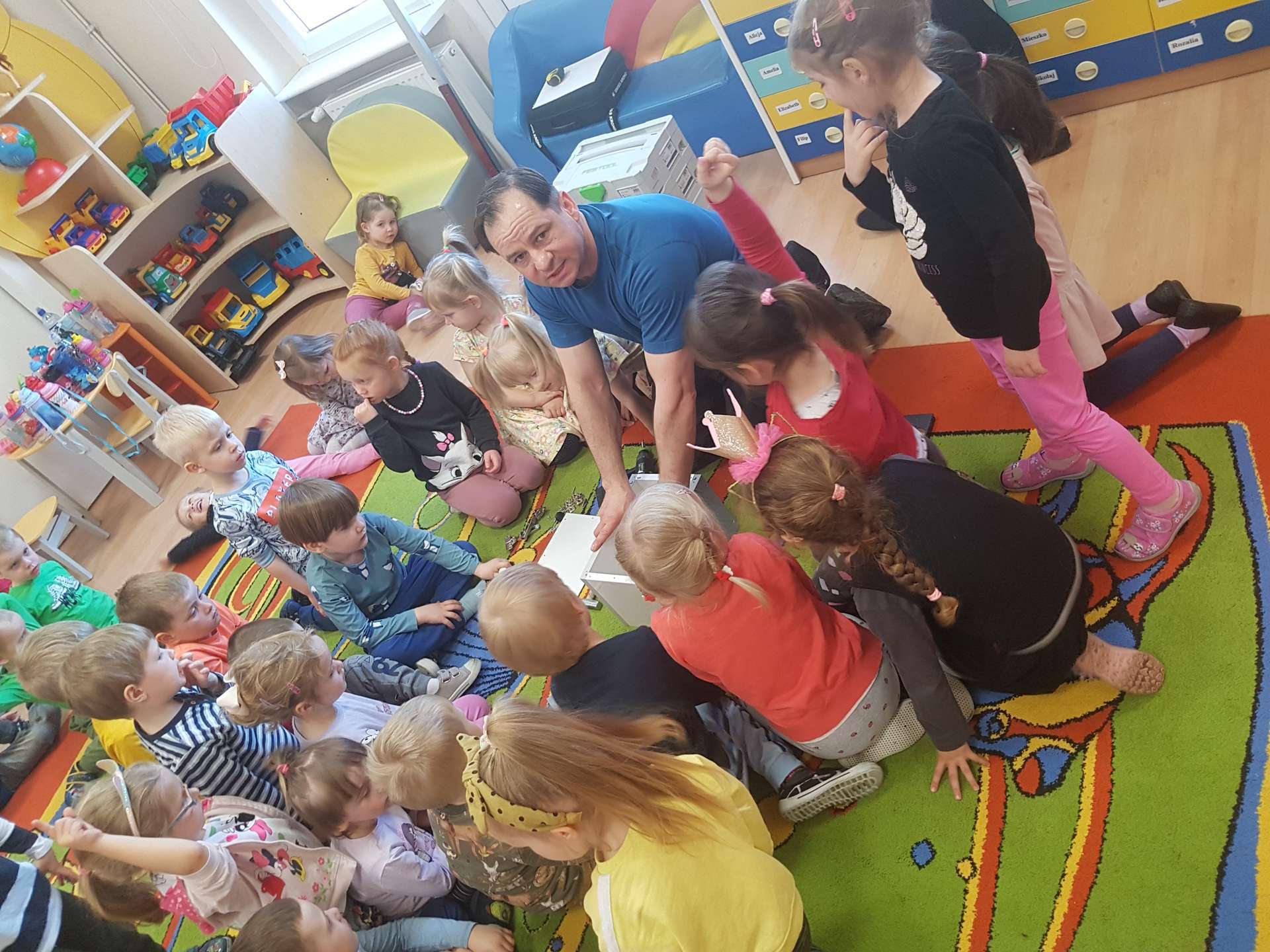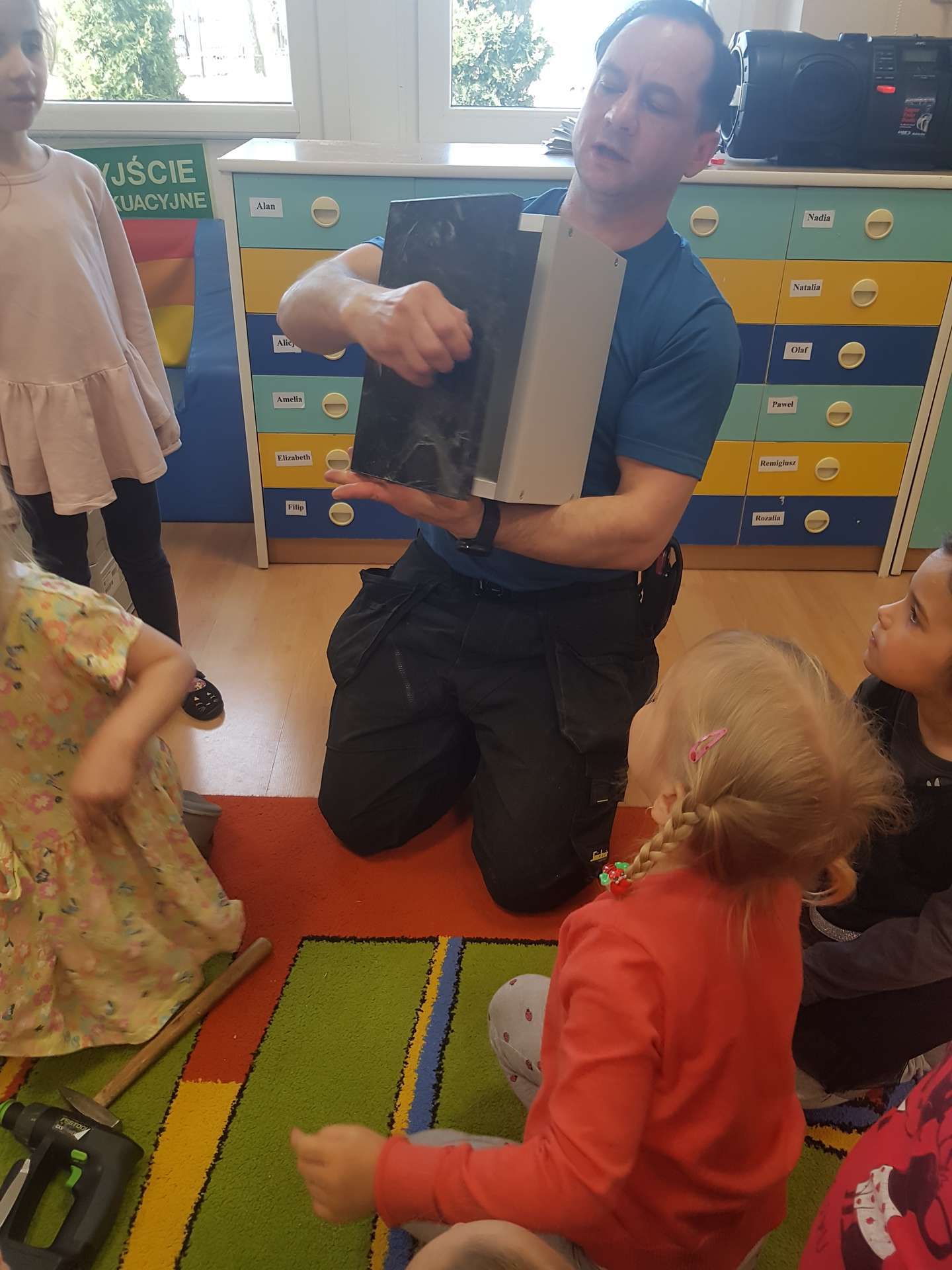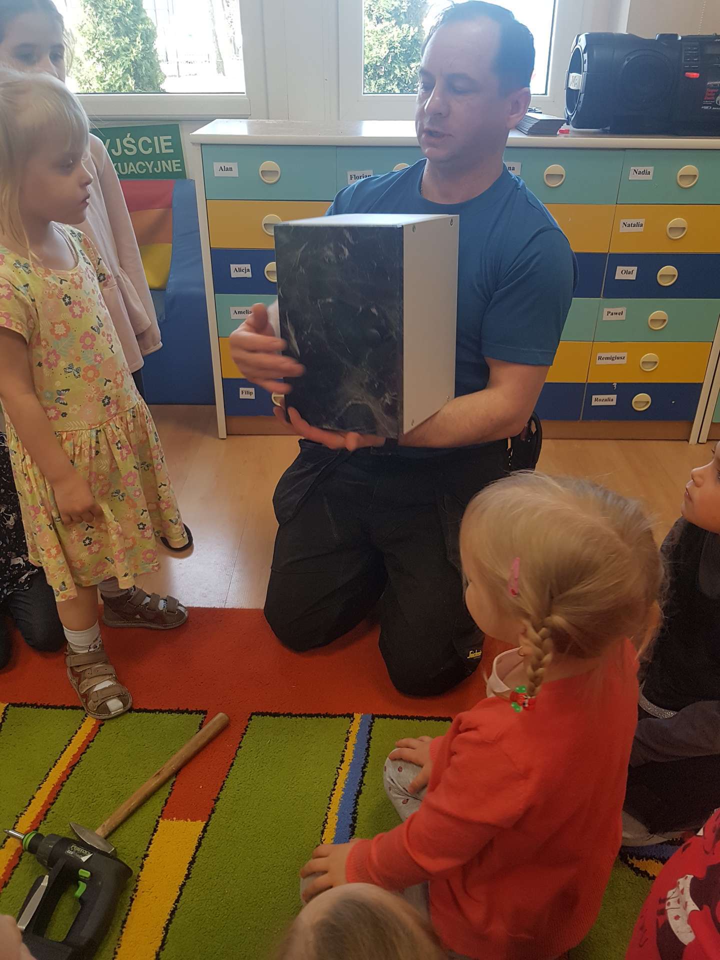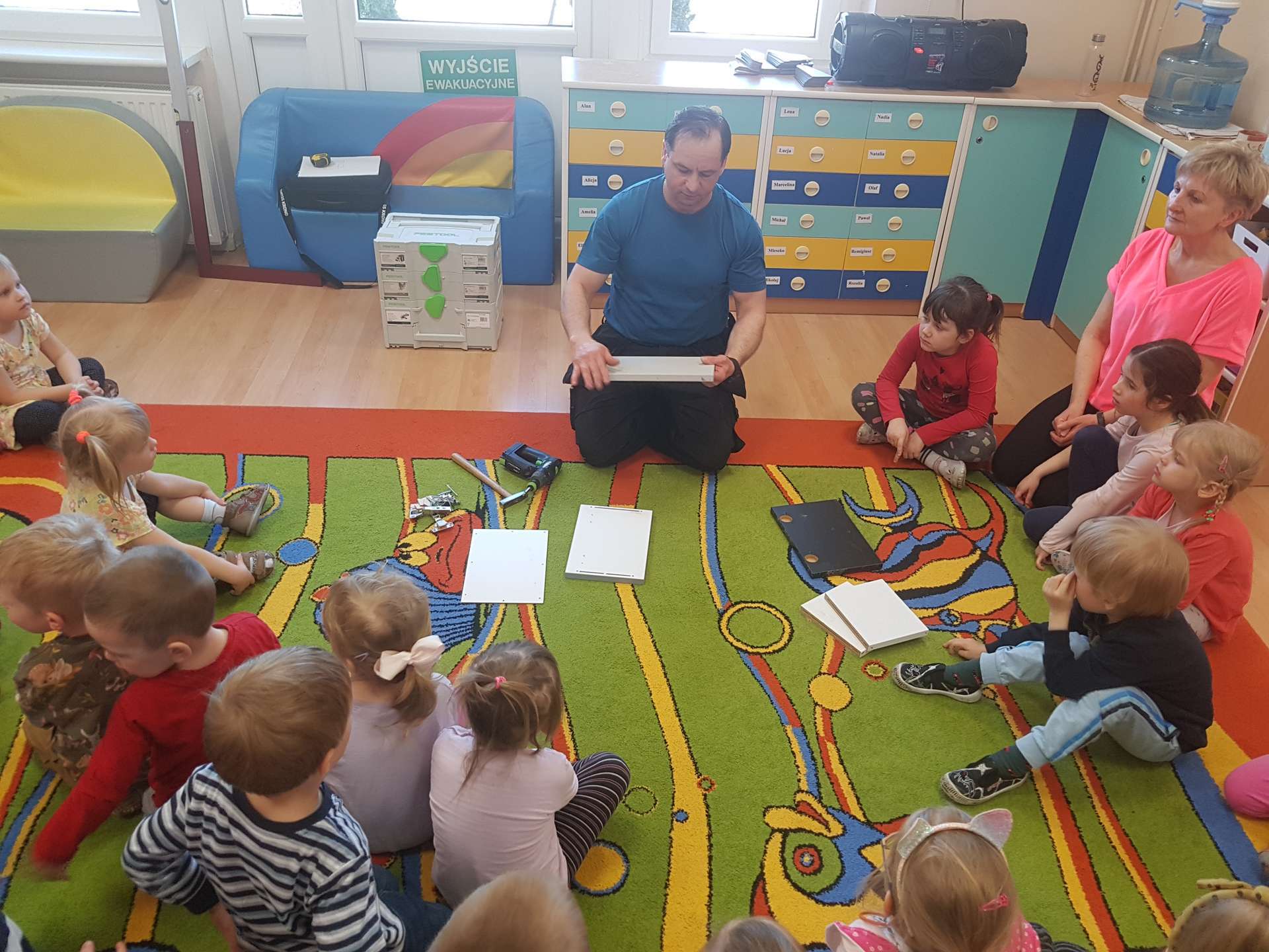 I kolejny gość w naszym przedszkolu w ramach cyklu zajęć "Poznajemy zawody". Tym razem dzieci najmłodsze poznały pracę stolarza. Pan Andrzej Lewandowski bardzo ciekawie opowiedział dzieciom, jak wygląda praca stolarza. Przedstawił narzędzia stolarskie, materiał, z jakiego wykonuje się meble, opowiedział o procesie powstawania różnych elementów stolarskich. Pokazał dzieciom także wzorniki kolorów płyt i drewna Zwrócił także uwagę na to, że stolarz musi być bardzo precyzyjny. Dużą frajdą dla dzieci było wspólne zbudowanie szafki na klocki. Przybijanie gwoździ i wkręcanie śrubek to nie tylko radość dla chłopców. Dziewczynki również chętnie wykonywały te czynności.