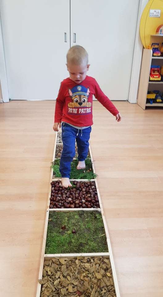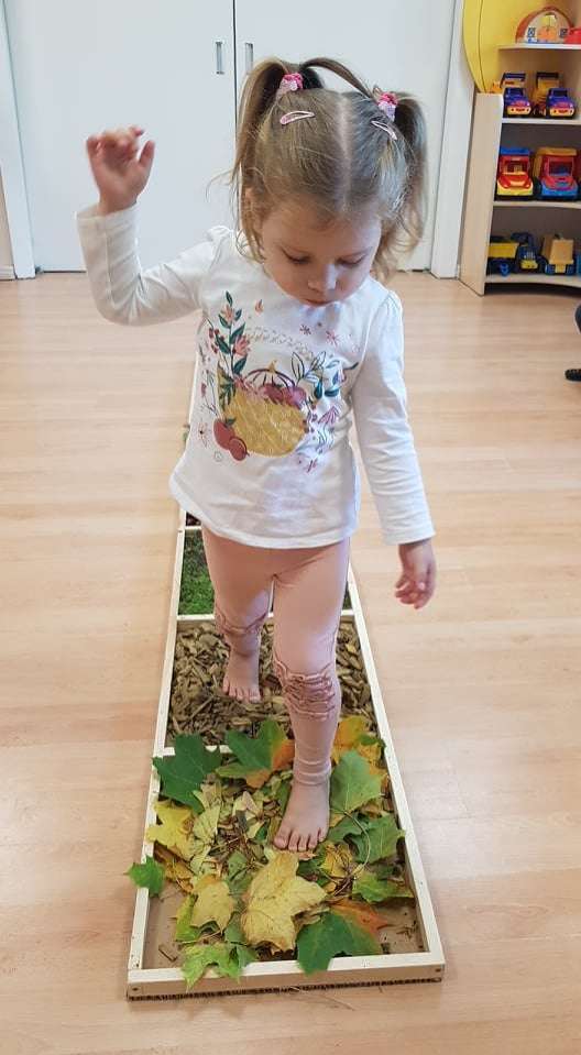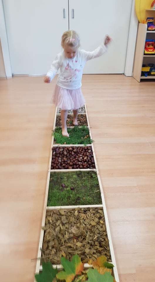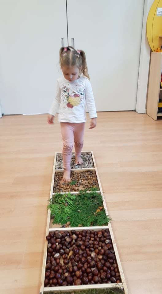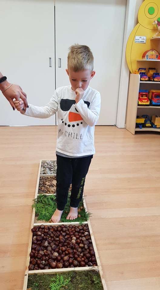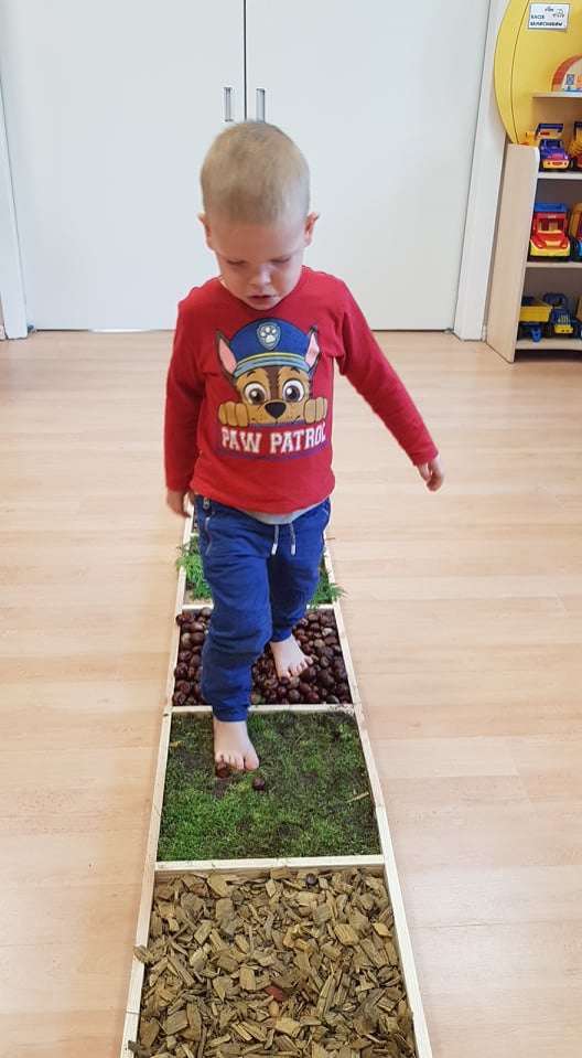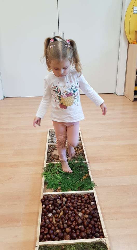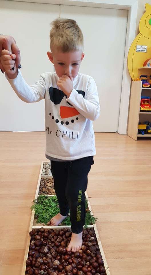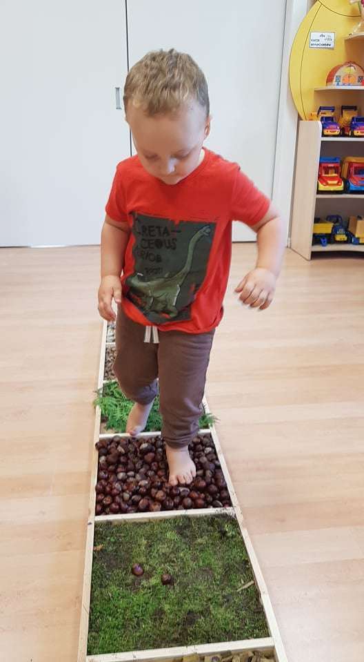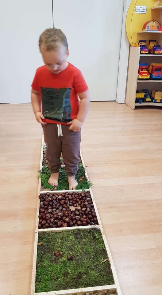 Ciekawym doświadczeniem było przechodzenie „na bosaka” po zgromadzonych jesiennych skarbach. Dzieci z przyjemnością stąpały po mięciutkim jak poduszka mchu, kamieniach, ale też po zimnych kasztanach, szorstkiej korze, kłujących szyszkach, twardych żołędziach i jesiennych liściach. W ten przyjemny sposób poprawialiśmy koncentrację i rozwijaliśmy naszą motorykę.
