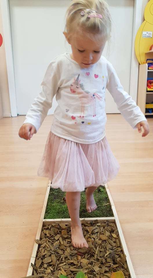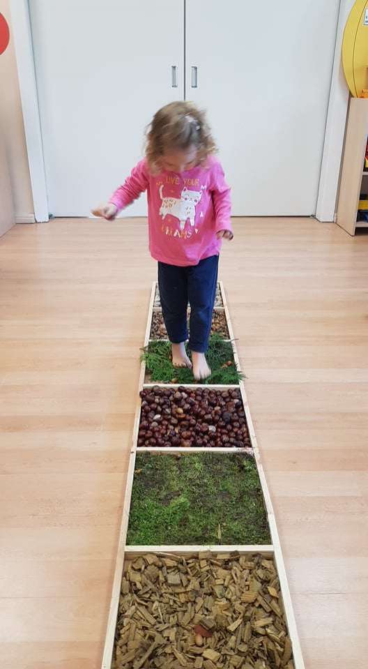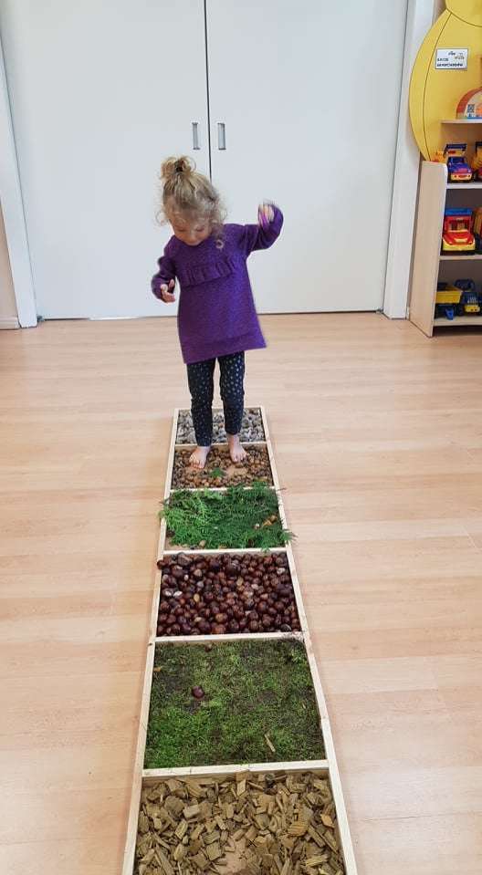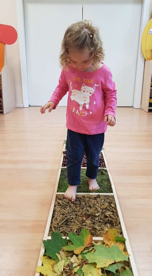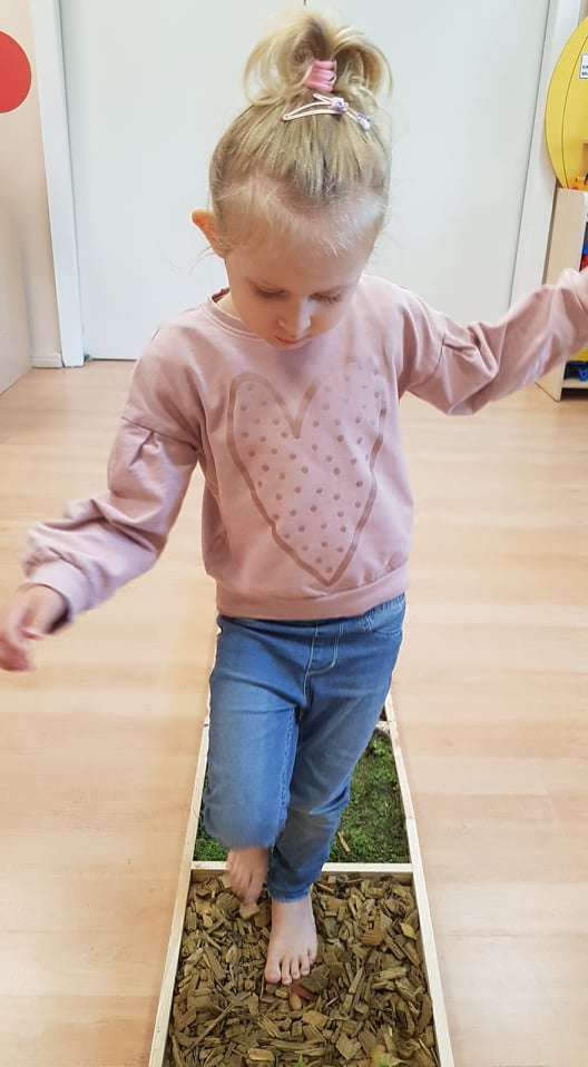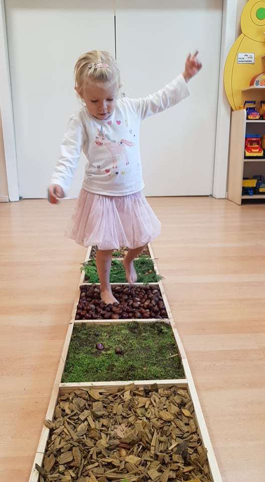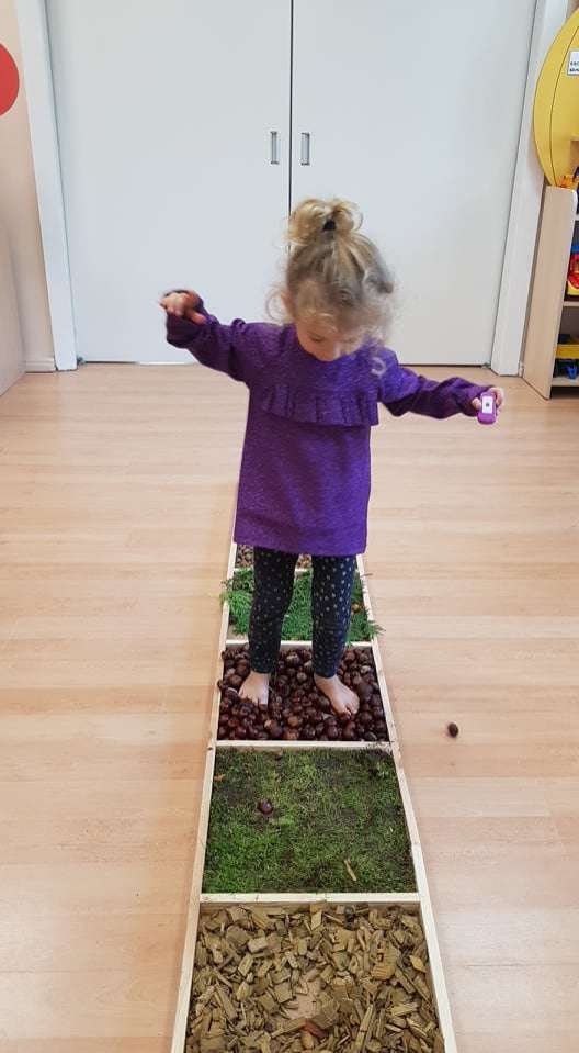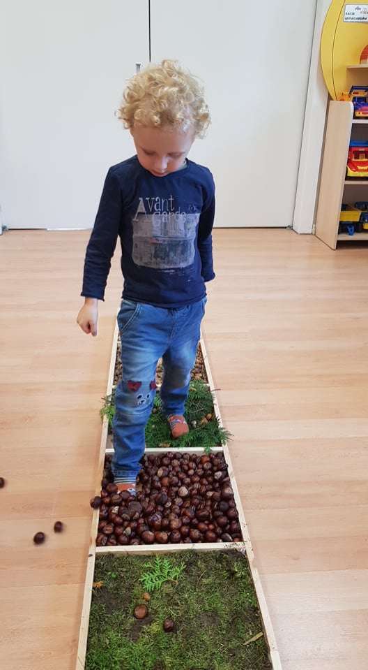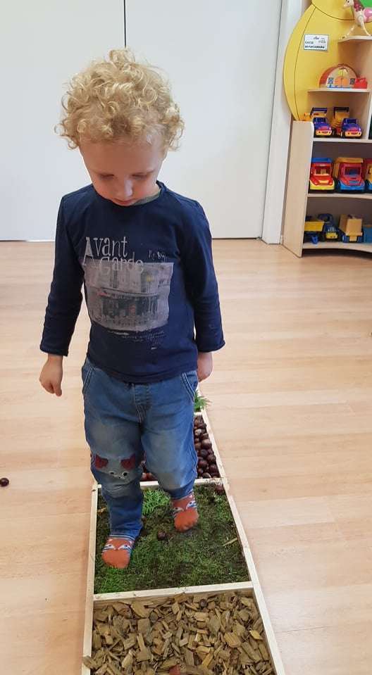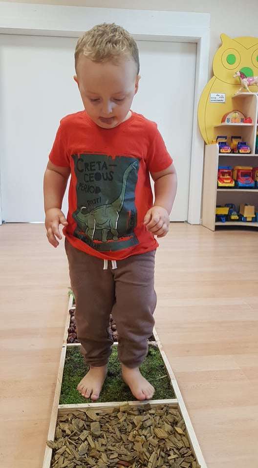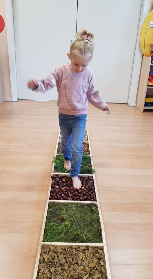 Ciekawym doświadczeniem było przechodzenie „na bosaka” po zgromadzonych jesiennych skarbach. Dzieci z przyjemnością stąpały po mięciutkim jak poduszka mchu, kamieniach, ale też po zimnych kasztanach, szorstkiej korze, kłujących szyszkach, twardych żołędziach i jesiennych liściach. W ten przyjemny sposób poprawialiśmy koncentrację i rozwijaliśmy naszą motorykę.