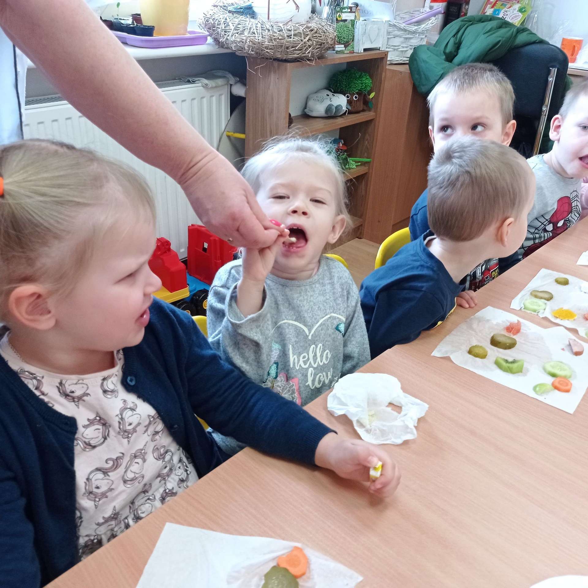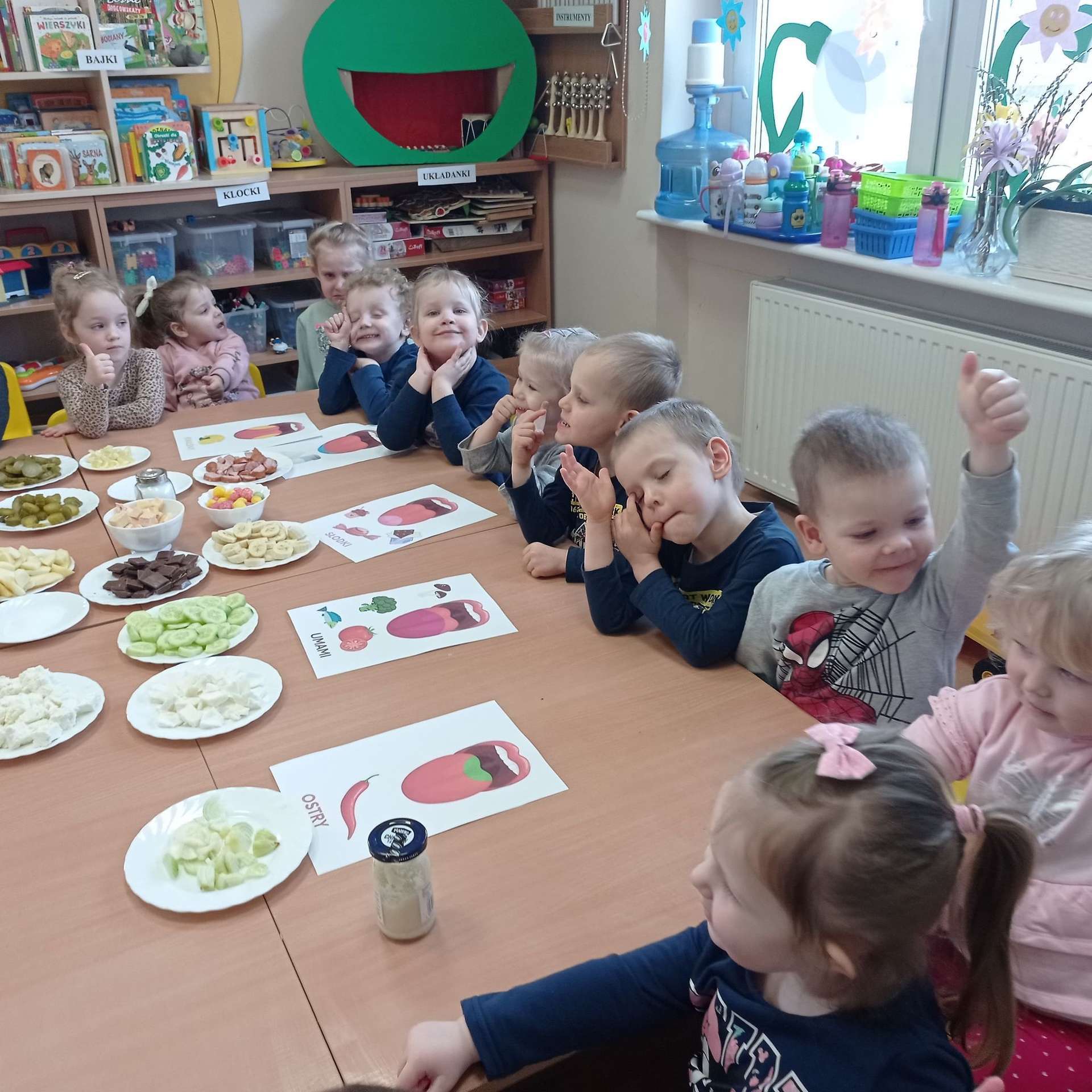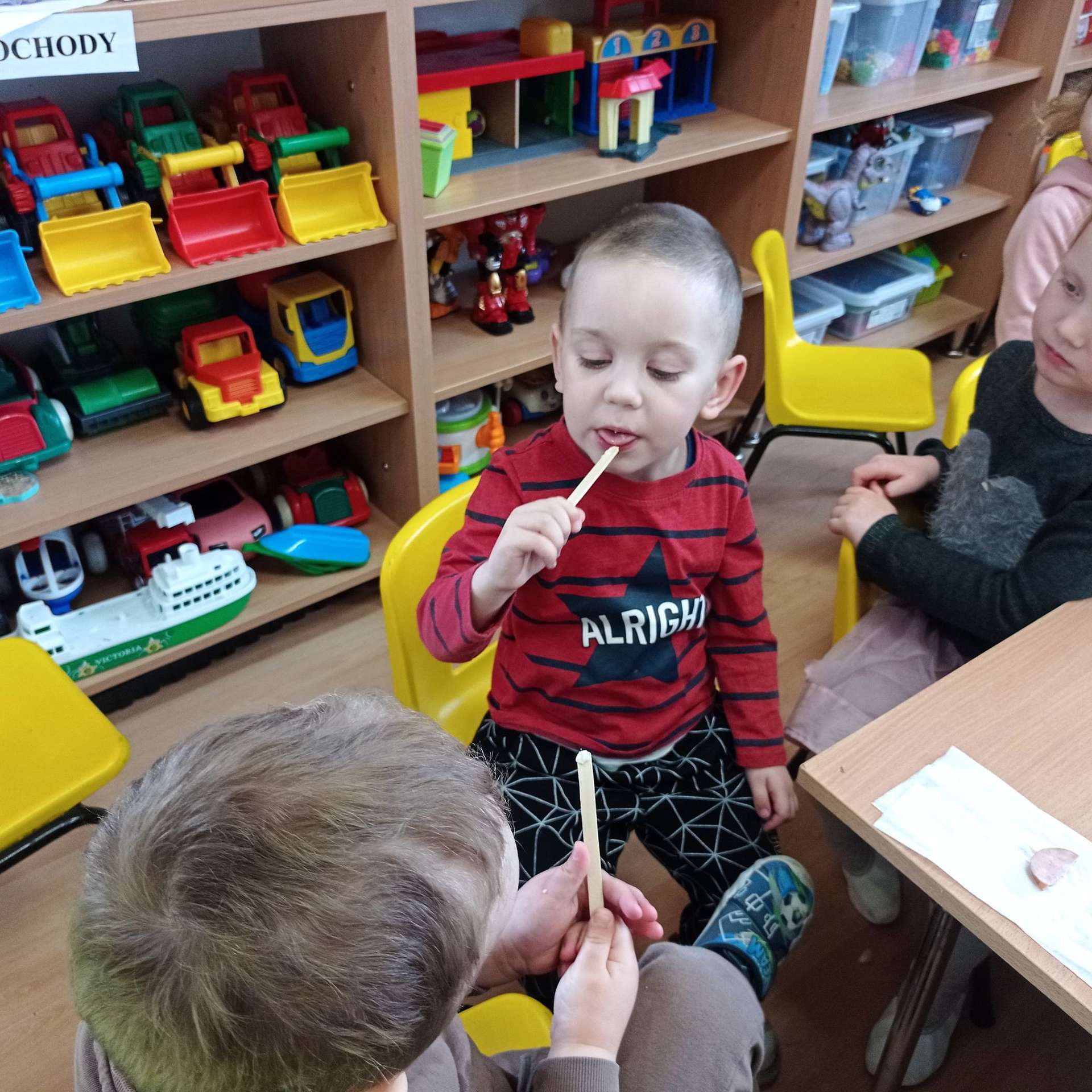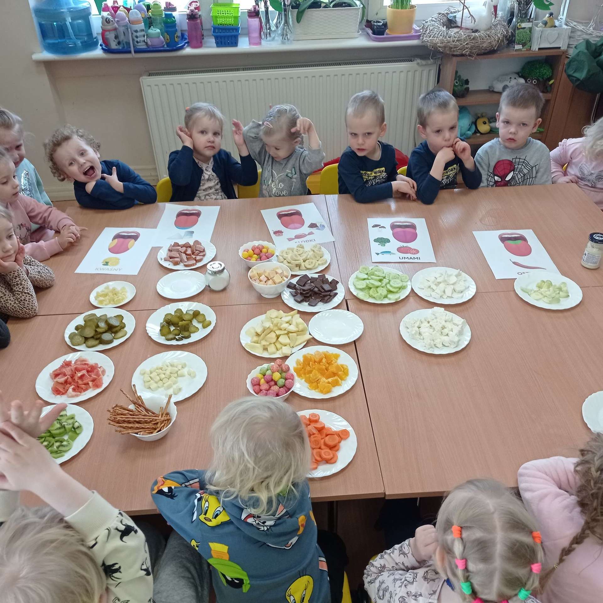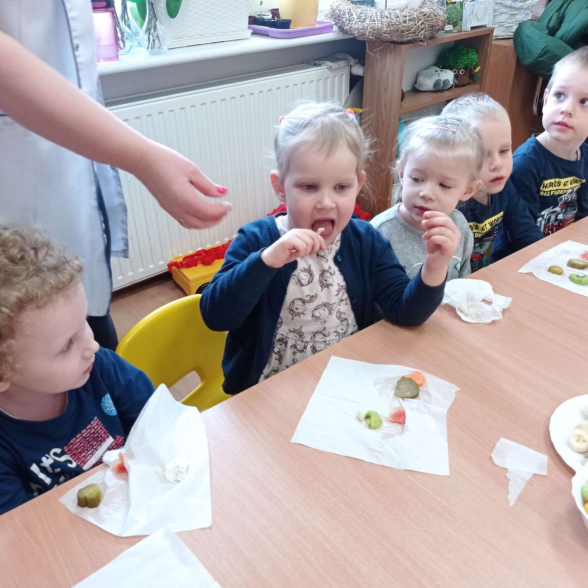Przed kolejnym zadaniem stanęły "Żabki", w tym miesiącu poznały kolejny zmysł, tym razem był to smak. Dzieci na początku dowiedziały się jak to się dzieje, że czujemy smaki. Przedszkolaki obejrzały krótki film oraz patrząc w lusterka poznawały swój język, towarzyszyły tym zajęciom również zabawy ruchowe. Na koniec "Żabki" próbowały wielu przysmaków. Było kilkoro dzieci które wykazały się odwagą próbując chrzan oraz cebulę. Miny dzisiaj były różne :-) takie po cytrynie i po czekoladzie.