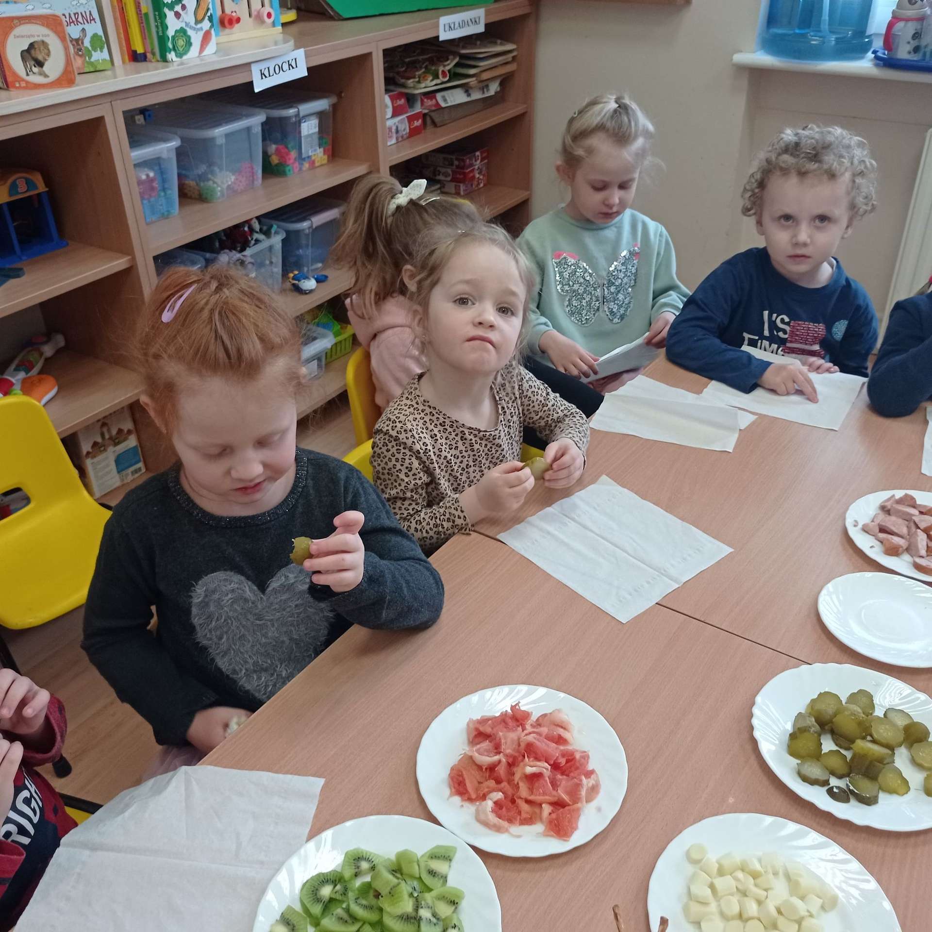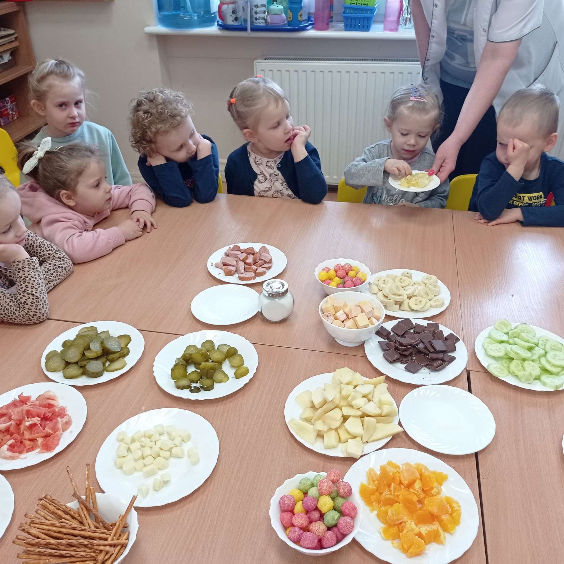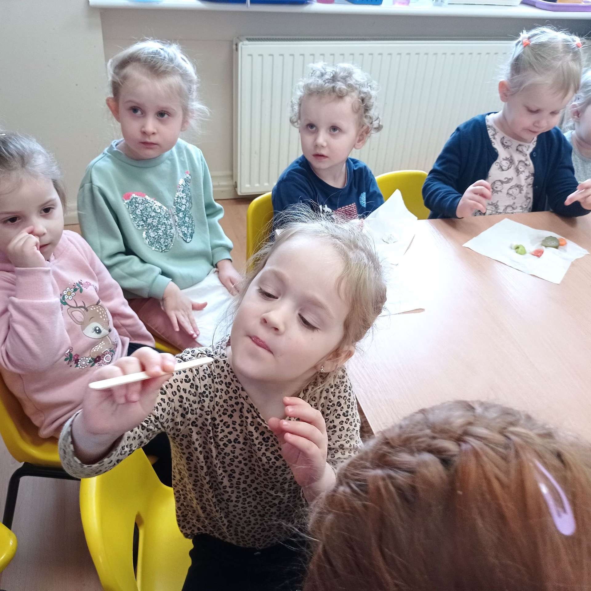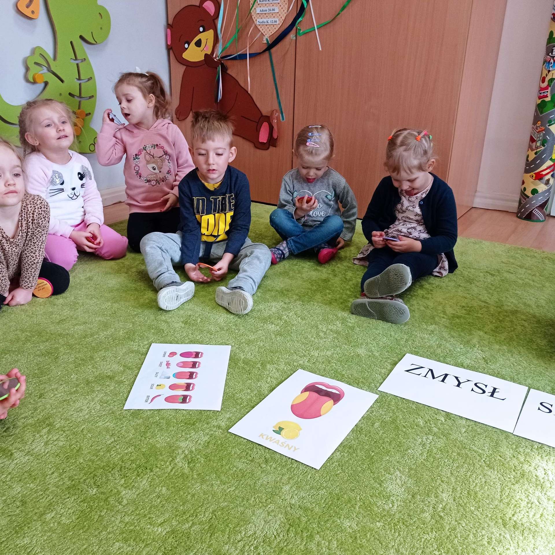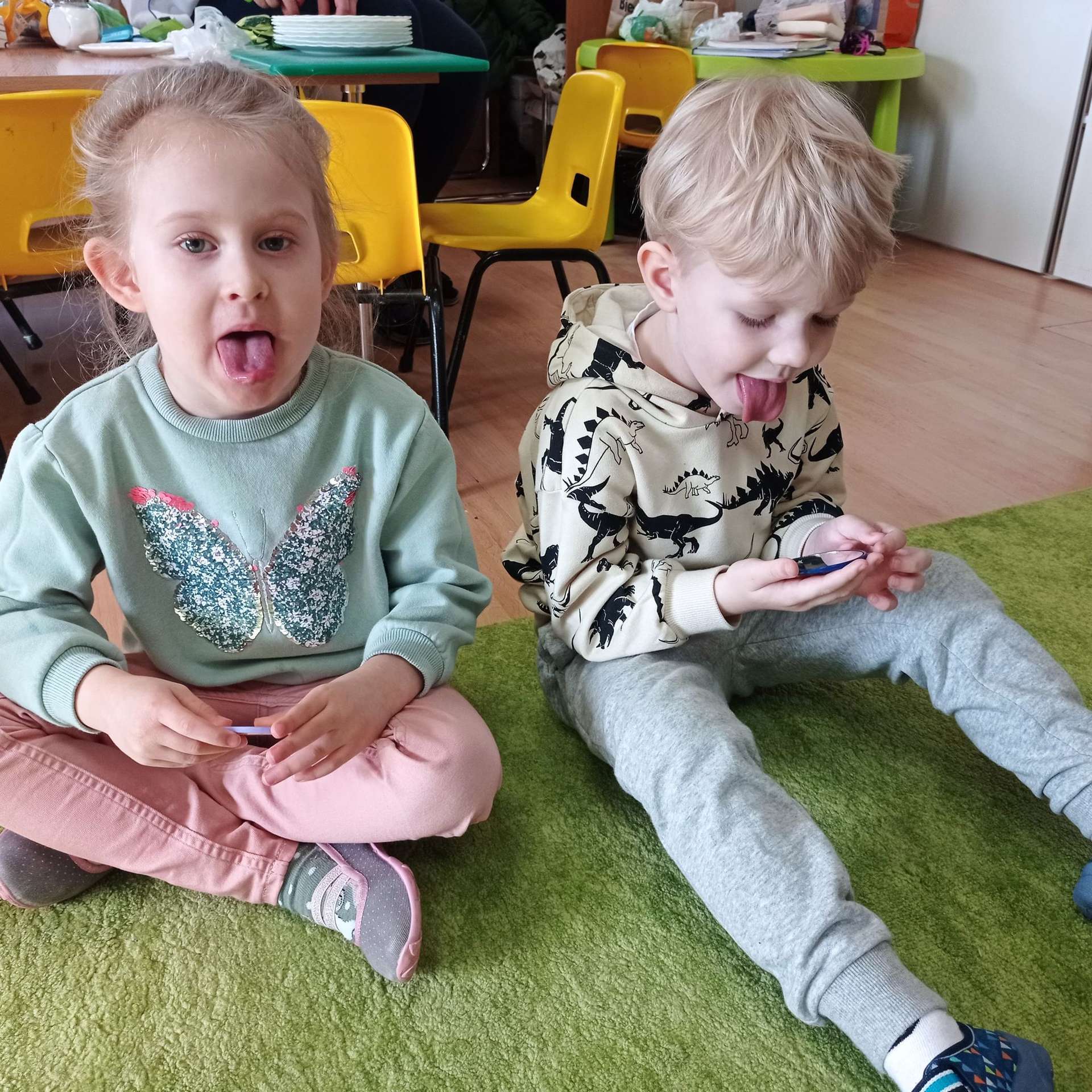 Przed kolejnym zadaniem stanęły "Żabki", w tym miesiącu poznały kolejny zmysł, tym razem był to smak. Dzieci na początku dowiedziały się jak to się dzieje, że czujemy smaki. Przedszkolaki obejrzały krótki film oraz patrząc w lusterka poznawały swój język, towarzyszyły tym zajęciom również zabawy ruchowe. Na koniec "Żabki" próbowały wielu przysmaków. Było kilkoro dzieci które wykazały się odwagą próbując chrzan oraz cebulę. Miny dzisiaj były różne :-) takie po cytrynie i po czekoladzie.