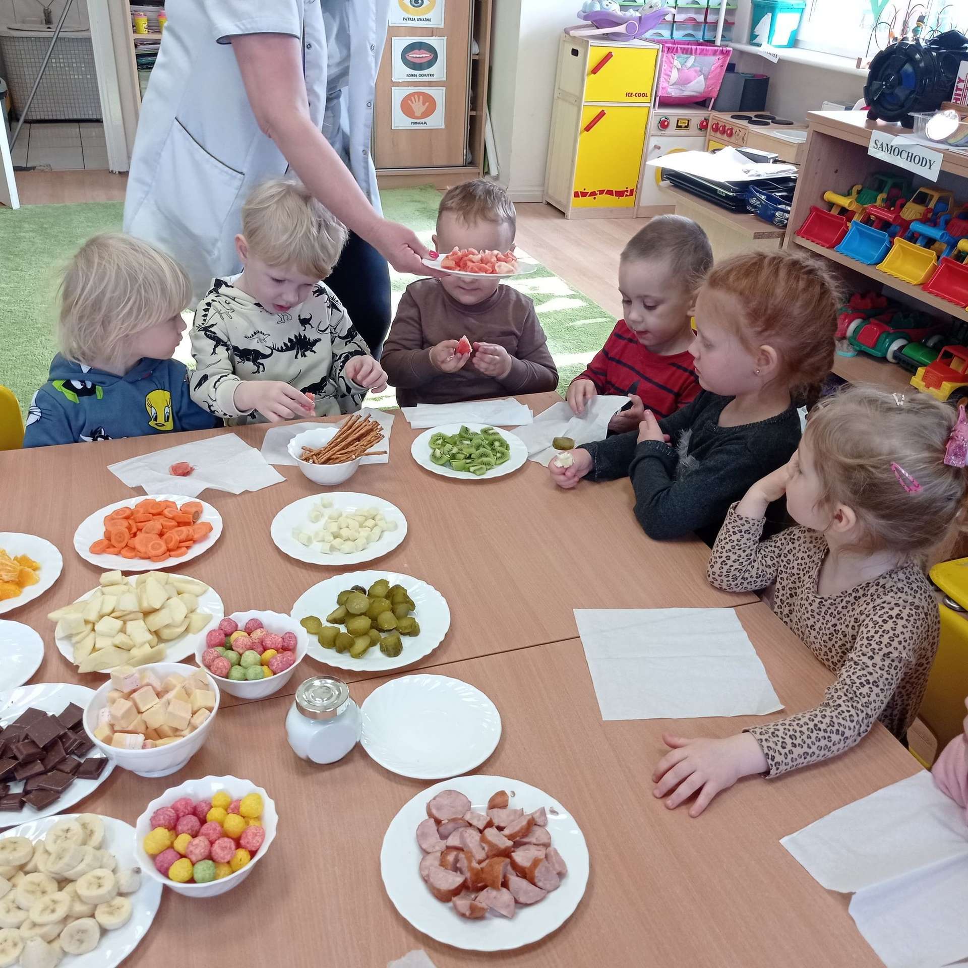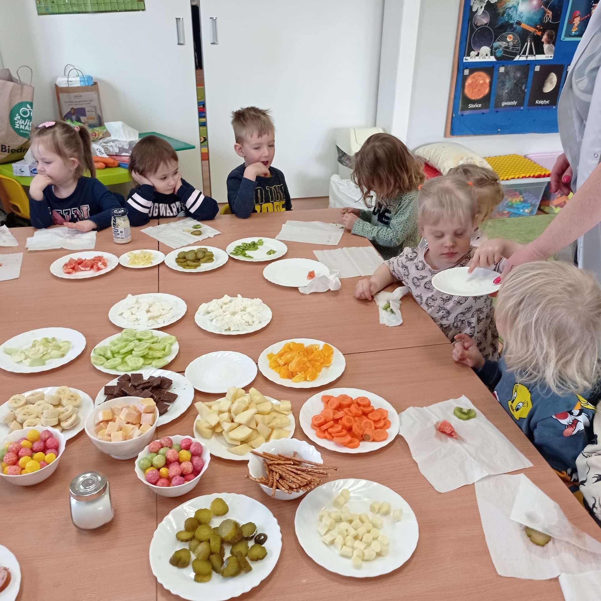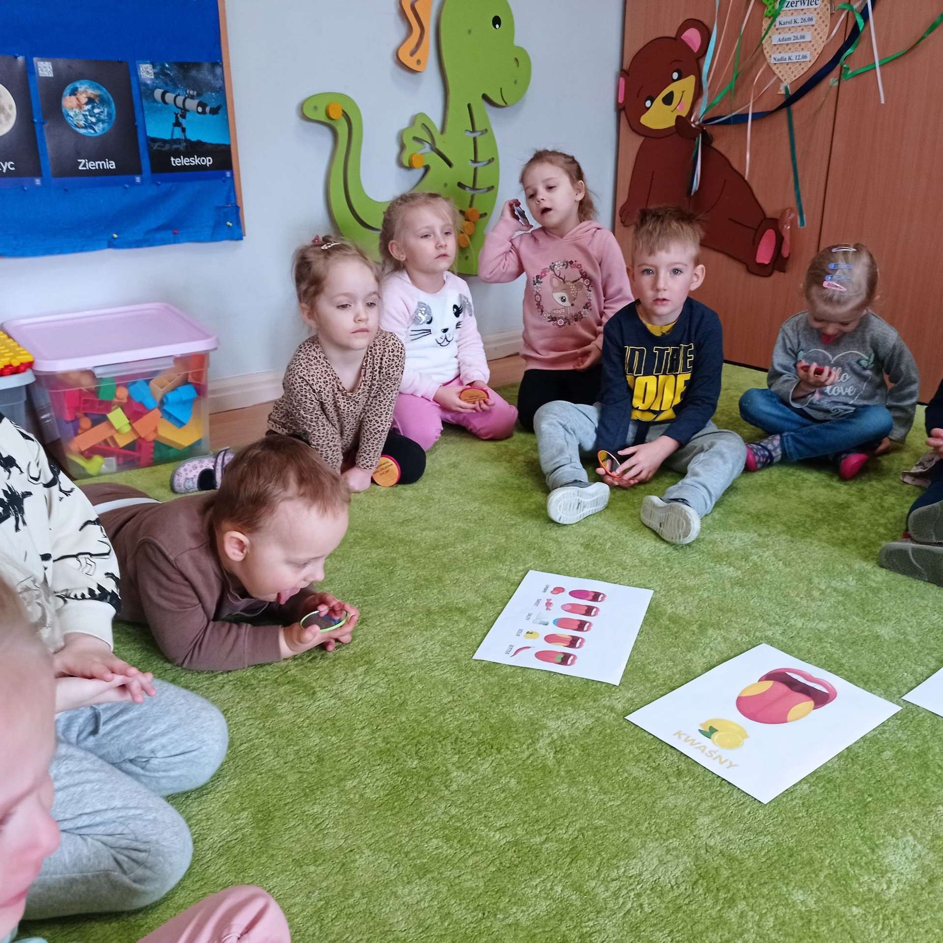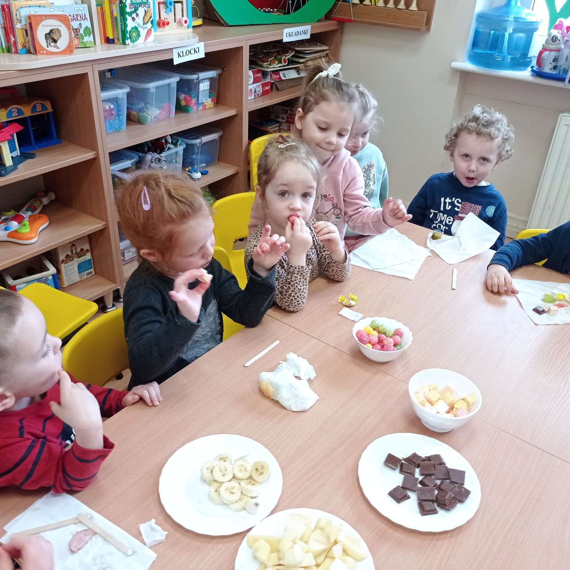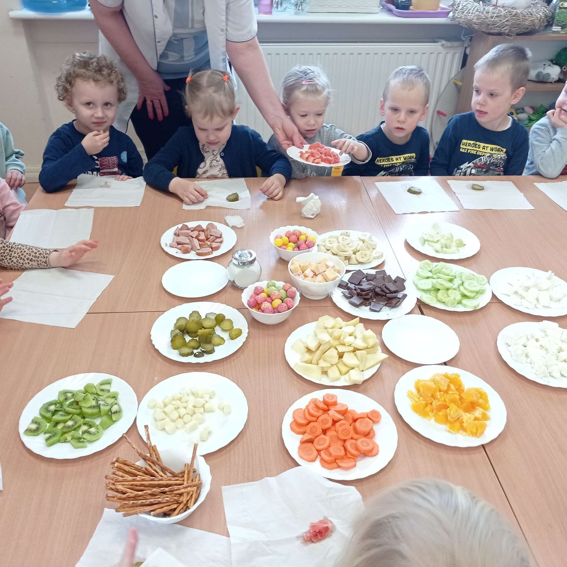Przed kolejnym zadaniem stanęły "Żabki", w tym miesiącu poznały kolejny zmysł, tym razem był to smak. Dzieci na początku dowiedziały się jak to się dzieje, że czujemy smaki. Przedszkolaki obejrzały krótki film oraz patrząc w lusterka poznawały swój język, towarzyszyły tym zajęciom również zabawy ruchowe. Na koniec "Żabki" próbowały wielu przysmaków. Było kilkoro dzieci które wykazały się odwagą próbując chrzan oraz cebulę. Miny dzisiaj były różne :-) takie po cytrynie i po czekoladzie.