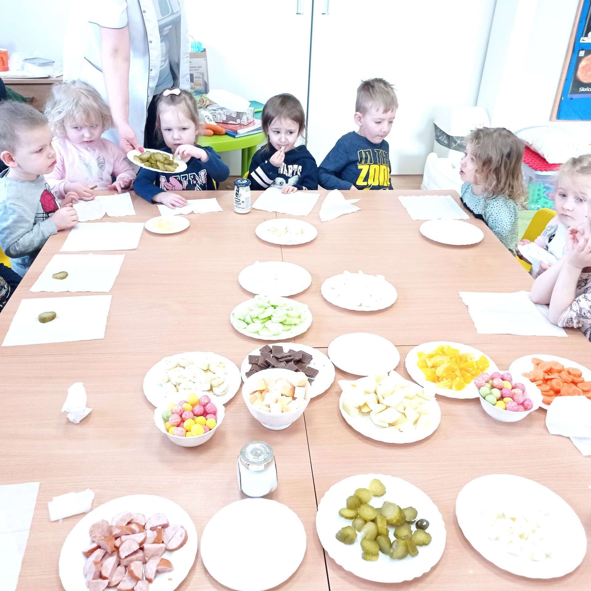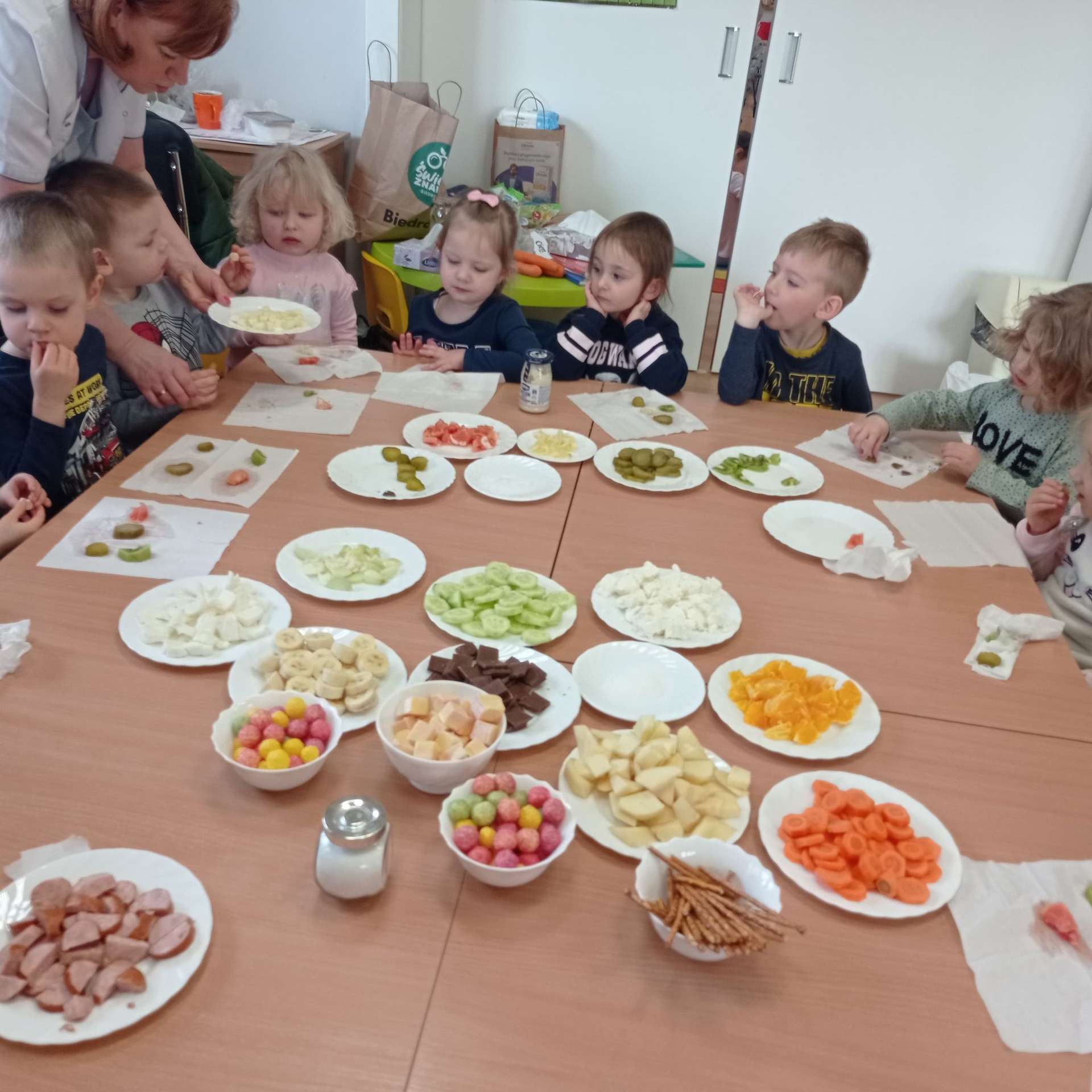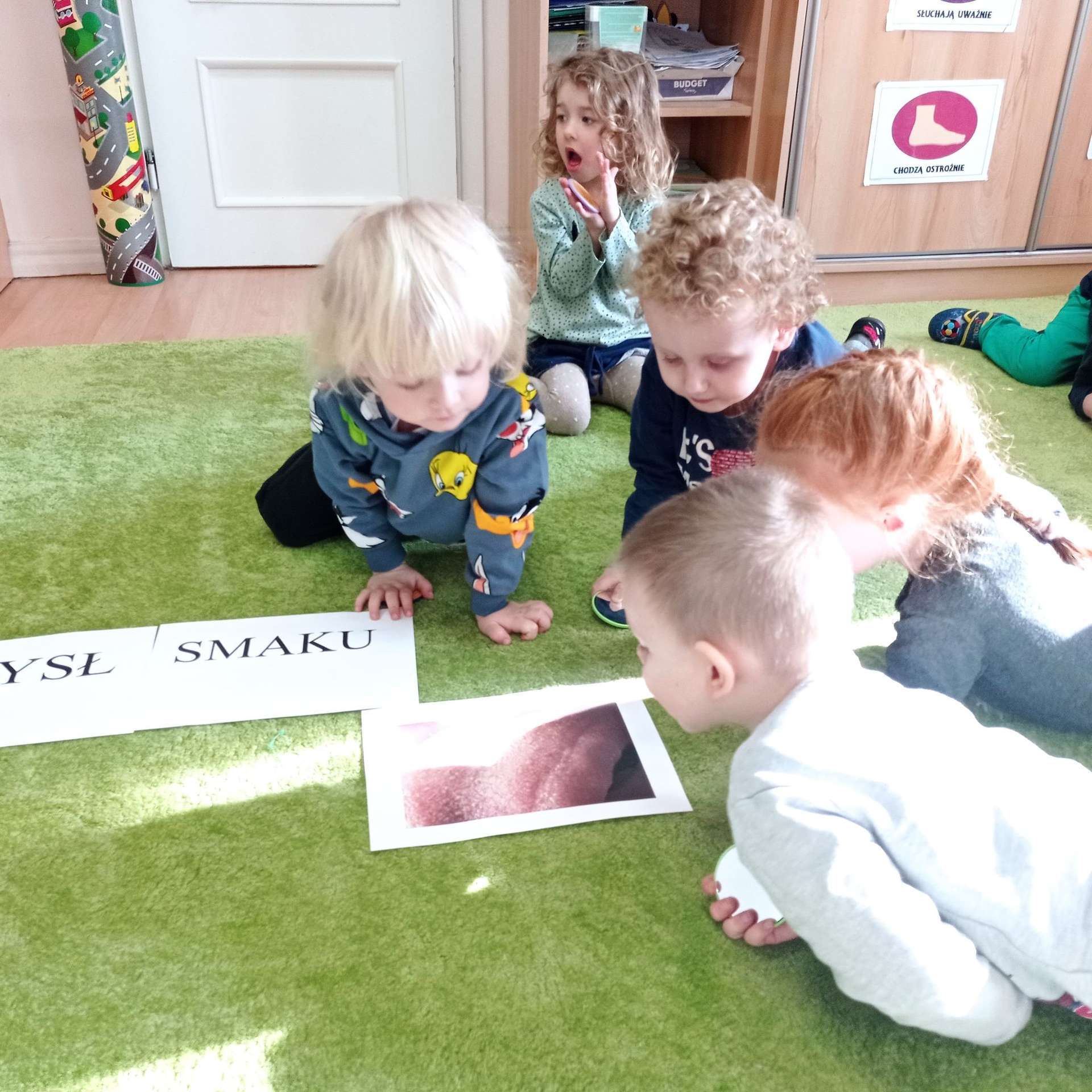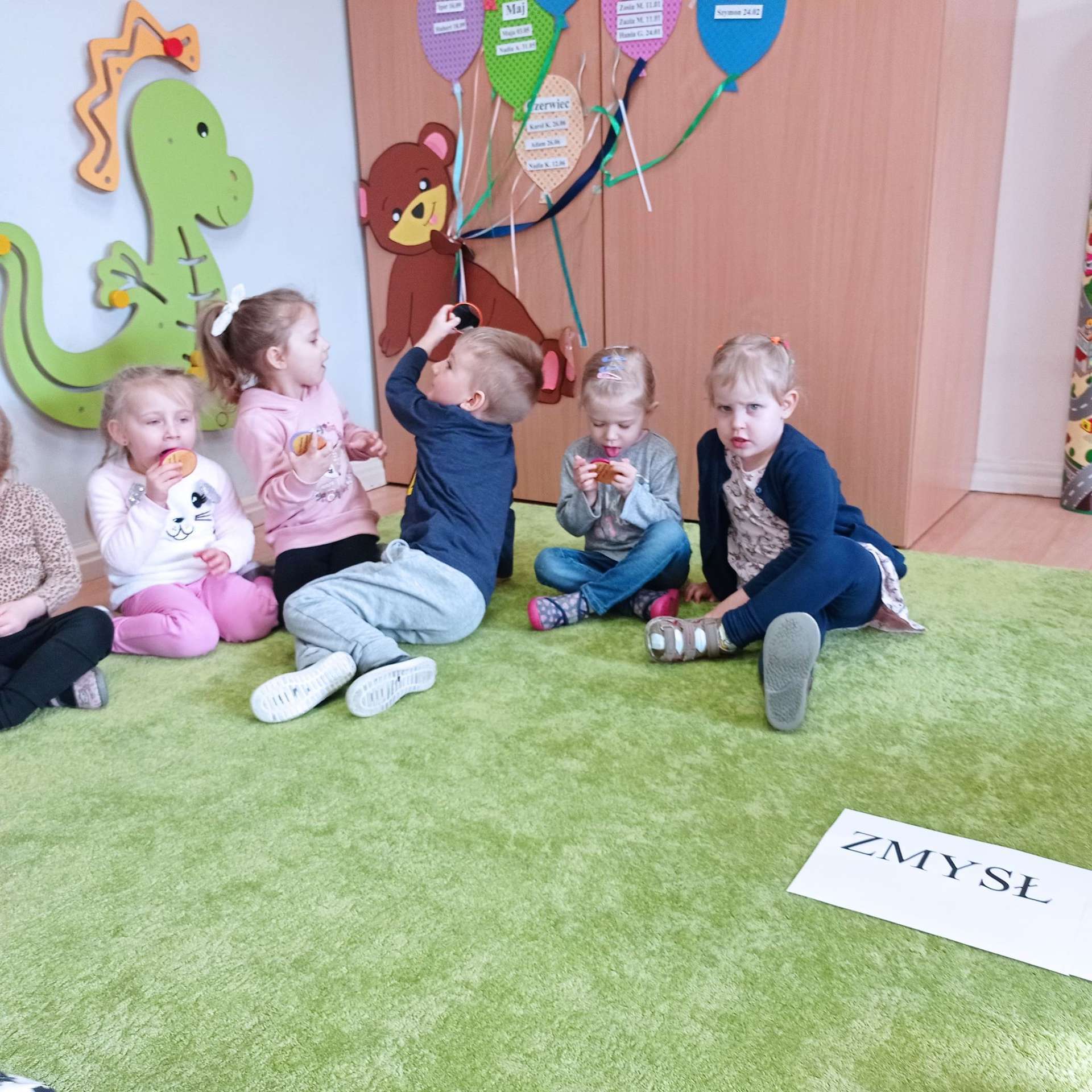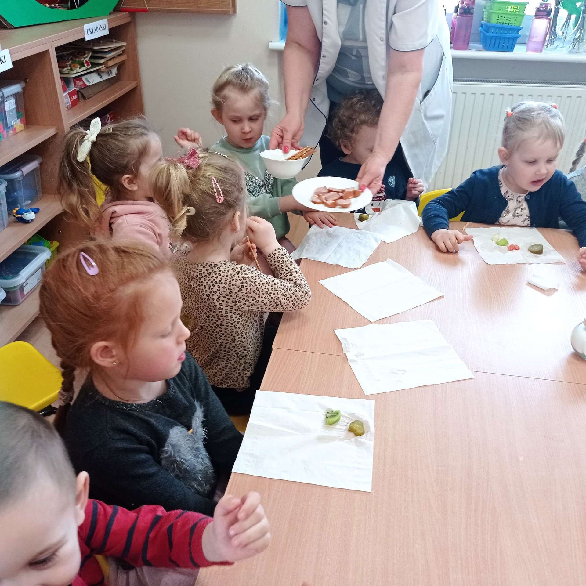 Przed kolejnym zadaniem stanęły "Żabki", w tym miesiącu poznały kolejny zmysł, tym razem był to smak. Dzieci na początku dowiedziały się jak to się dzieje, że czujemy smaki. Przedszkolaki obejrzały krótki film oraz patrząc w lusterka poznawały swój język, towarzyszyły tym zajęciom również zabawy ruchowe. Na koniec "Żabki" próbowały wielu przysmaków. Było kilkoro dzieci które wykazały się odwagą próbując chrzan oraz cebulę. Miny dzisiaj były różne :-) takie po cytrynie i po czekoladzie.