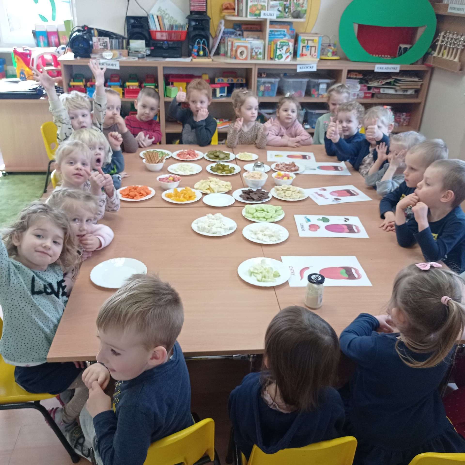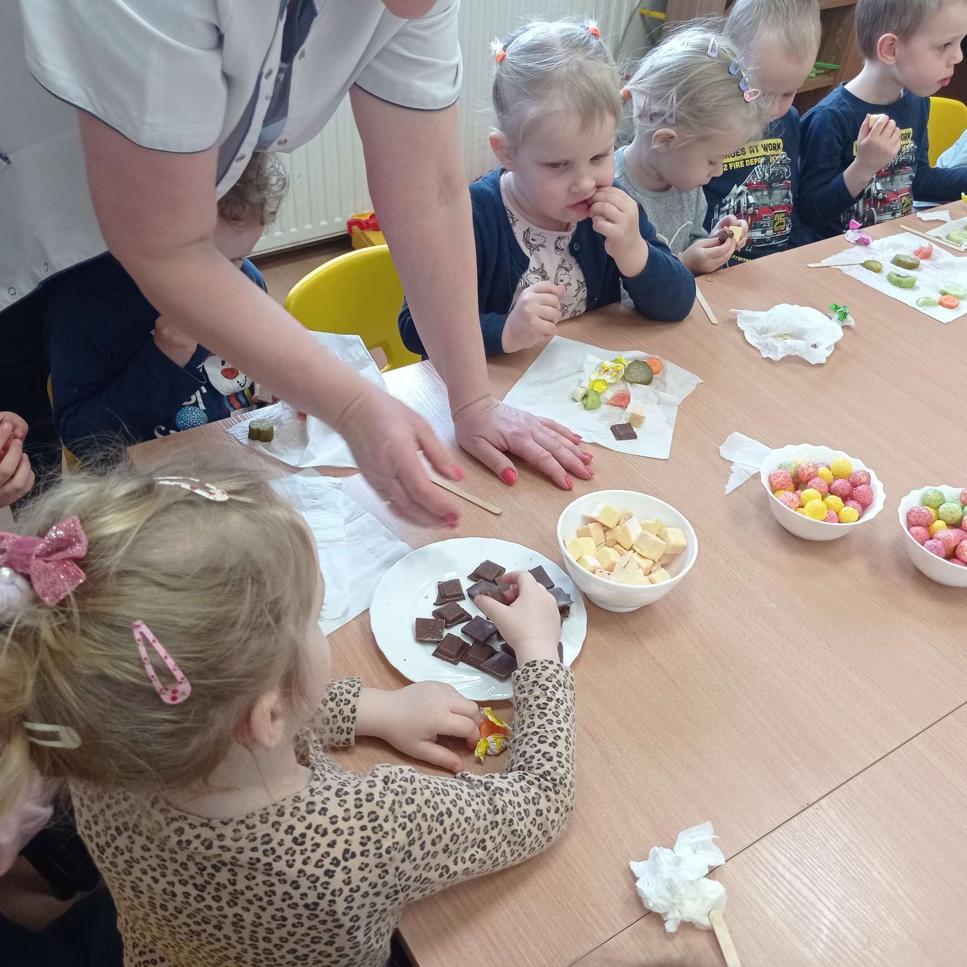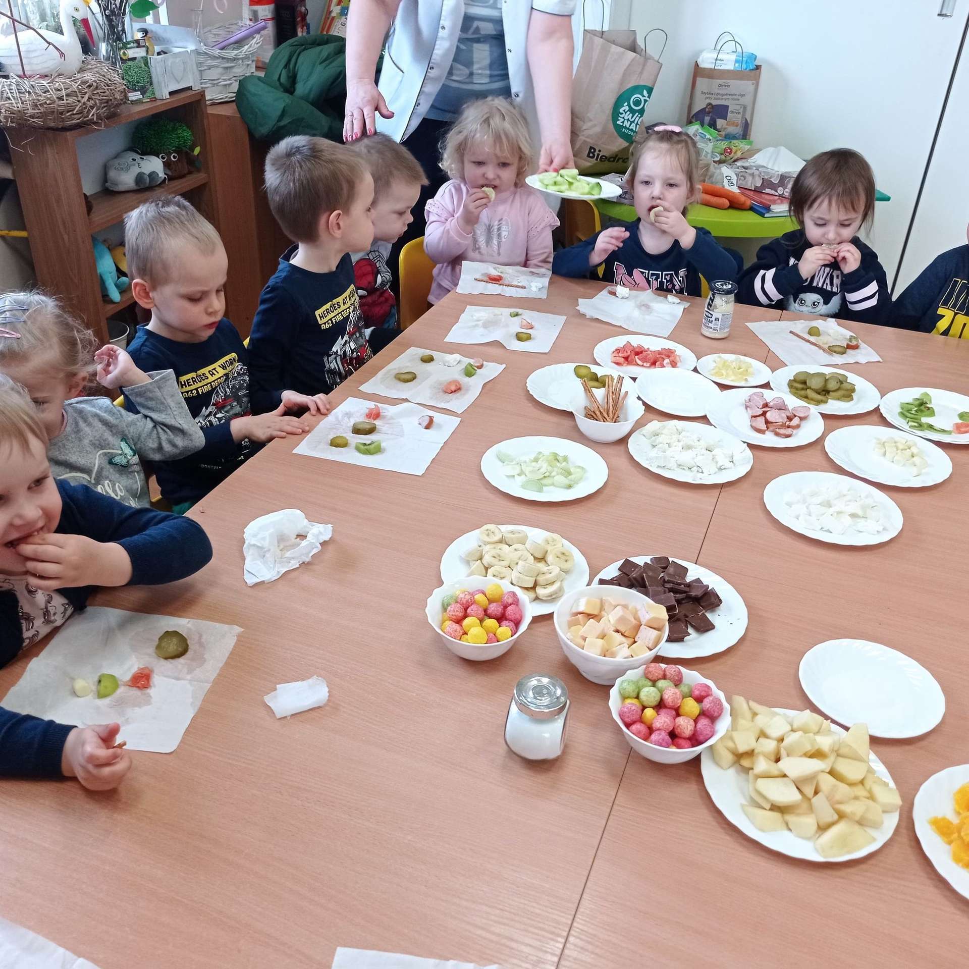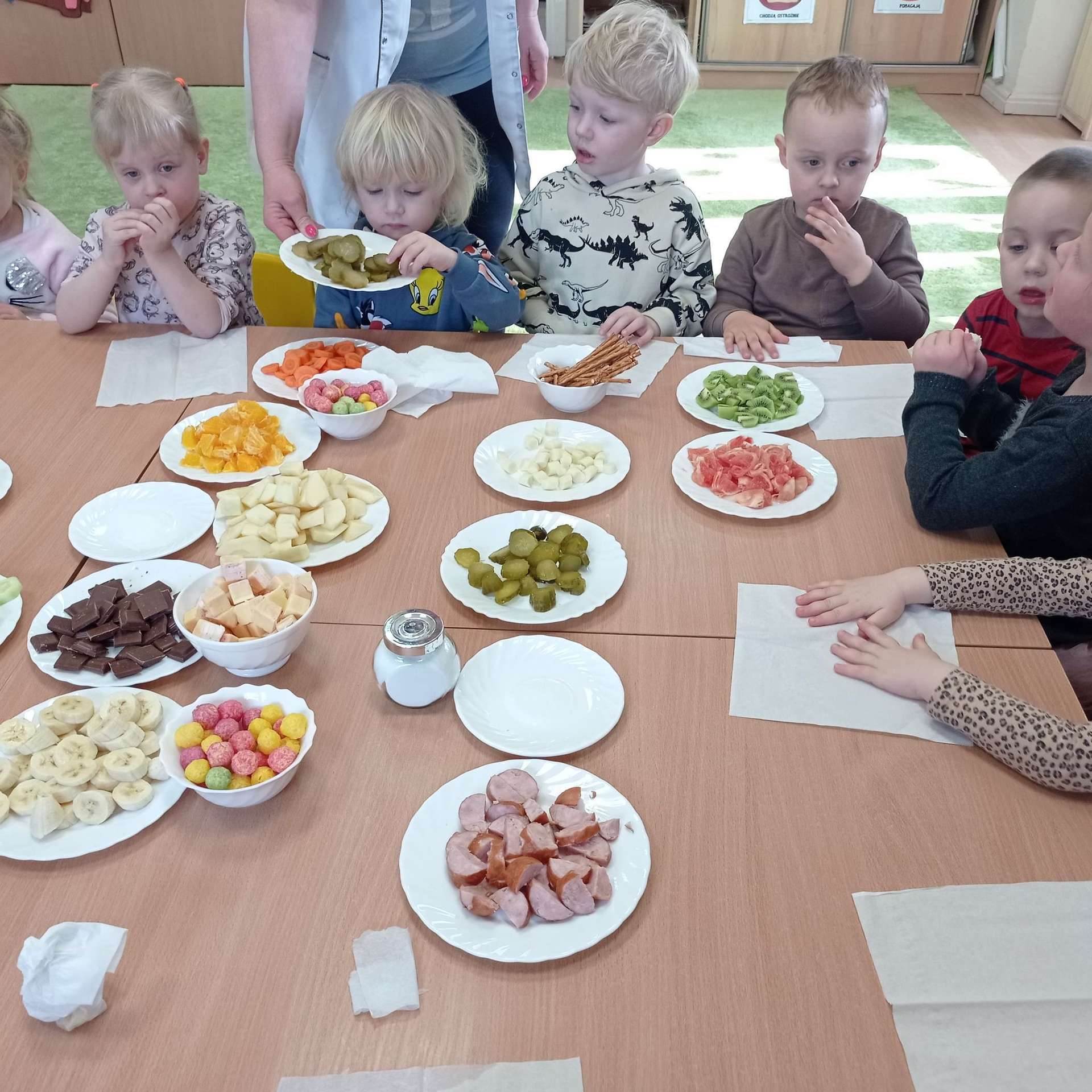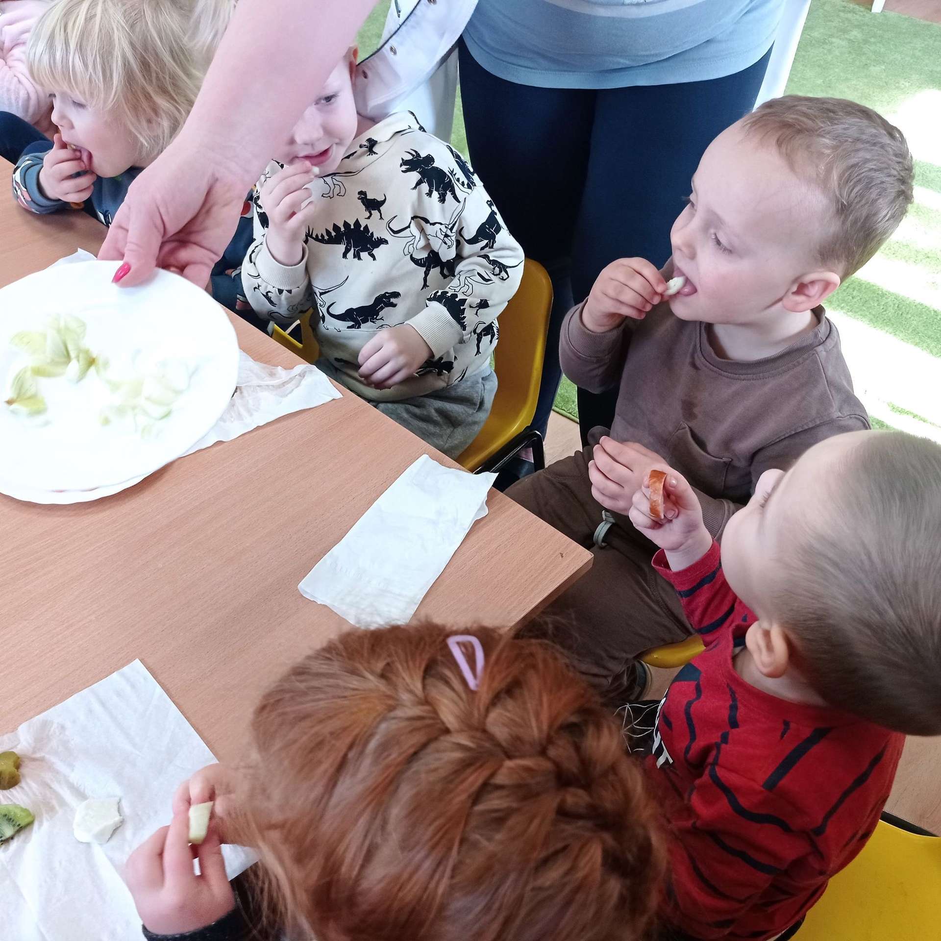 Przed kolejnym zadaniem stanęły "Żabki", w tym miesiącu poznały kolejny zmysł, tym razem był to smak. Dzieci na początku dowiedziały się jak to się dzieje, że czujemy smaki. Przedszkolaki obejrzały krótki film oraz patrząc w lusterka poznawały swój język, towarzyszyły tym zajęciom również zabawy ruchowe. Na koniec "Żabki" próbowały wielu przysmaków. Było kilkoro dzieci które wykazały się odwagą próbując chrzan oraz cebulę. Miny dzisiaj były różne :-) takie po cytrynie i po czekoladzie.