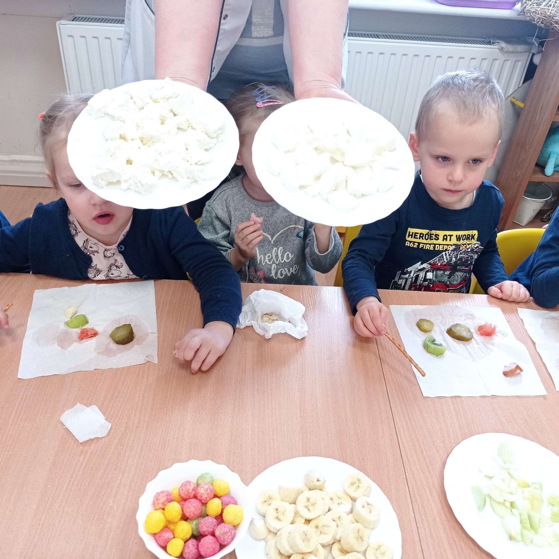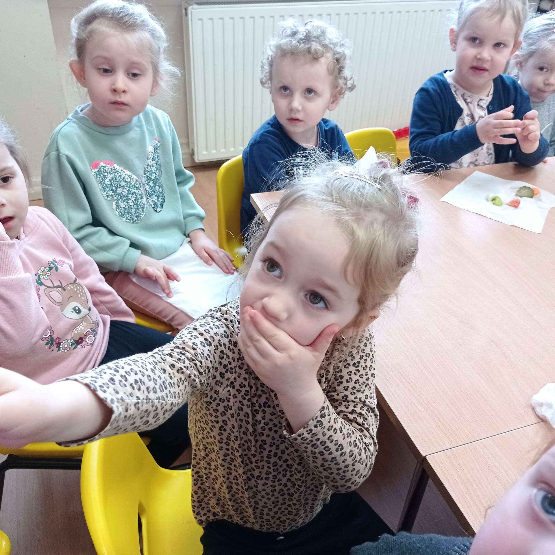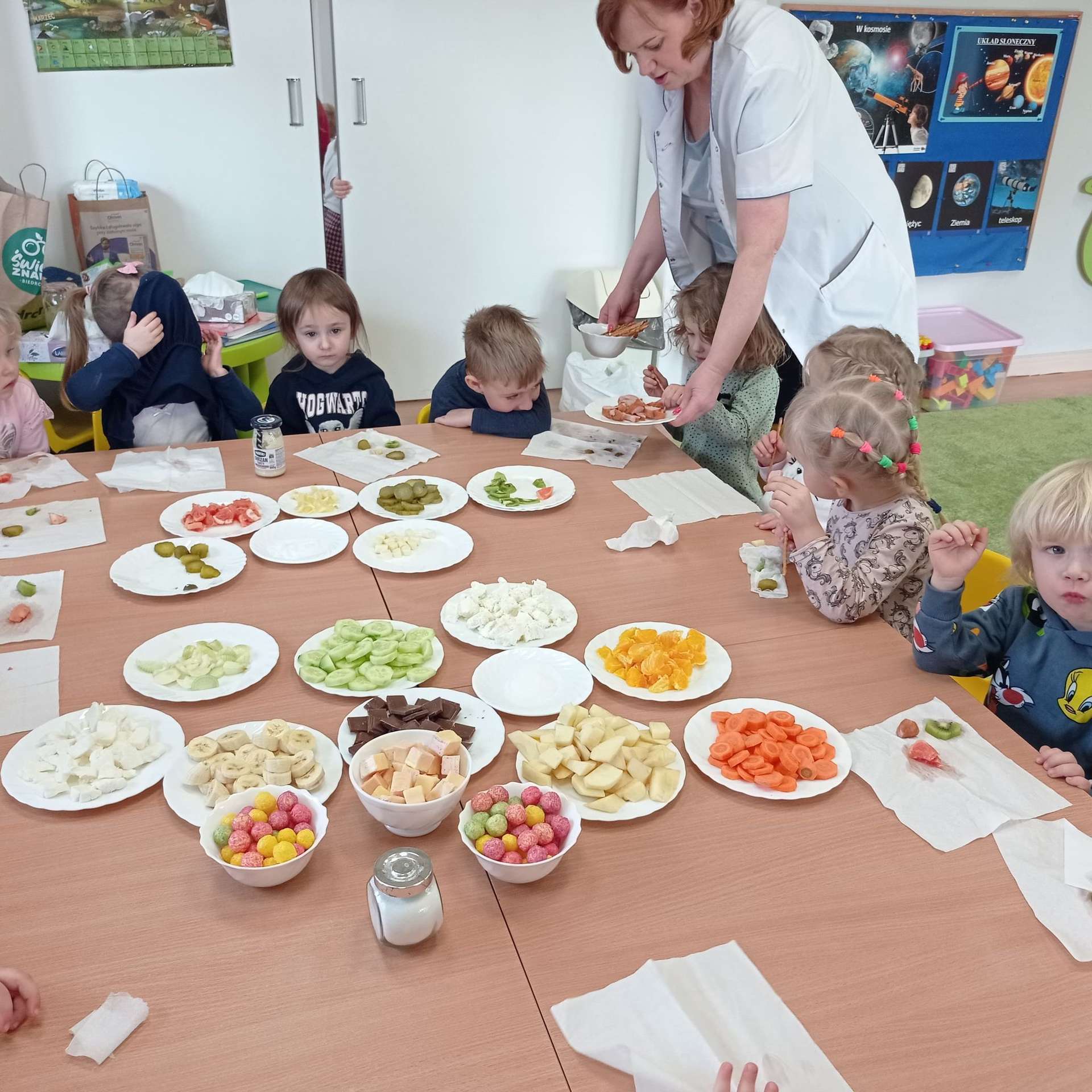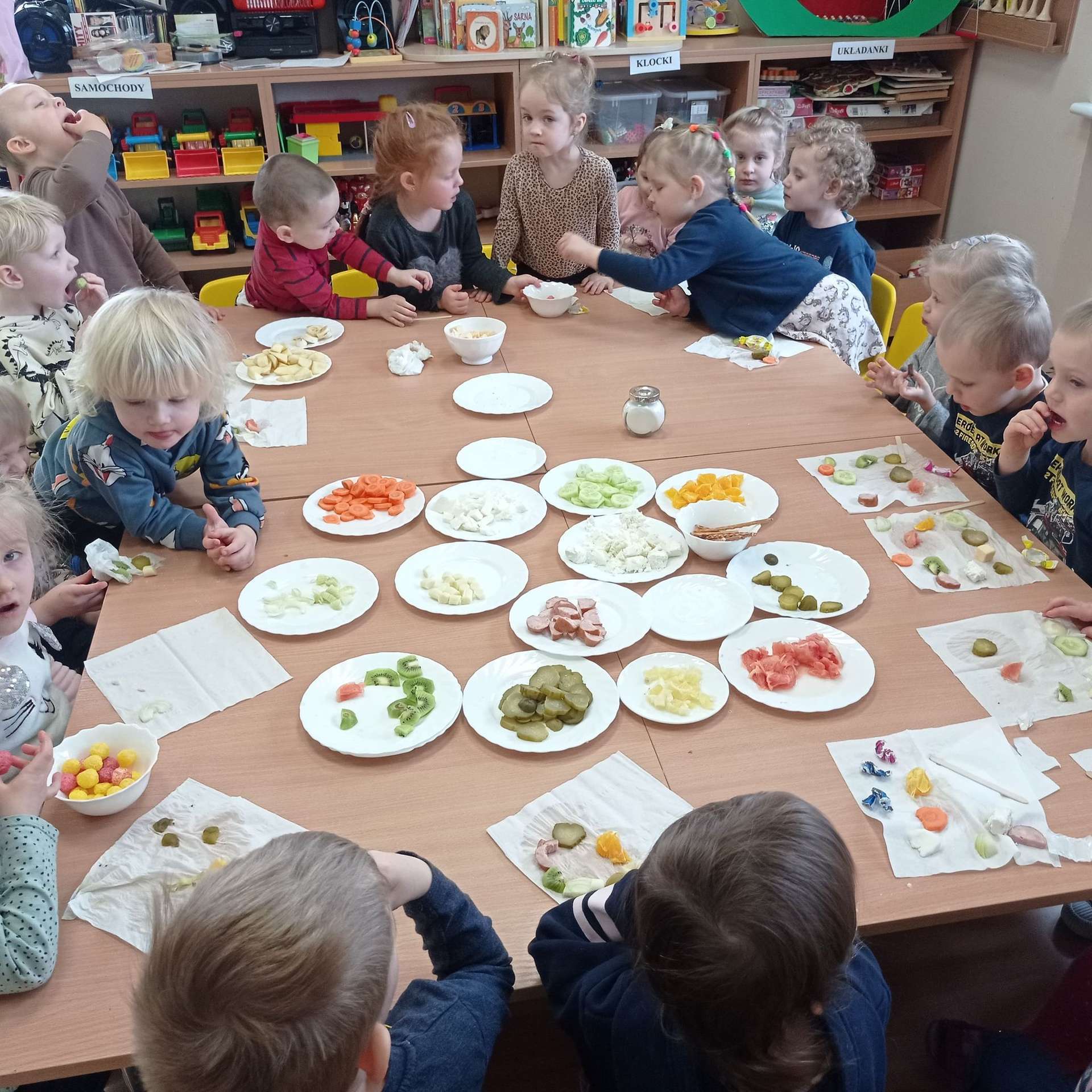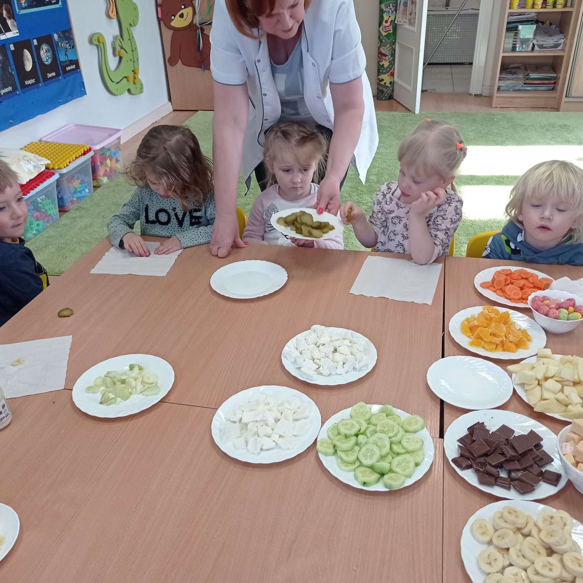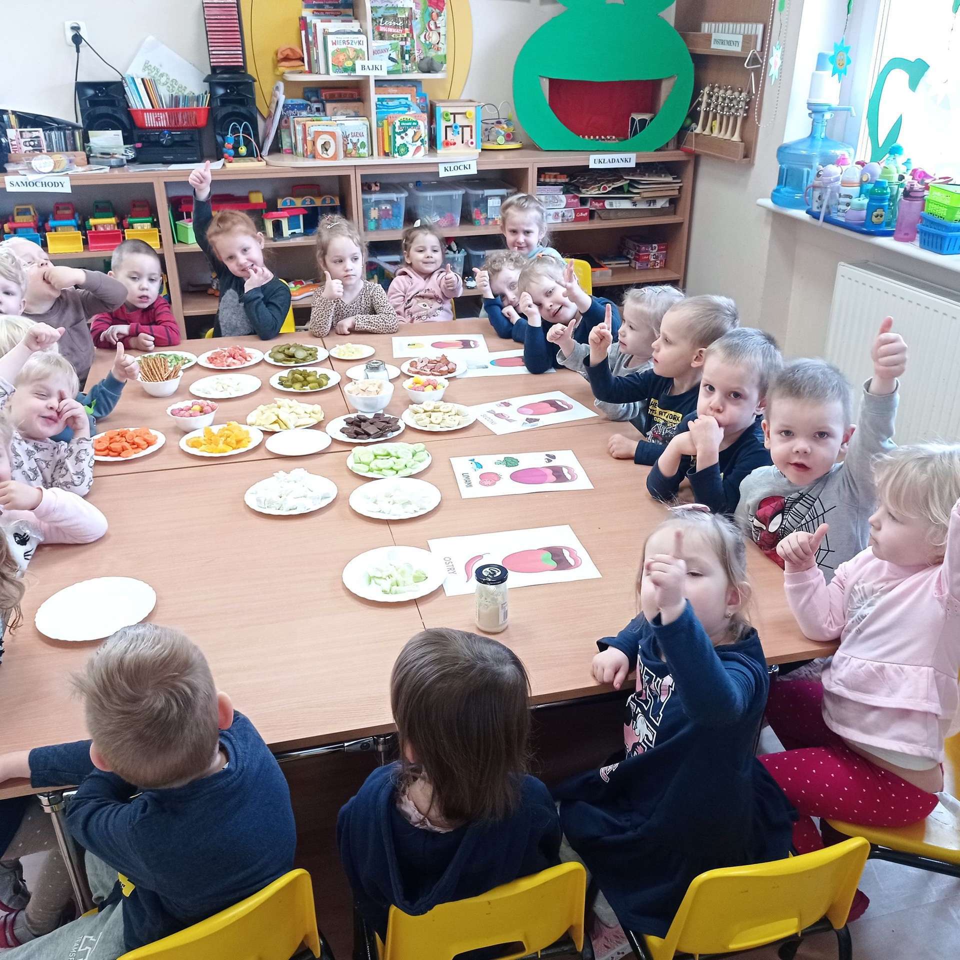Przed kolejnym zadaniem stanęły "Żabki", w tym miesiącu poznały kolejny zmysł, tym razem był to smak. Dzieci na początku dowiedziały się jak to się dzieje, że czujemy smaki. Przedszkolaki obejrzały krótki film oraz patrząc w lusterka poznawały swój język, towarzyszyły tym zajęciom również zabawy ruchowe. Na koniec "Żabki" próbowały wielu przysmaków. Było kilkoro dzieci które wykazały się odwagą próbując chrzan oraz cebulę. Miny dzisiaj były różne :-) takie po cytrynie i po czekoladzie.