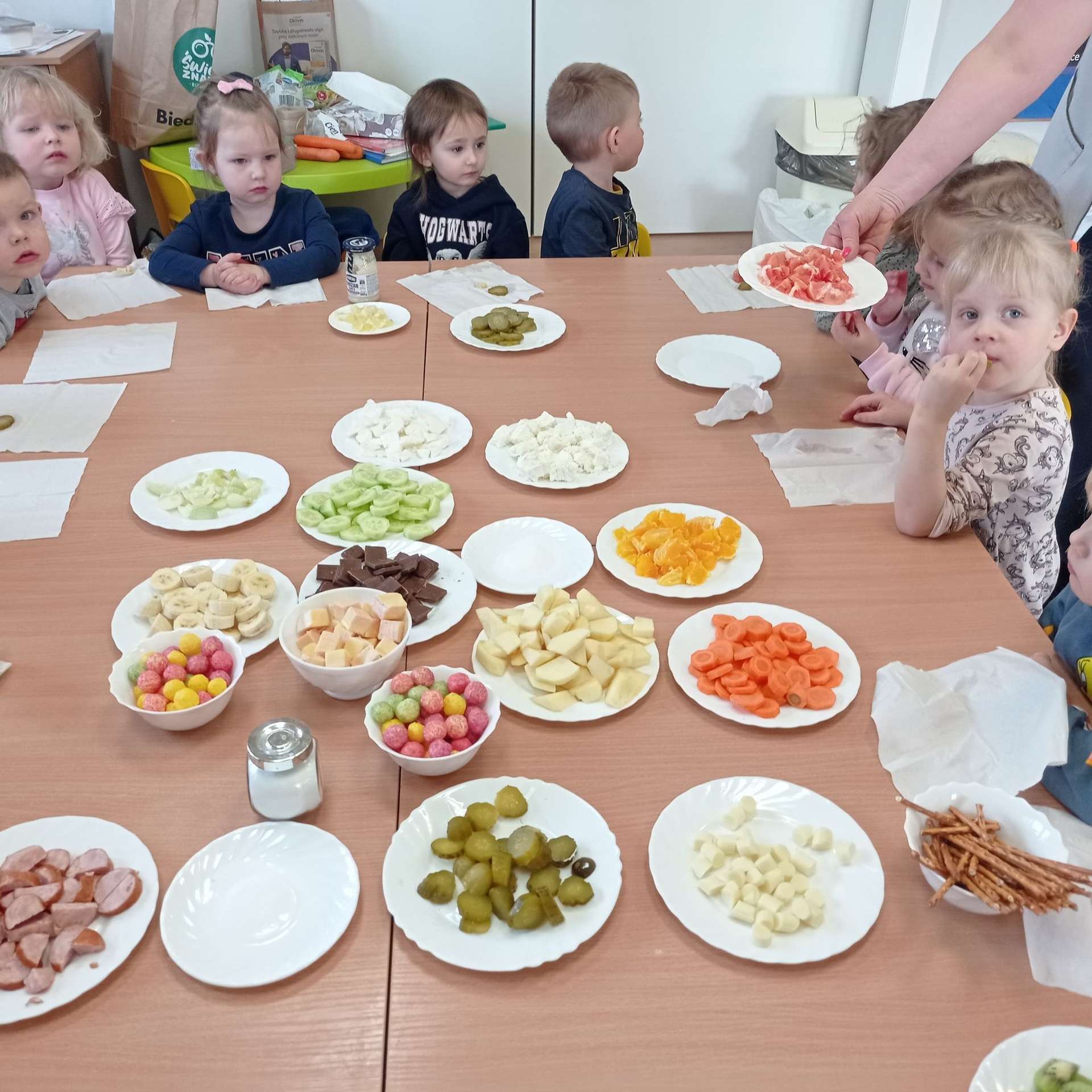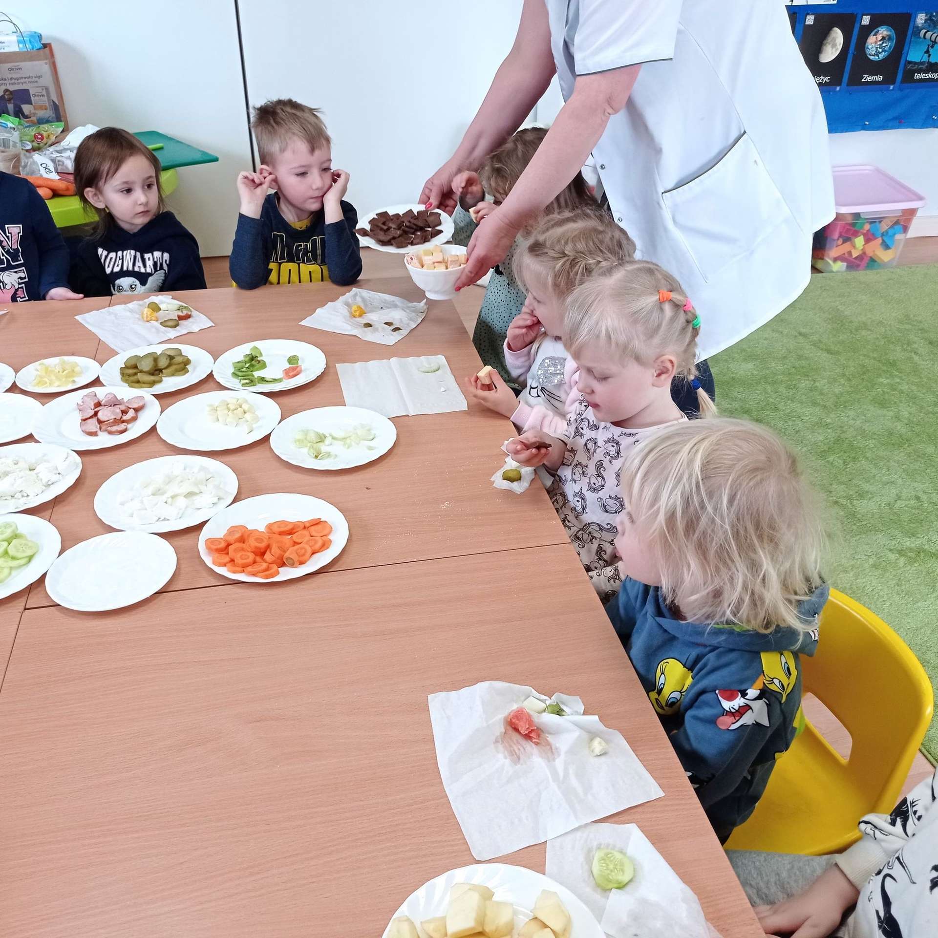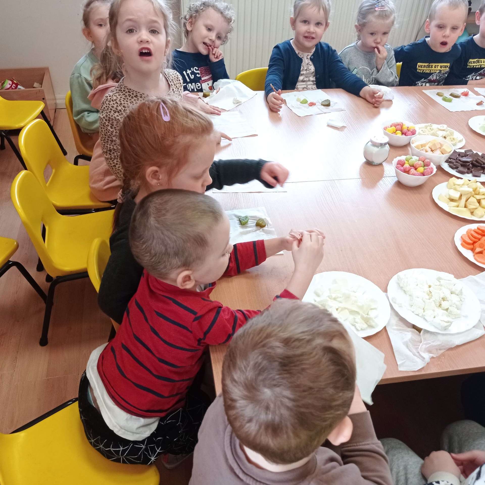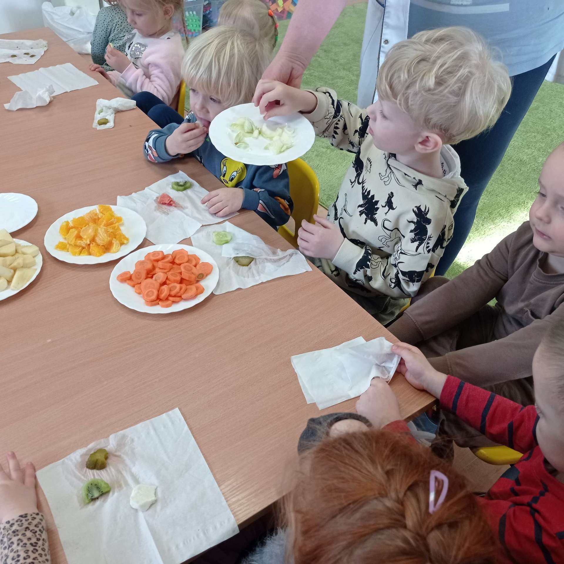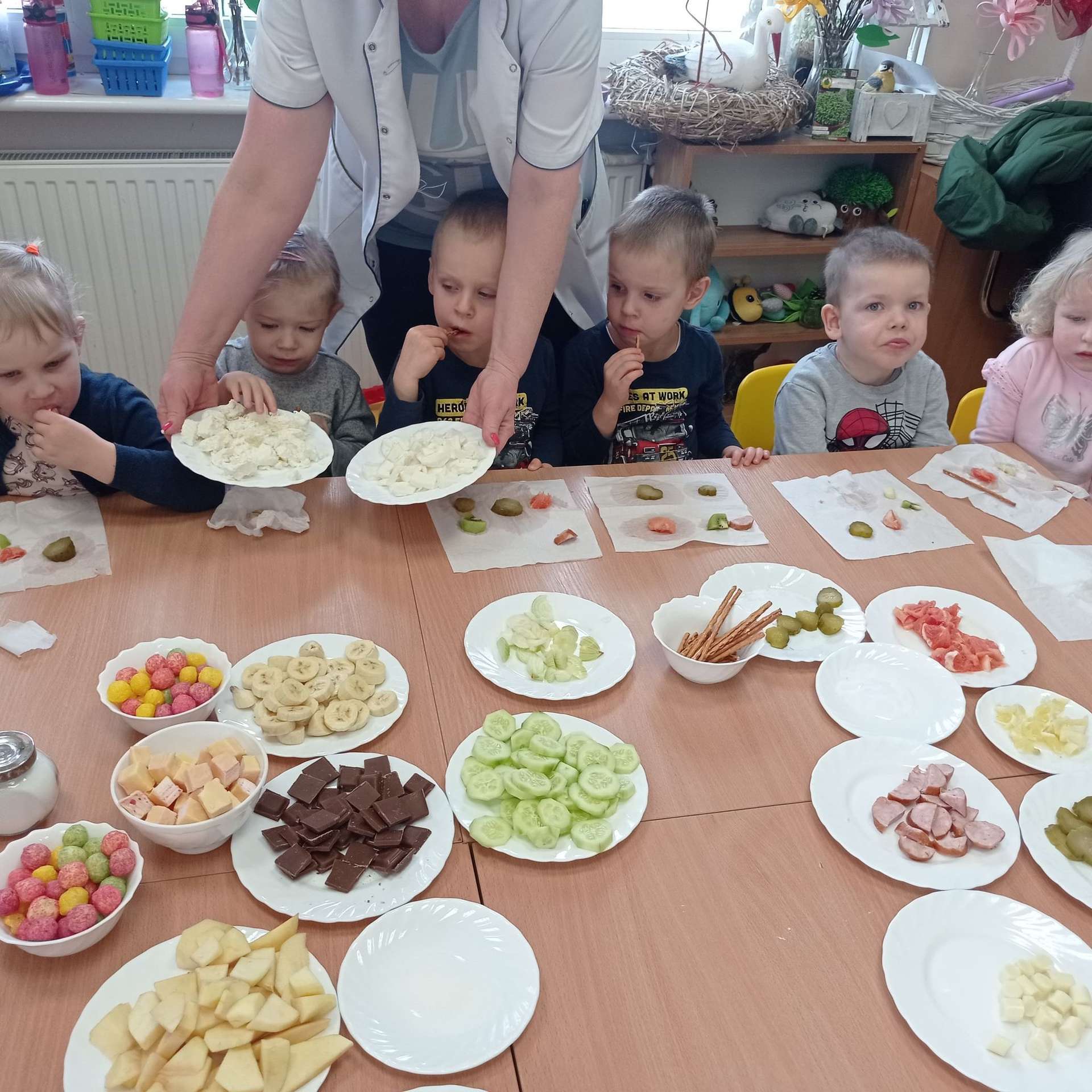 Przed kolejnym zadaniem stanęły "Żabki", w tym miesiącu poznały kolejny zmysł, tym razem był to smak. Dzieci na początku dowiedziały się jak to się dzieje, że czujemy smaki. Przedszkolaki obejrzały krótki film oraz patrząc w lusterka poznawały swój język, towarzyszyły tym zajęciom również zabawy ruchowe. Na koniec "Żabki" próbowały wielu przysmaków. Było kilkoro dzieci które wykazały się odwagą próbując chrzan oraz cebulę. Miny dzisiaj były różne :-) takie po cytrynie i po czekoladzie.