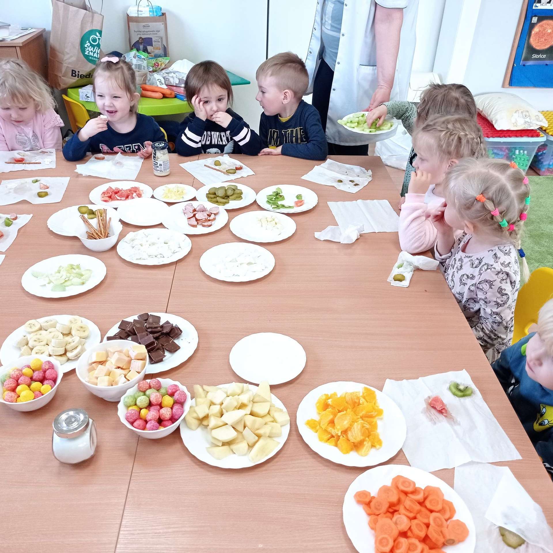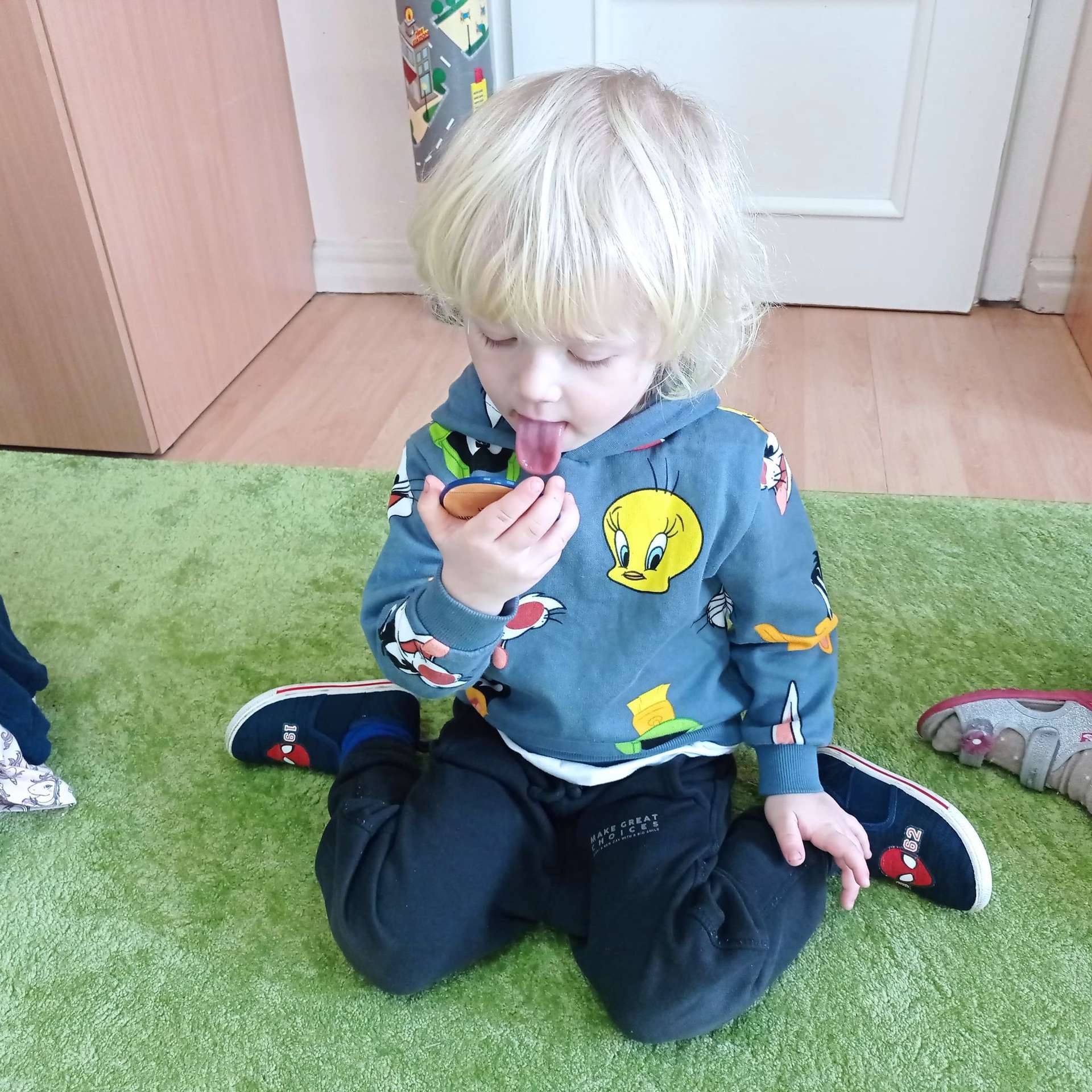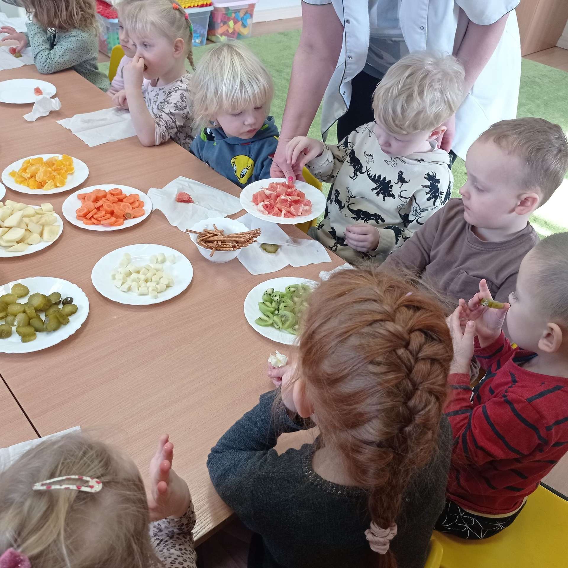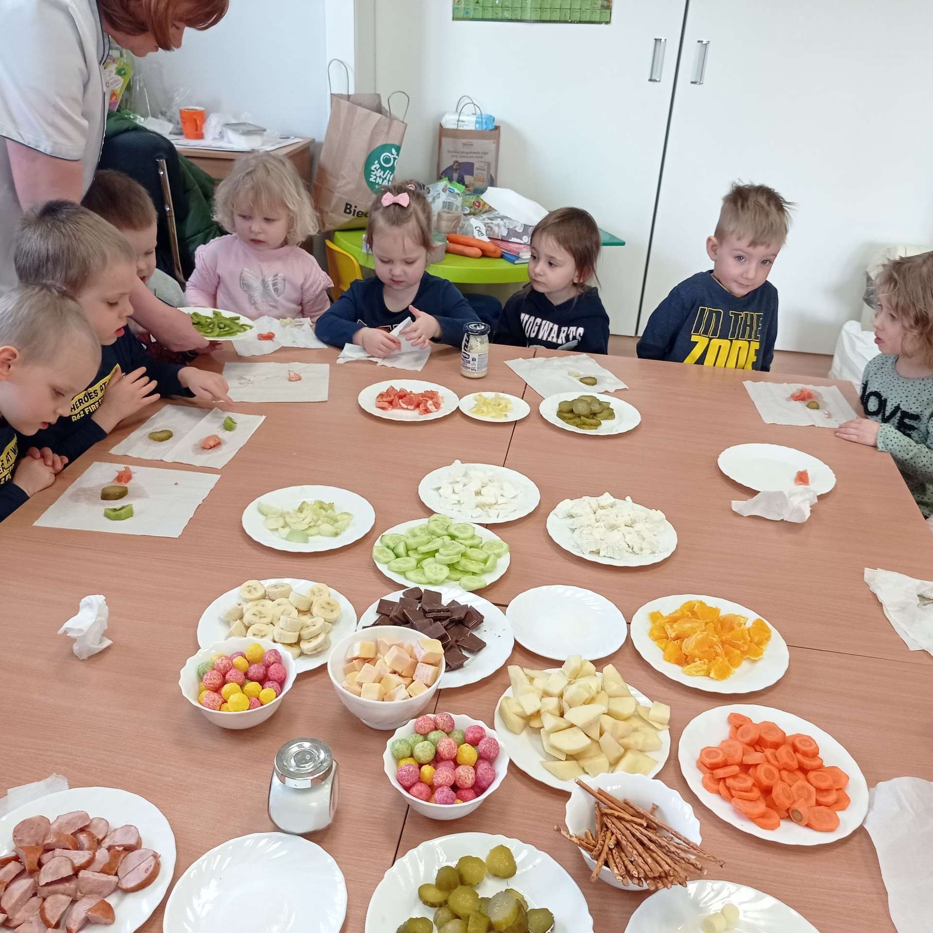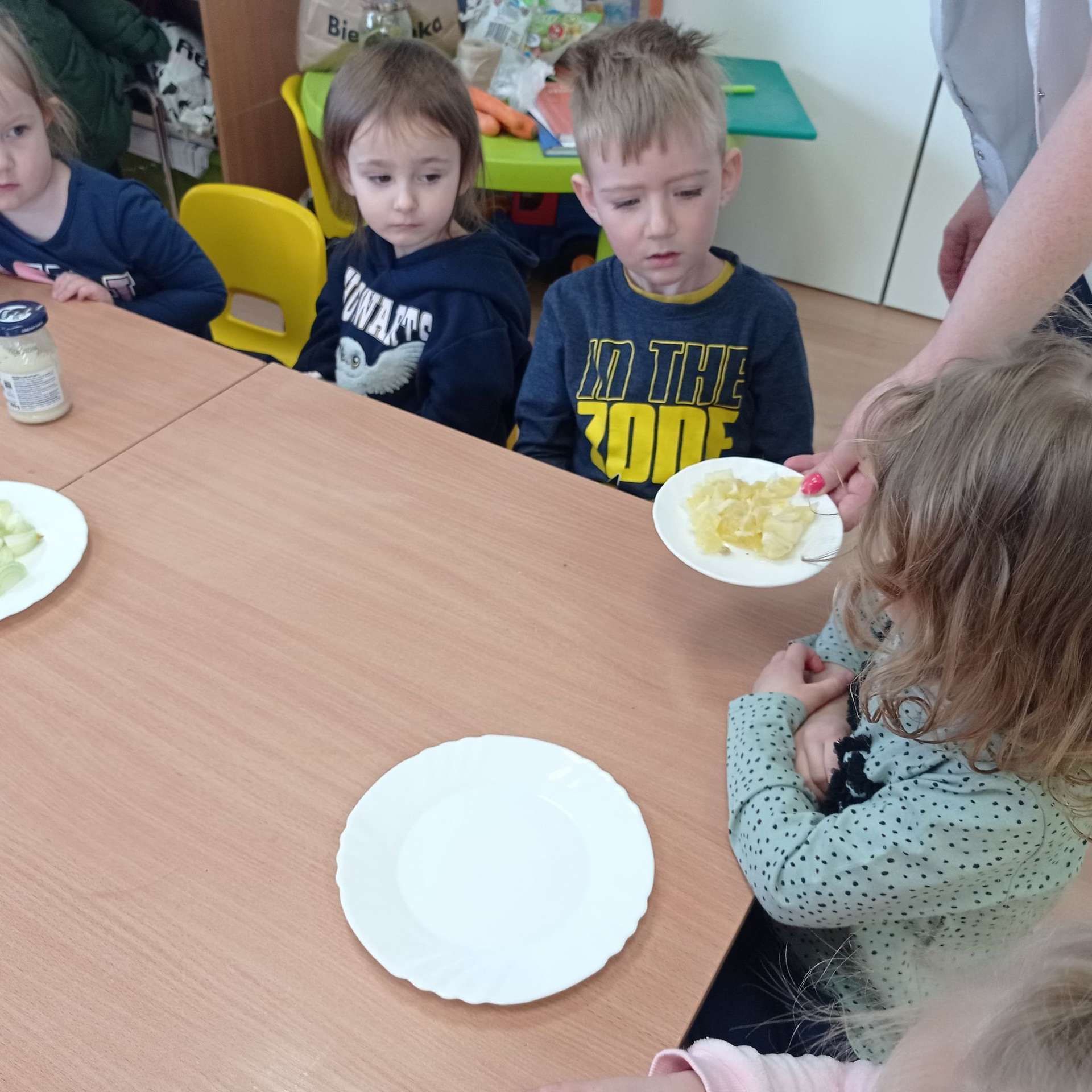 Przed kolejnym zadaniem stanęły "Żabki", w tym miesiącu poznały kolejny zmysł, tym razem był to smak. Dzieci na początku dowiedziały się jak to się dzieje, że czujemy smaki. Przedszkolaki obejrzały krótki film oraz patrząc w lusterka poznawały swój język, towarzyszyły tym zajęciom również zabawy ruchowe. Na koniec "Żabki" próbowały wielu przysmaków. Było kilkoro dzieci które wykazały się odwagą próbując chrzan oraz cebulę. Miny dzisiaj były różne :-) takie po cytrynie i po czekoladzie.