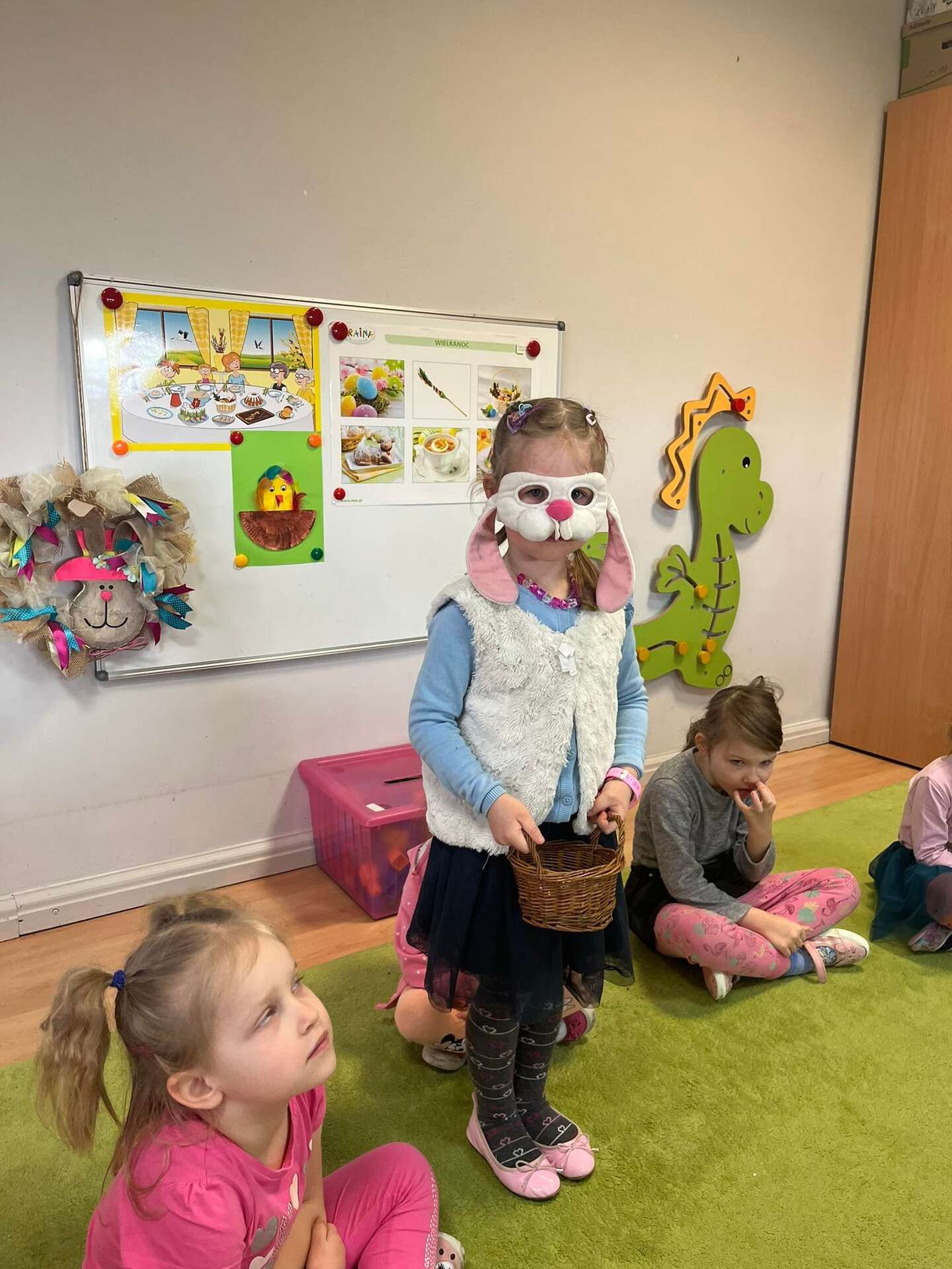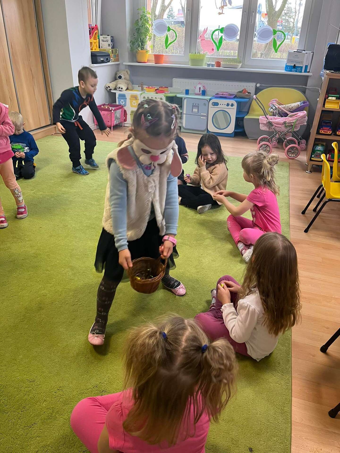 Dziewczynka częstuje dzieci czekoladowymi jajkami