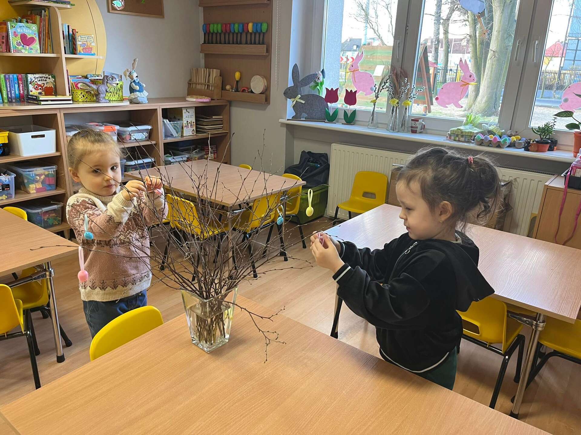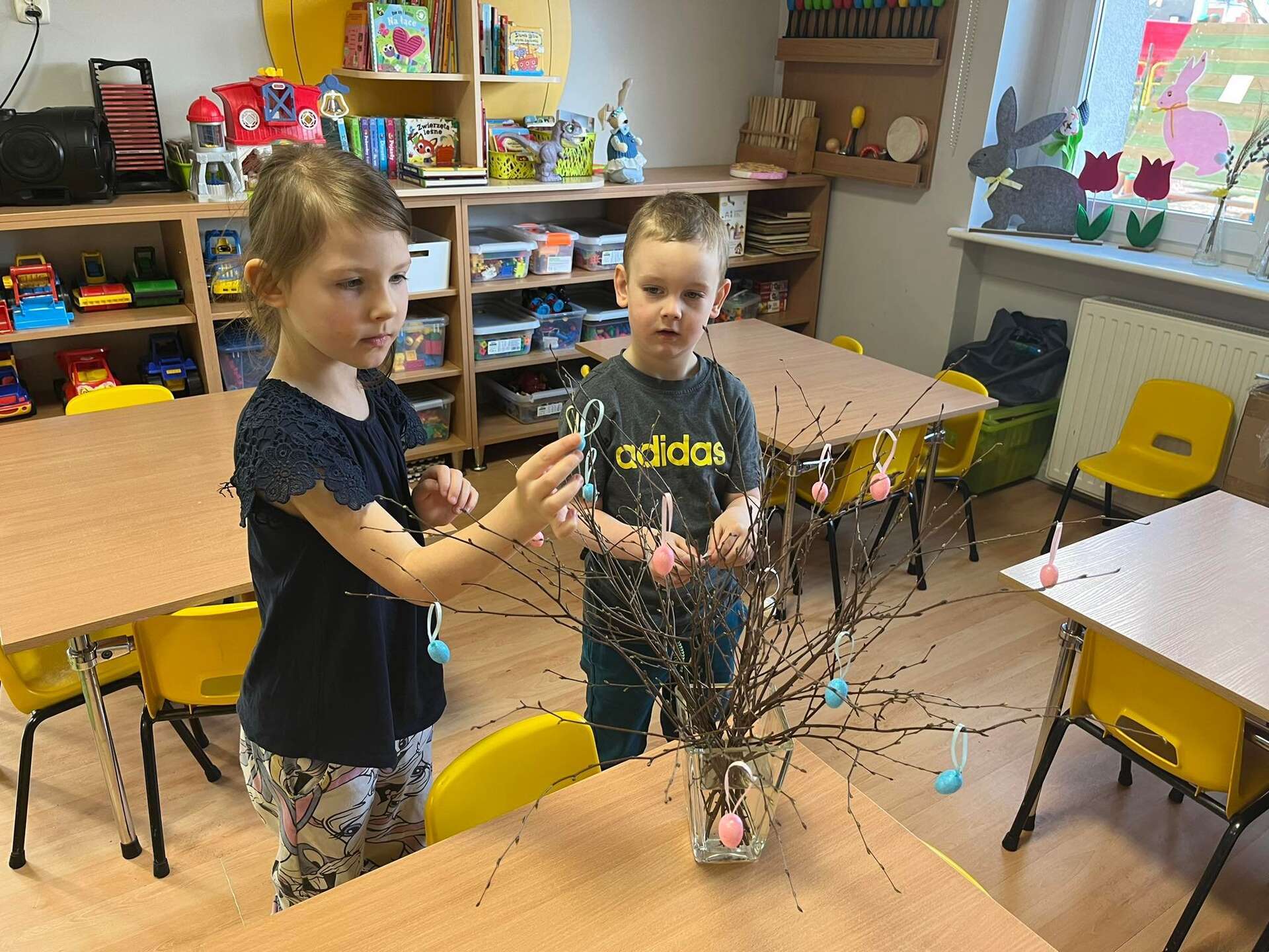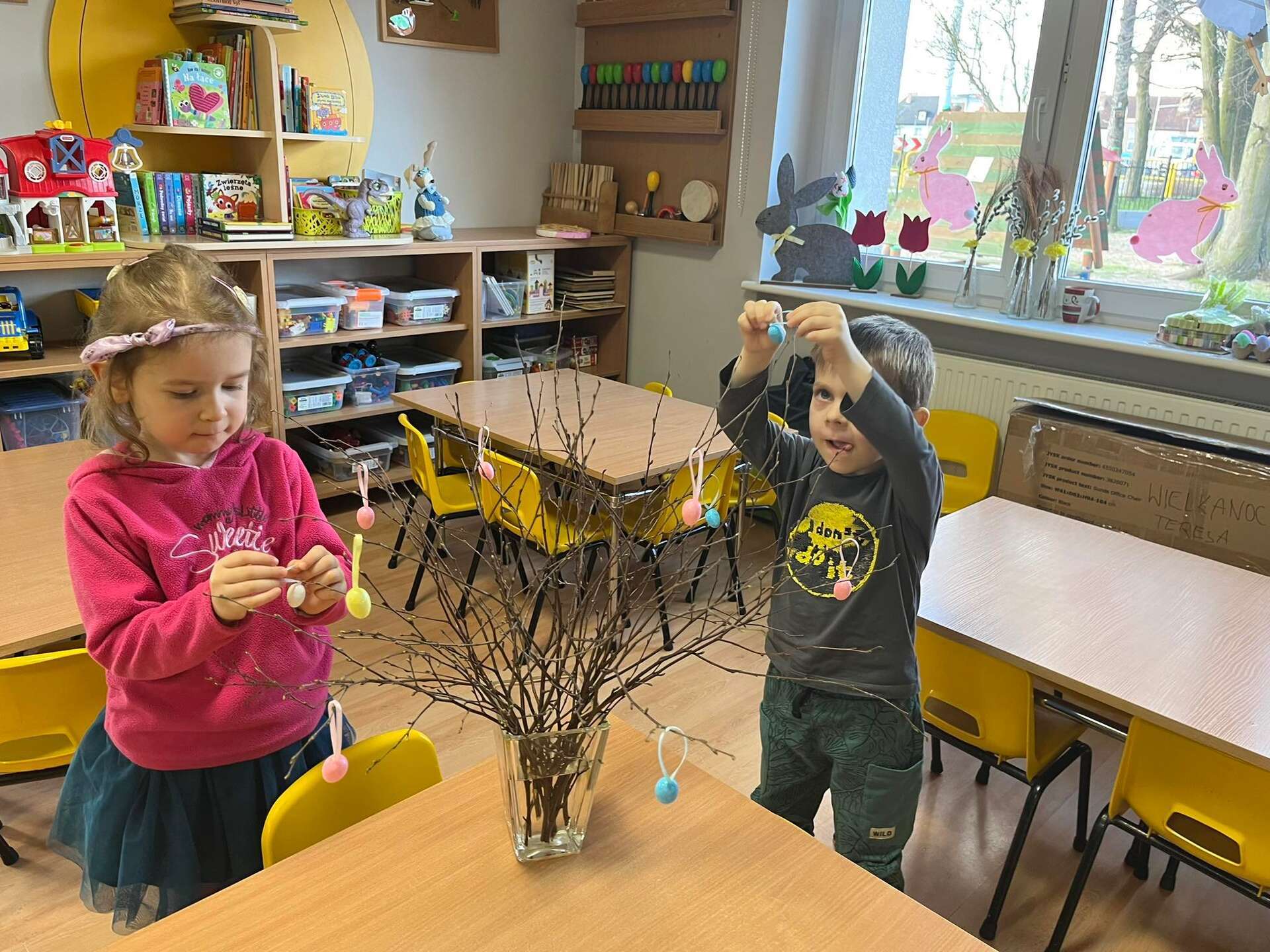 Dzieci wieszają jajeczka na gałązkach
