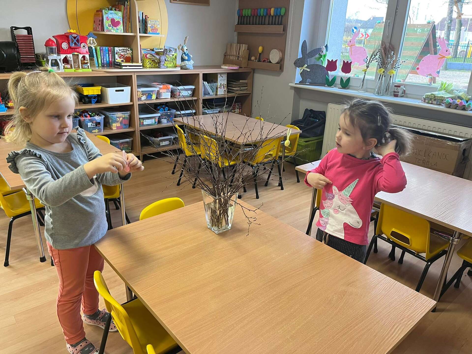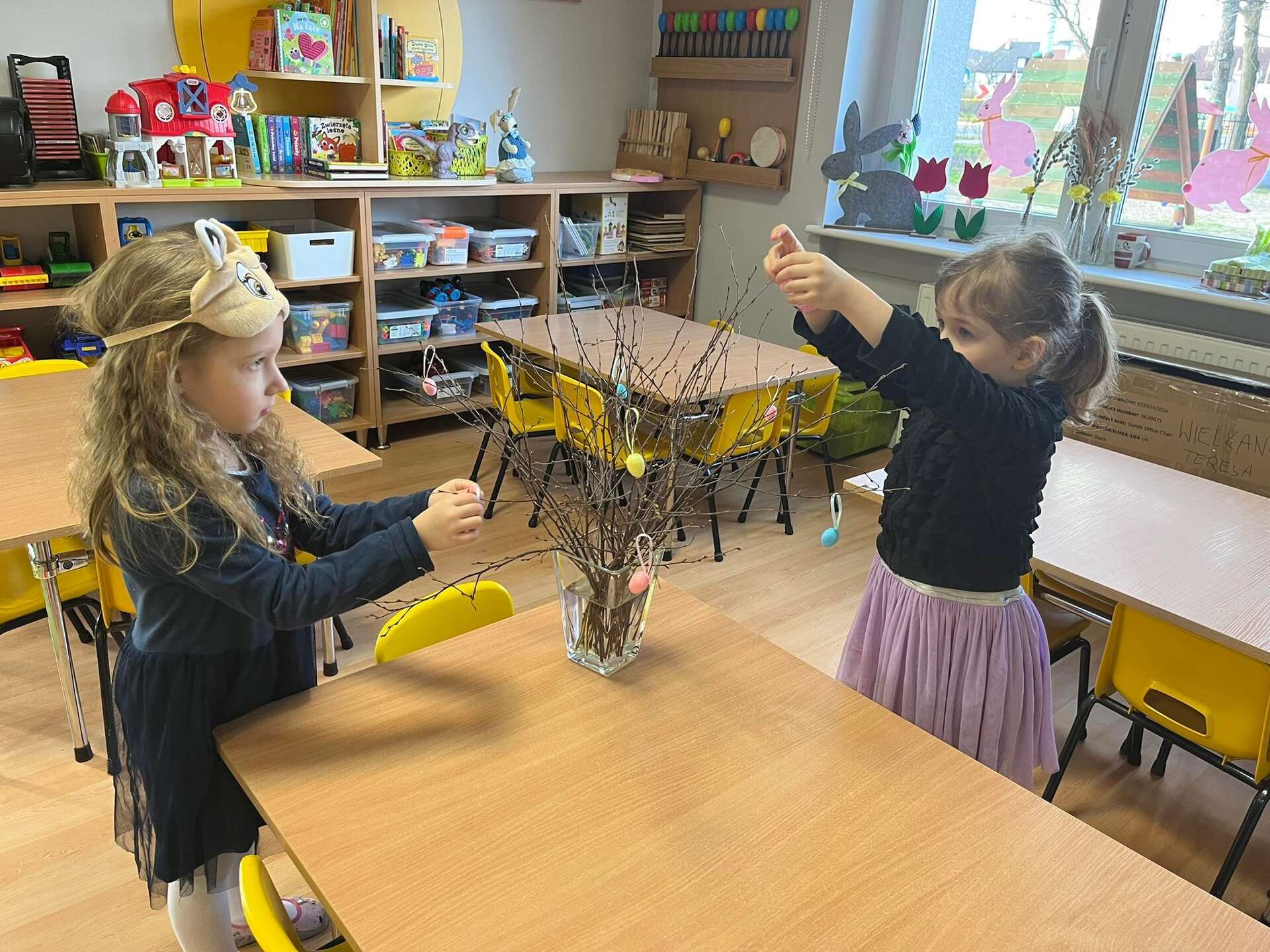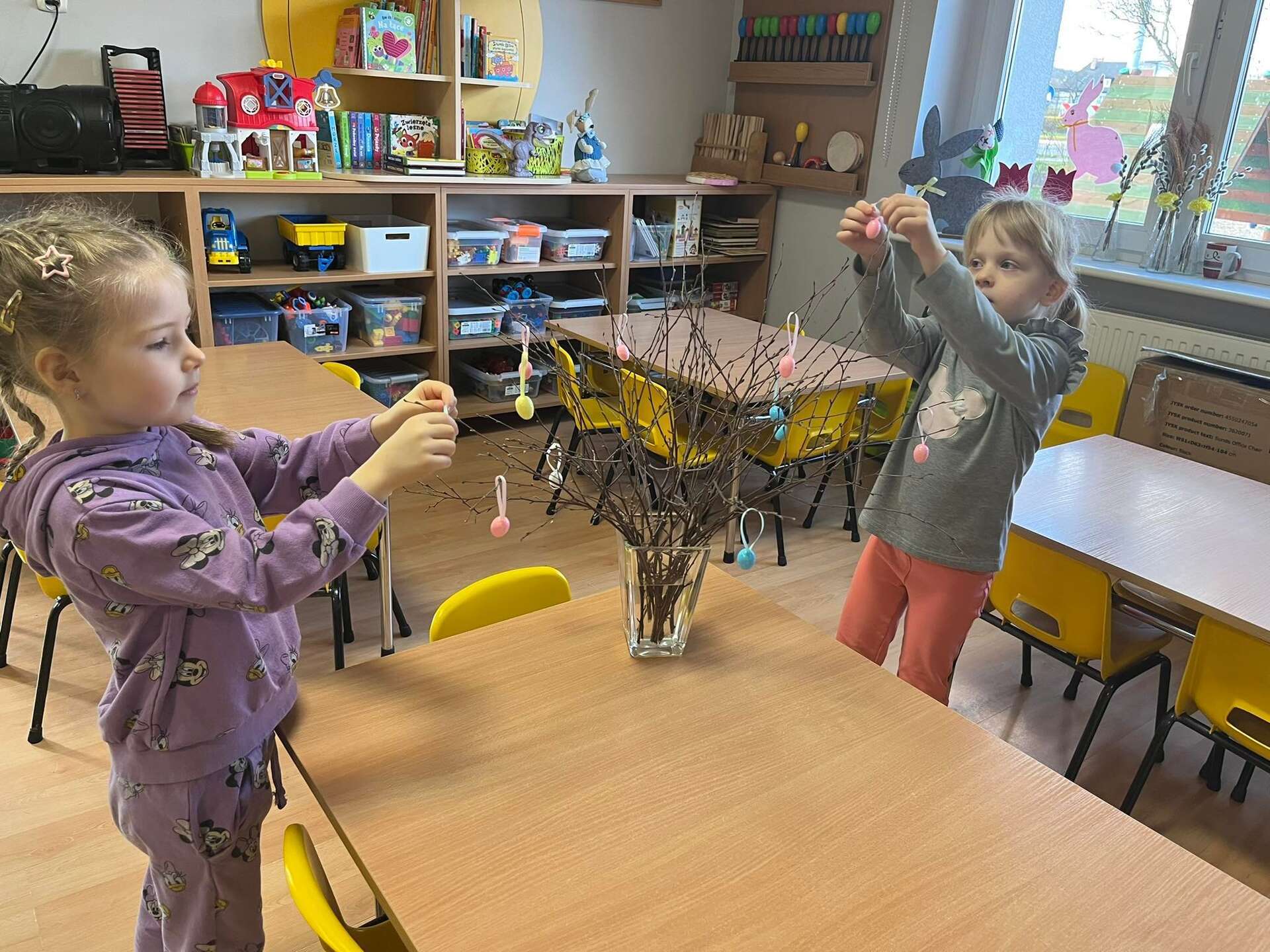 Dzieci wieszają jajeczka na gałązkach