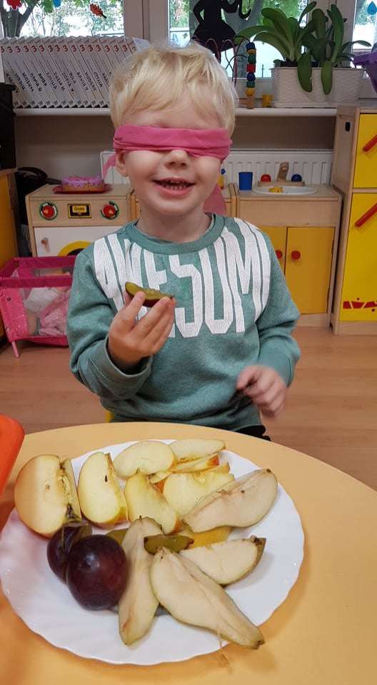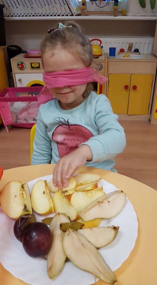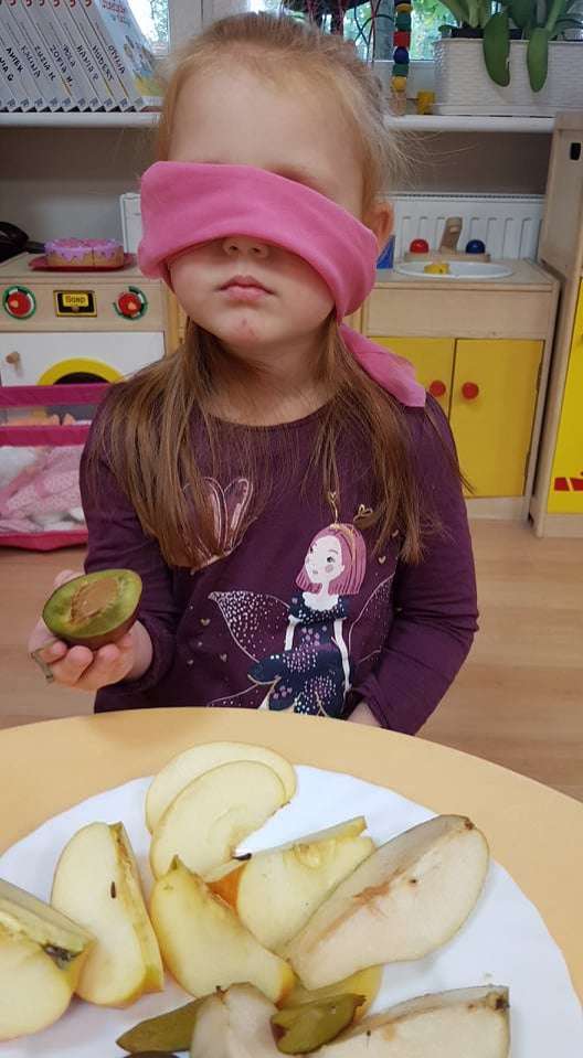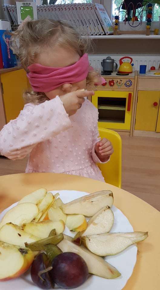 Nie brakuje ich również podczas obiadu. Aby bliżej poznać rodzinkę "Jesienno-owocową" postanowiliśmy aby dzieci z zawiązanymi oczami odgadywały co jedzą. Było przy tym dużo zabawy i śmiechu.