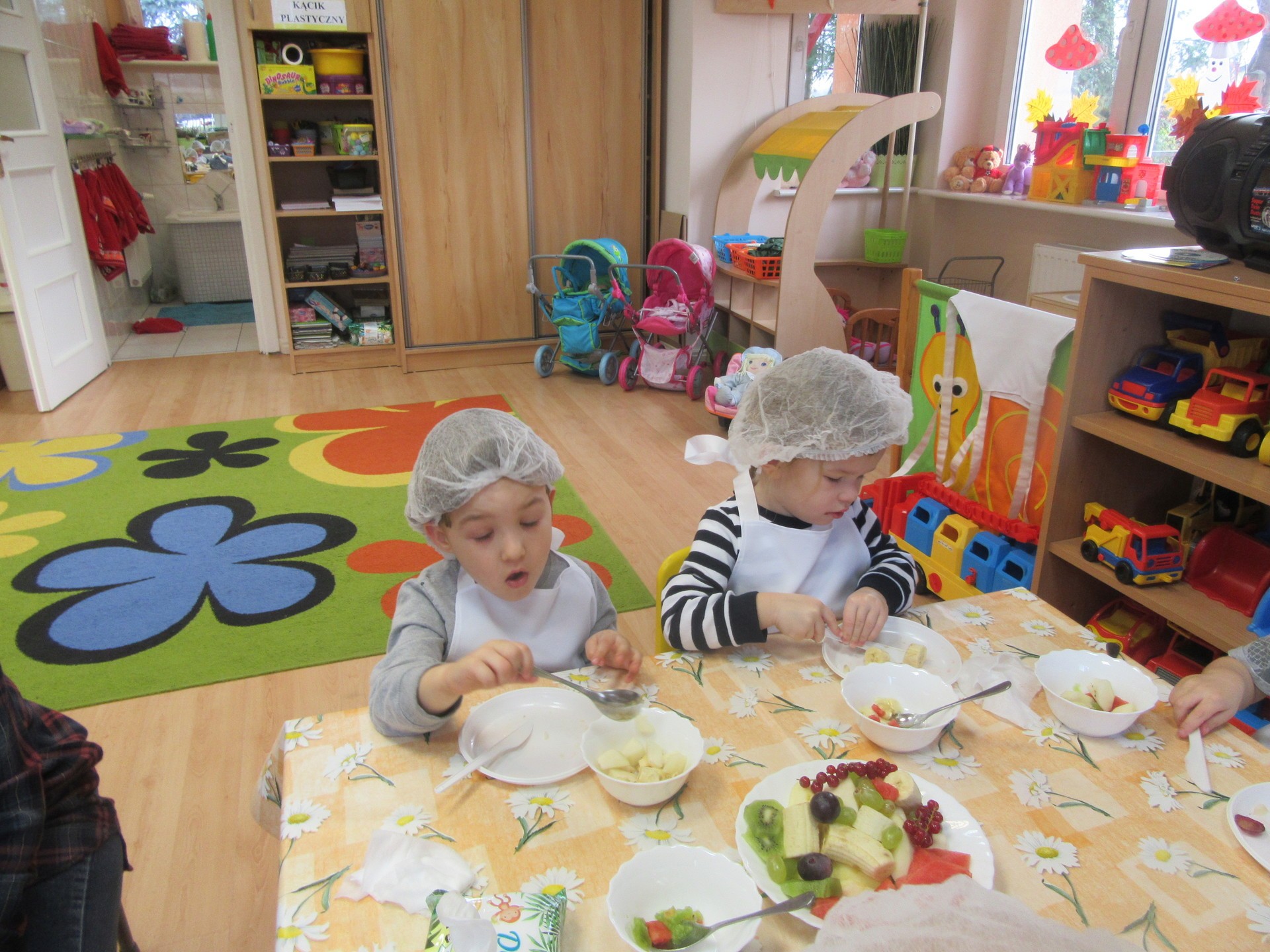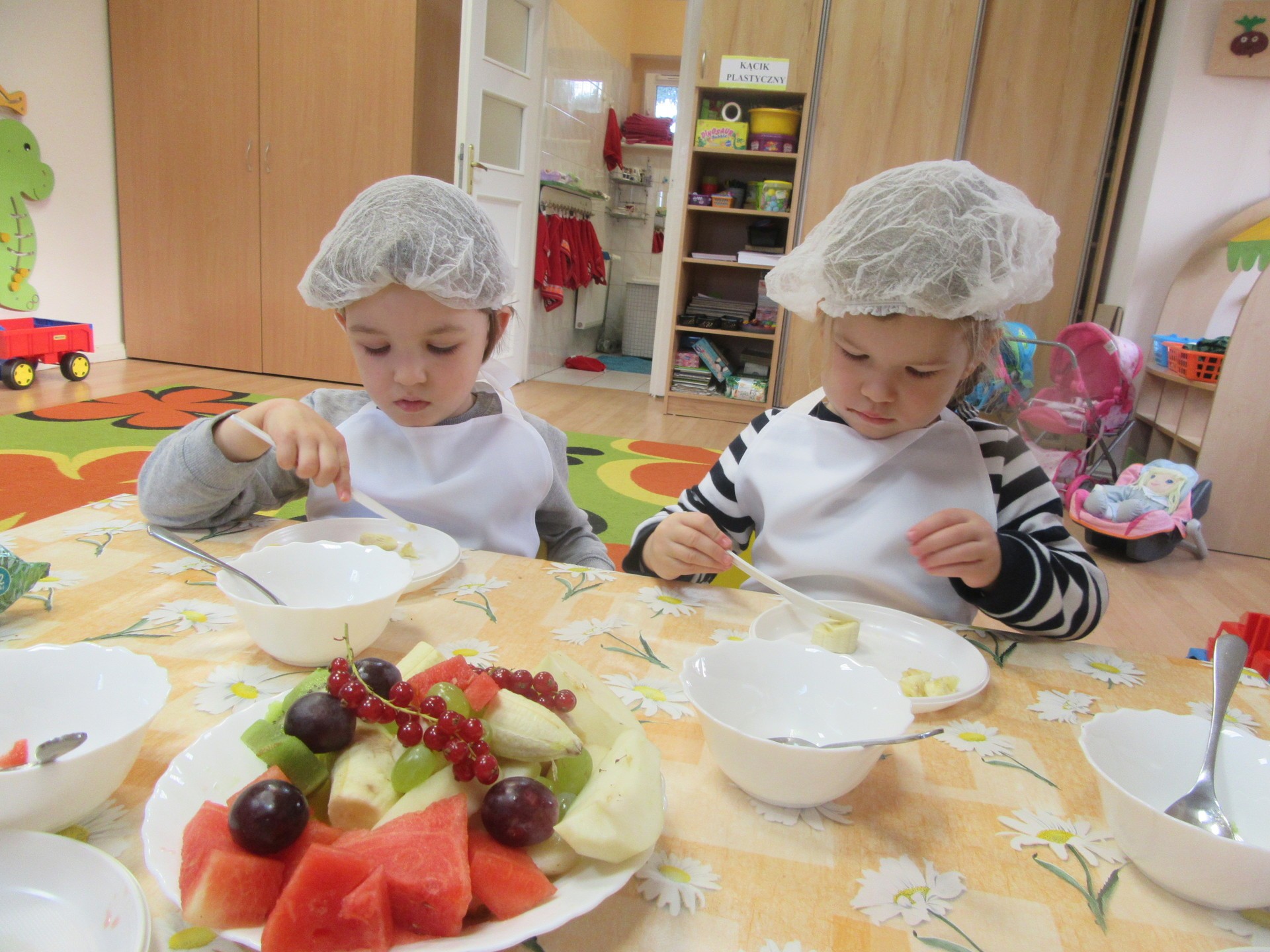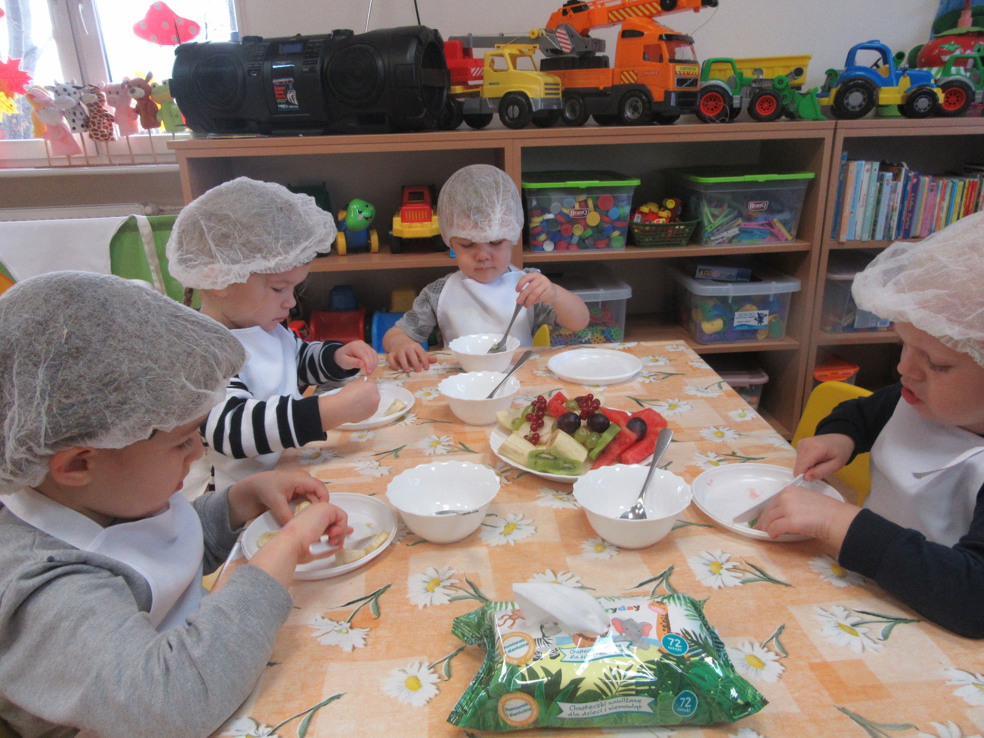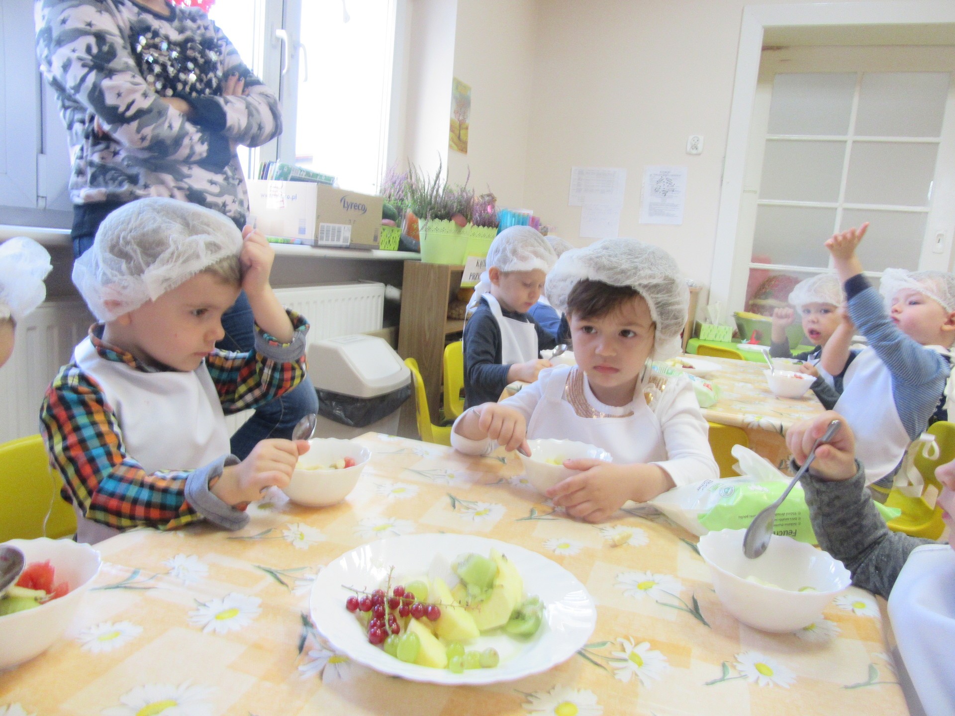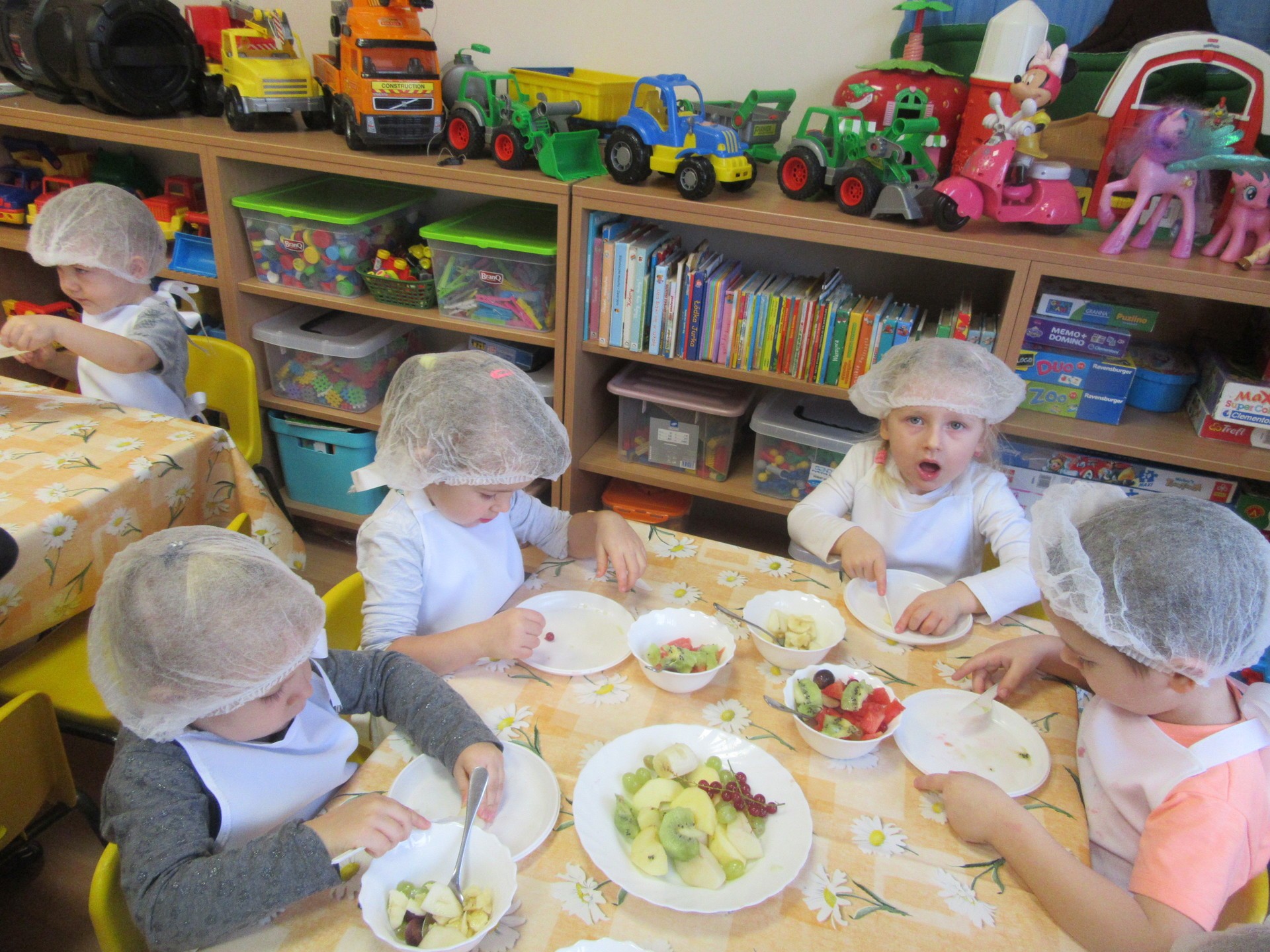 Smaczna, zdrowa, kolorowa – to sałatka owocowa. Kierując się tą myślą, a także tematyką kompleksową „Zdrowo się odżywiam” postanowiliśmy samodzielnie przygotować zdrową, witaminową przekąskę. Przedszkolaki odpowiednio przygotowane do pracy, z wielkim zaangażowaniem dzielnie kroiły przyniesione do przedszkola owoce: jabłka, gruszki, banany, winogrona, kiwi, mandarynki. Po ich pokrojeniu nastąpiło wymieszanie wszystkich witaminowych słodkości, z których powstała sałatka.
